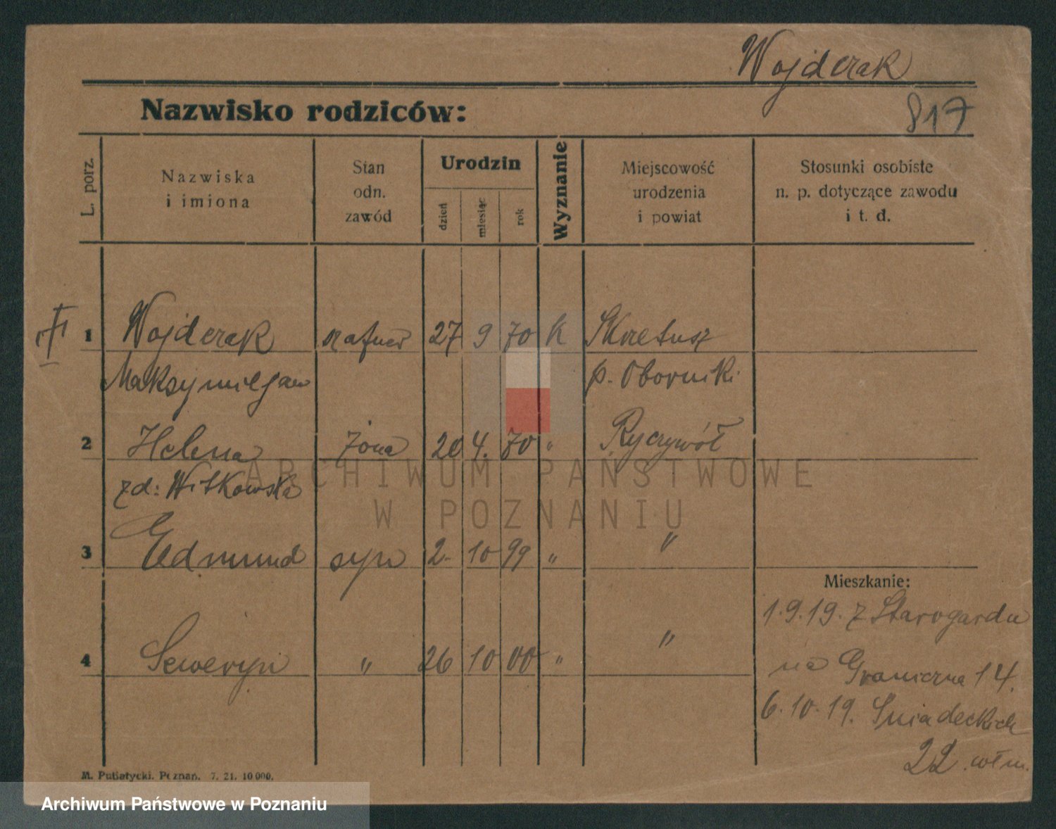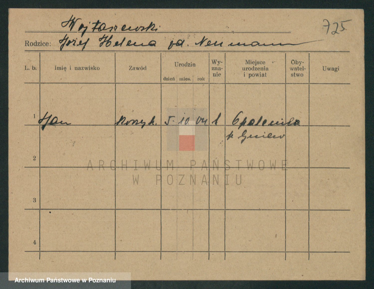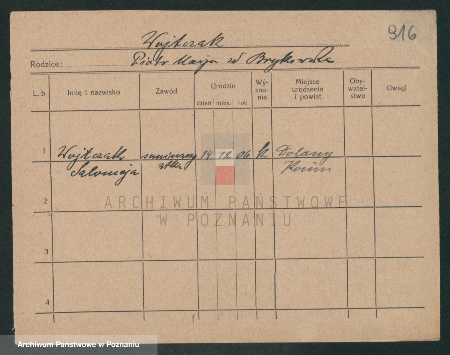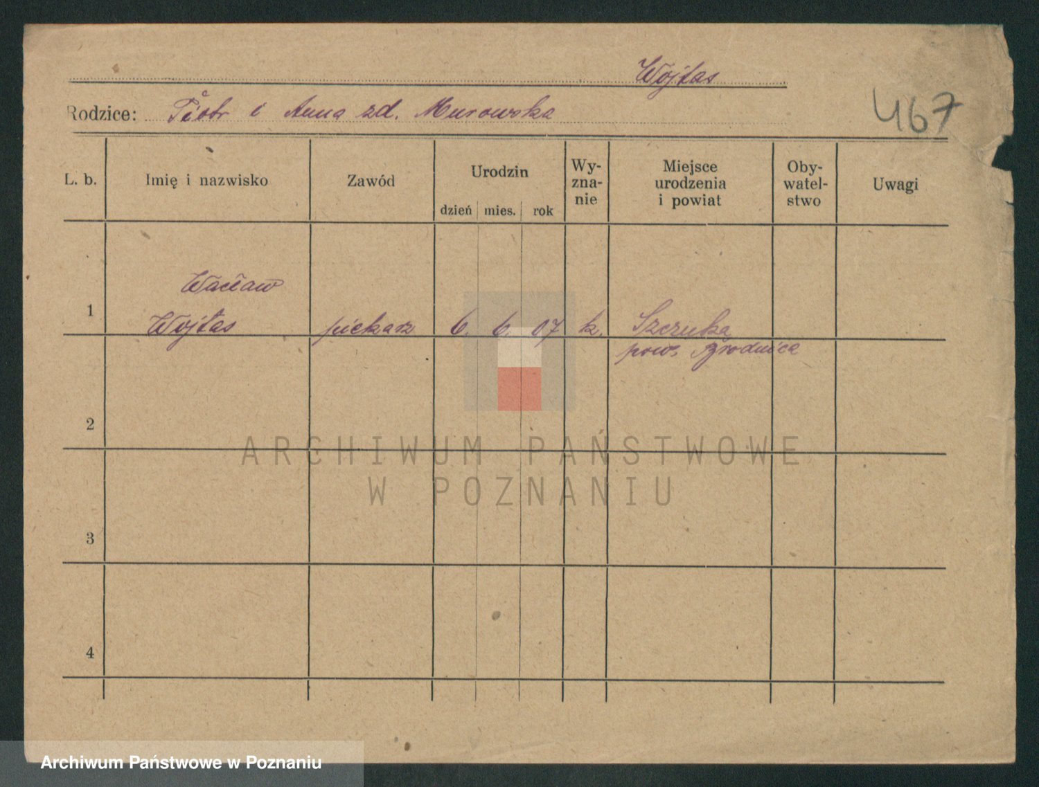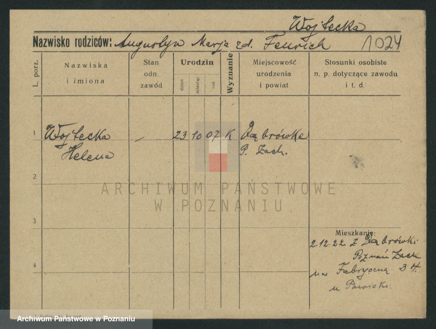 Podgląd karty osobowej dostępny jest po kliknięciu na nazwisko lub ikonkę karty. Można dokonywać powiększenia (ikony na górze) lub przechodzić między kolejnymi skanami (strzałki po bokach).