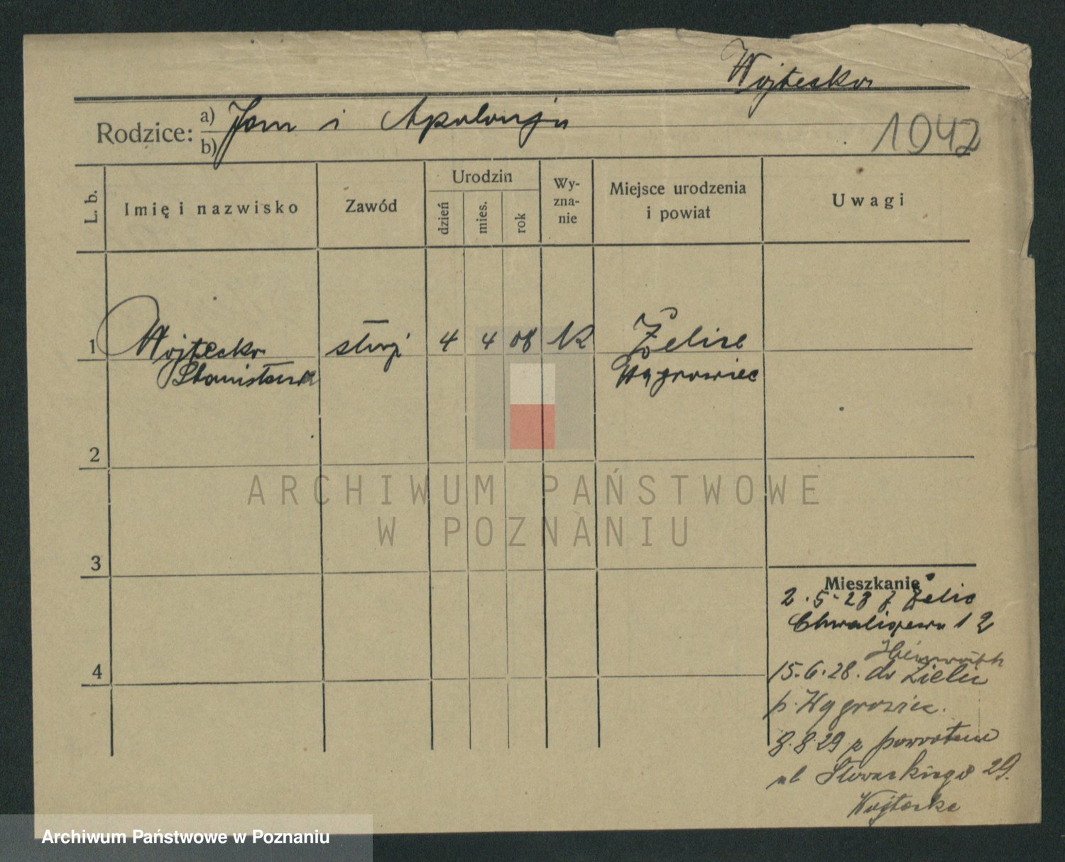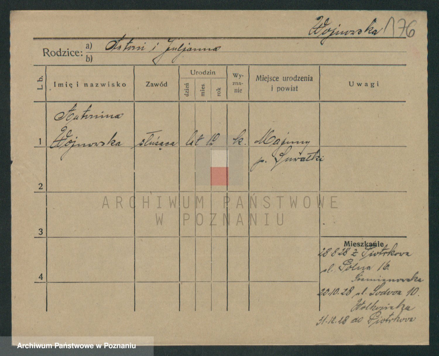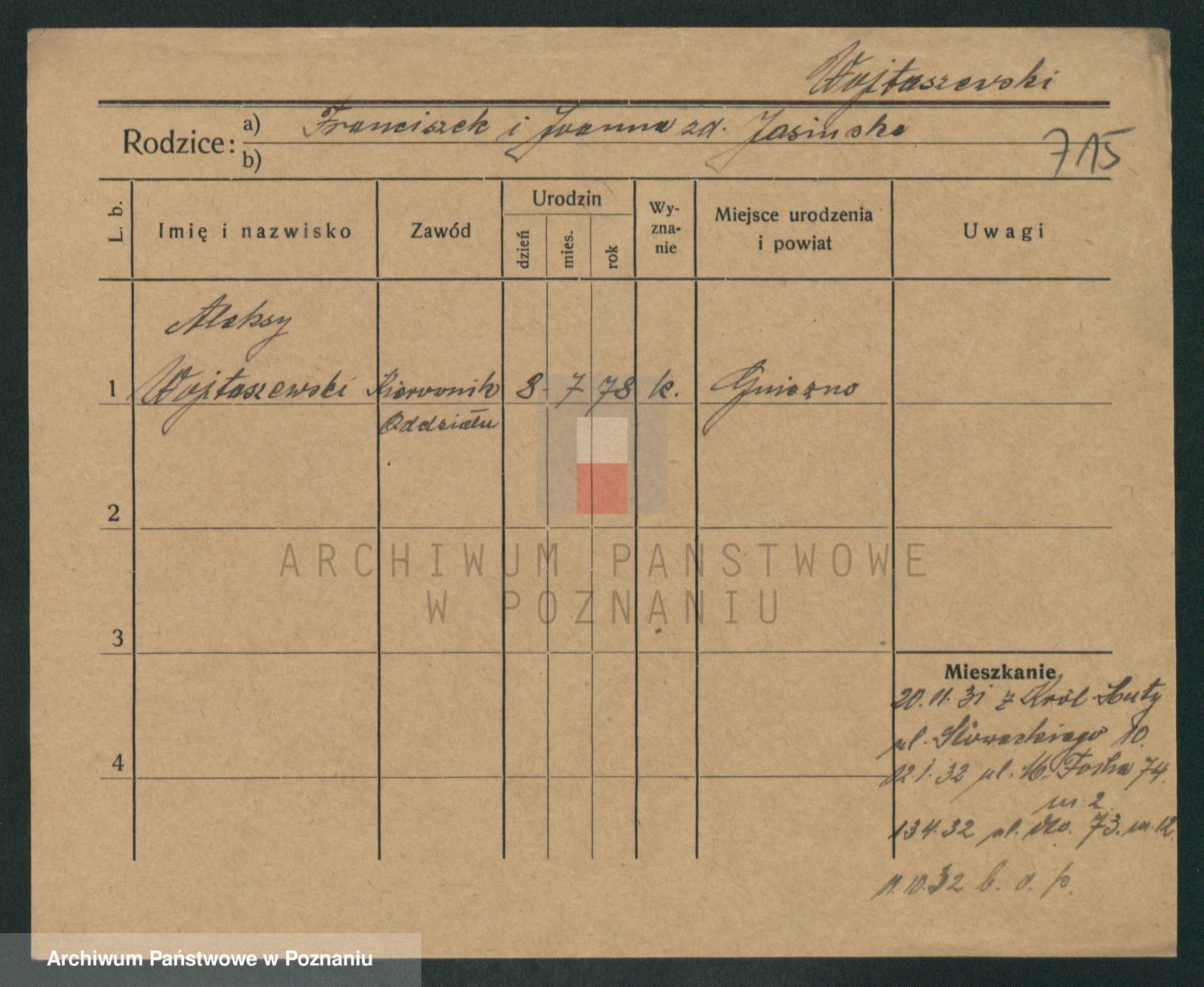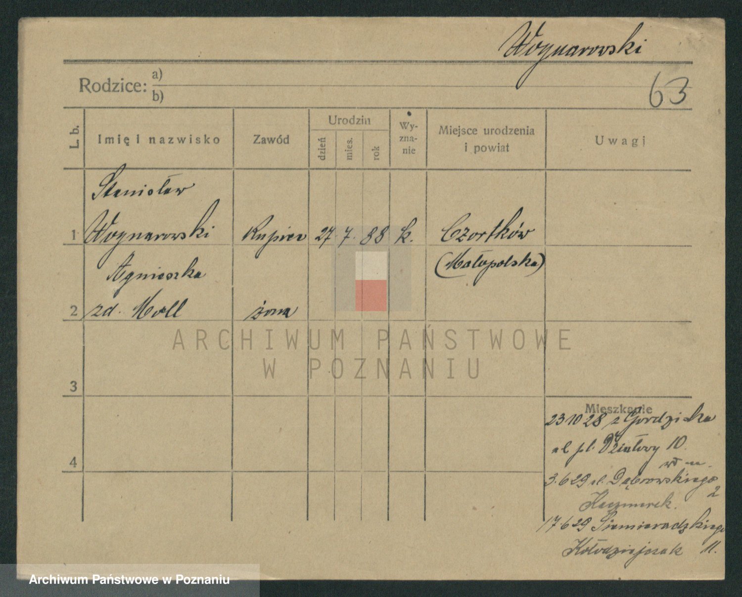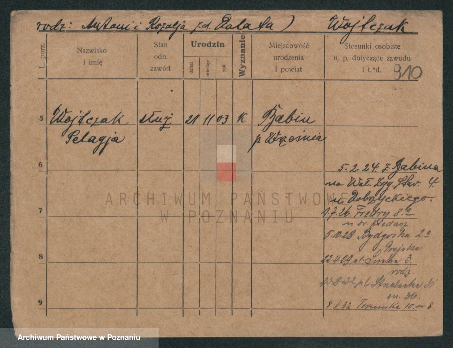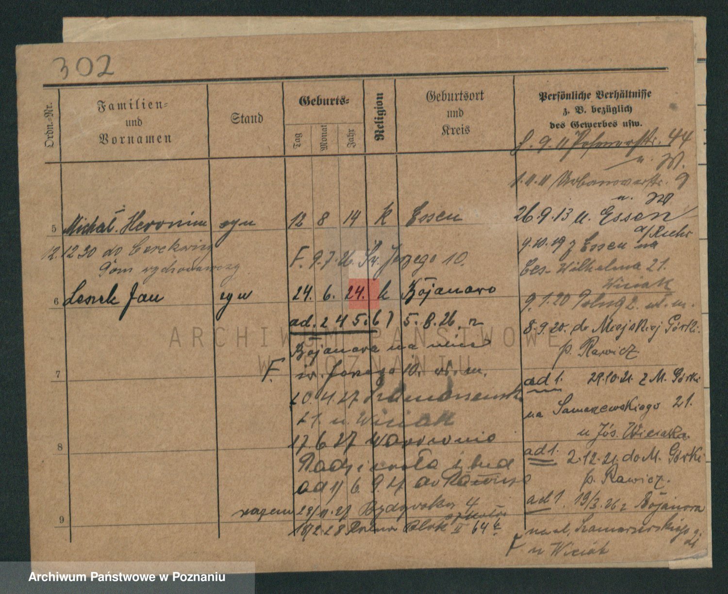 Podgląd karty osobowej dostępny jest po kliknięciu na nazwisko lub ikonkę karty. Można dokonywać powiększenia (ikony na górze) lub przechodzić między kolejnymi skanami (strzałki po bokach).