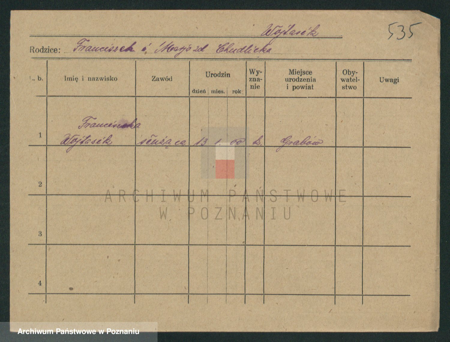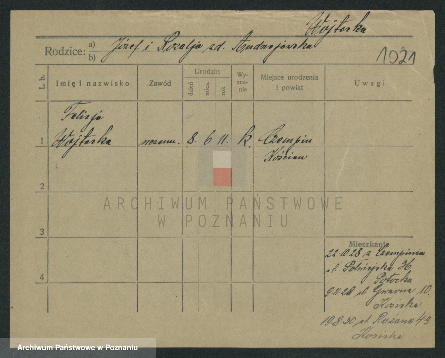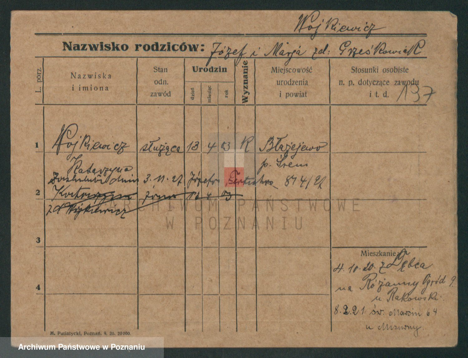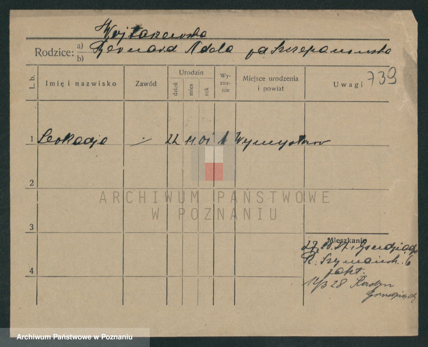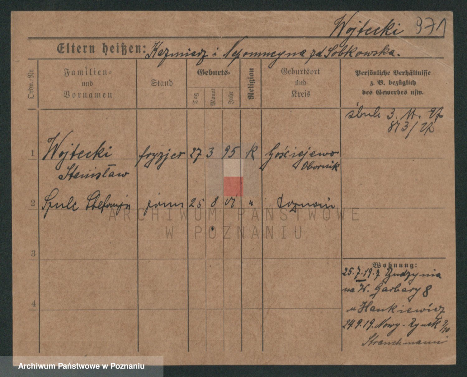 Podgląd karty osobowej dostępny jest po kliknięciu na nazwisko lub ikonkę karty. Można dokonywać powiększenia (ikony na górze) lub przechodzić między kolejnymi skanami (strzałki po bokach).