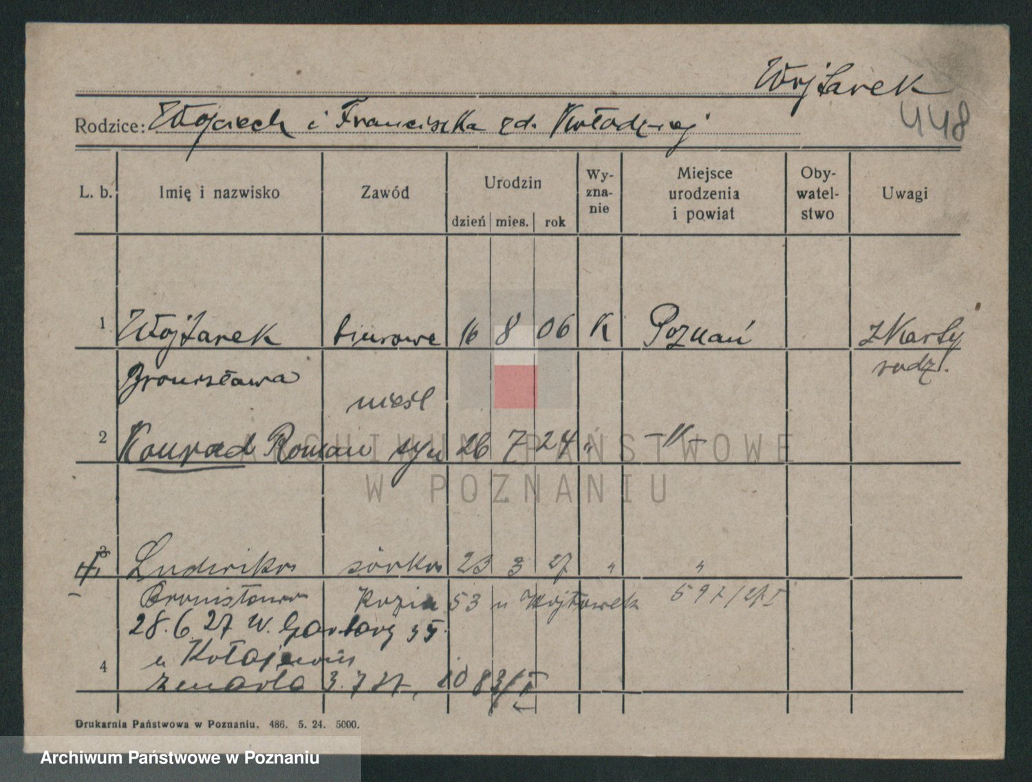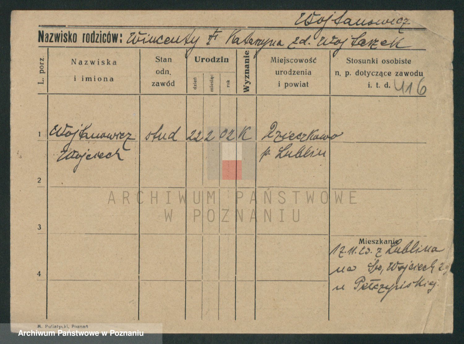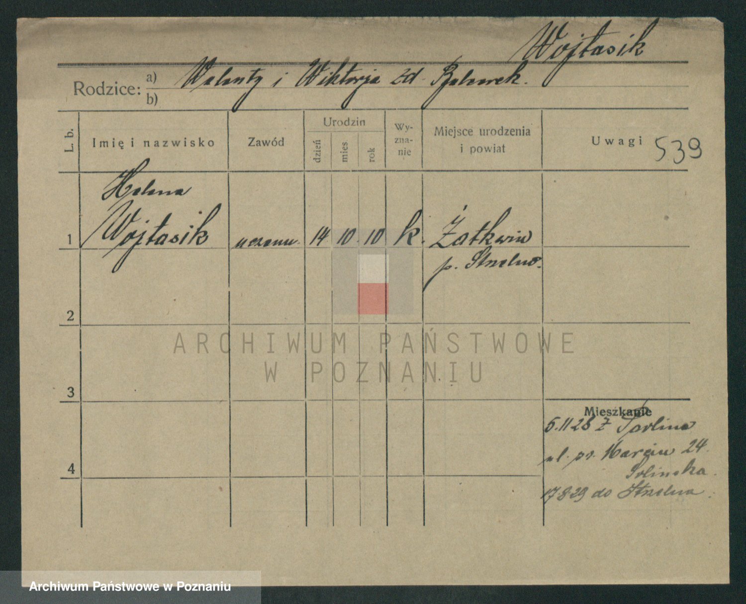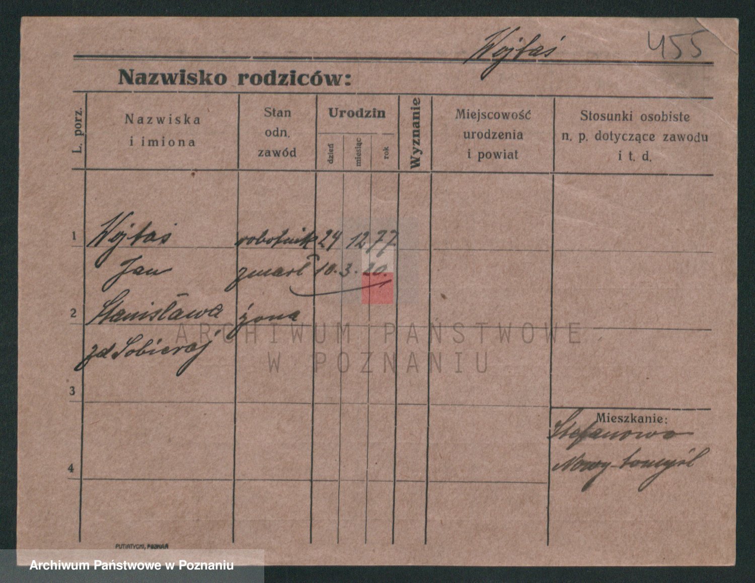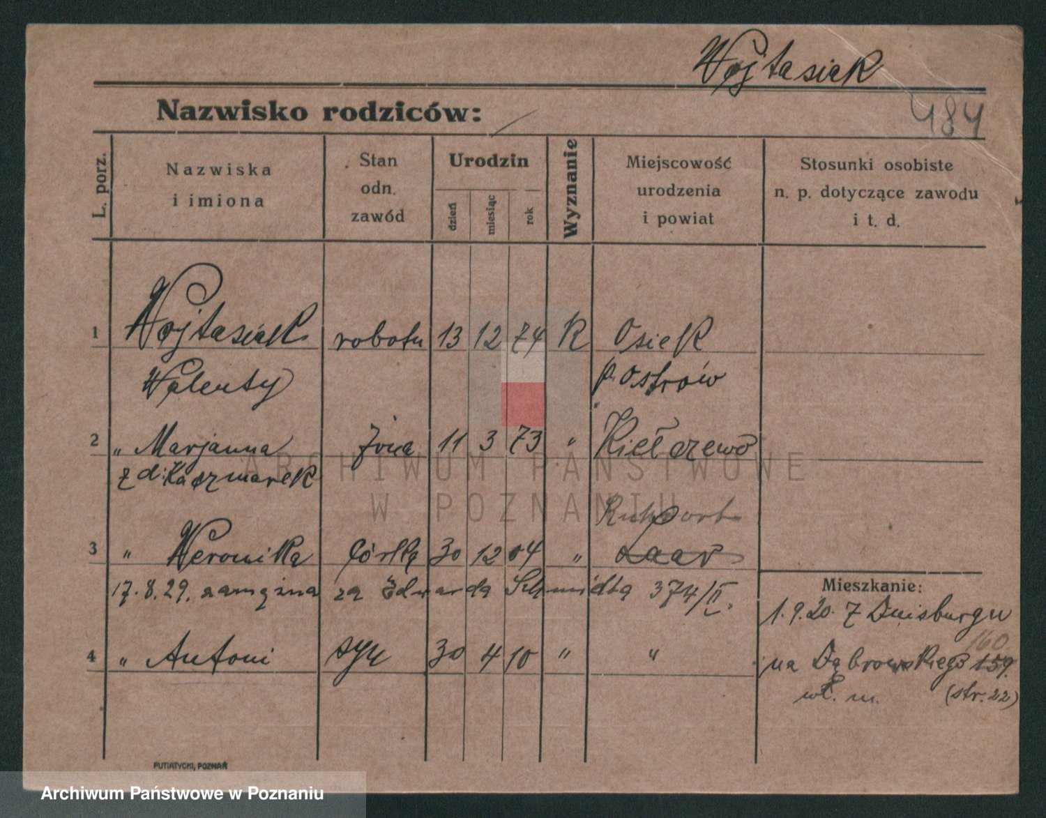 Podgląd karty osobowej dostępny jest po kliknięciu na nazwisko lub ikonkę karty. Można dokonywać powiększenia (ikony na górze) lub przechodzić między kolejnymi skanami (strzałki po bokach).