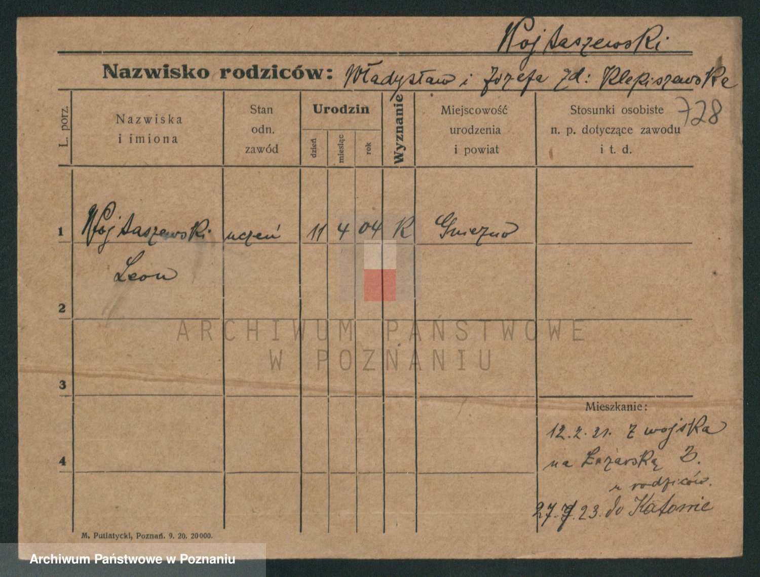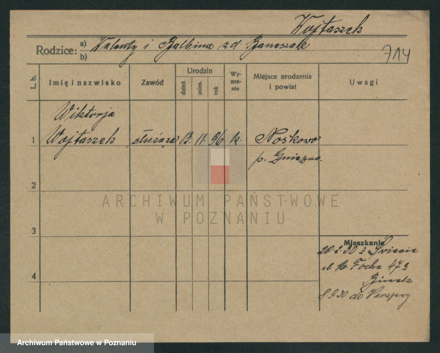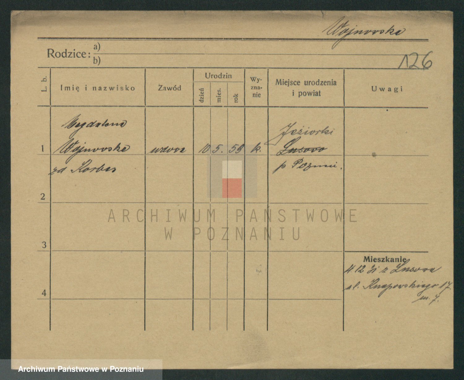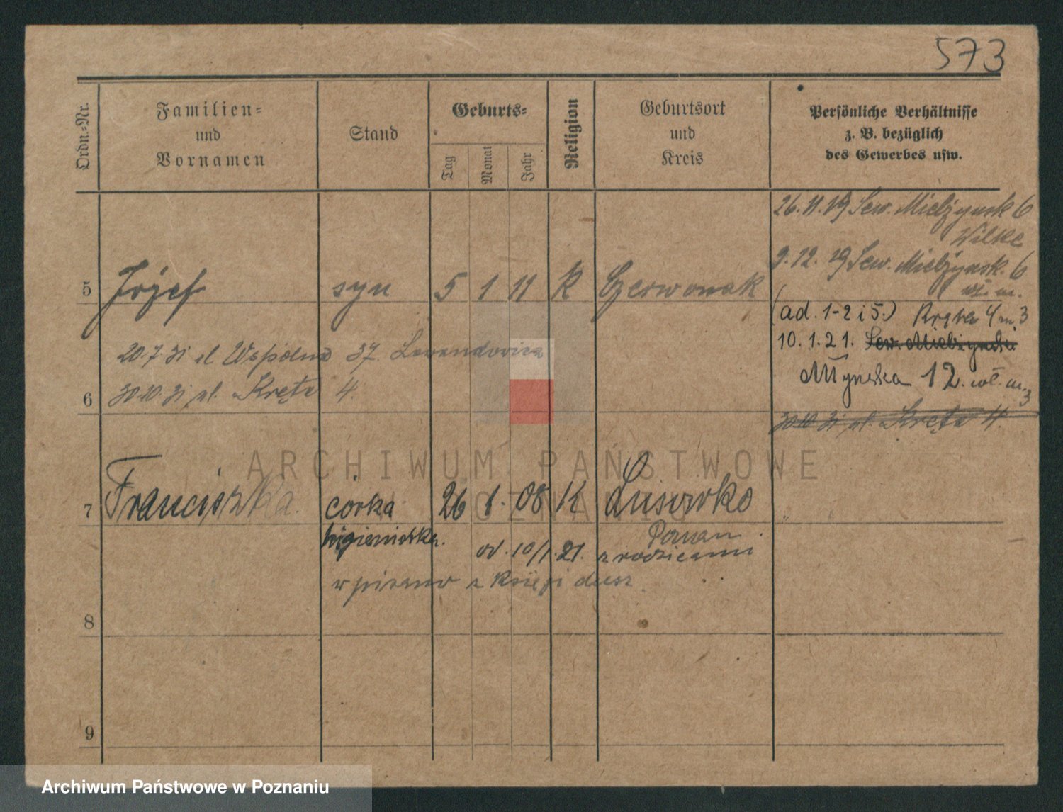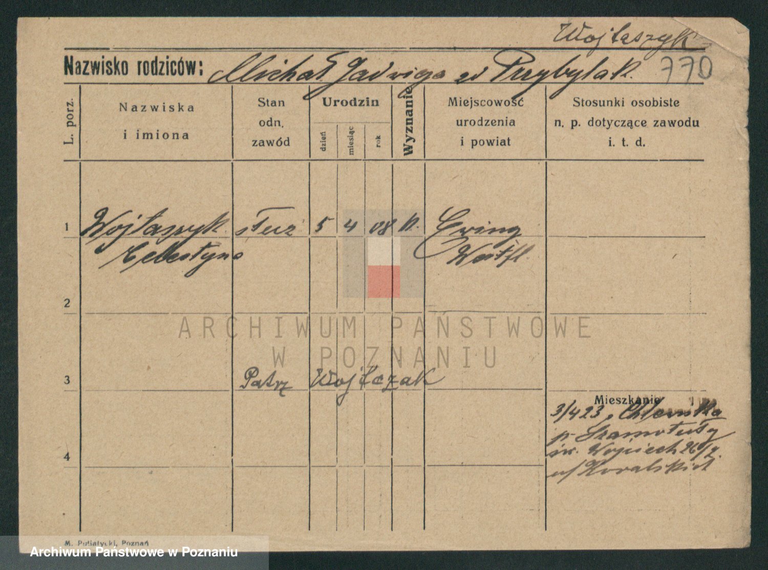 Podgląd karty osobowej dostępny jest po kliknięciu na nazwisko lub ikonkę karty. Można dokonywać powiększenia (ikony na górze) lub przechodzić między kolejnymi skanami (strzałki po bokach).