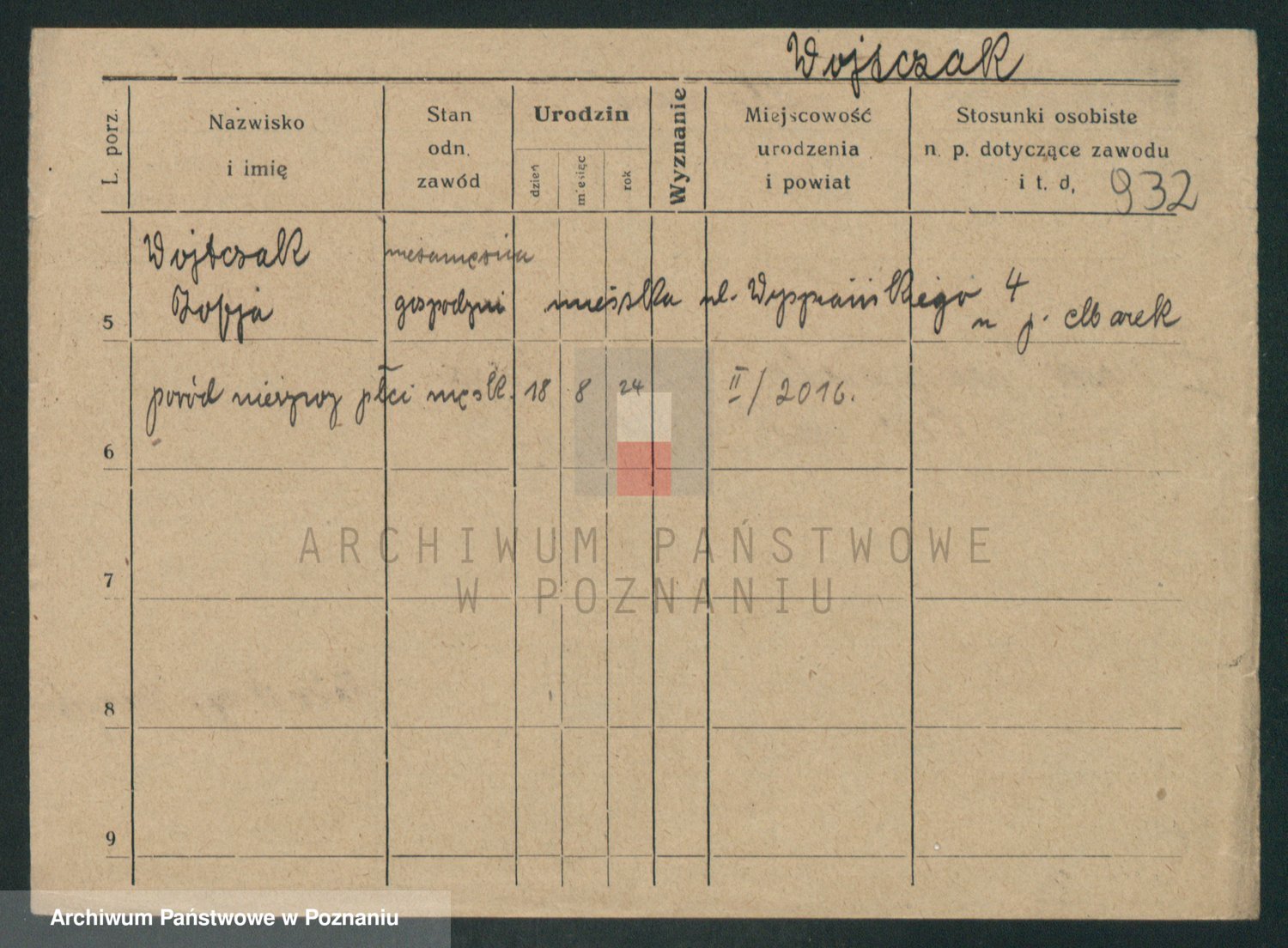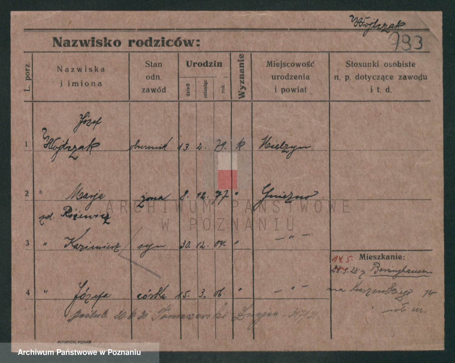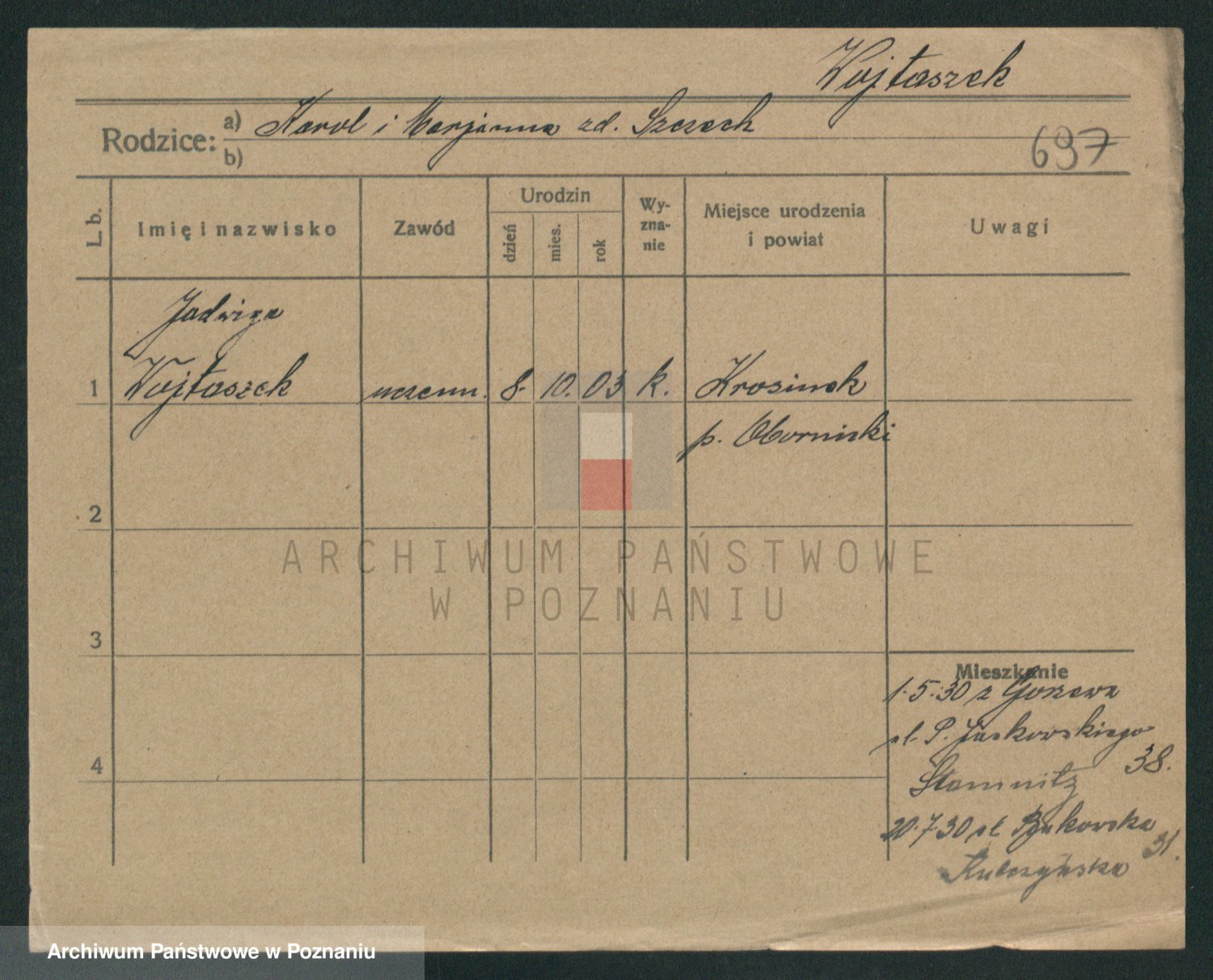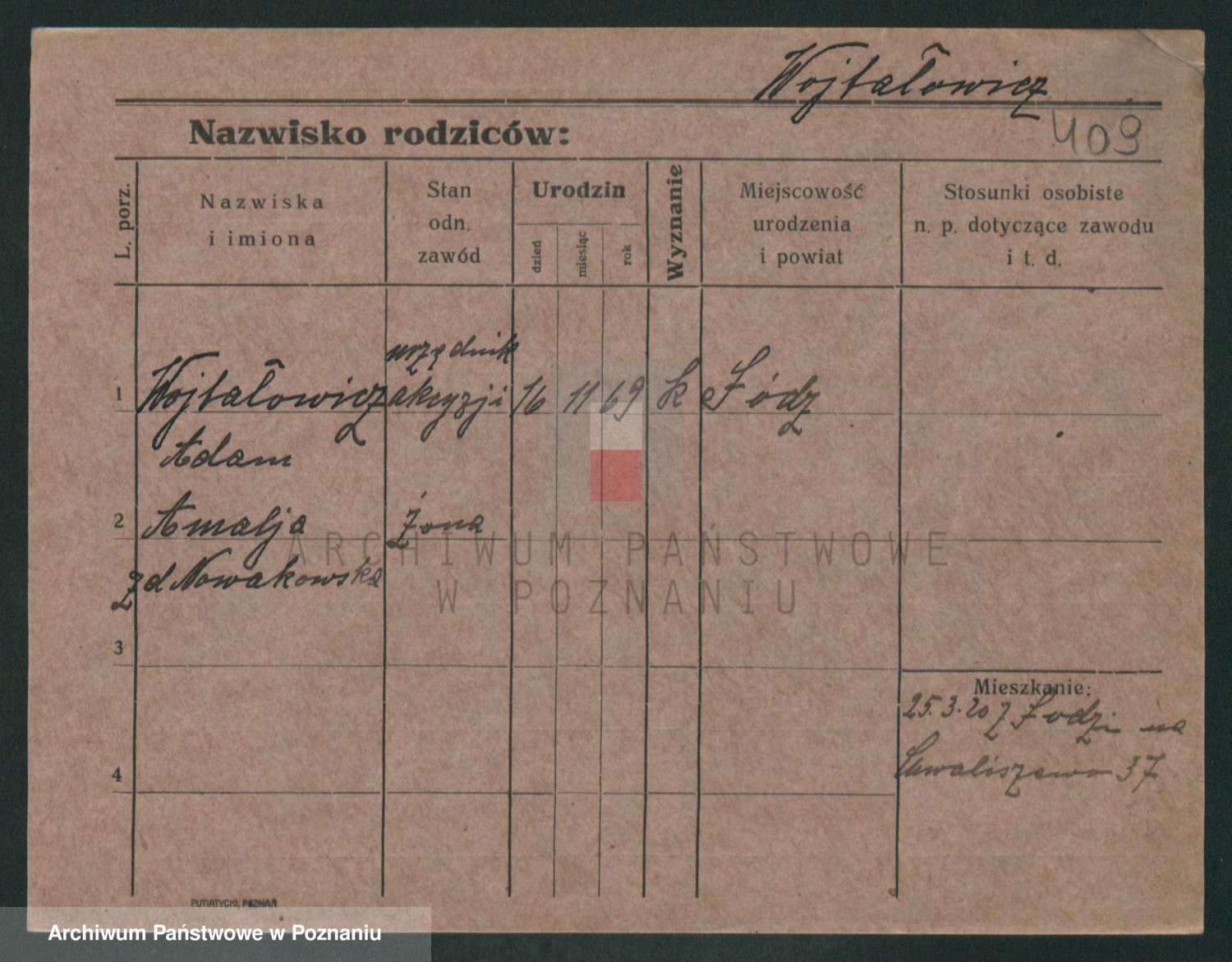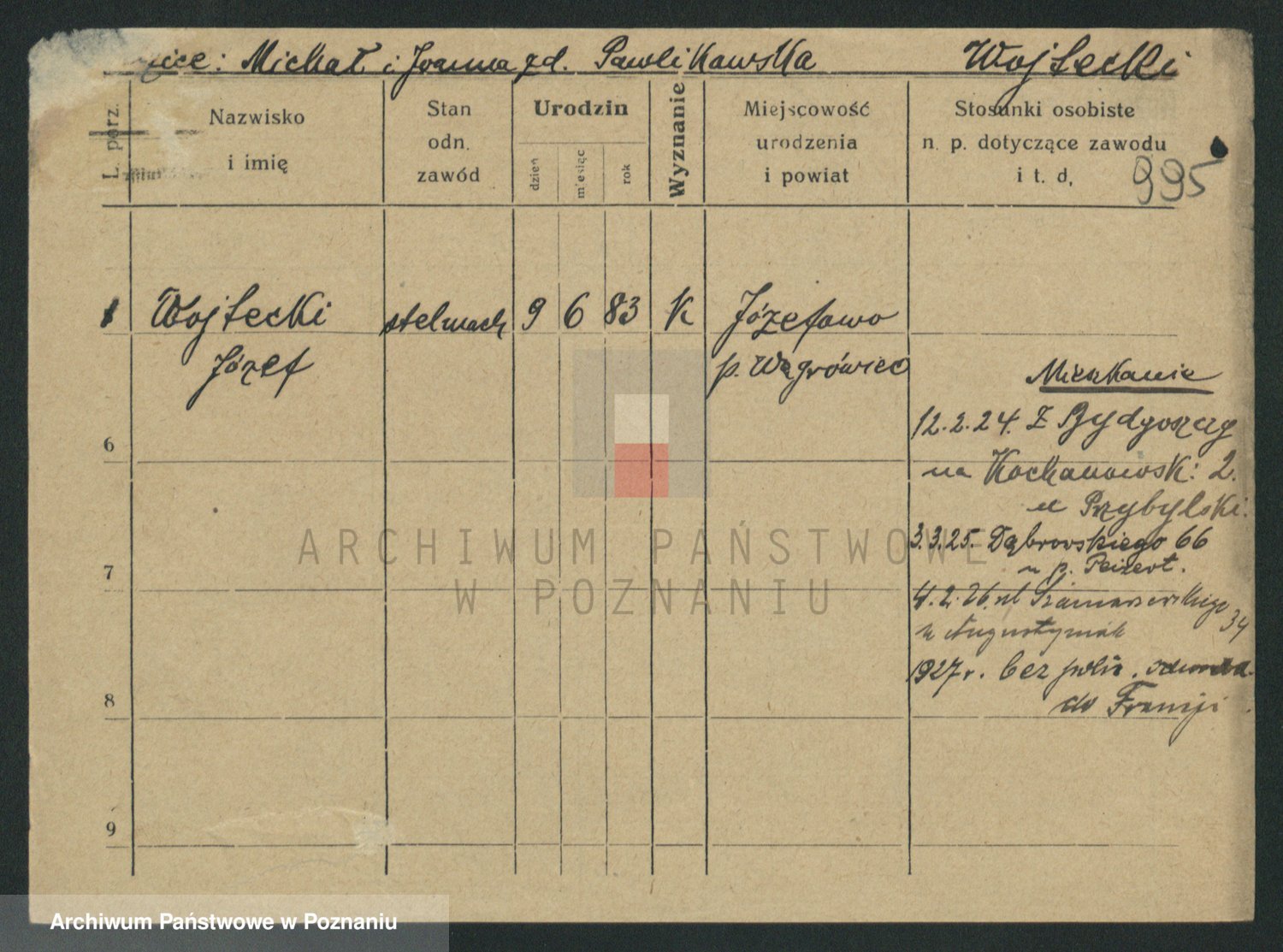 Podgląd karty osobowej dostępny jest po kliknięciu na nazwisko lub ikonkę karty. Można dokonywać powiększenia (ikony na górze) lub przechodzić między kolejnymi skanami (strzałki po bokach).