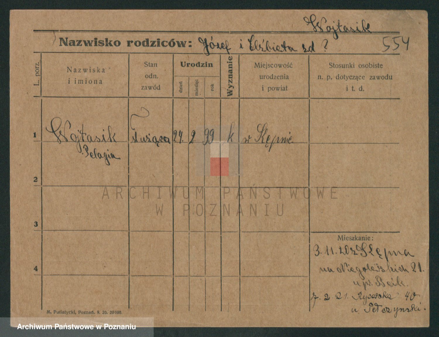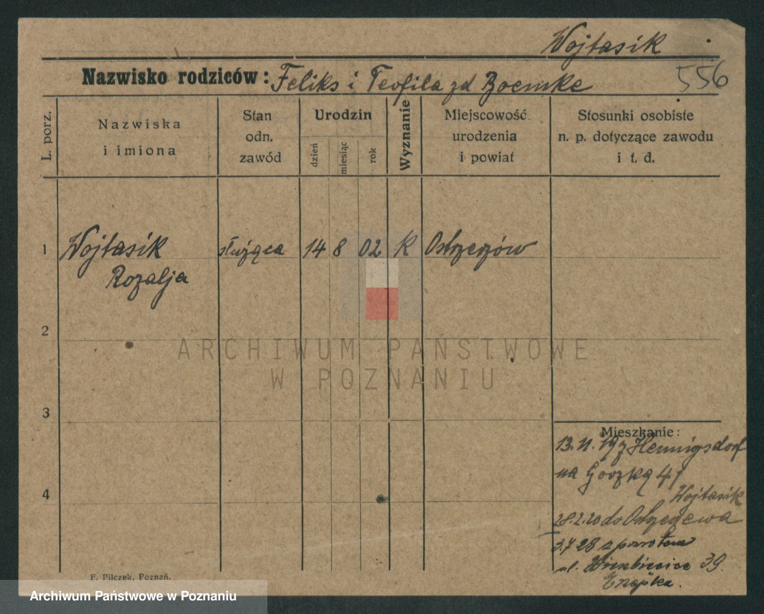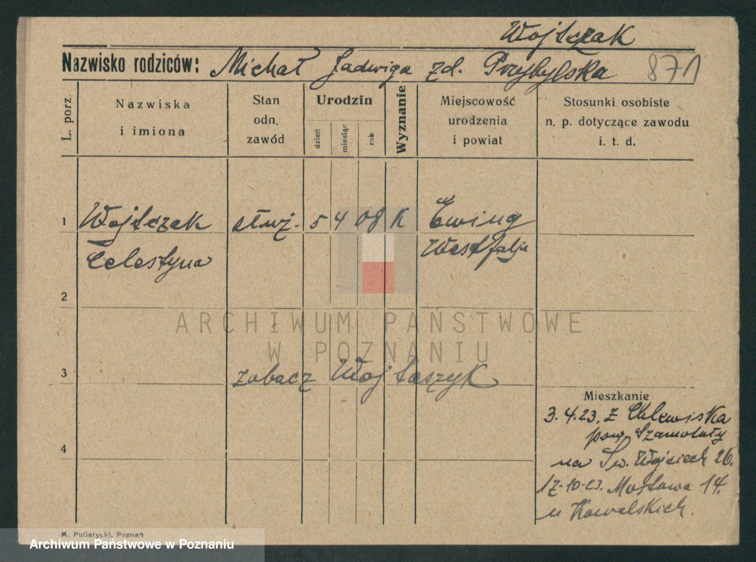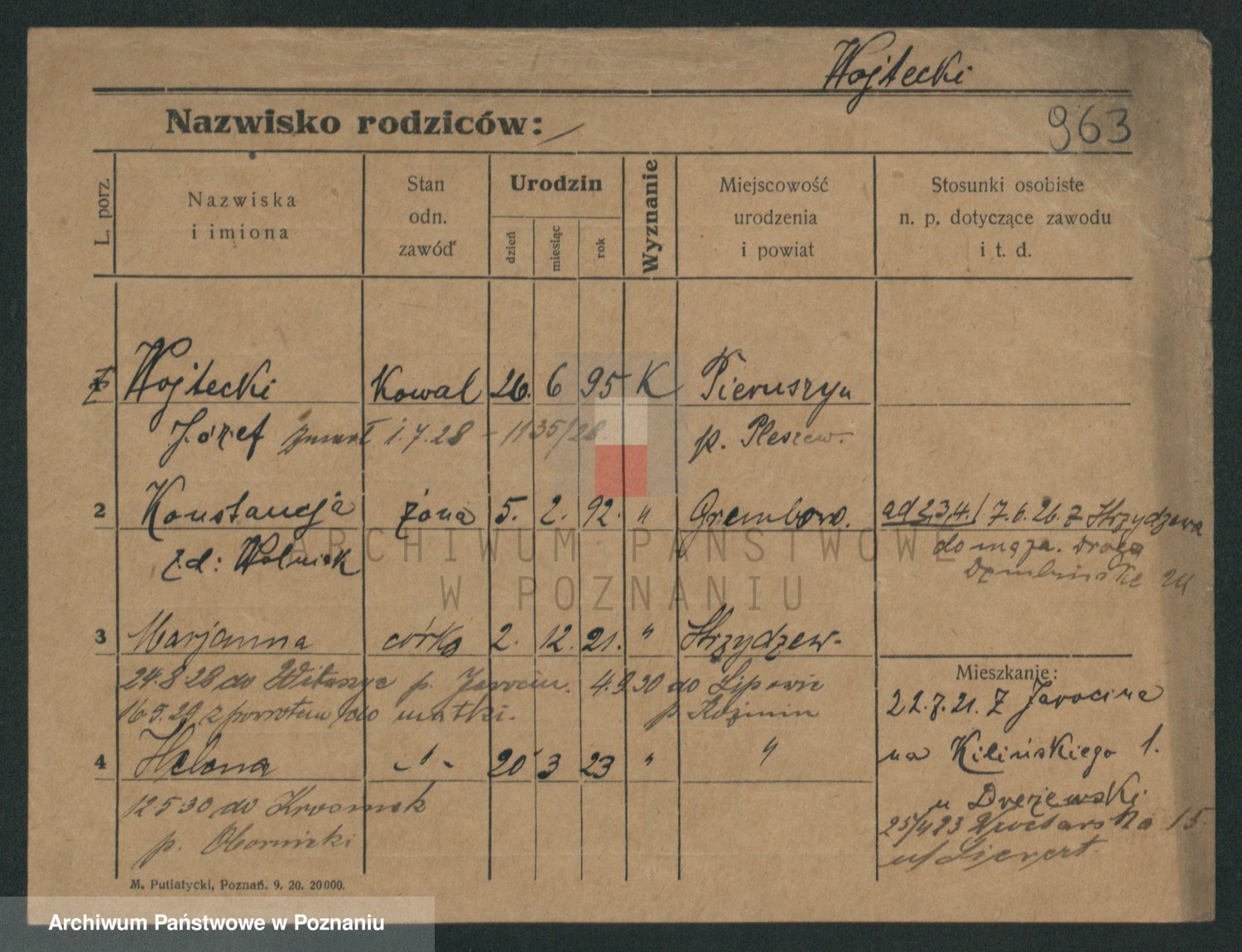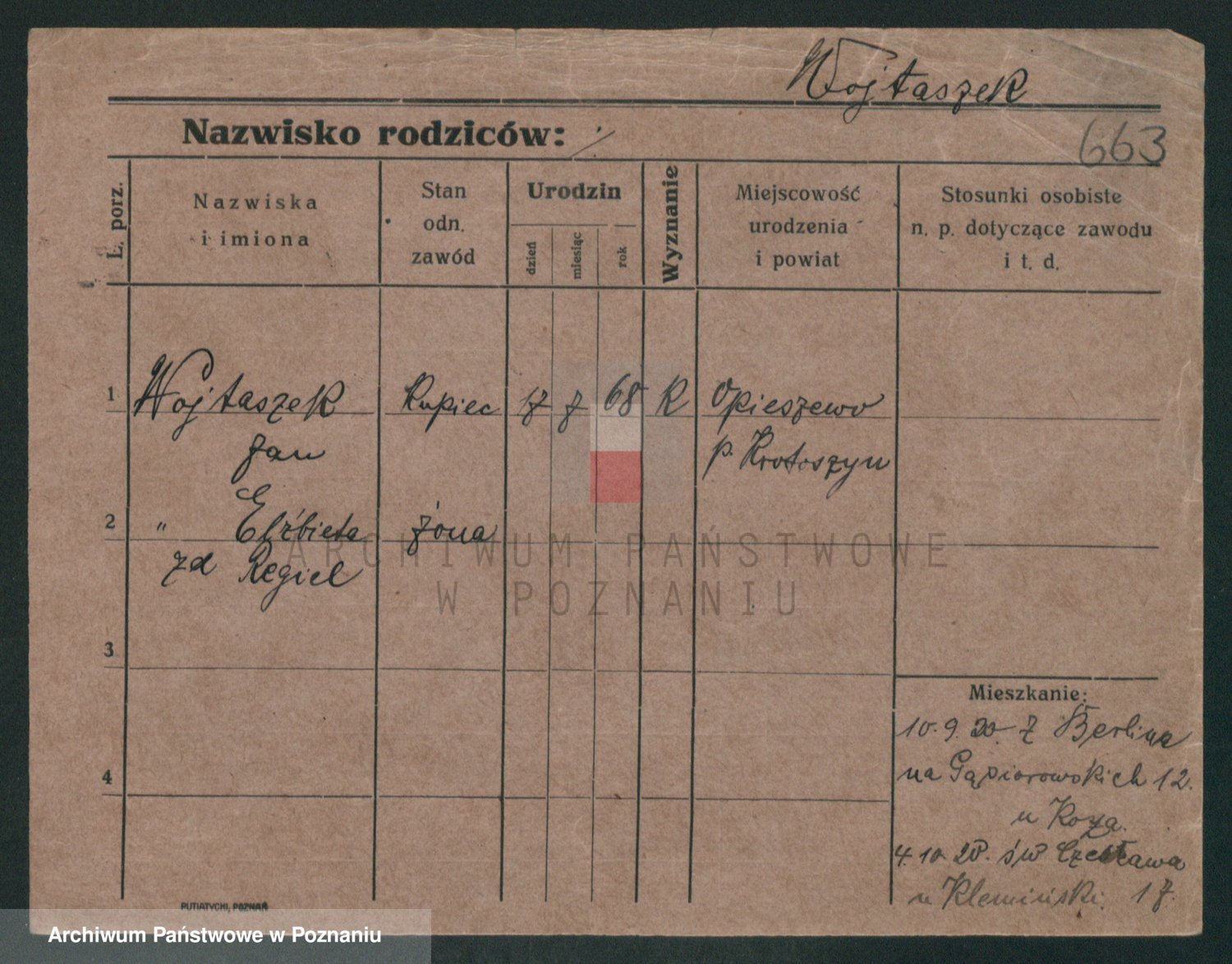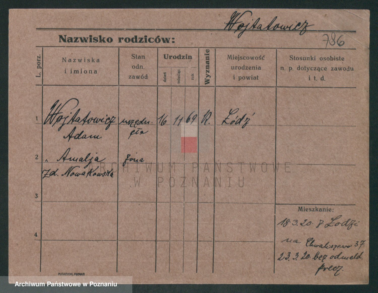 Podgląd karty osobowej dostępny jest po kliknięciu na nazwisko lub ikonkę karty. Można dokonywać powiększenia (ikony na górze) lub przechodzić między kolejnymi skanami (strzałki po bokach).