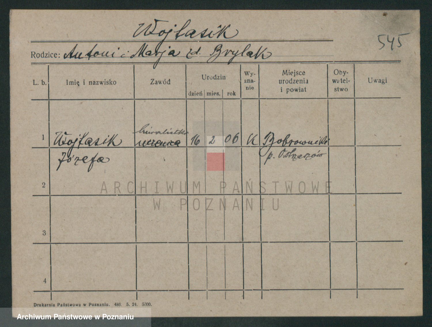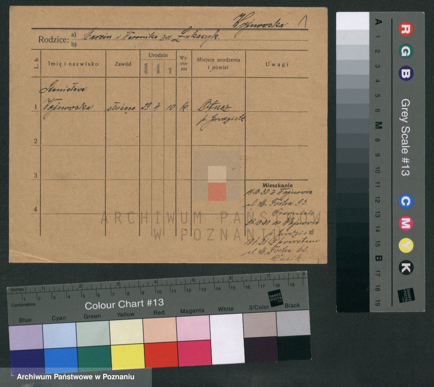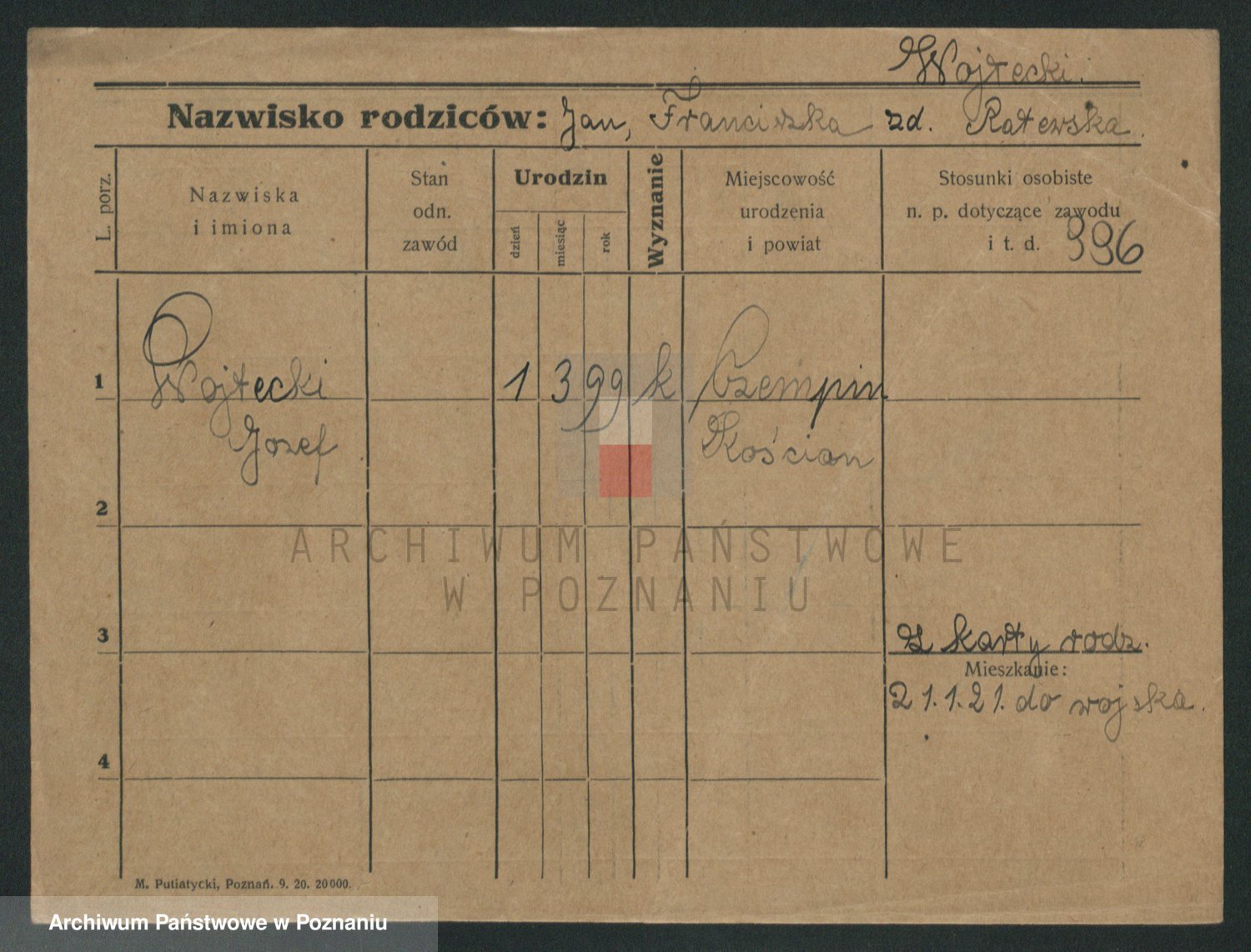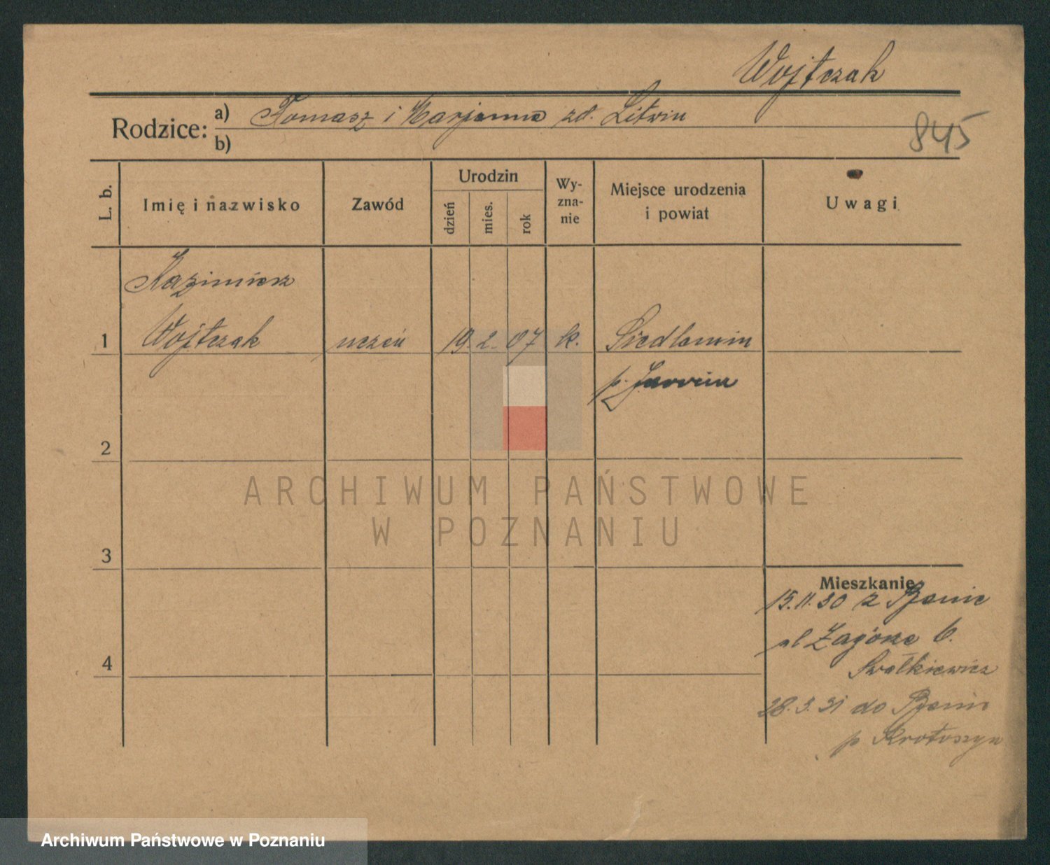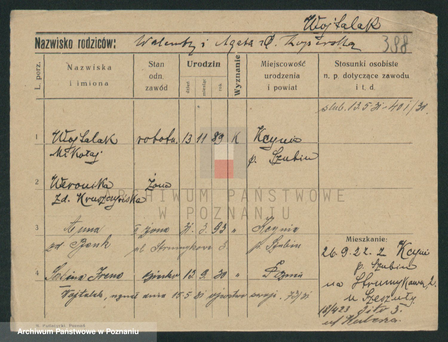 Podgląd karty osobowej dostępny jest po kliknięciu na nazwisko lub ikonkę karty. Można dokonywać powiększenia (ikony na górze) lub przechodzić między kolejnymi skanami (strzałki po bokach).
