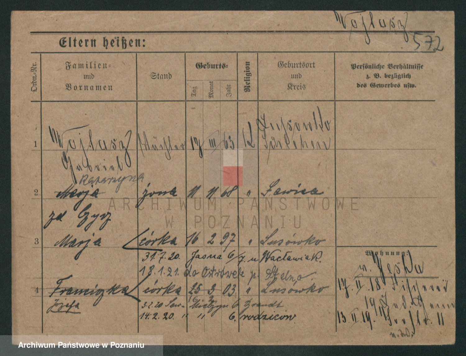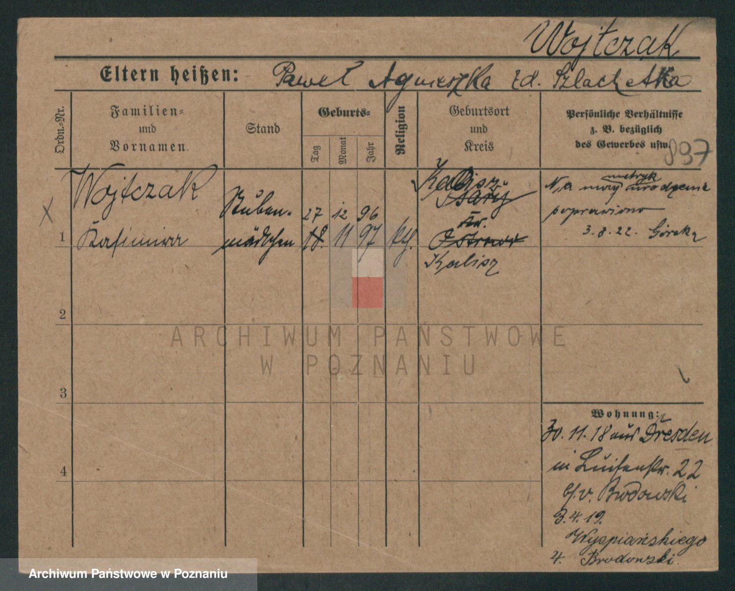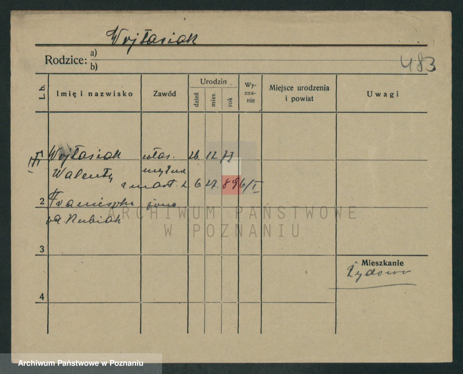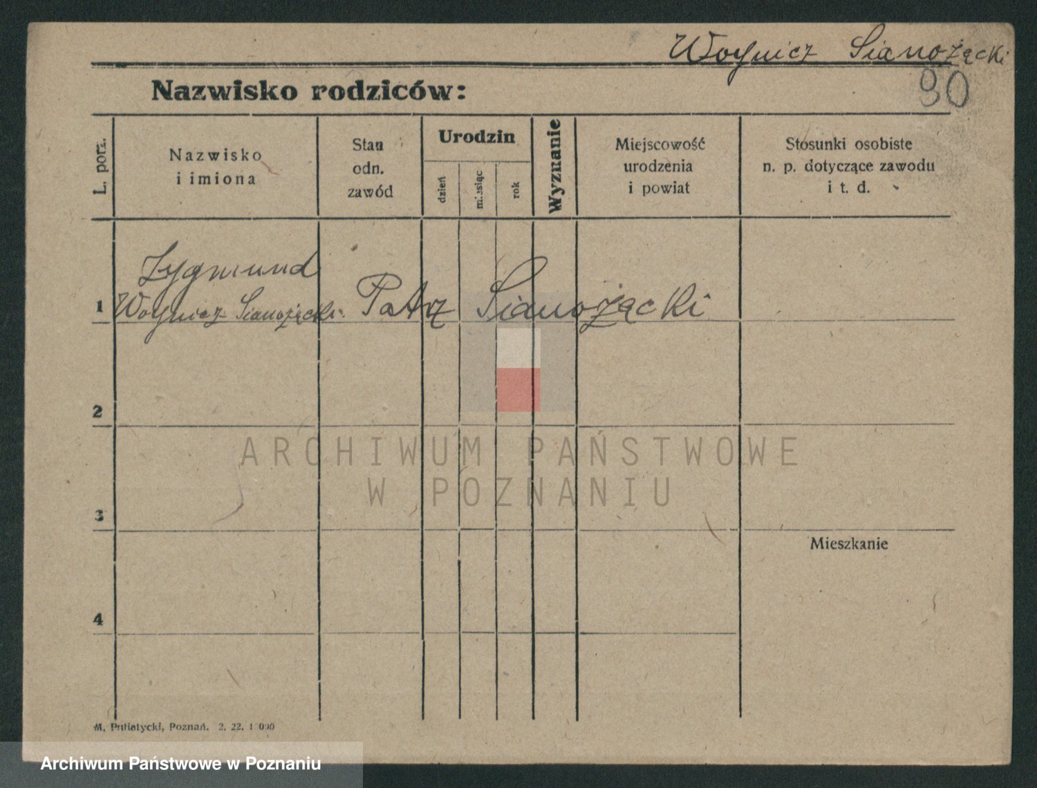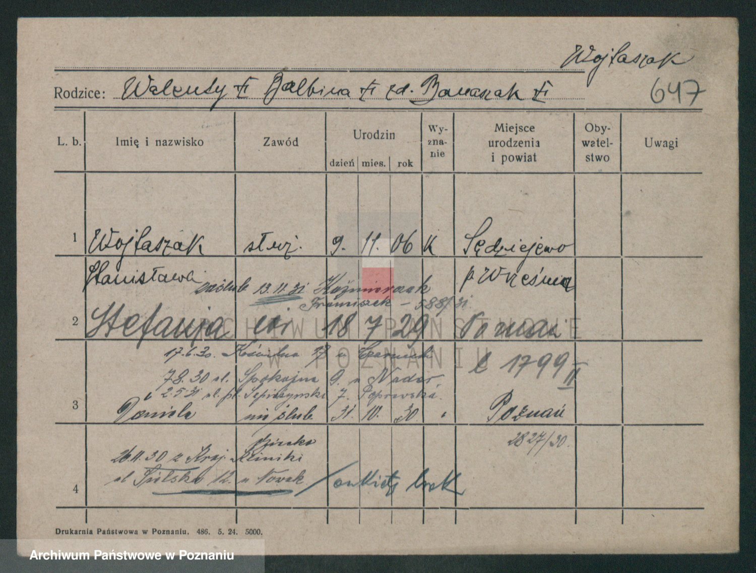 Podgląd karty osobowej dostępny jest po kliknięciu na nazwisko lub ikonkę karty. Można dokonywać powiększenia (ikony na górze) lub przechodzić między kolejnymi skanami (strzałki po bokach).