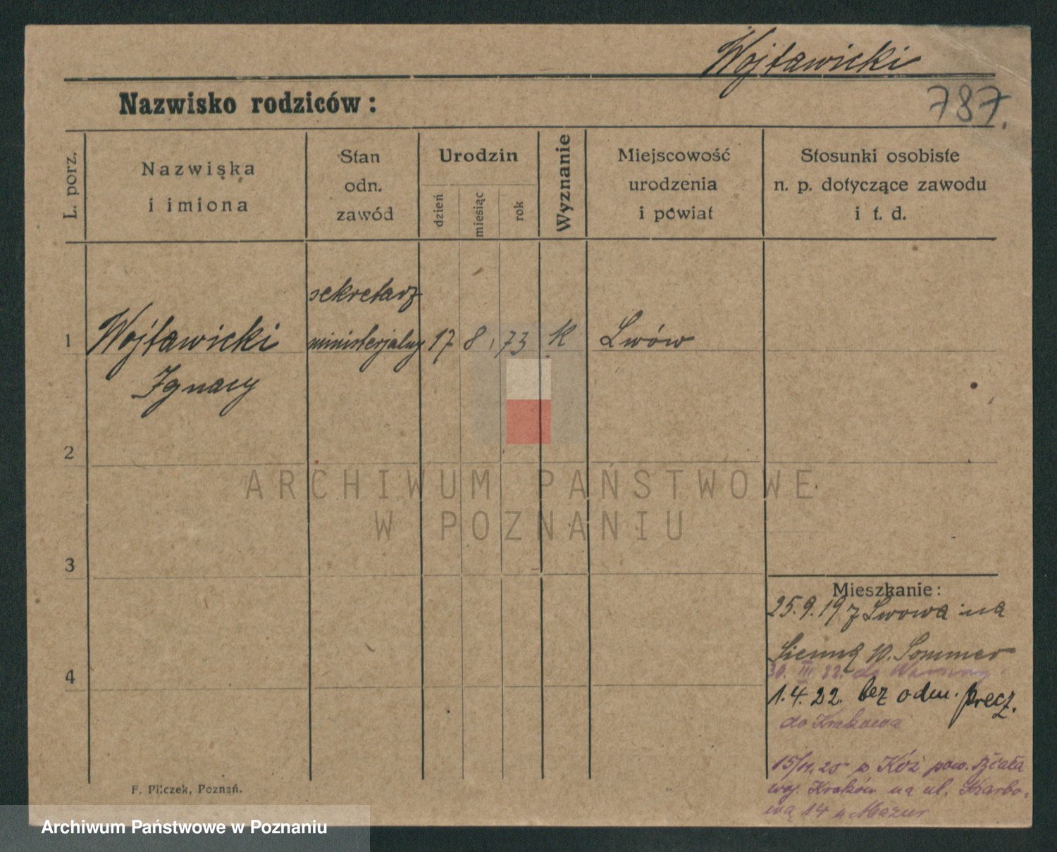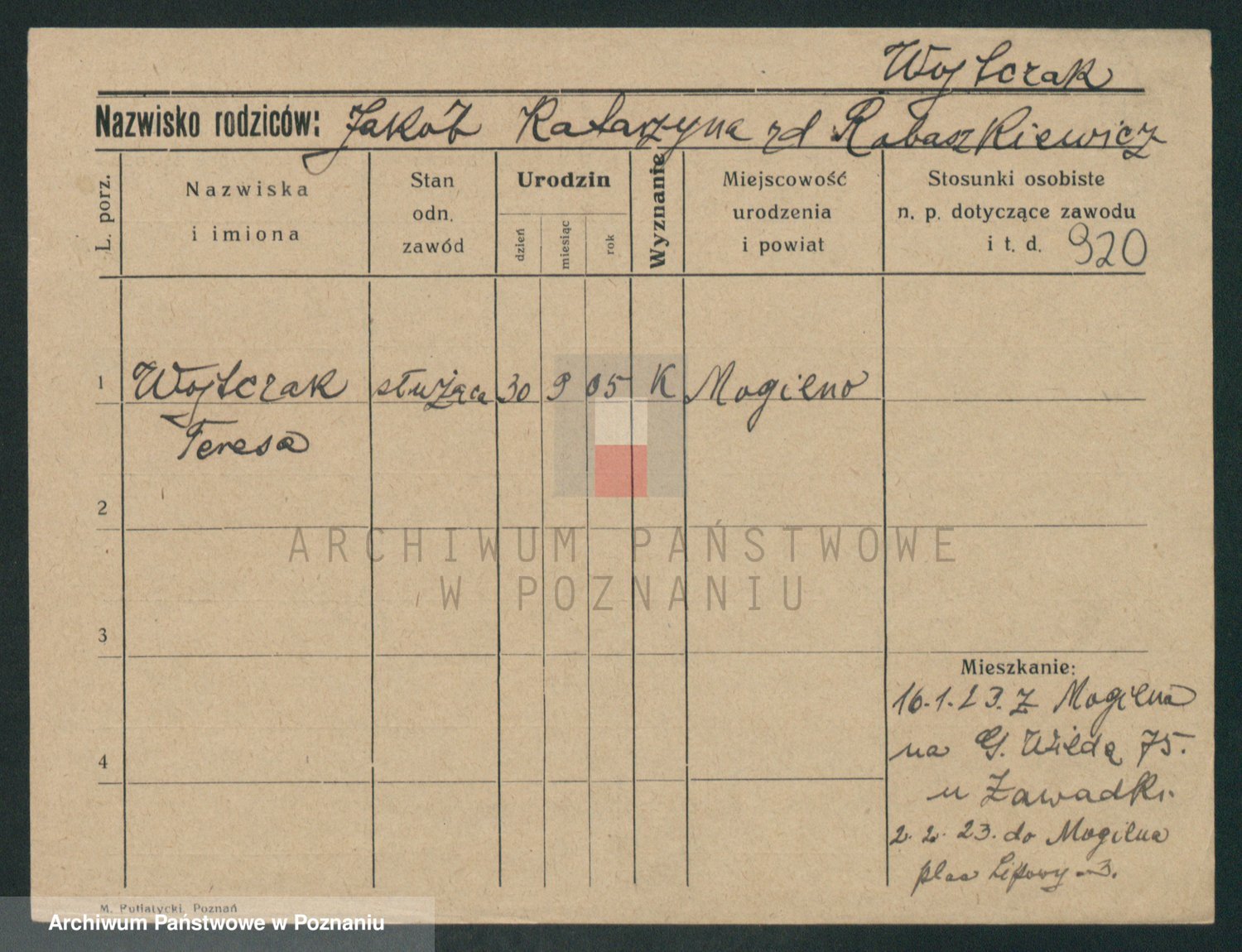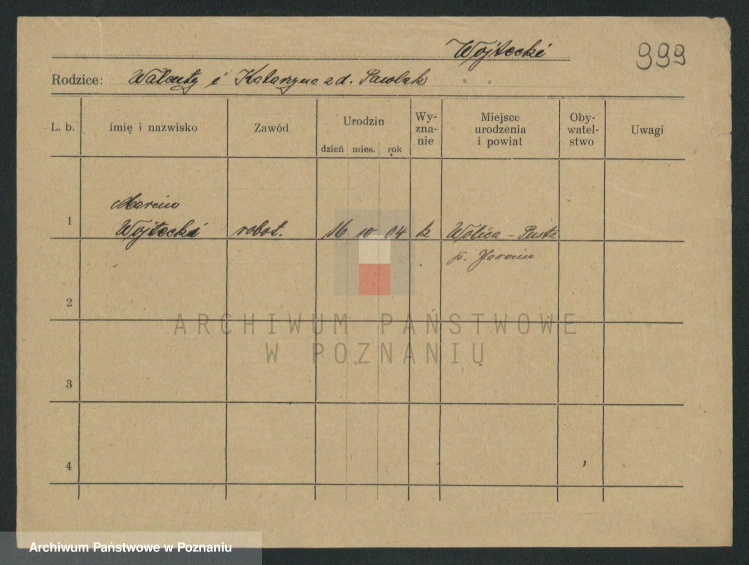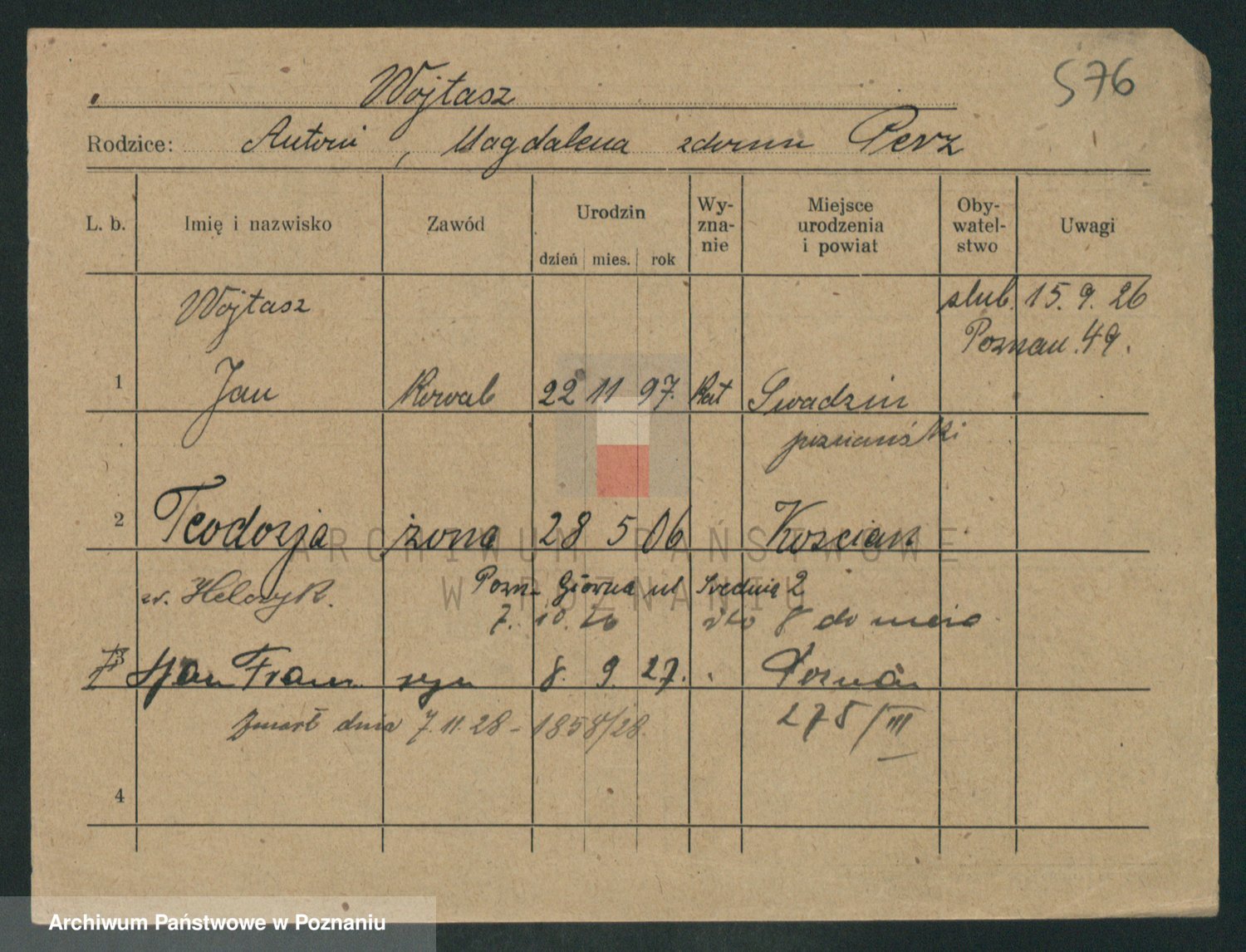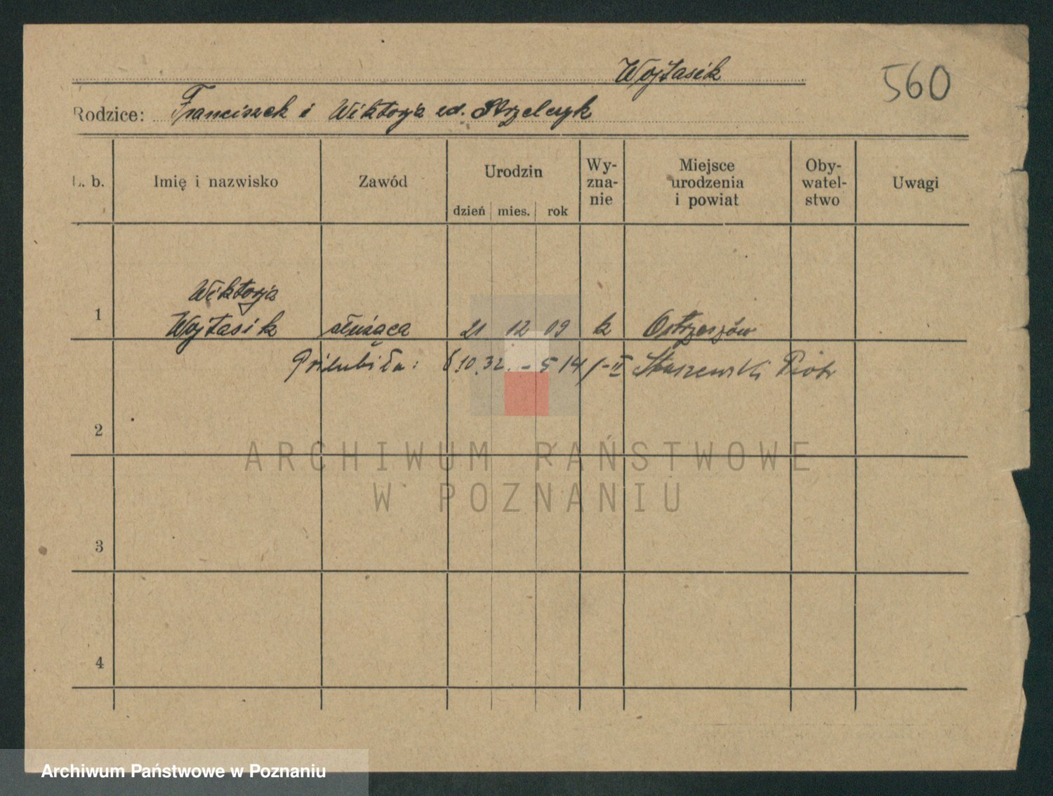 Podgląd karty osobowej dostępny jest po kliknięciu na nazwisko lub ikonkę karty. Można dokonywać powiększenia (ikony na górze) lub przechodzić między kolejnymi skanami (strzałki po bokach).