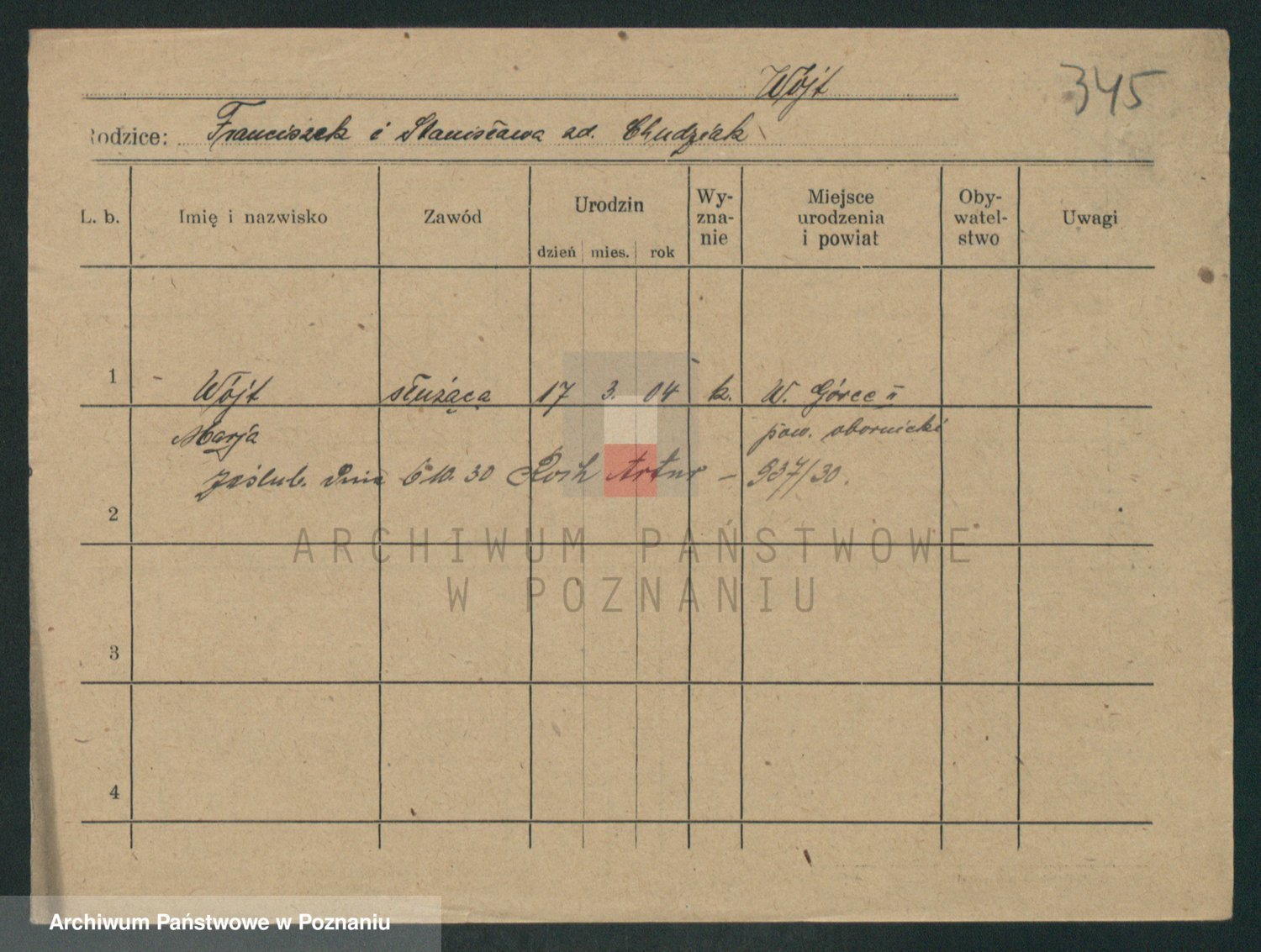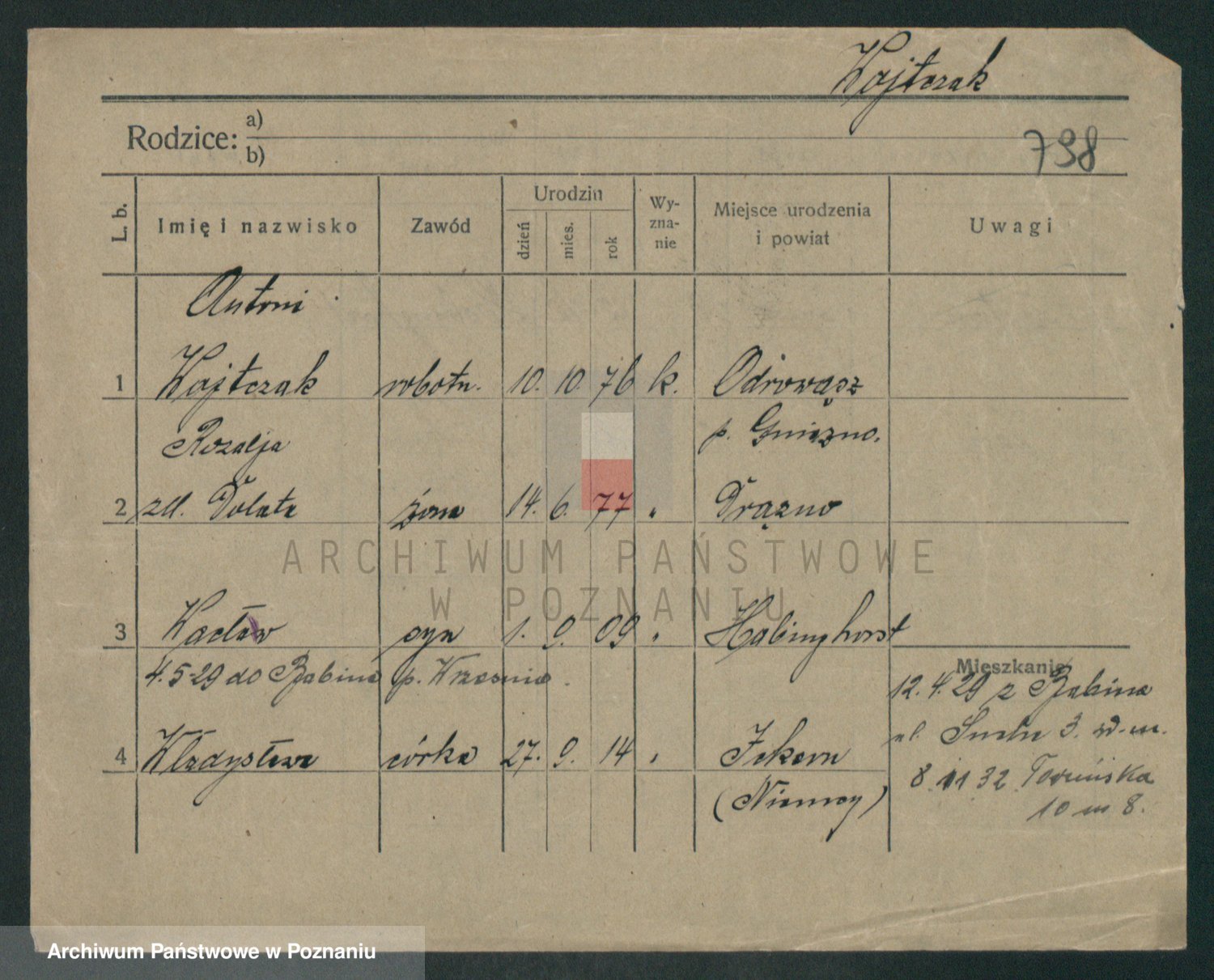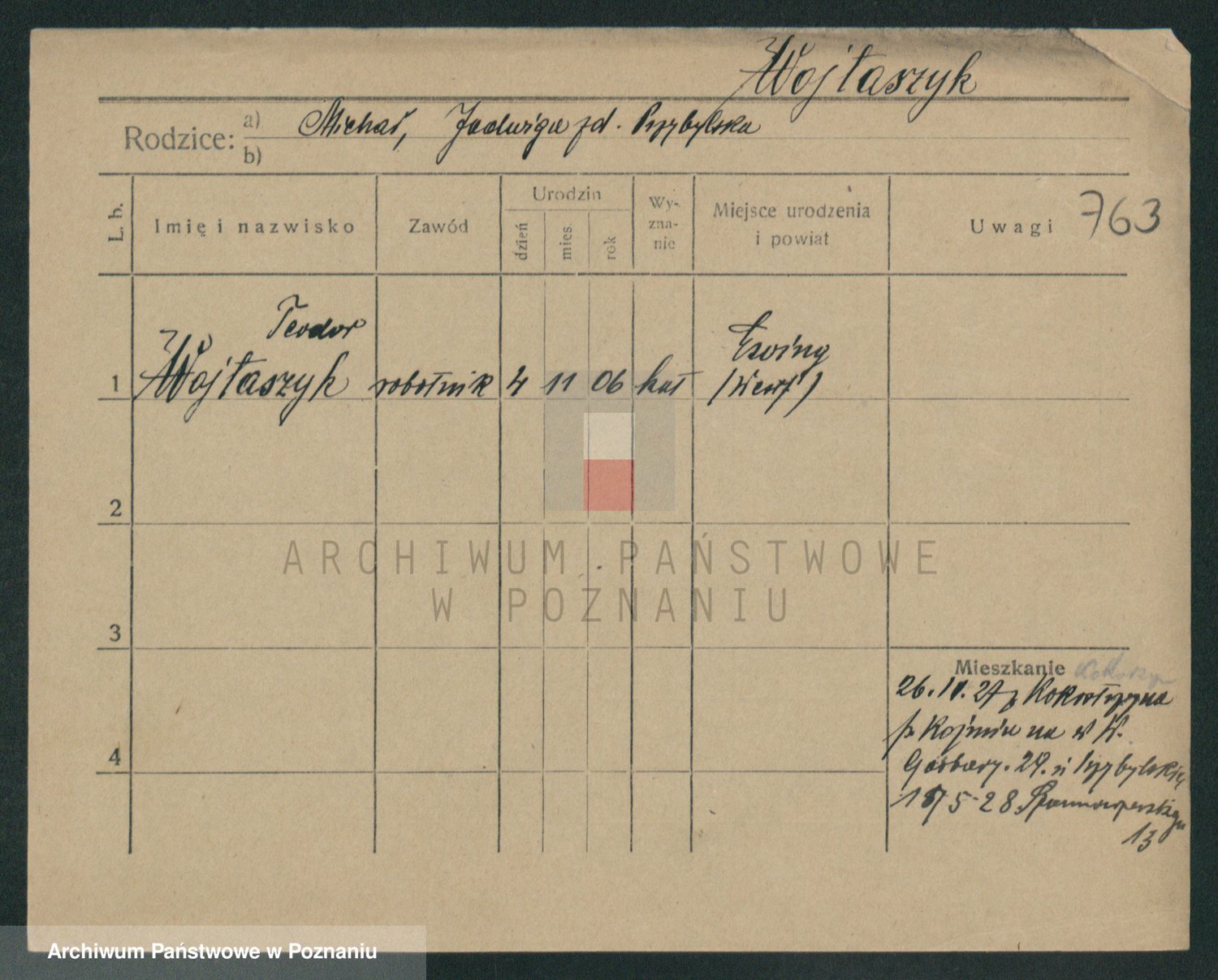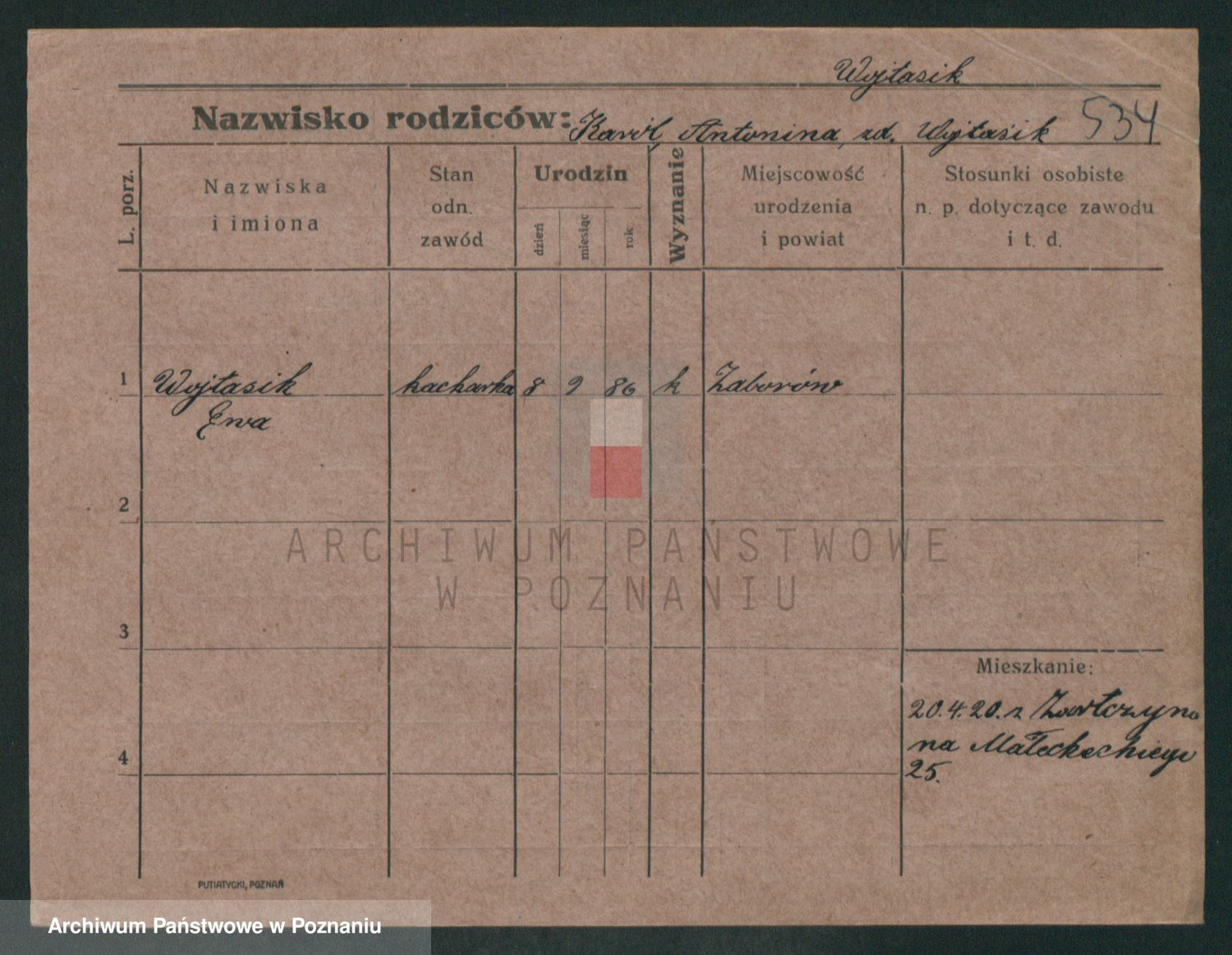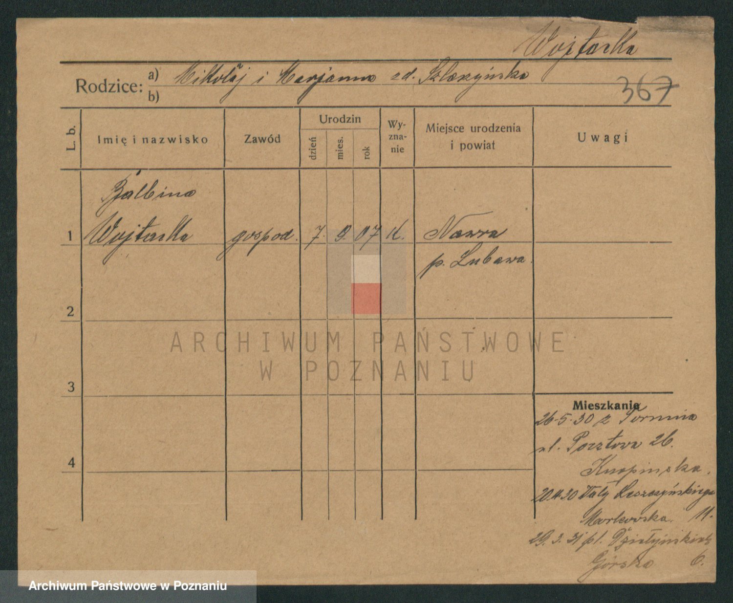 Podgląd karty osobowej dostępny jest po kliknięciu na nazwisko lub ikonkę karty. Można dokonywać powiększenia (ikony na górze) lub przechodzić między kolejnymi skanami (strzałki po bokach).