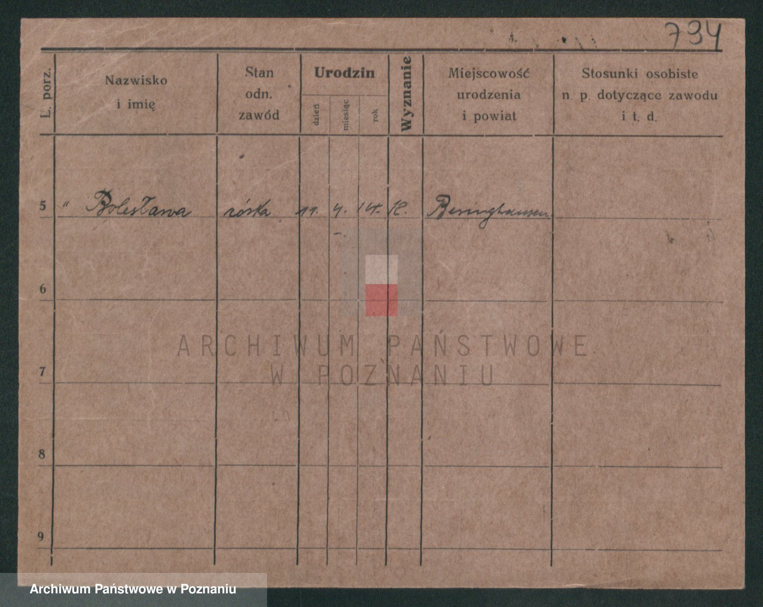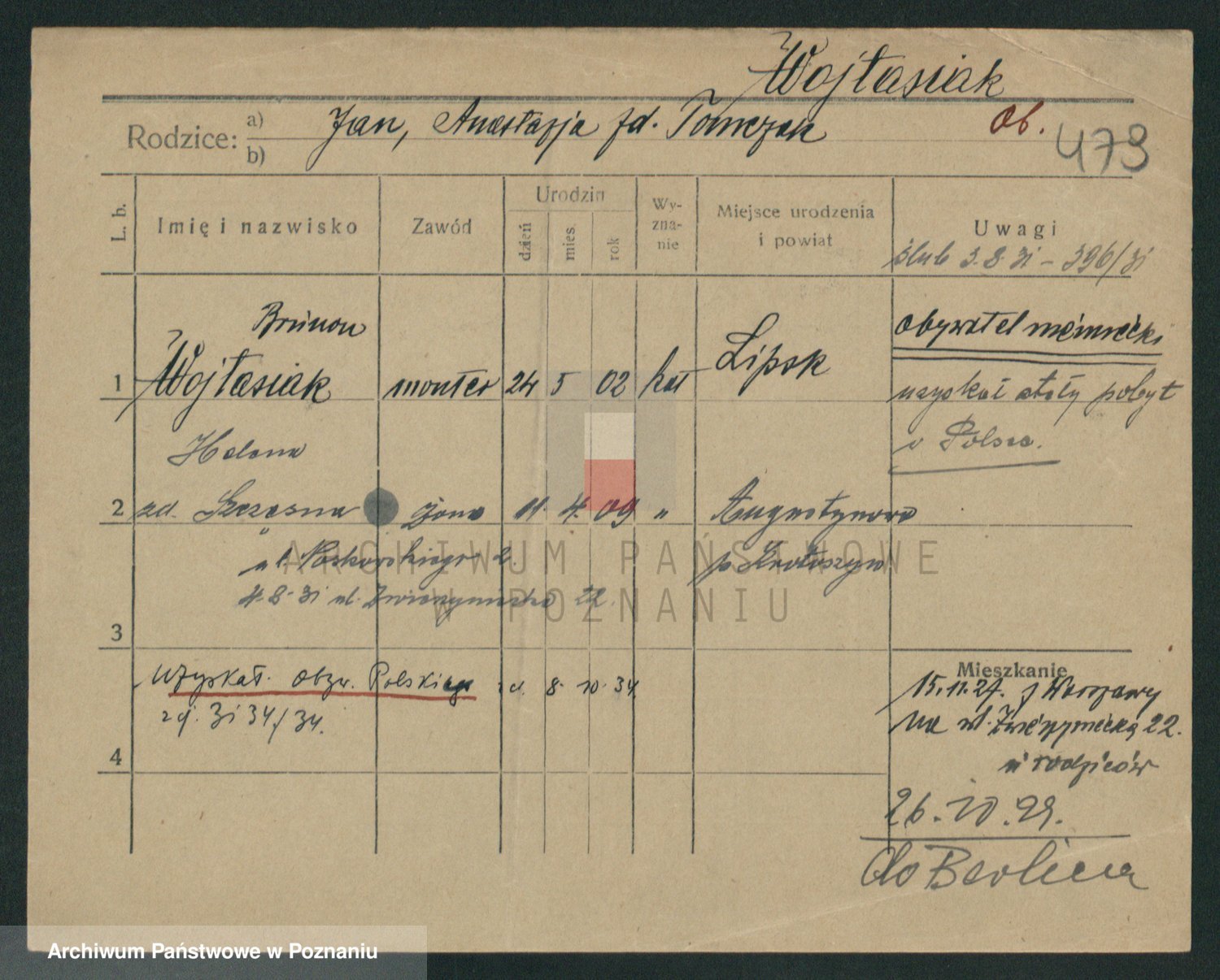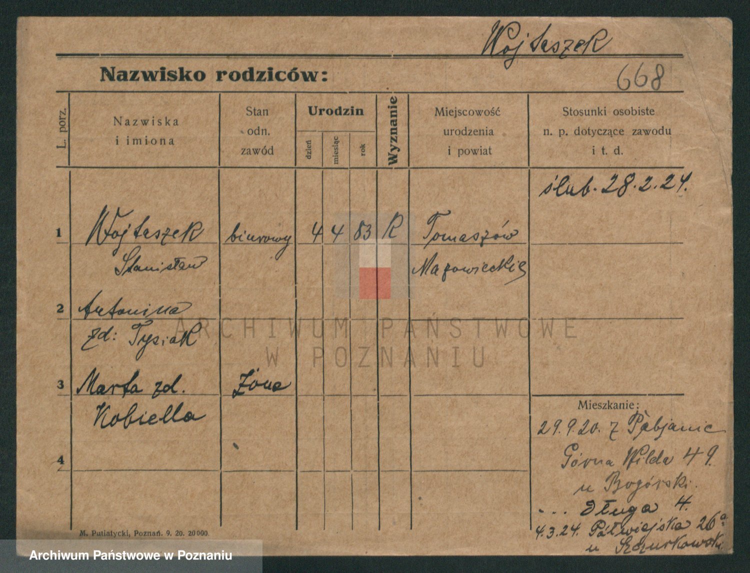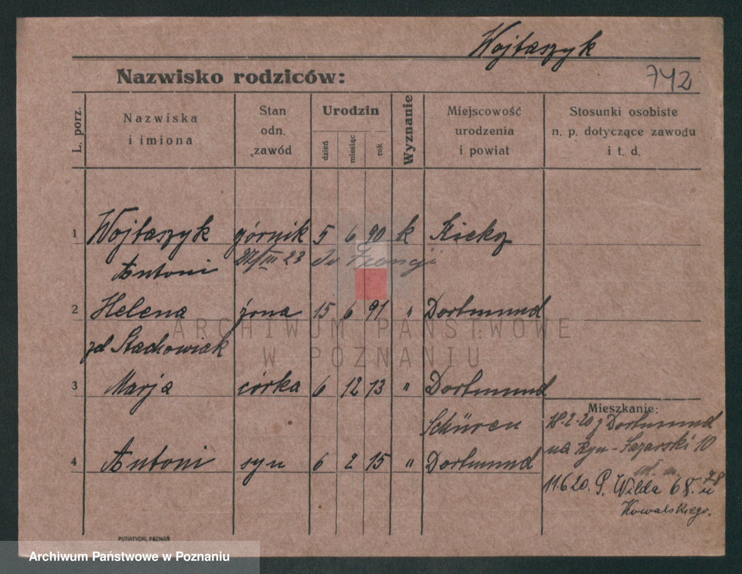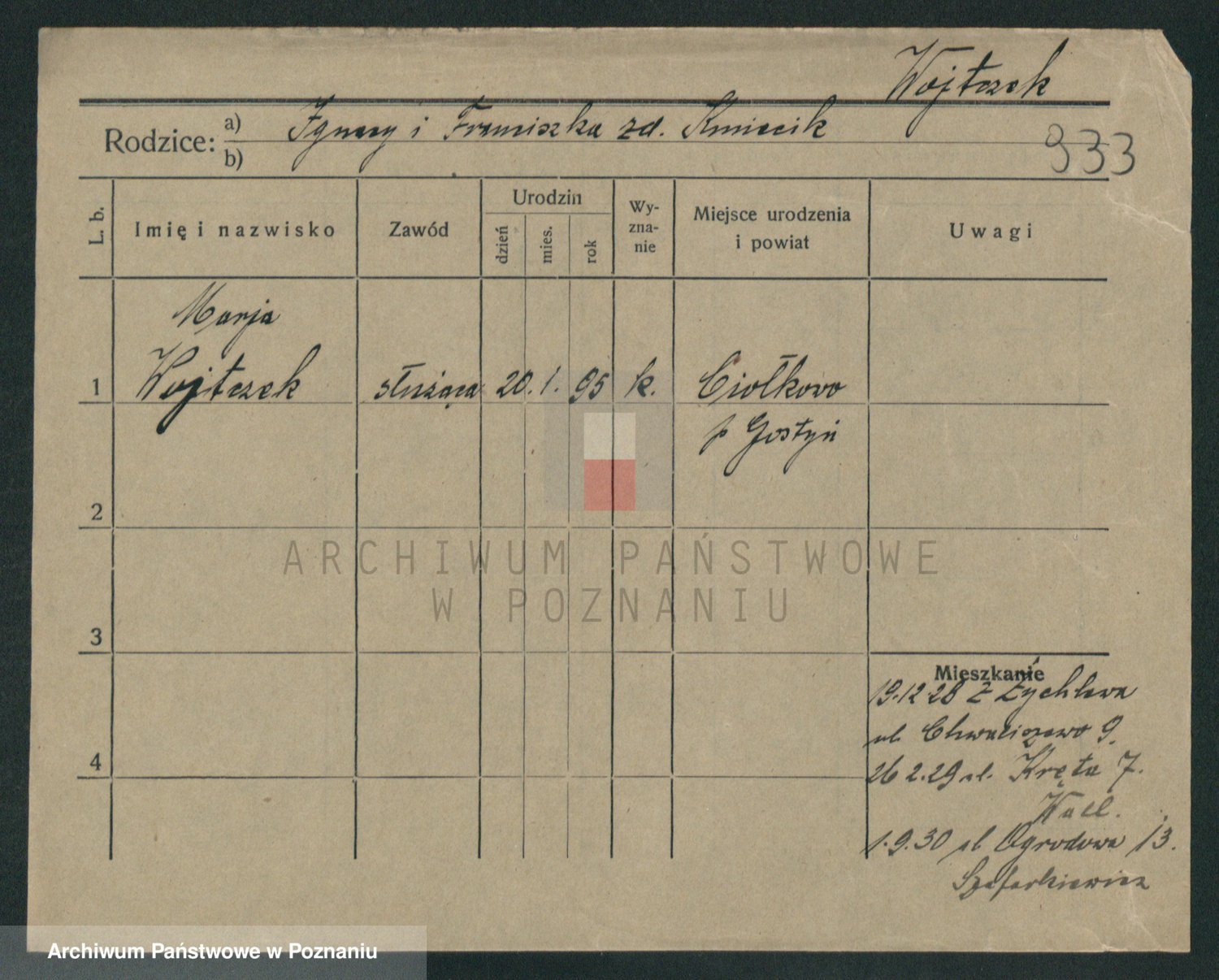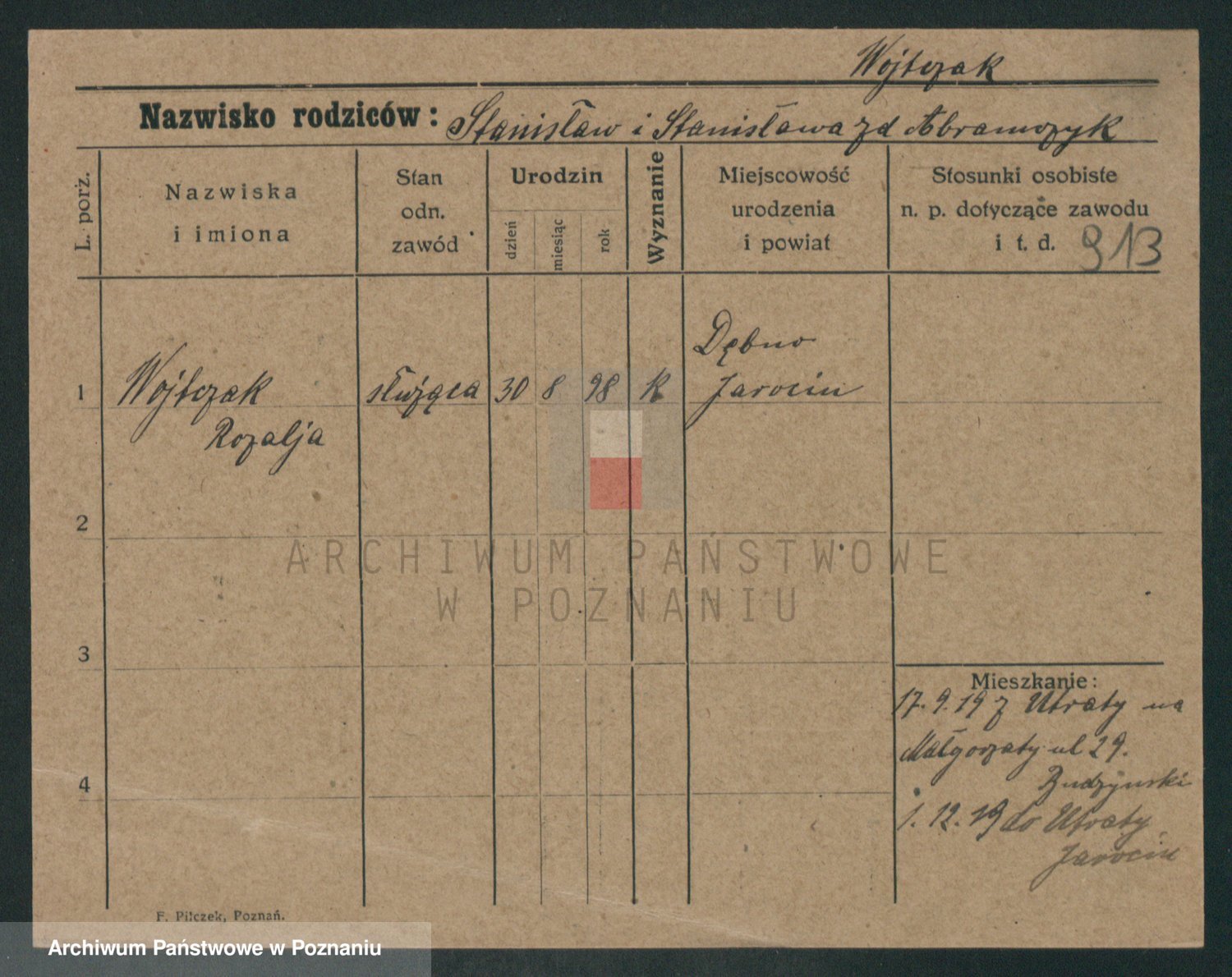 Podgląd karty osobowej dostępny jest po kliknięciu na nazwisko lub ikonkę karty. Można dokonywać powiększenia (ikony na górze) lub przechodzić między kolejnymi skanami (strzałki po bokach).