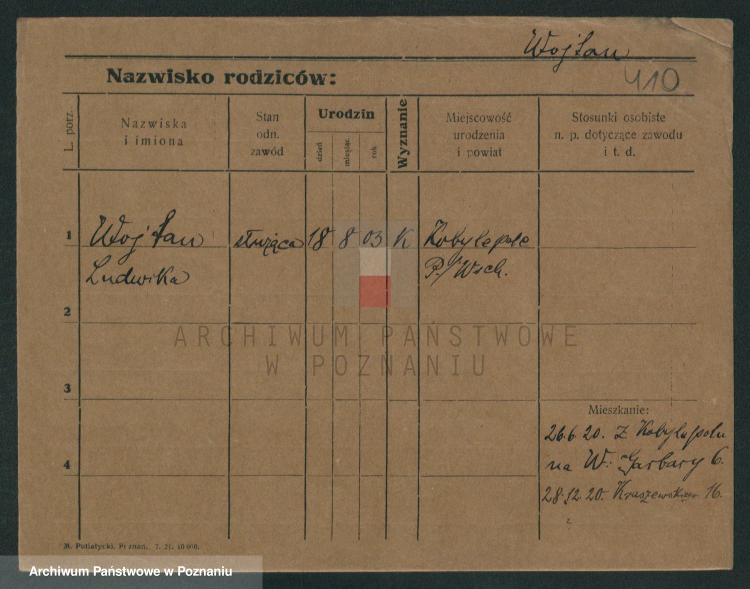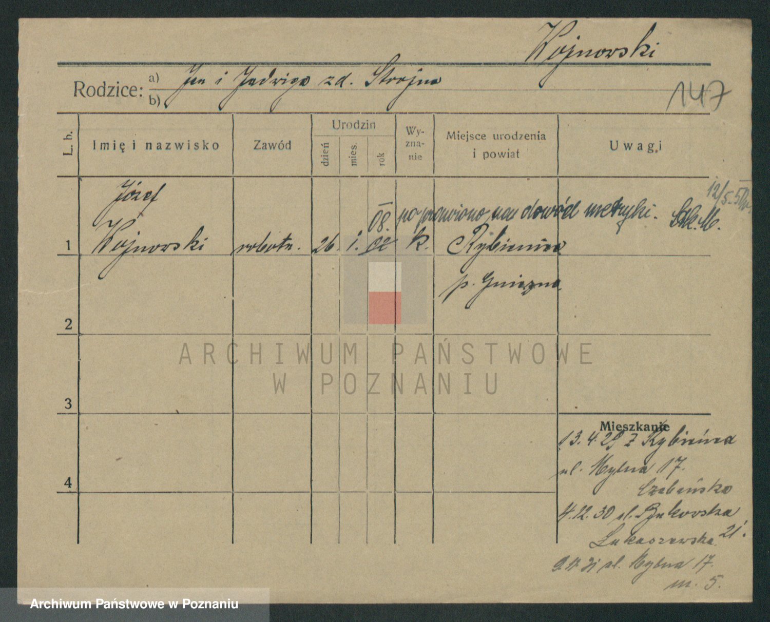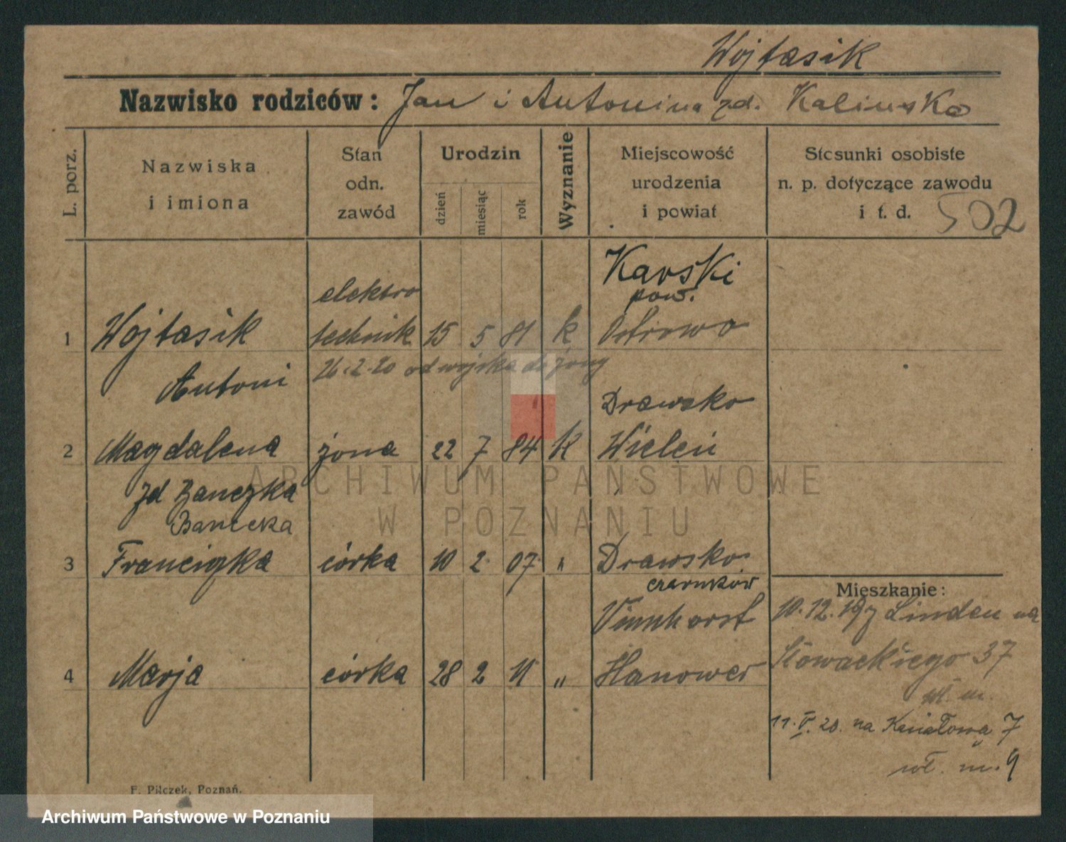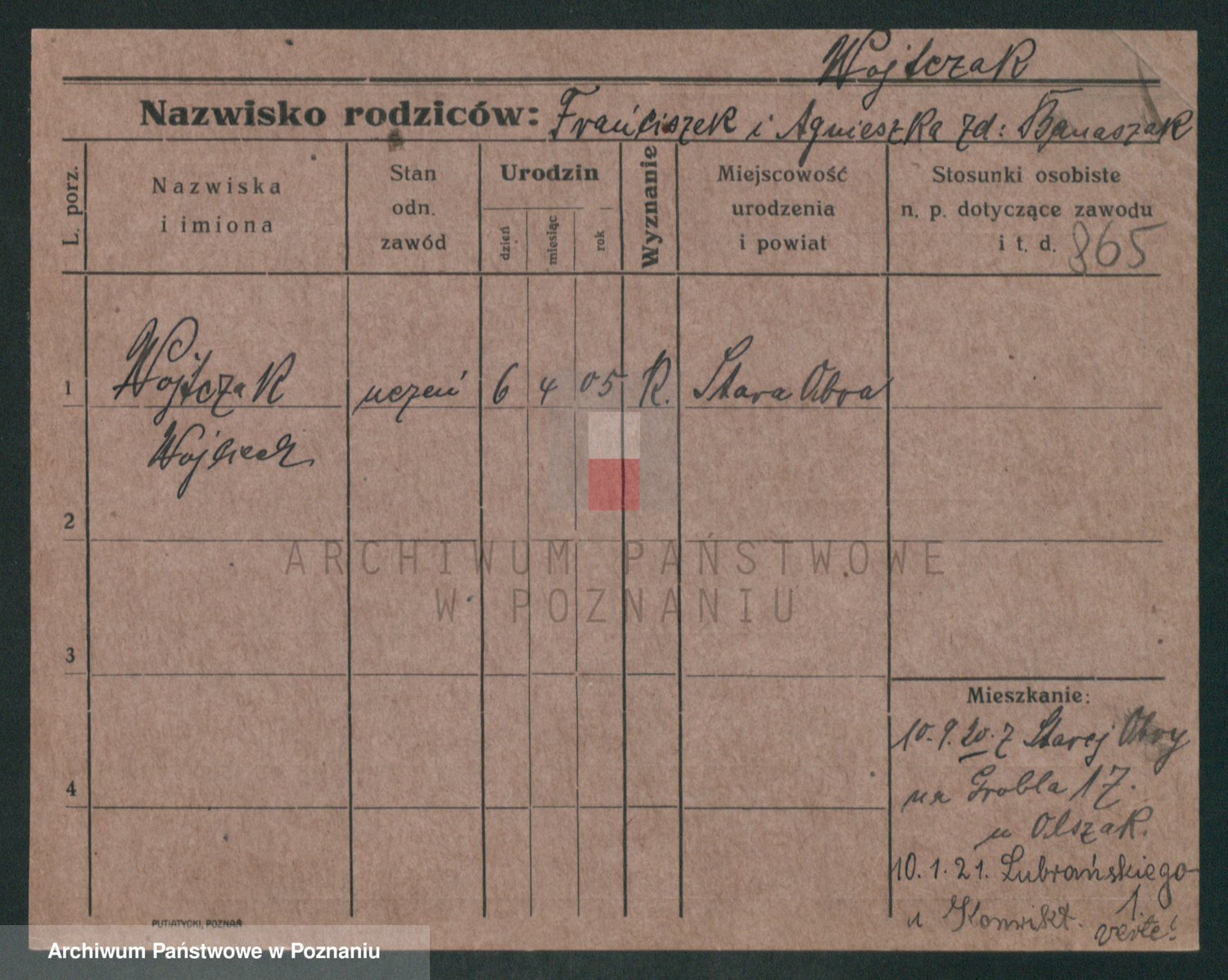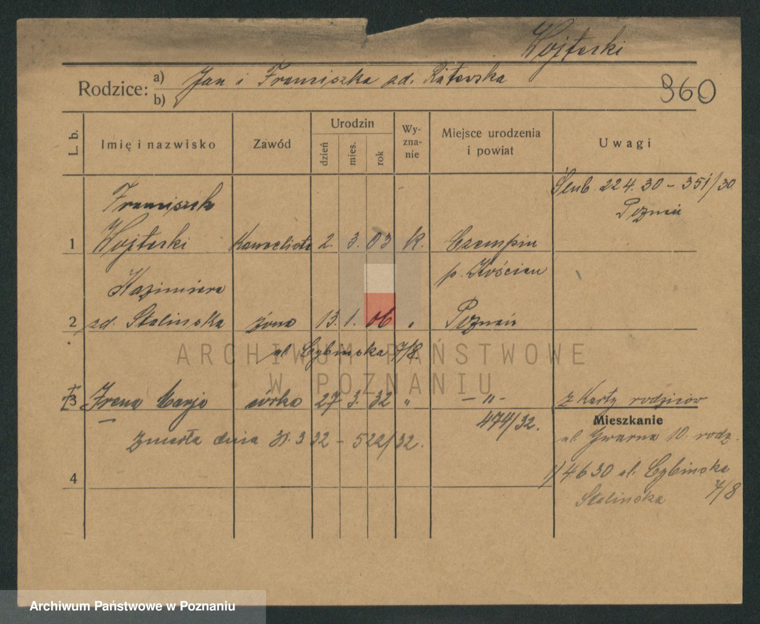 Podgląd karty osobowej dostępny jest po kliknięciu na nazwisko lub ikonkę karty. Można dokonywać powiększenia (ikony na górze) lub przechodzić między kolejnymi skanami (strzałki po bokach).