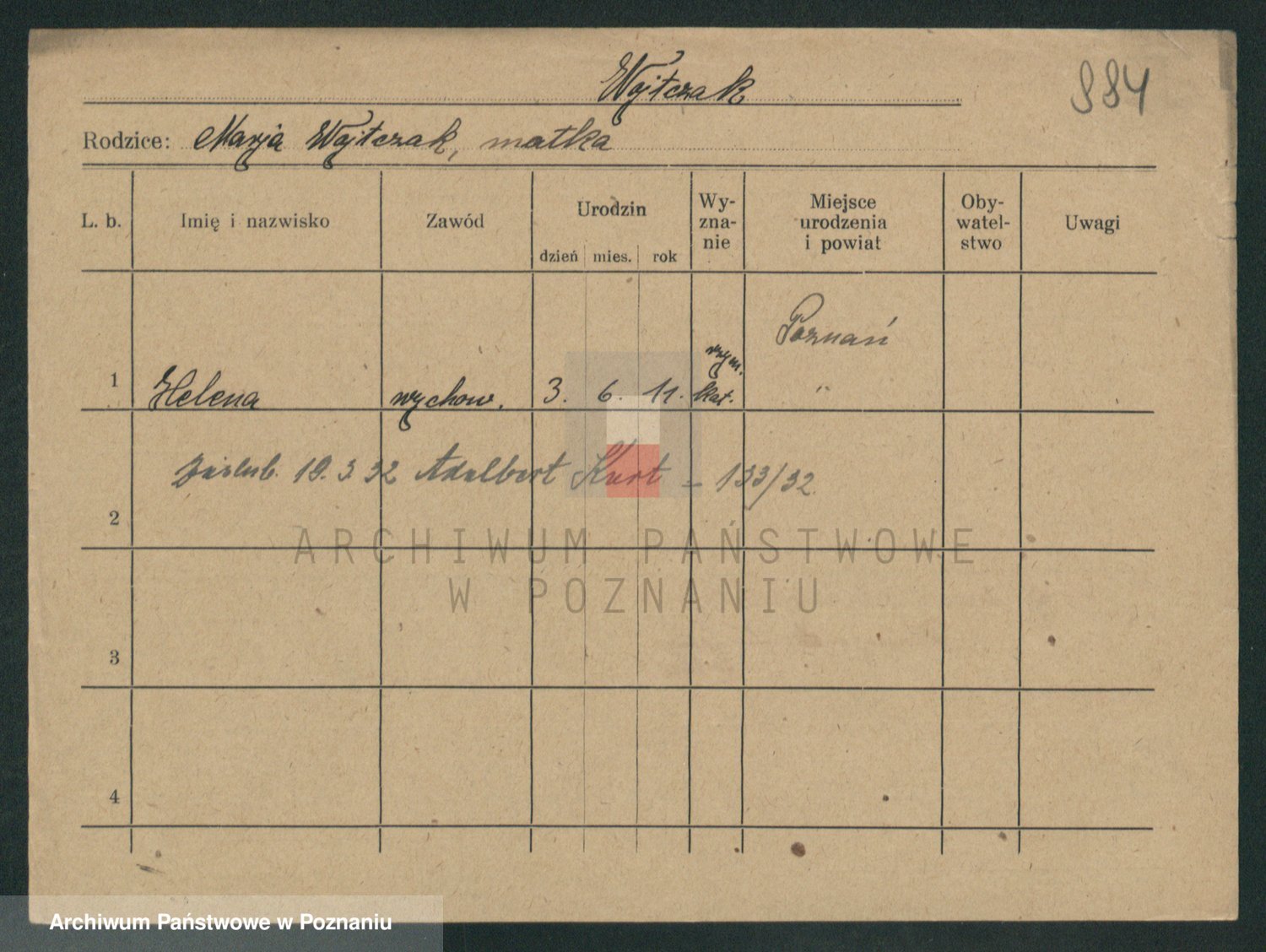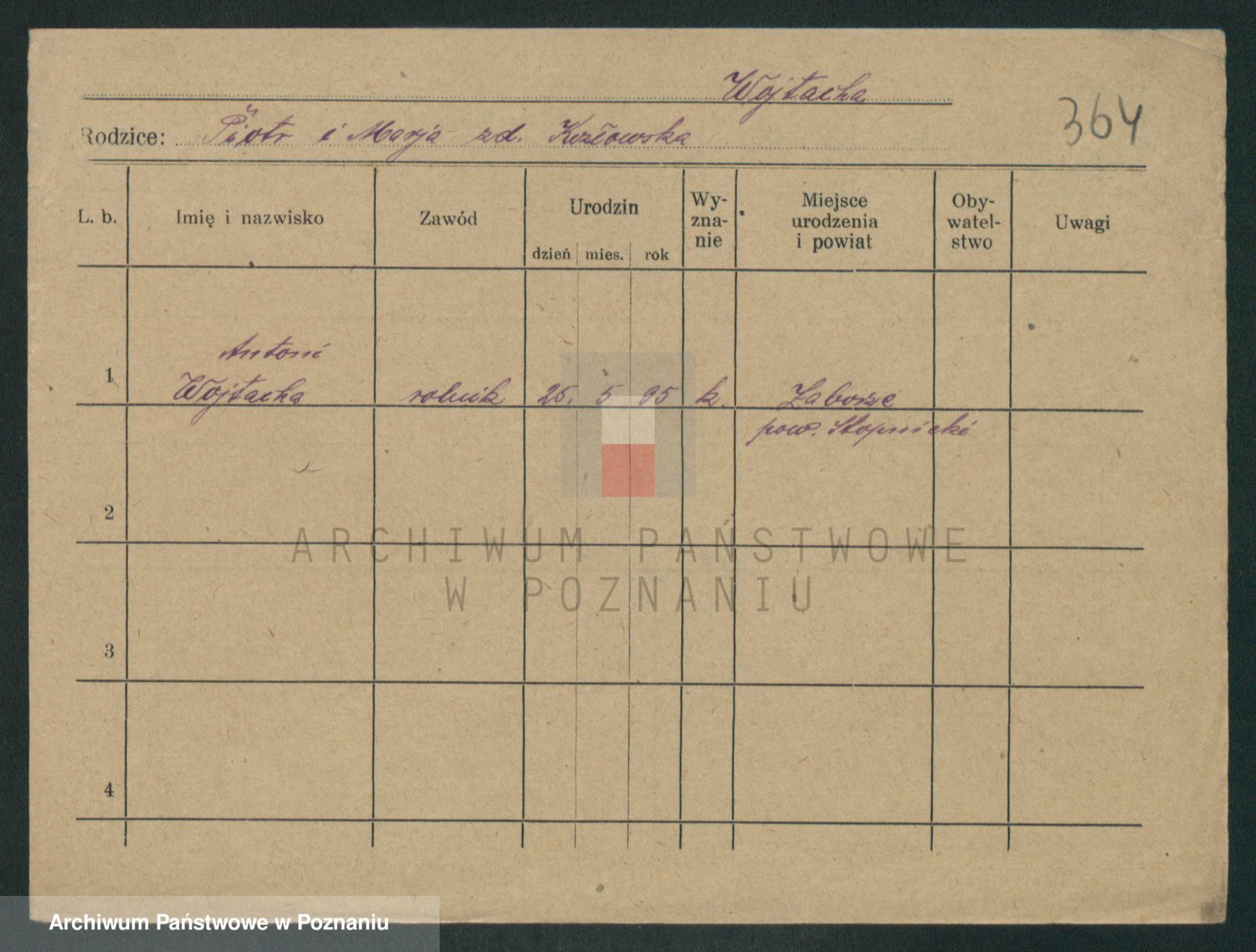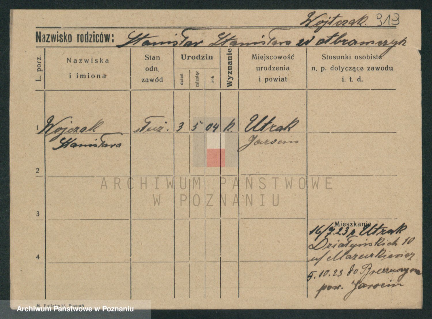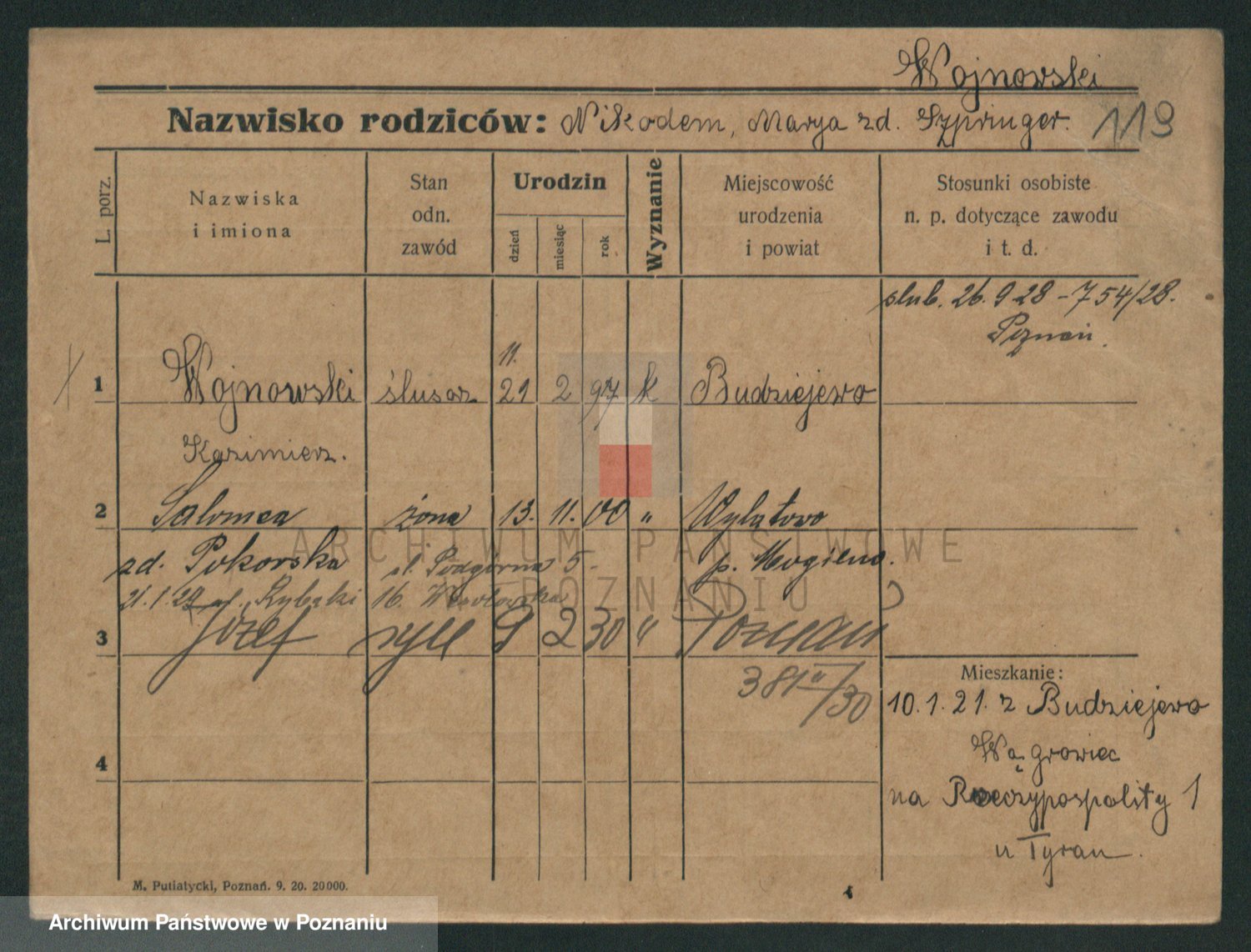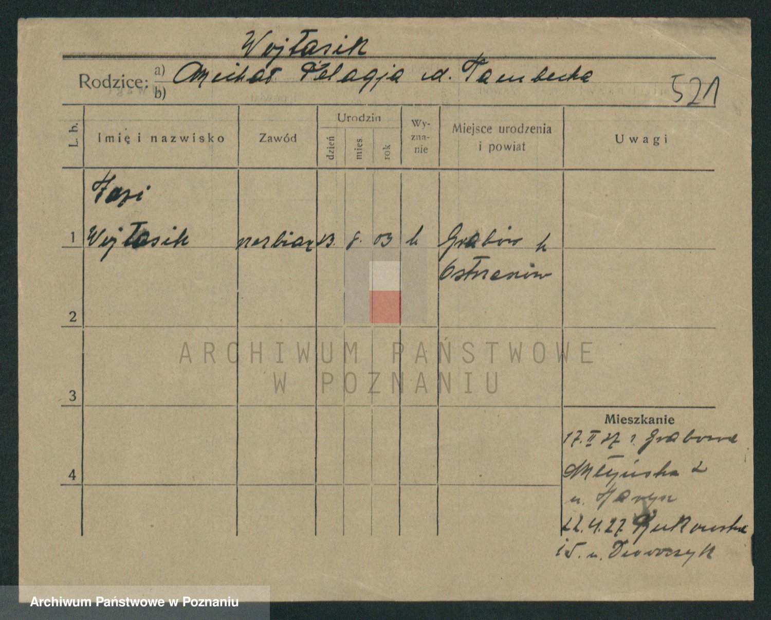 Podgląd karty osobowej dostępny jest po kliknięciu na nazwisko lub ikonkę karty. Można dokonywać powiększenia (ikony na górze) lub przechodzić między kolejnymi skanami (strzałki po bokach).