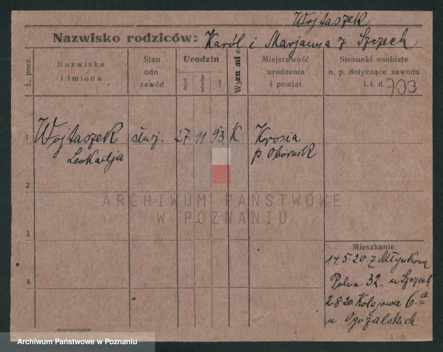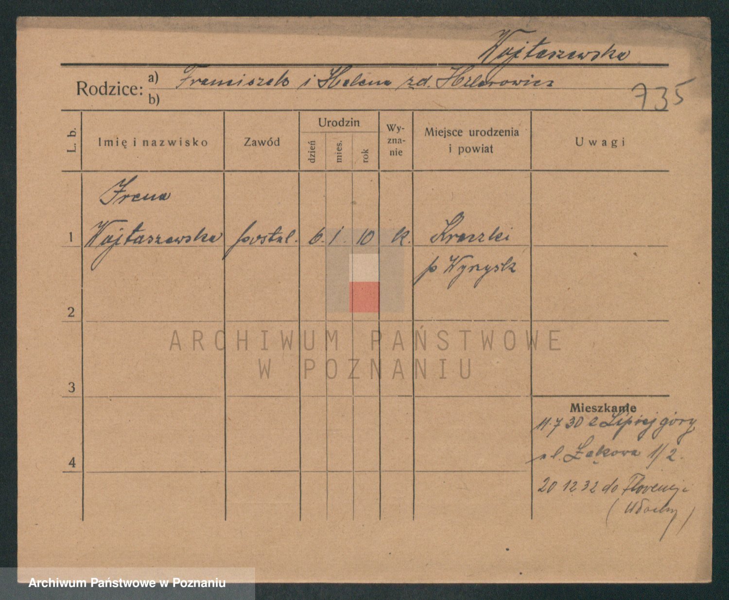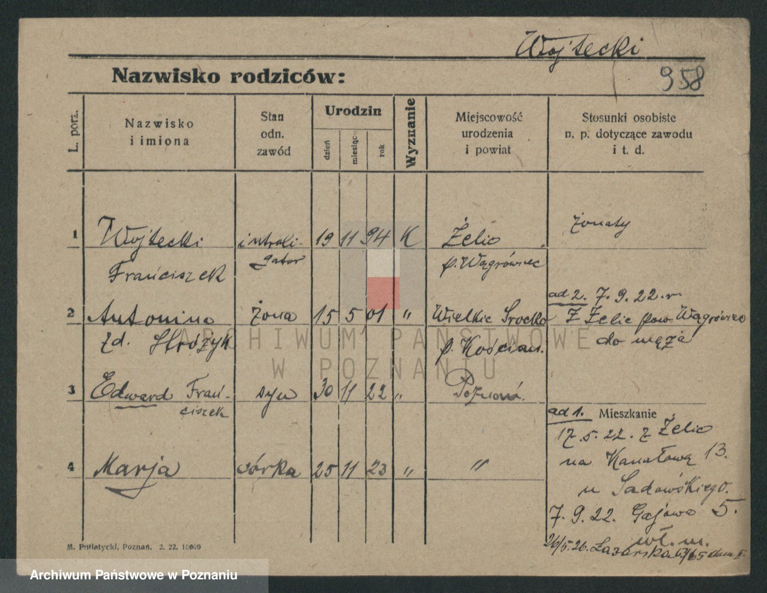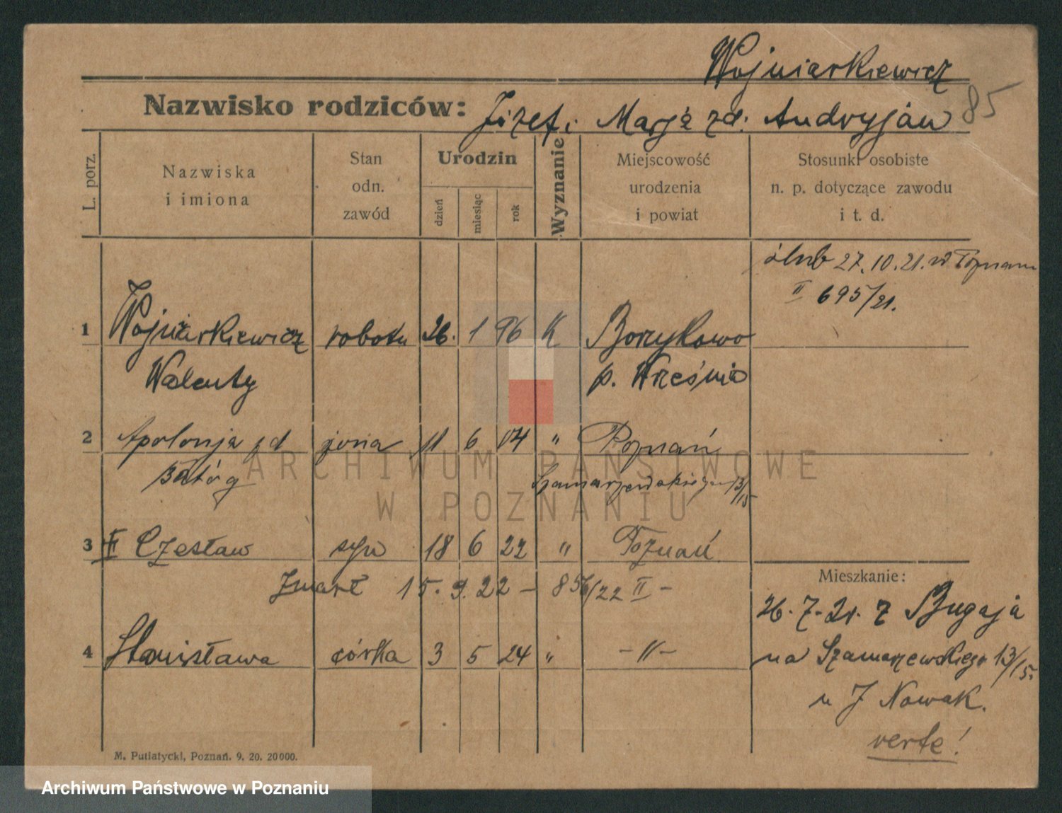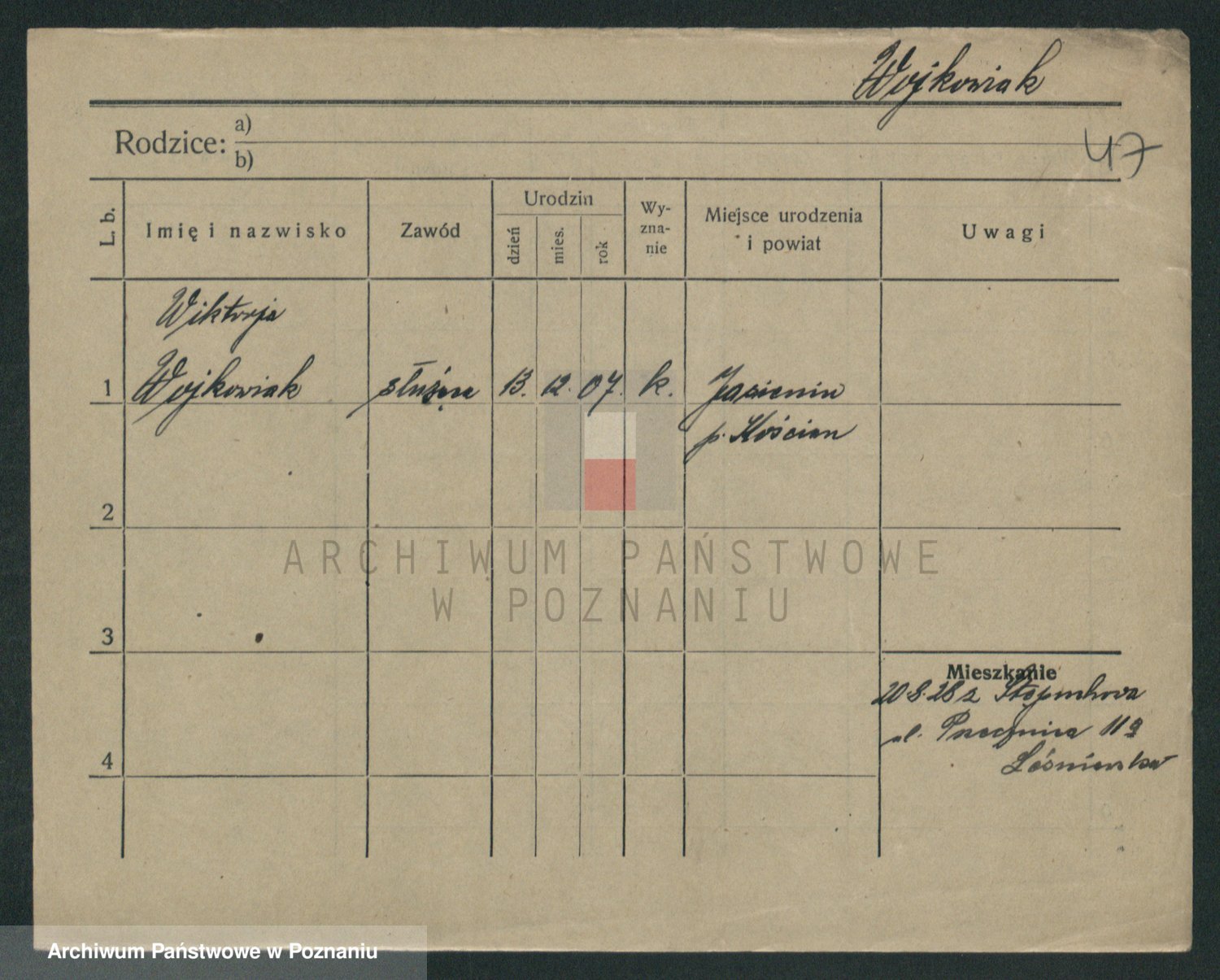 Podgląd karty osobowej dostępny jest po kliknięciu na nazwisko lub ikonkę karty. Można dokonywać powiększenia (ikony na górze) lub przechodzić między kolejnymi skanami (strzałki po bokach).