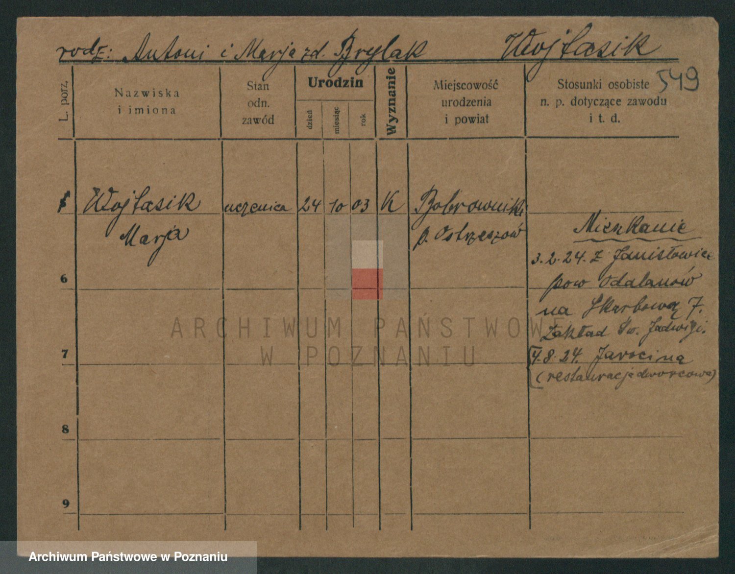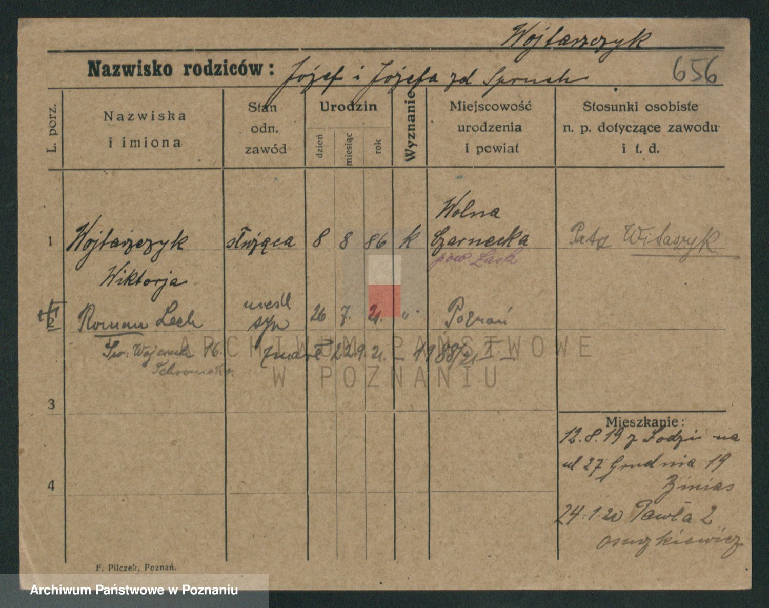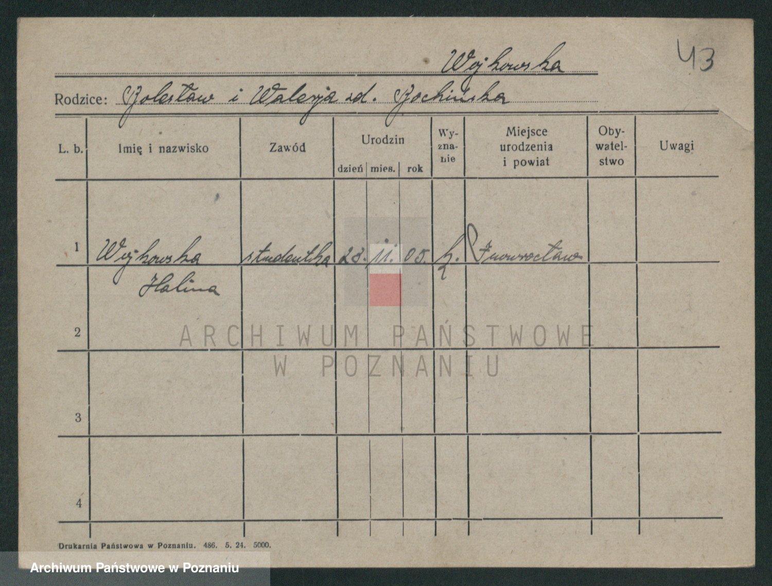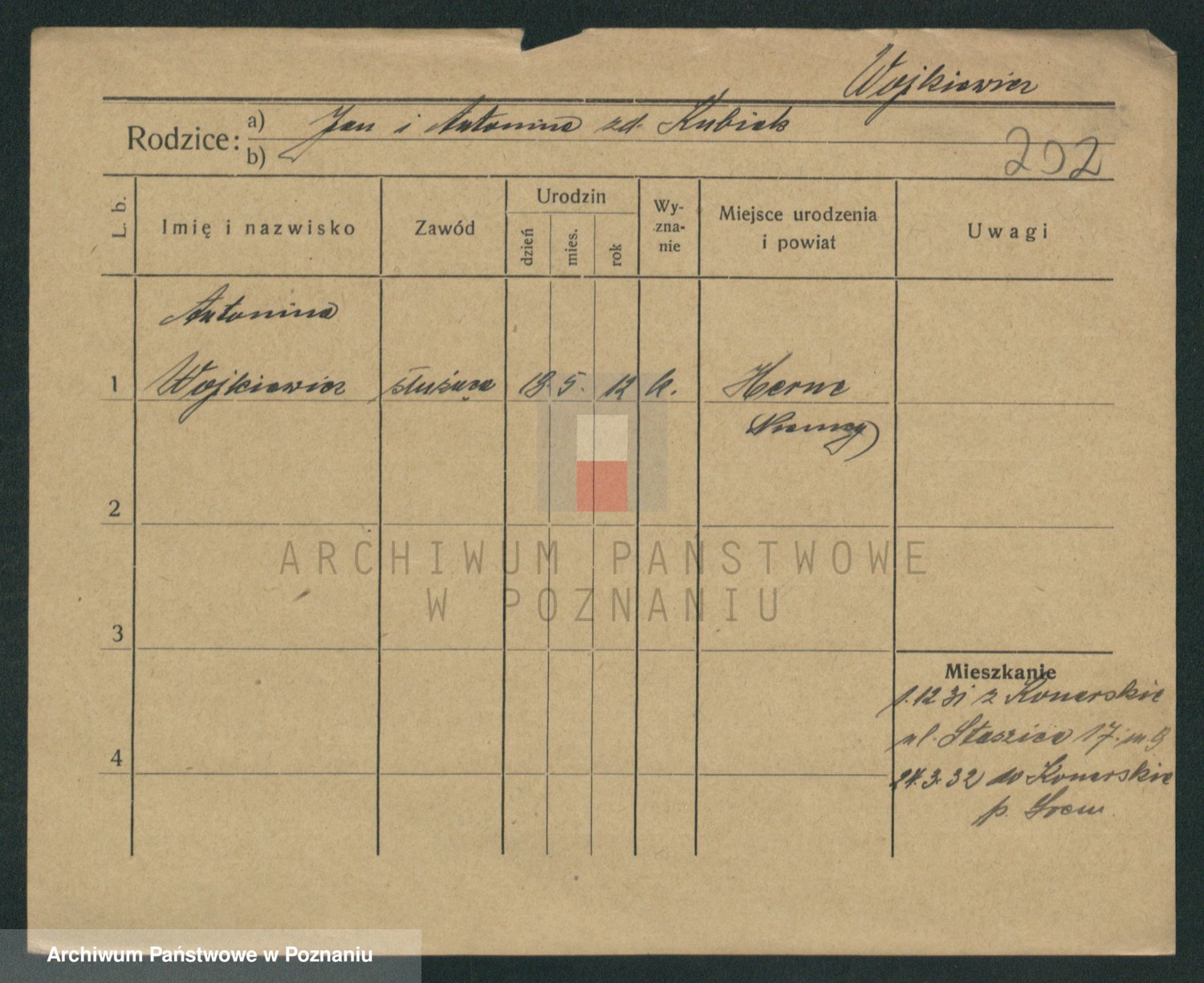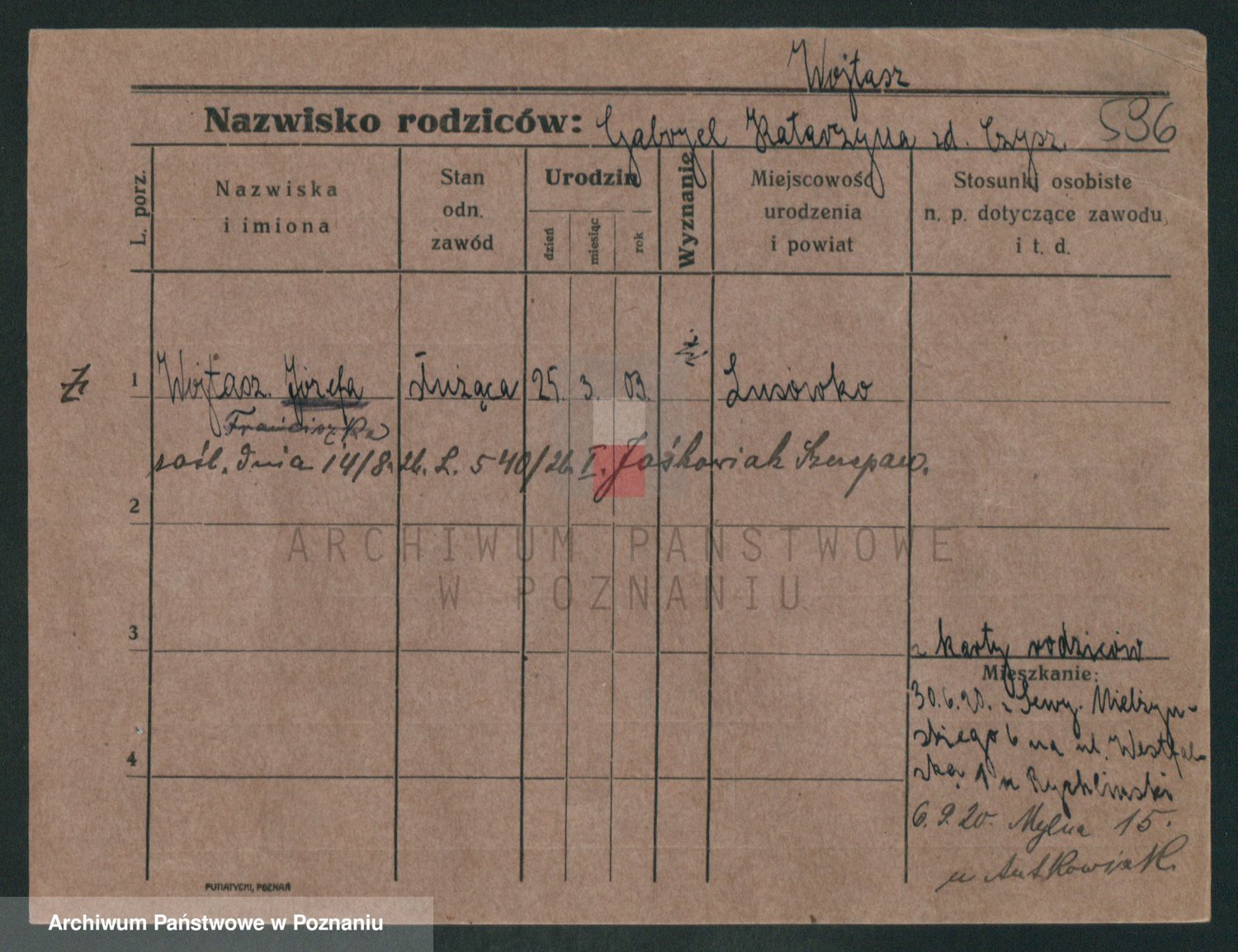 Podgląd karty osobowej dostępny jest po kliknięciu na nazwisko lub ikonkę karty. Można dokonywać powiększenia (ikony na górze) lub przechodzić między kolejnymi skanami (strzałki po bokach).