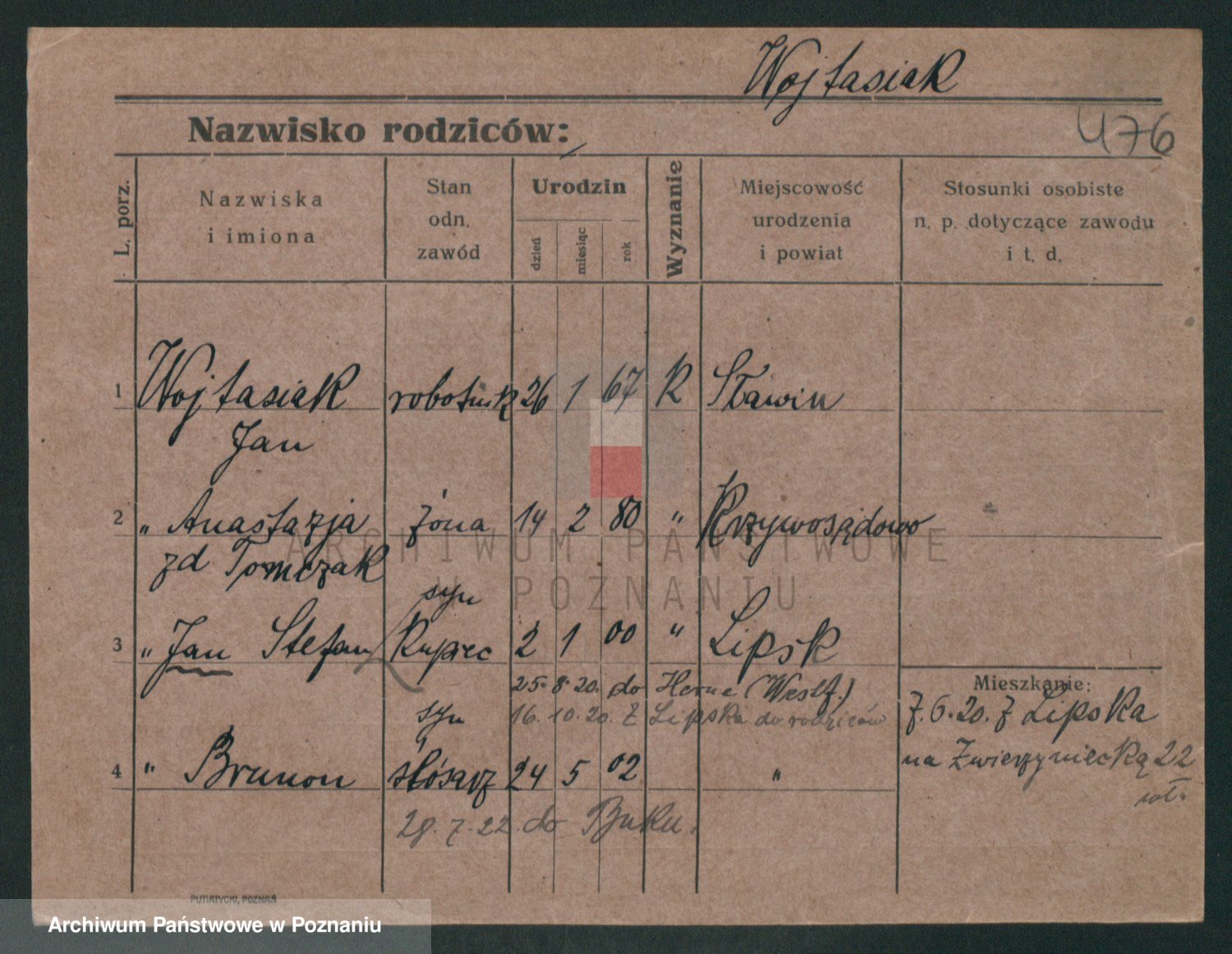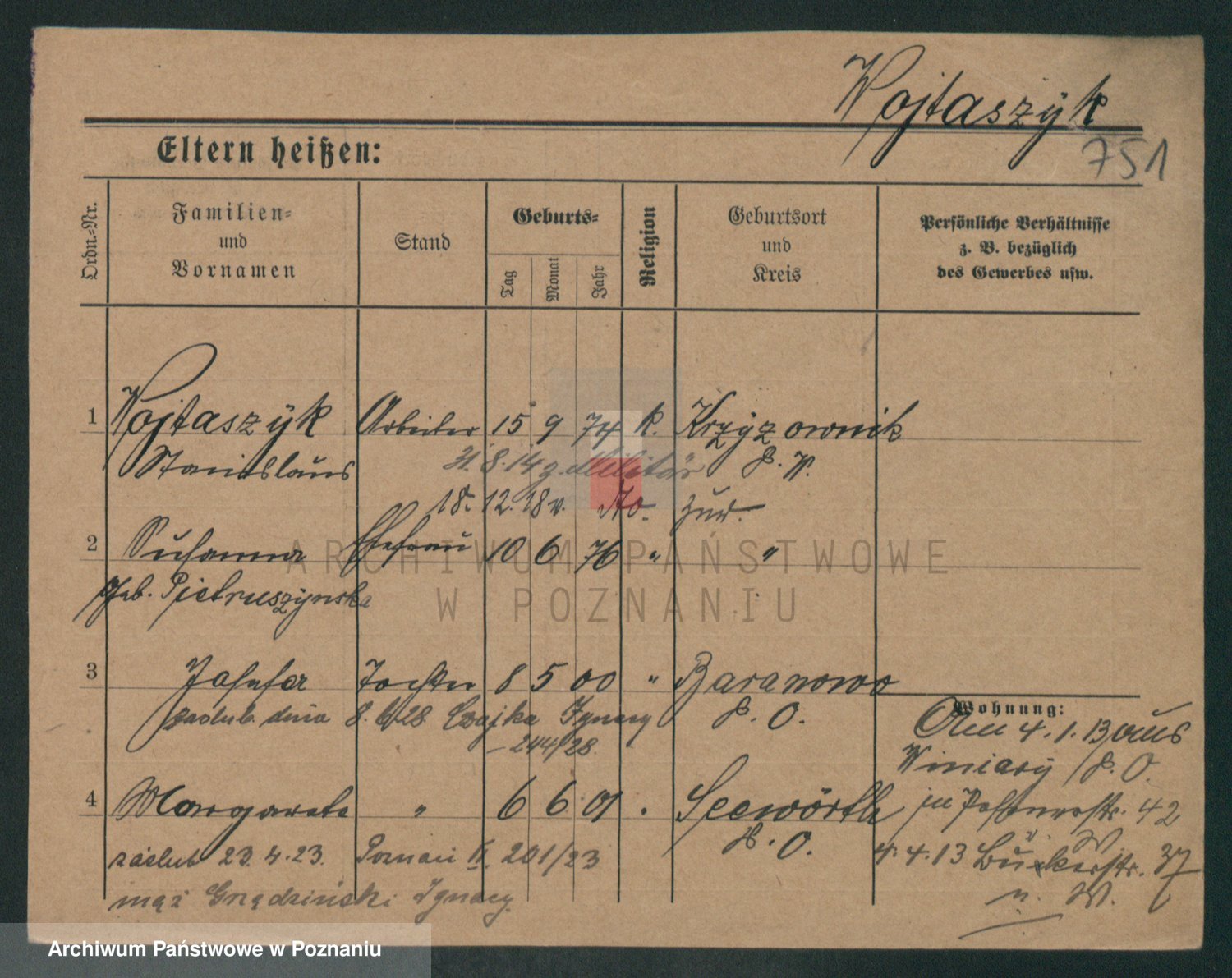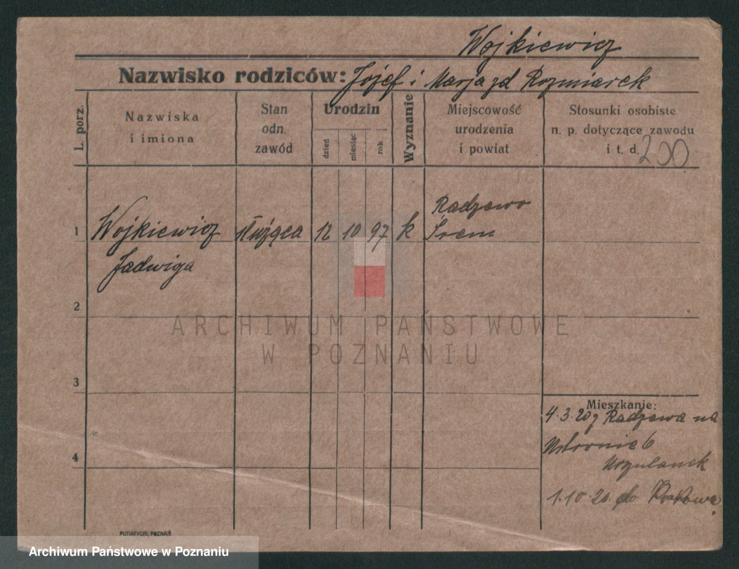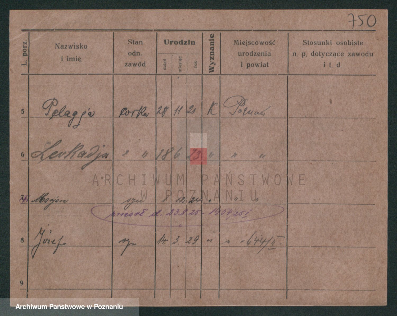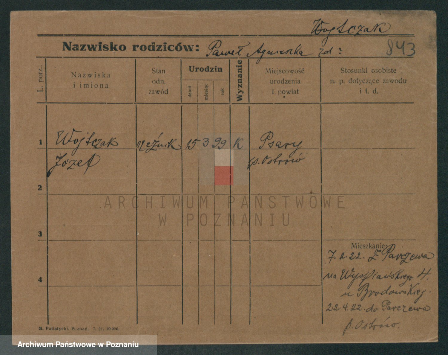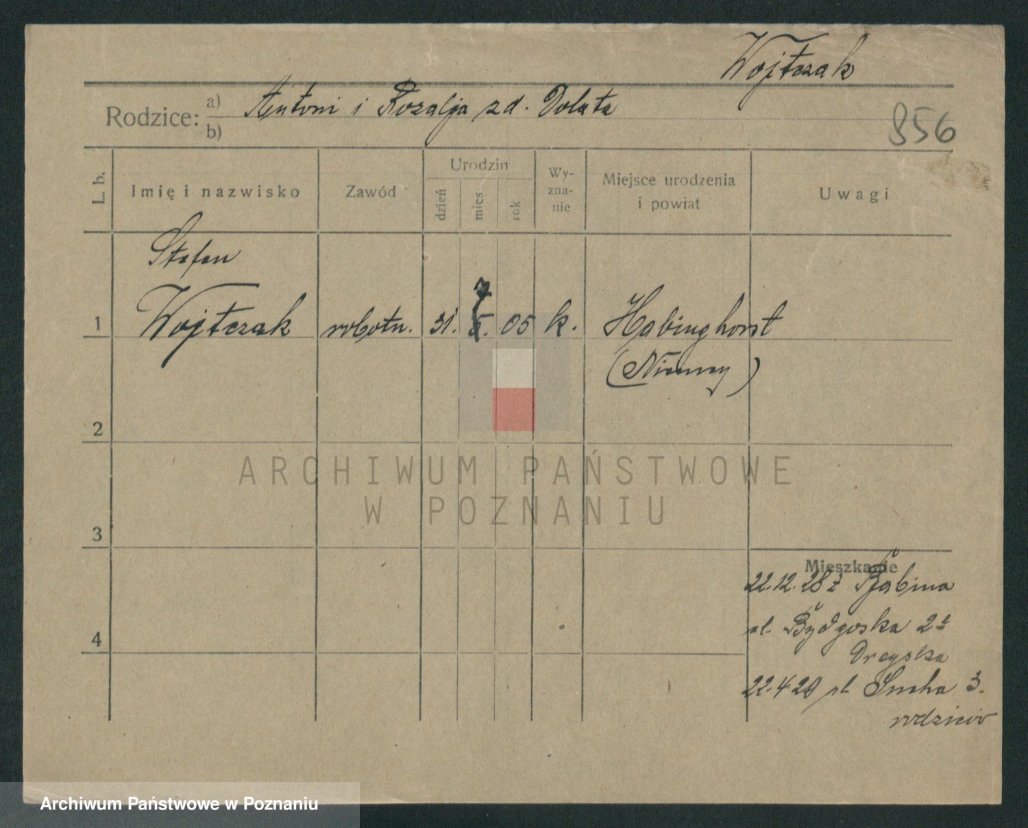 Podgląd karty osobowej dostępny jest po kliknięciu na nazwisko lub ikonkę karty. Można dokonywać powiększenia (ikony na górze) lub przechodzić między kolejnymi skanami (strzałki po bokach).