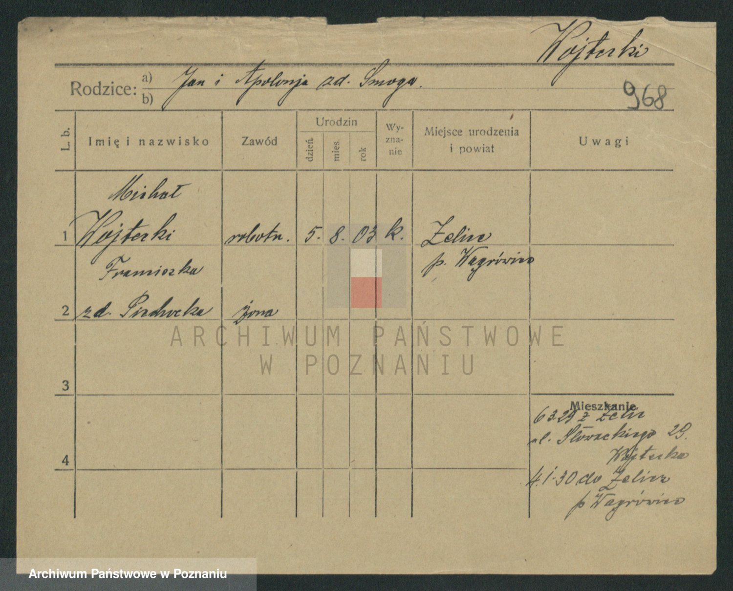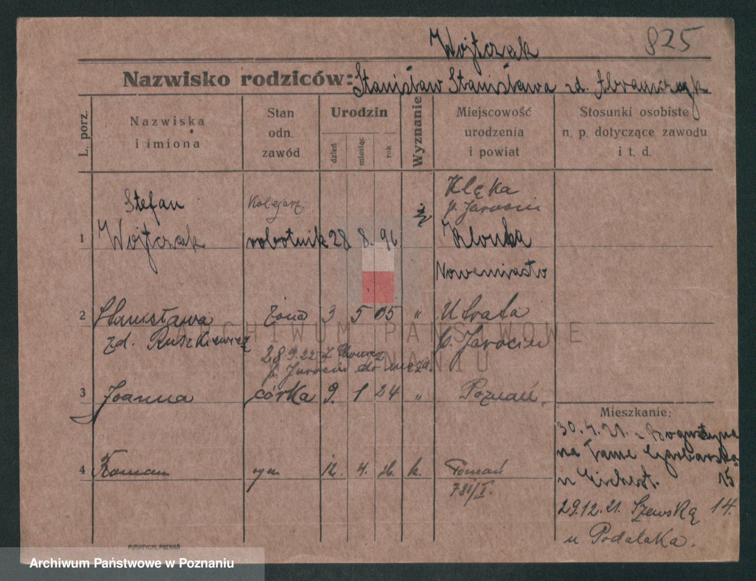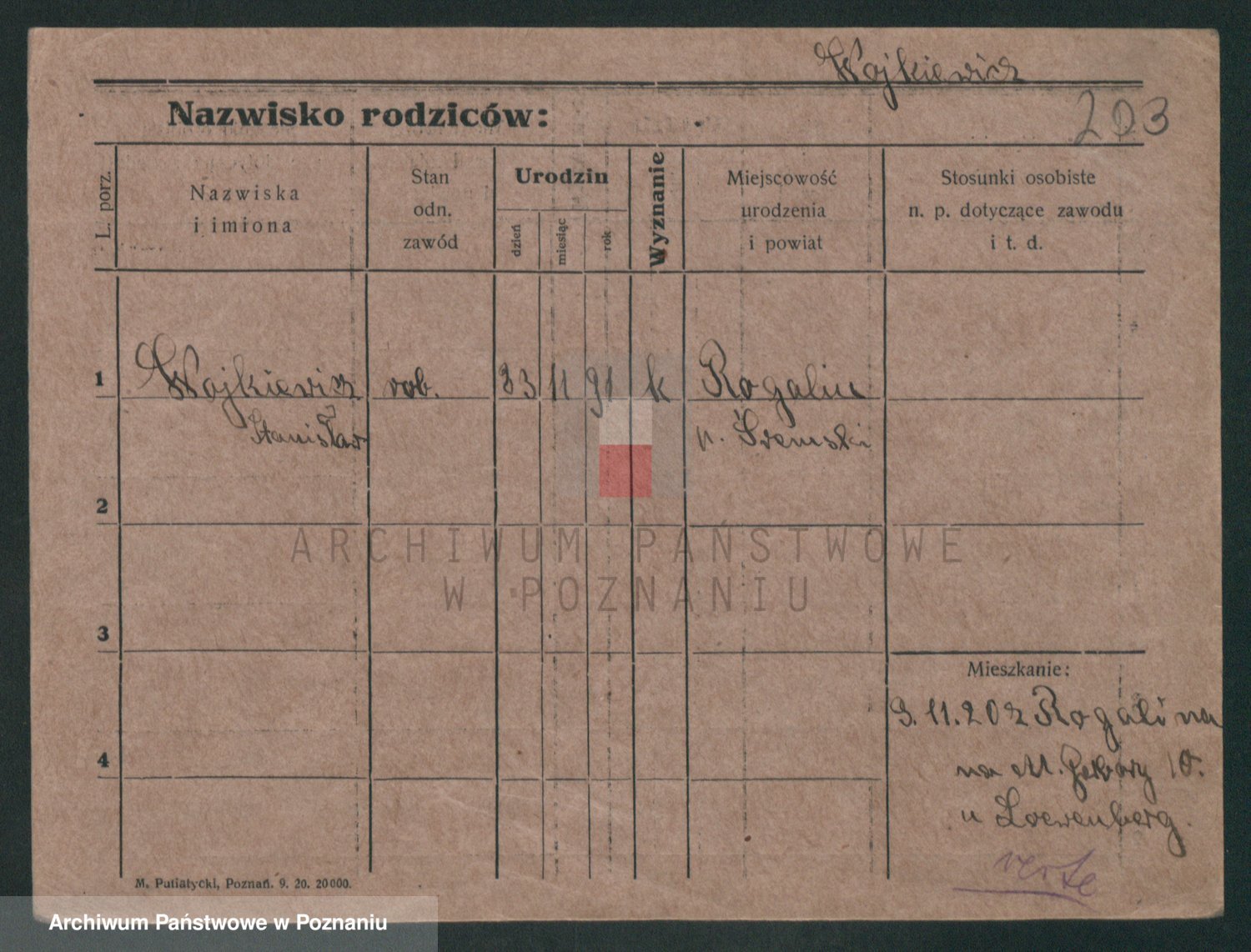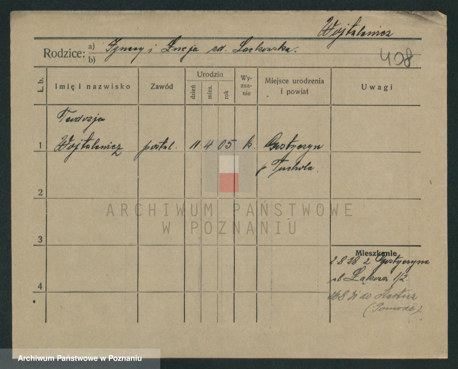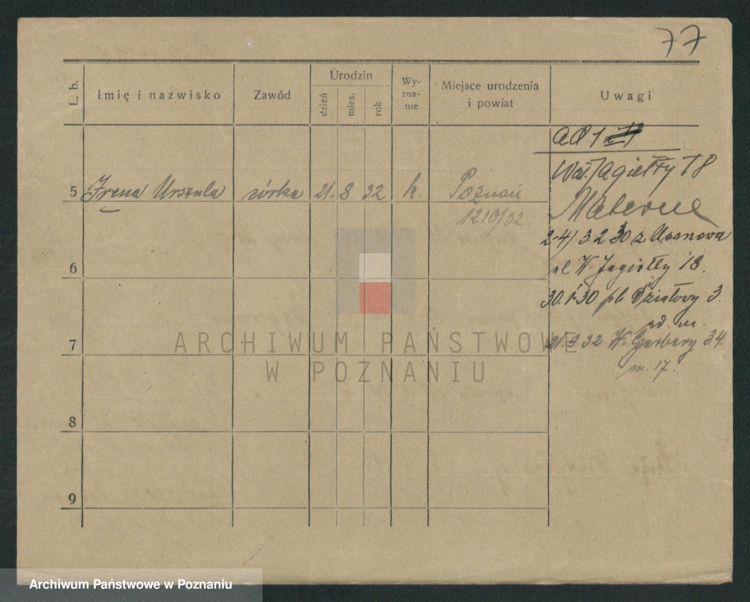 Podgląd karty osobowej dostępny jest po kliknięciu na nazwisko lub ikonkę karty. Można dokonywać powiększenia (ikony na górze) lub przechodzić między kolejnymi skanami (strzałki po bokach).