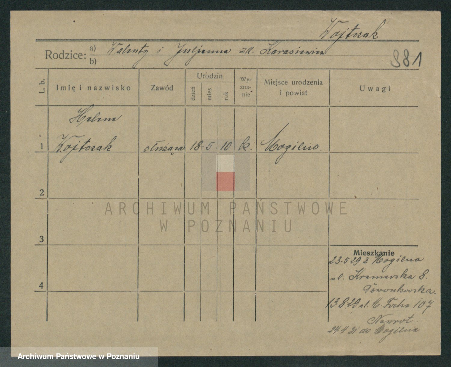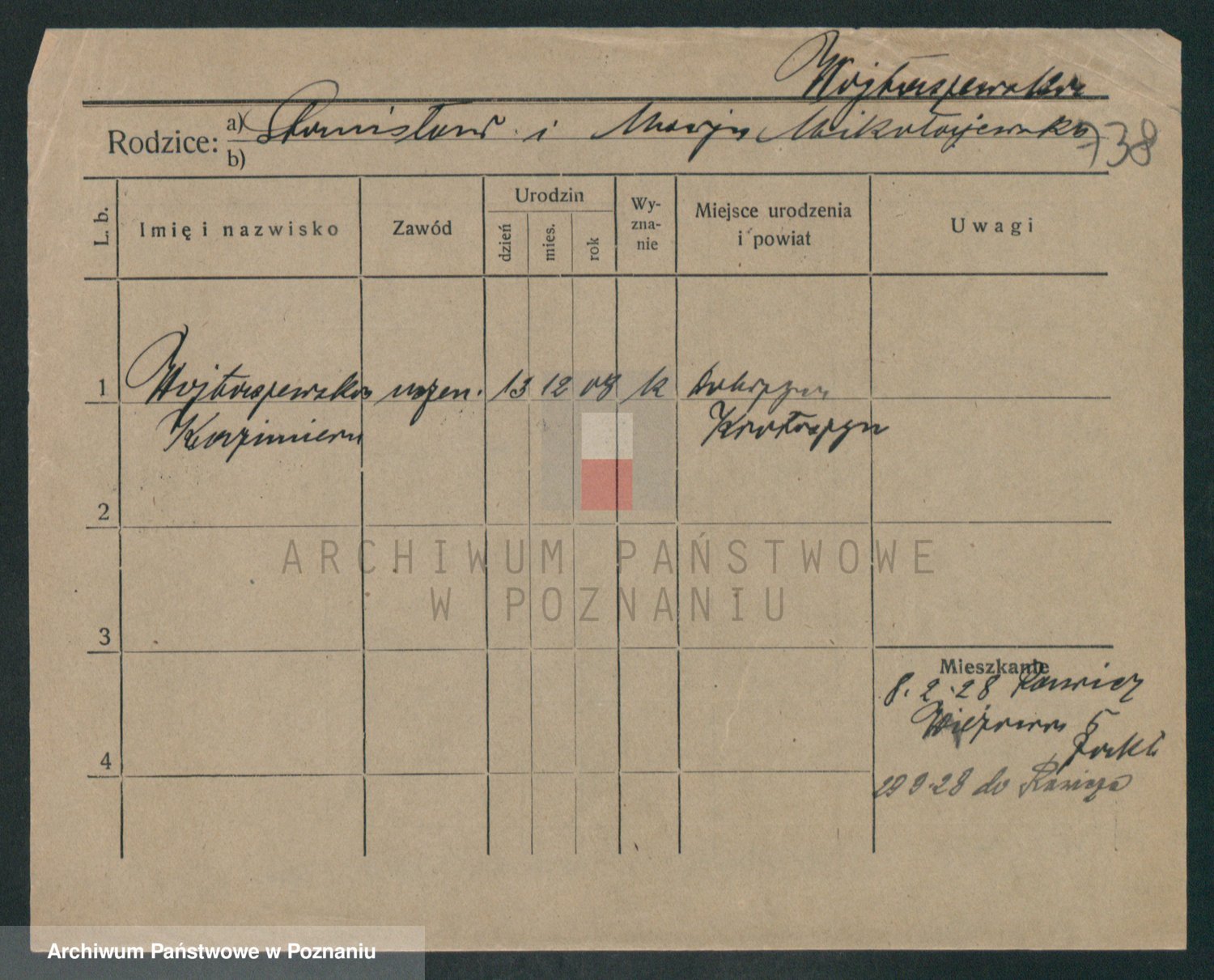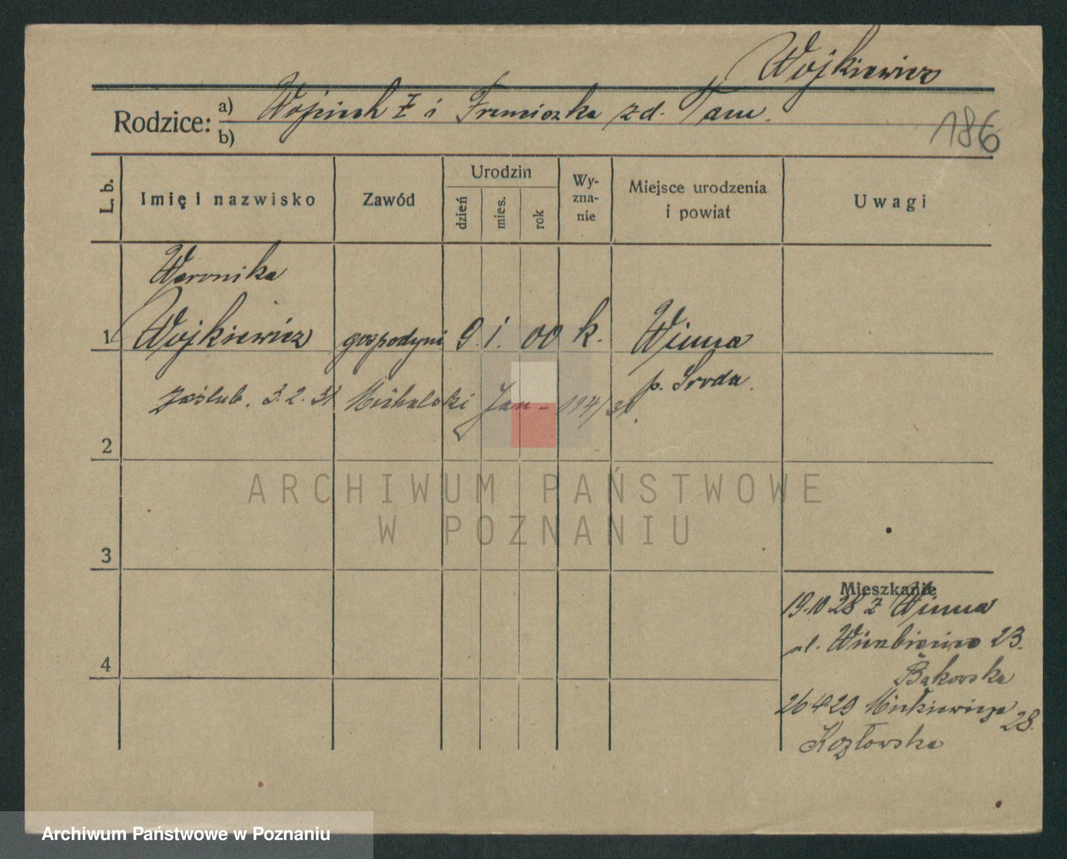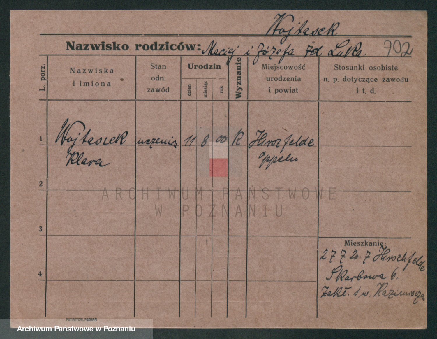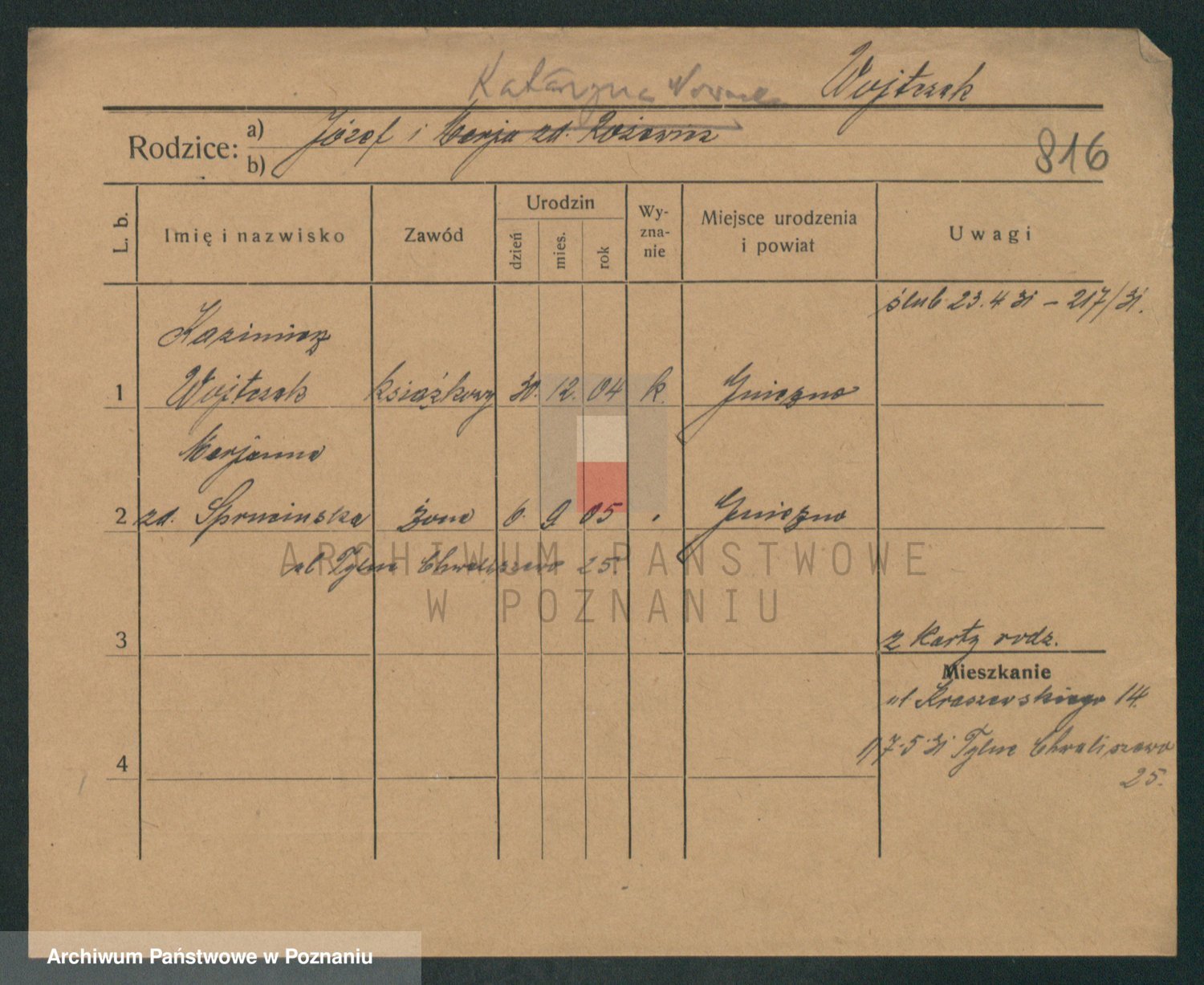 Podgląd karty osobowej dostępny jest po kliknięciu na nazwisko lub ikonkę karty. Można dokonywać powiększenia (ikony na górze) lub przechodzić między kolejnymi skanami (strzałki po bokach).