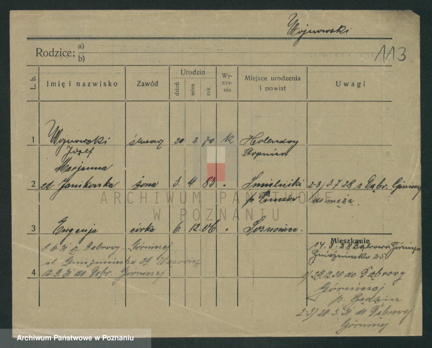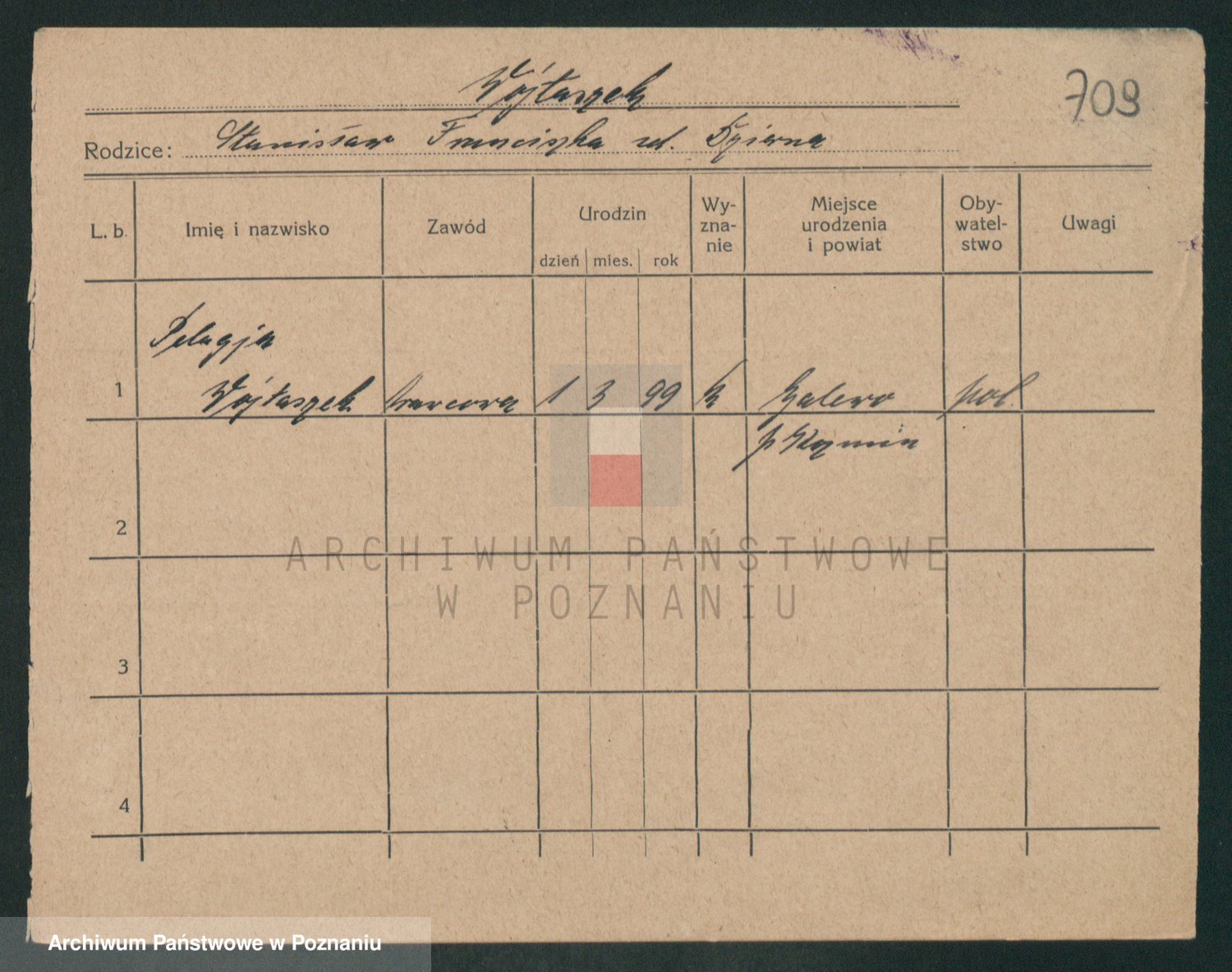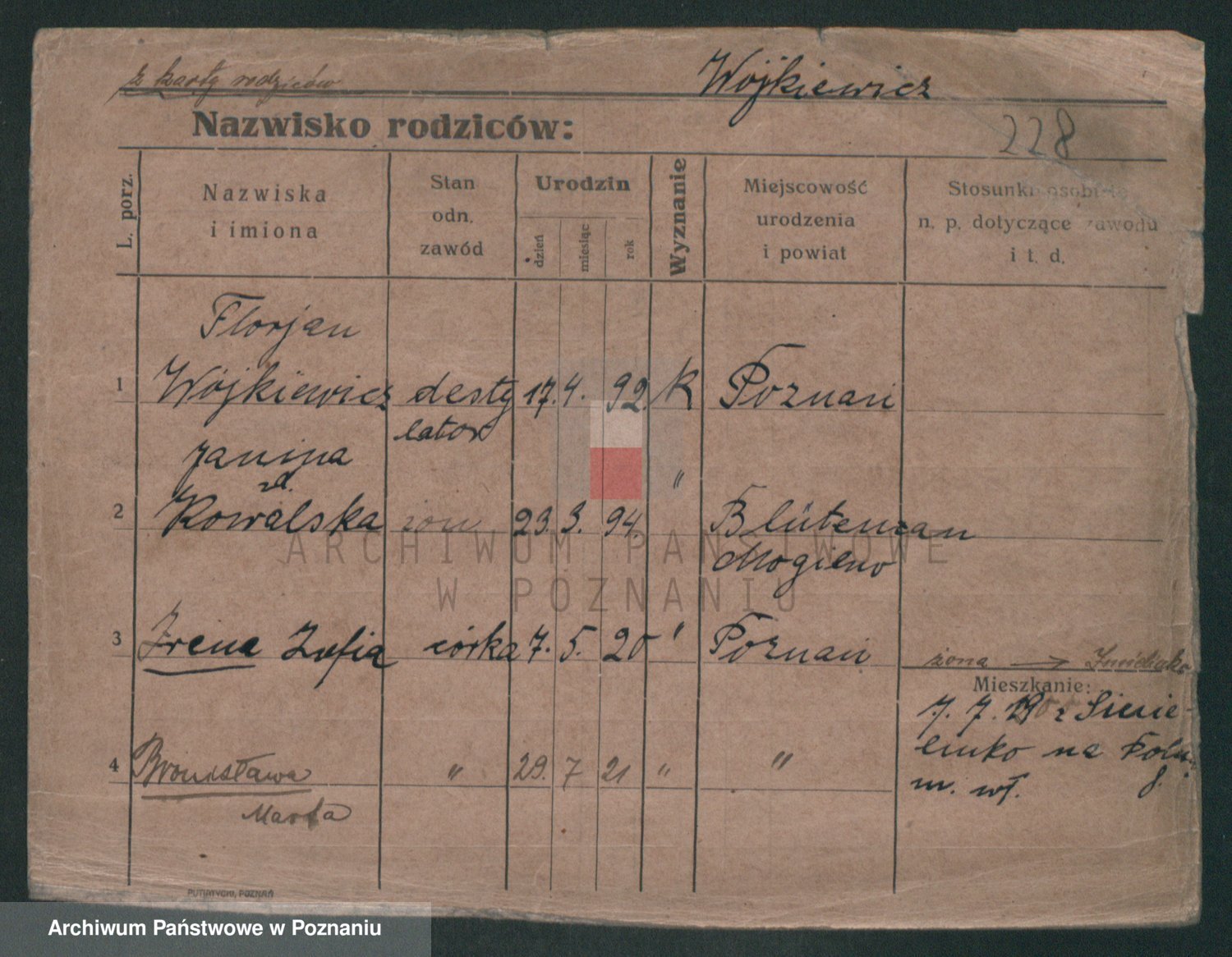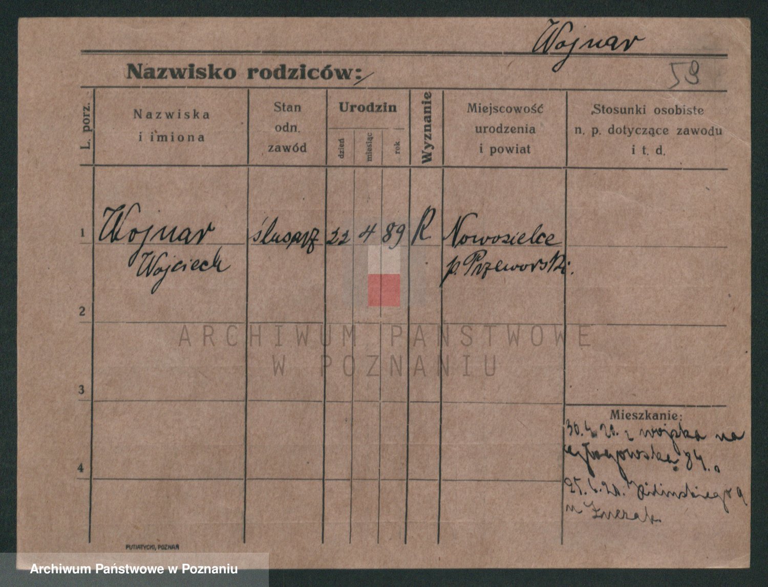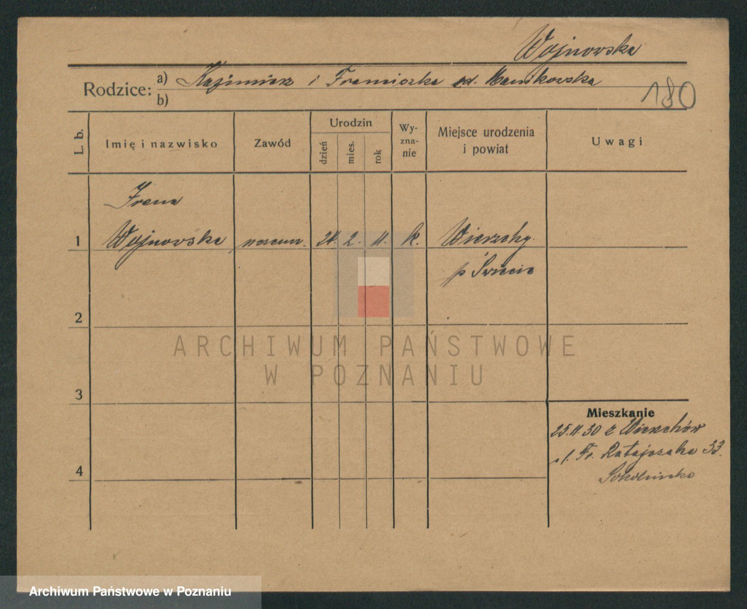 Podgląd karty osobowej dostępny jest po kliknięciu na nazwisko lub ikonkę karty. Można dokonywać powiększenia (ikony na górze) lub przechodzić między kolejnymi skanami (strzałki po bokach).