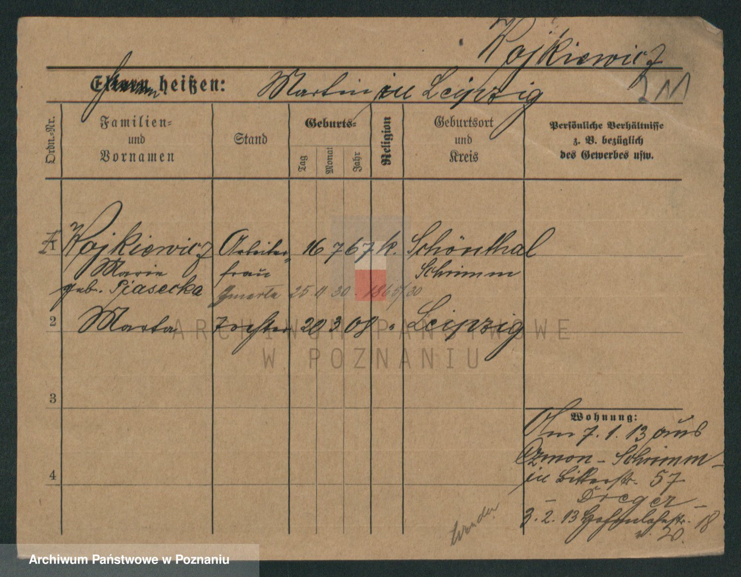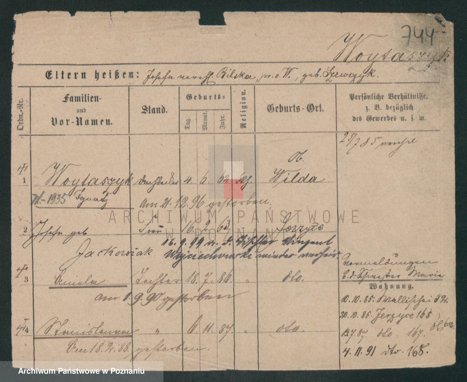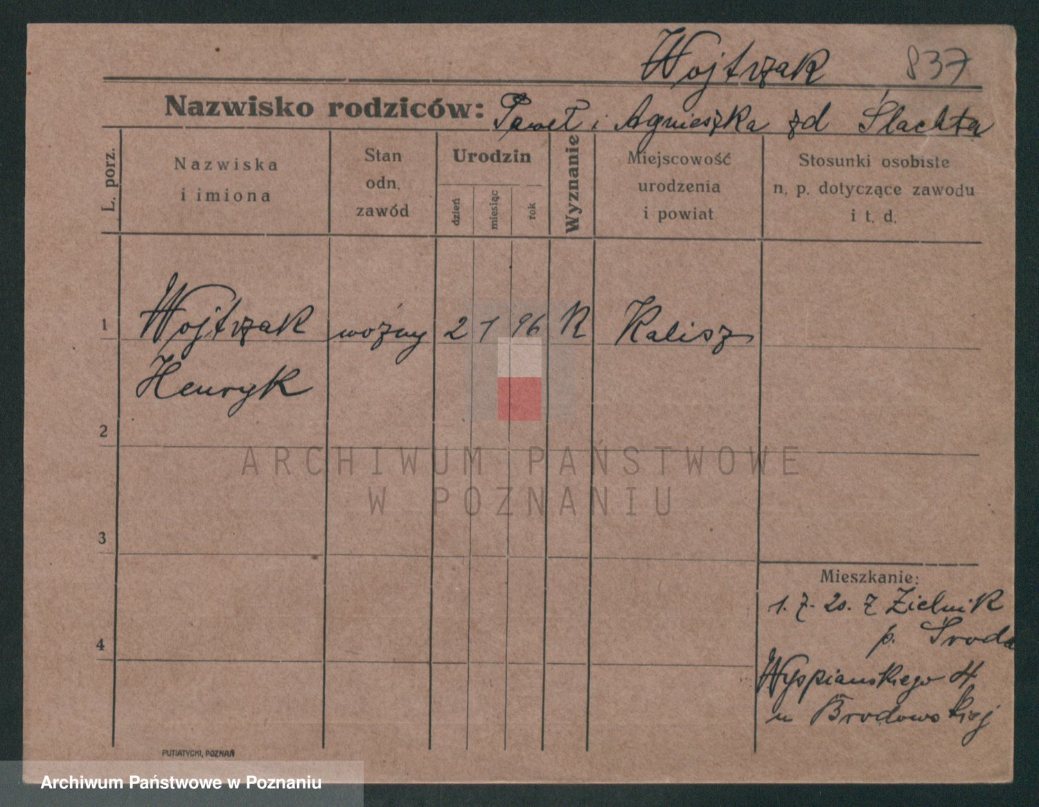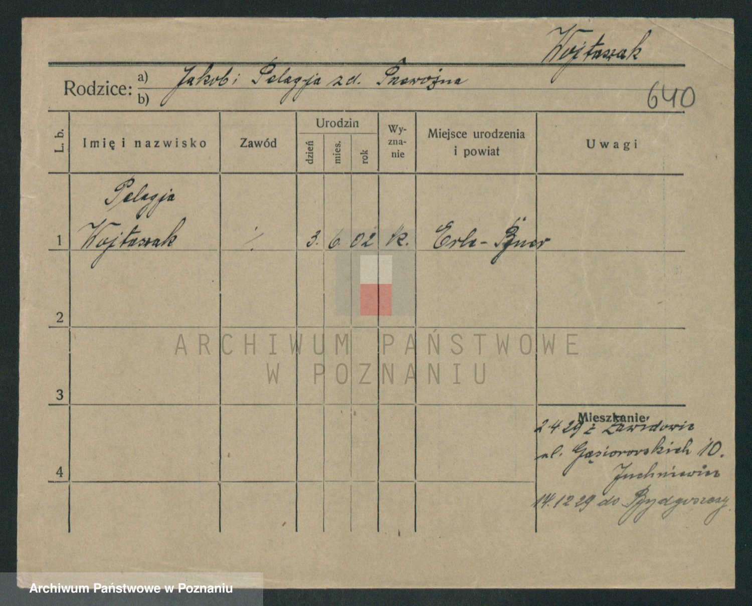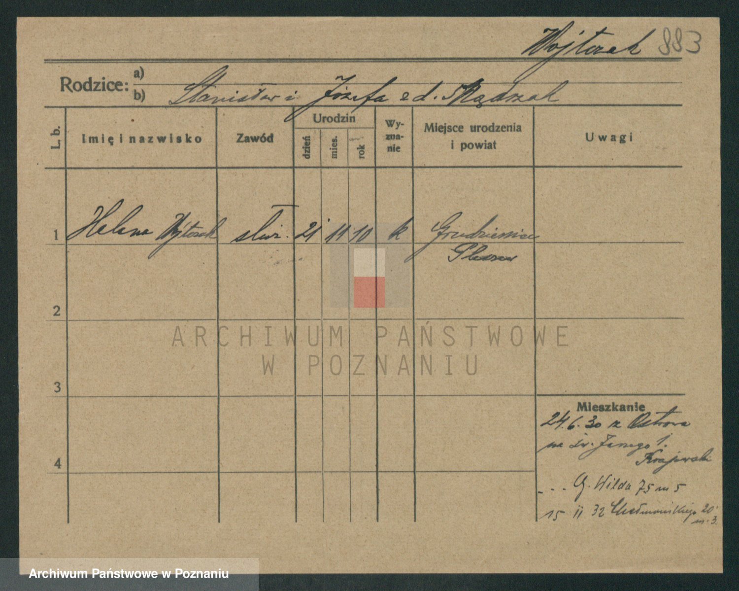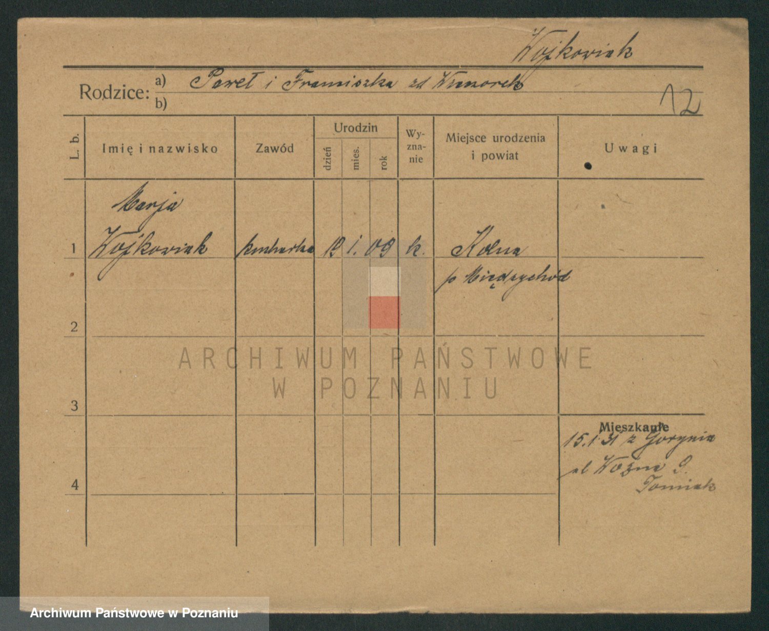 Podgląd karty osobowej dostępny jest po kliknięciu na nazwisko lub ikonkę karty. Można dokonywać powiększenia (ikony na górze) lub przechodzić między kolejnymi skanami (strzałki po bokach).