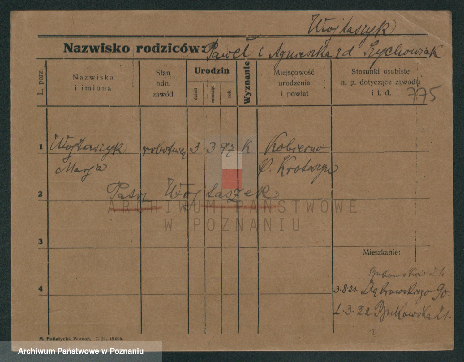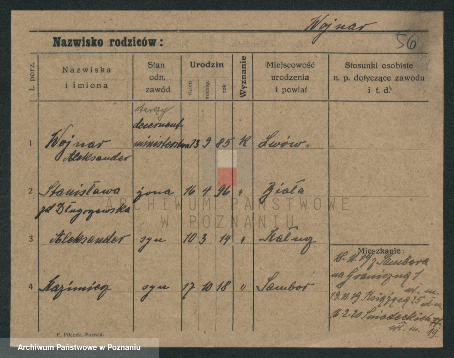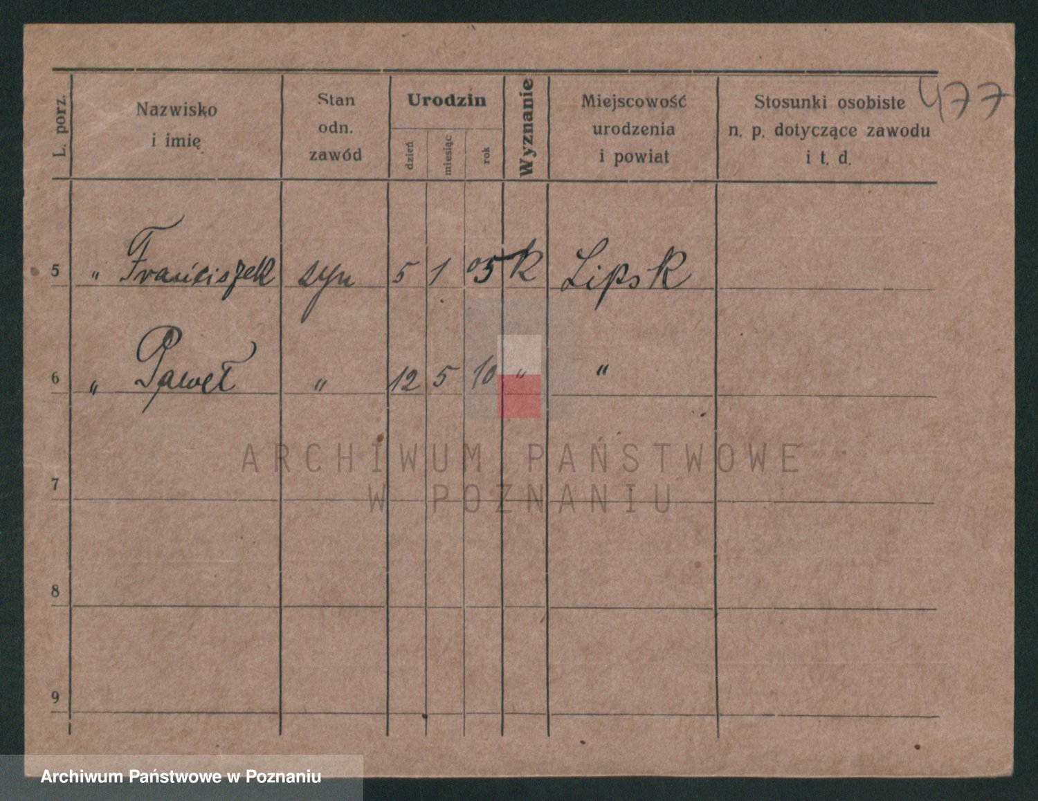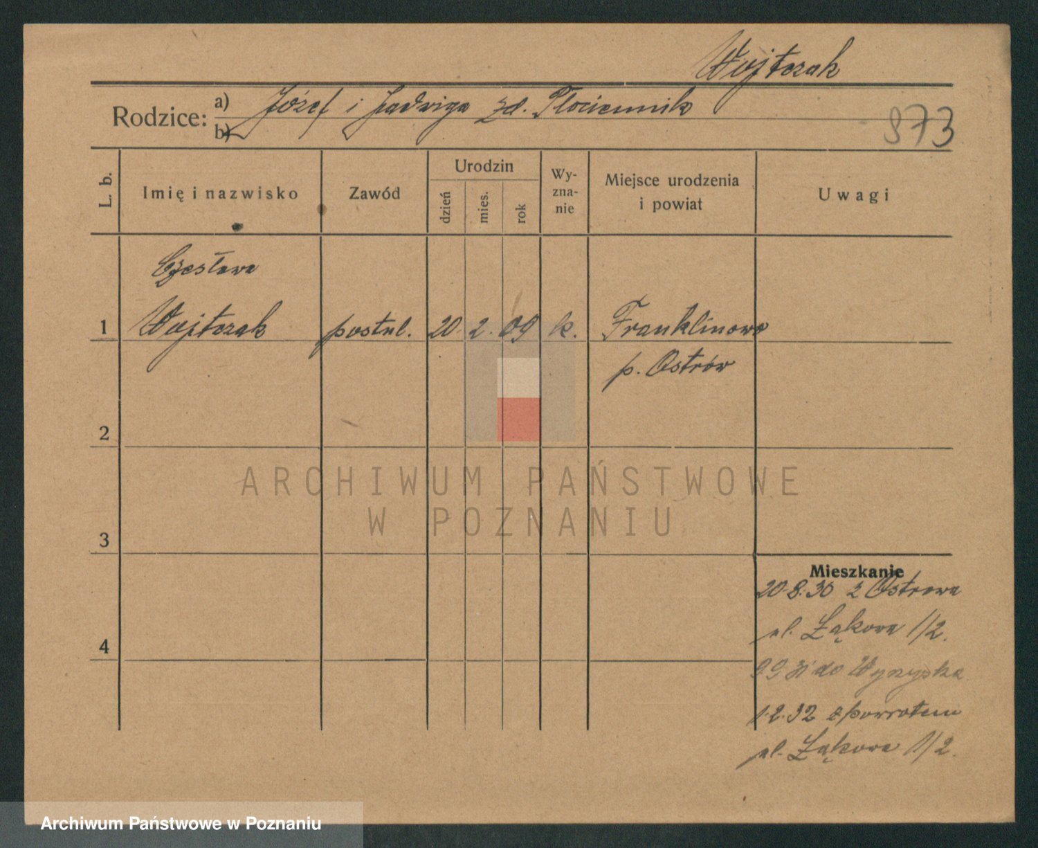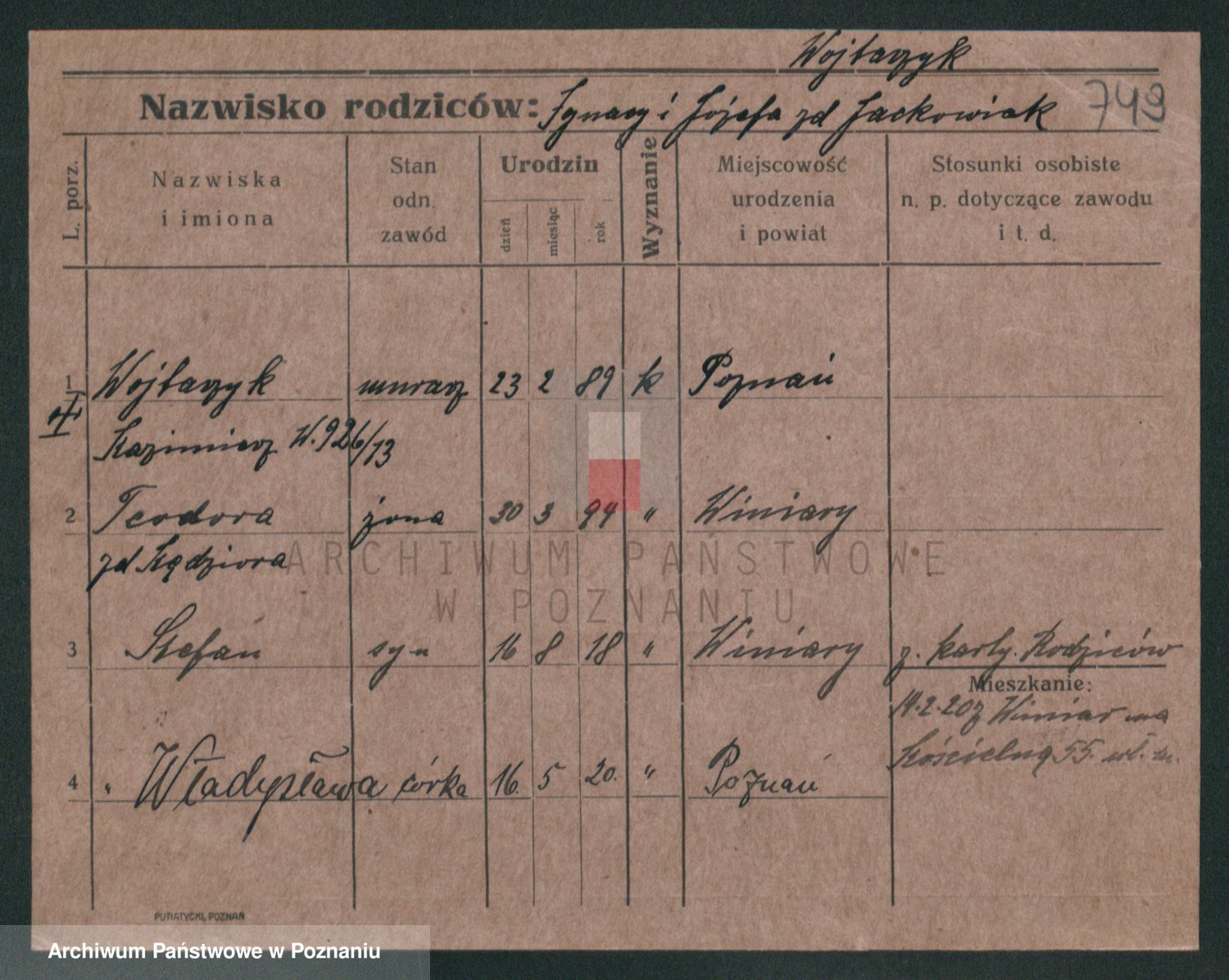 Podgląd karty osobowej dostępny jest po kliknięciu na nazwisko lub ikonkę karty. Można dokonywać powiększenia (ikony na górze) lub przechodzić między kolejnymi skanami (strzałki po bokach).