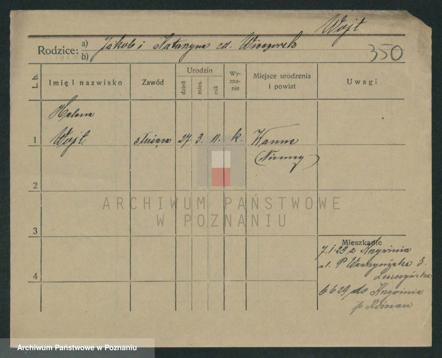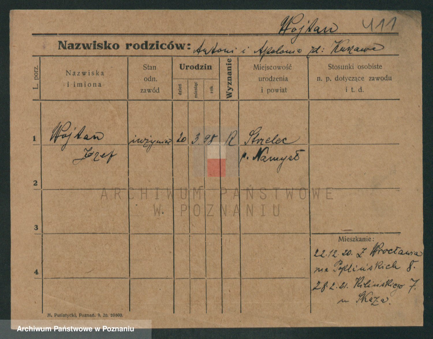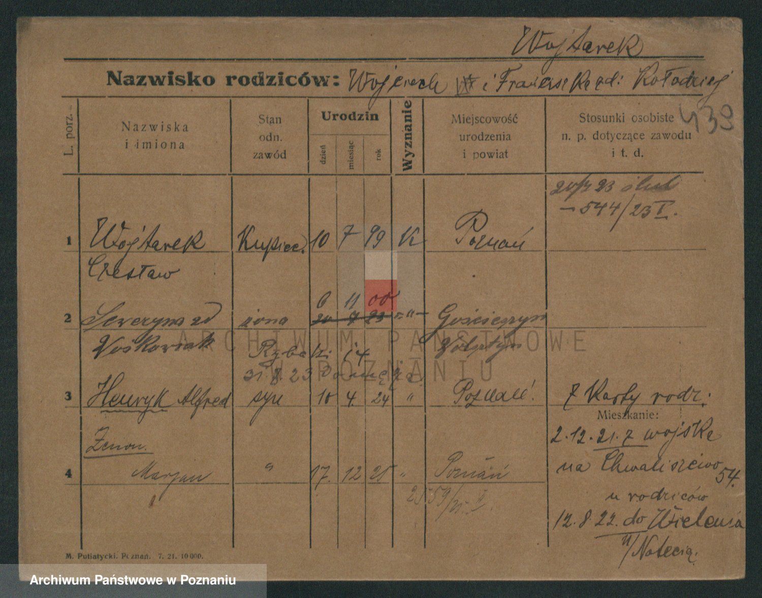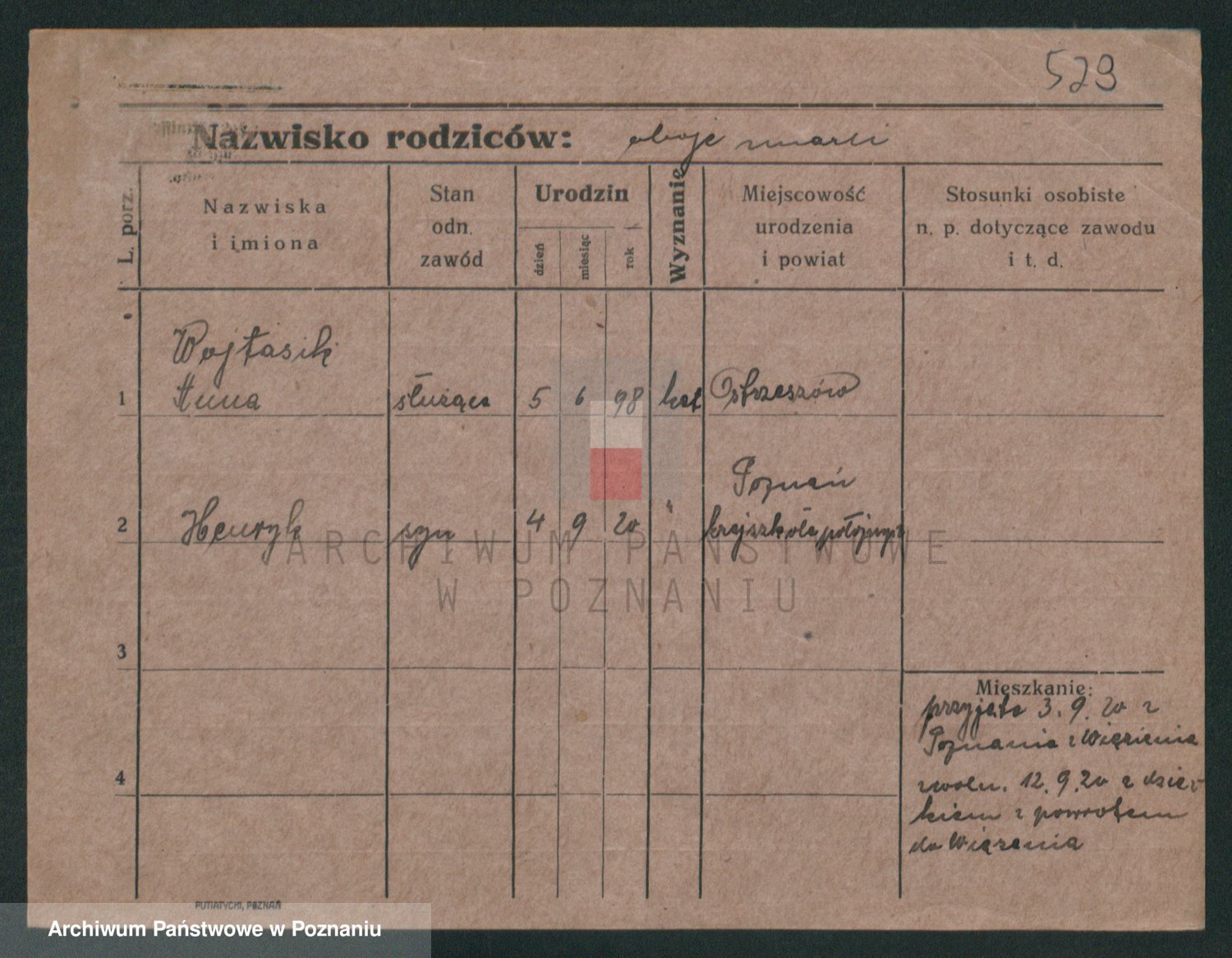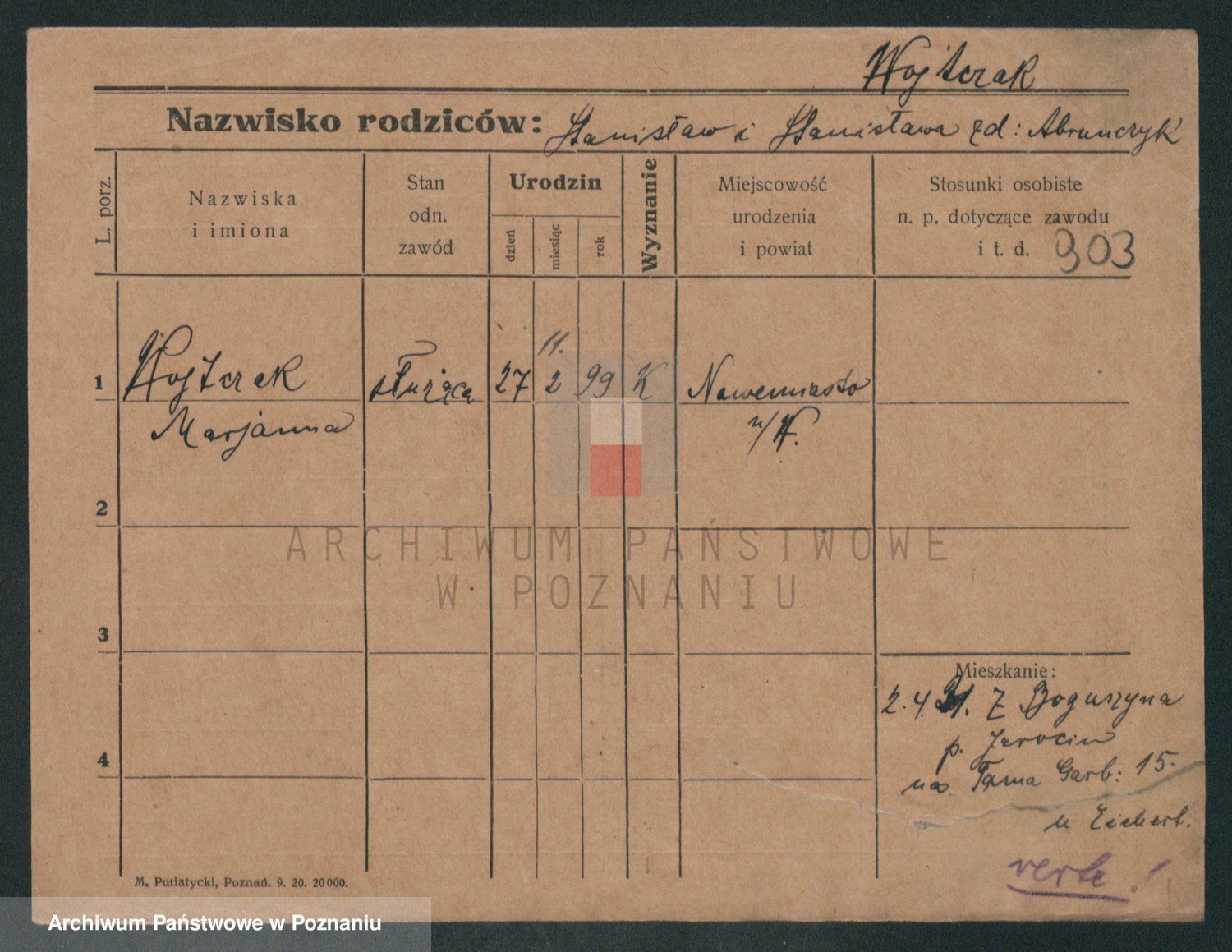 Podgląd karty osobowej dostępny jest po kliknięciu na nazwisko lub ikonkę karty. Można dokonywać powiększenia (ikony na górze) lub przechodzić między kolejnymi skanami (strzałki po bokach).