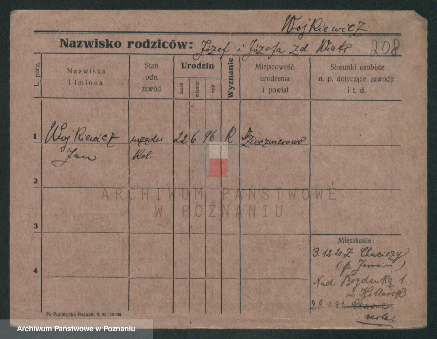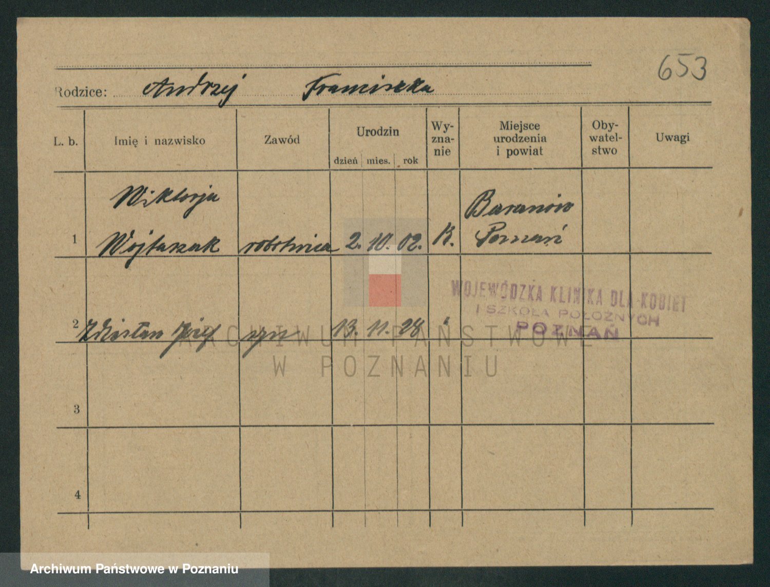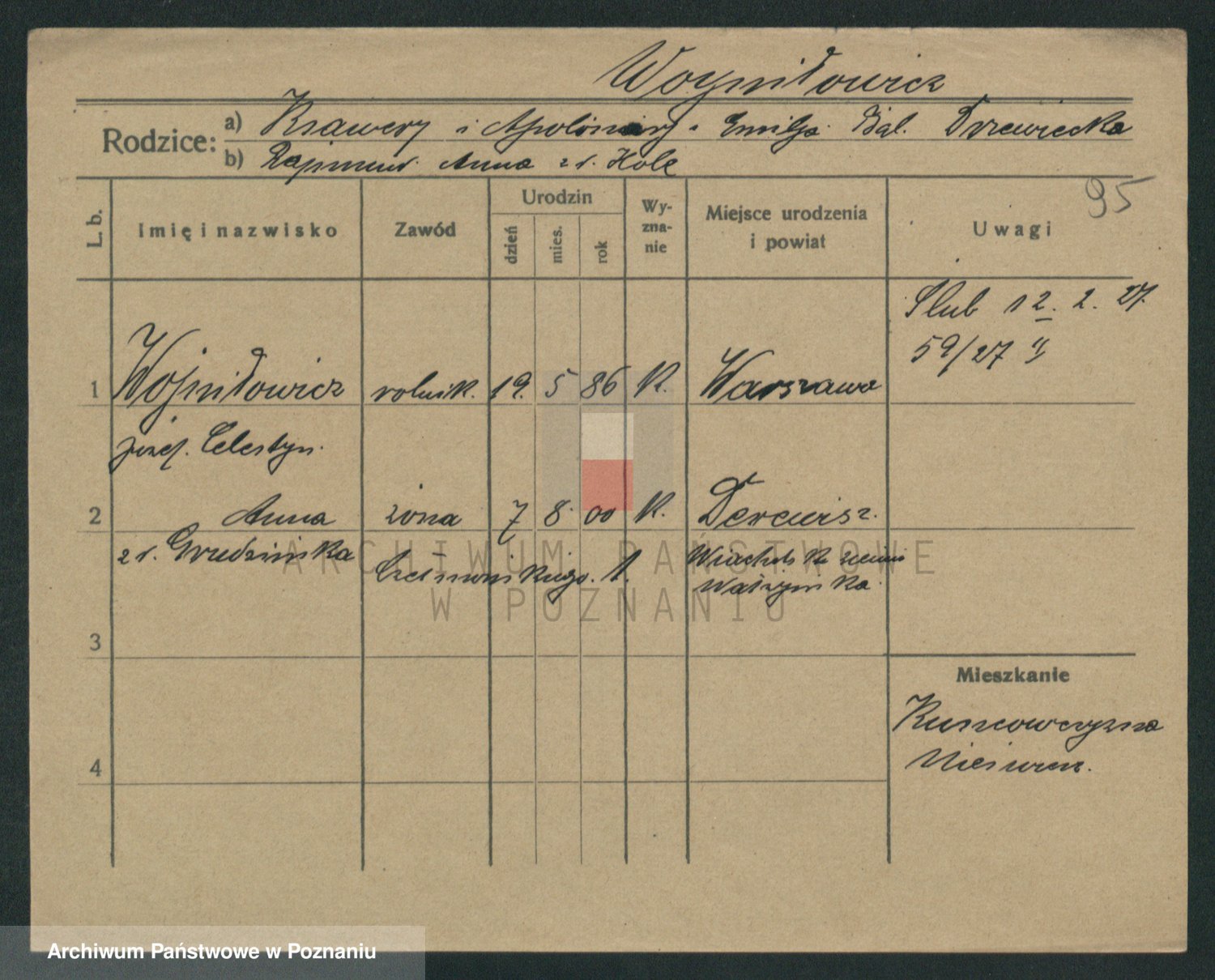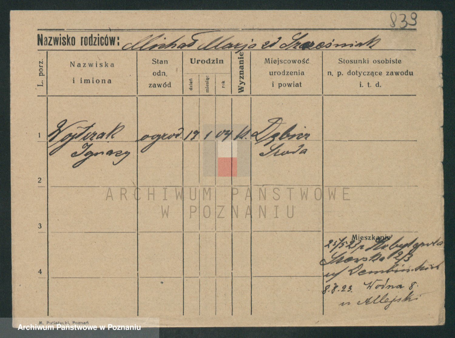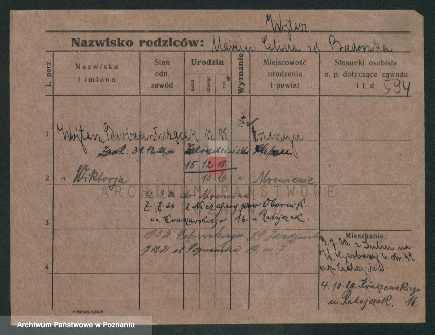 Podgląd karty osobowej dostępny jest po kliknięciu na nazwisko lub ikonkę karty. Można dokonywać powiększenia (ikony na górze) lub przechodzić między kolejnymi skanami (strzałki po bokach).