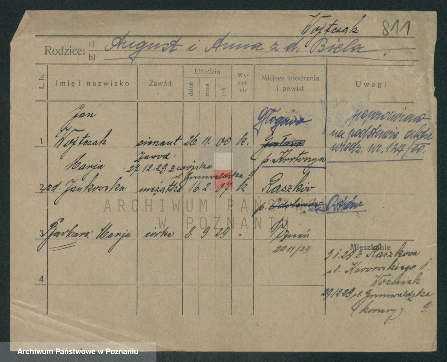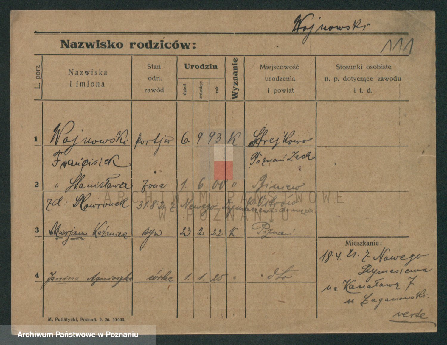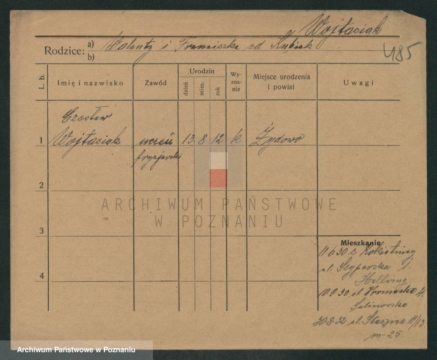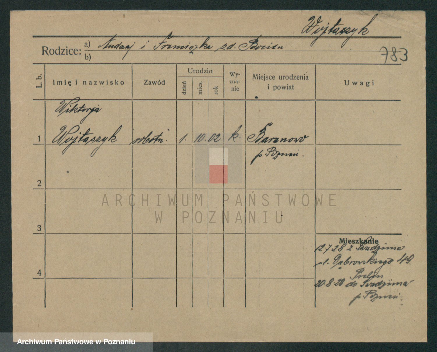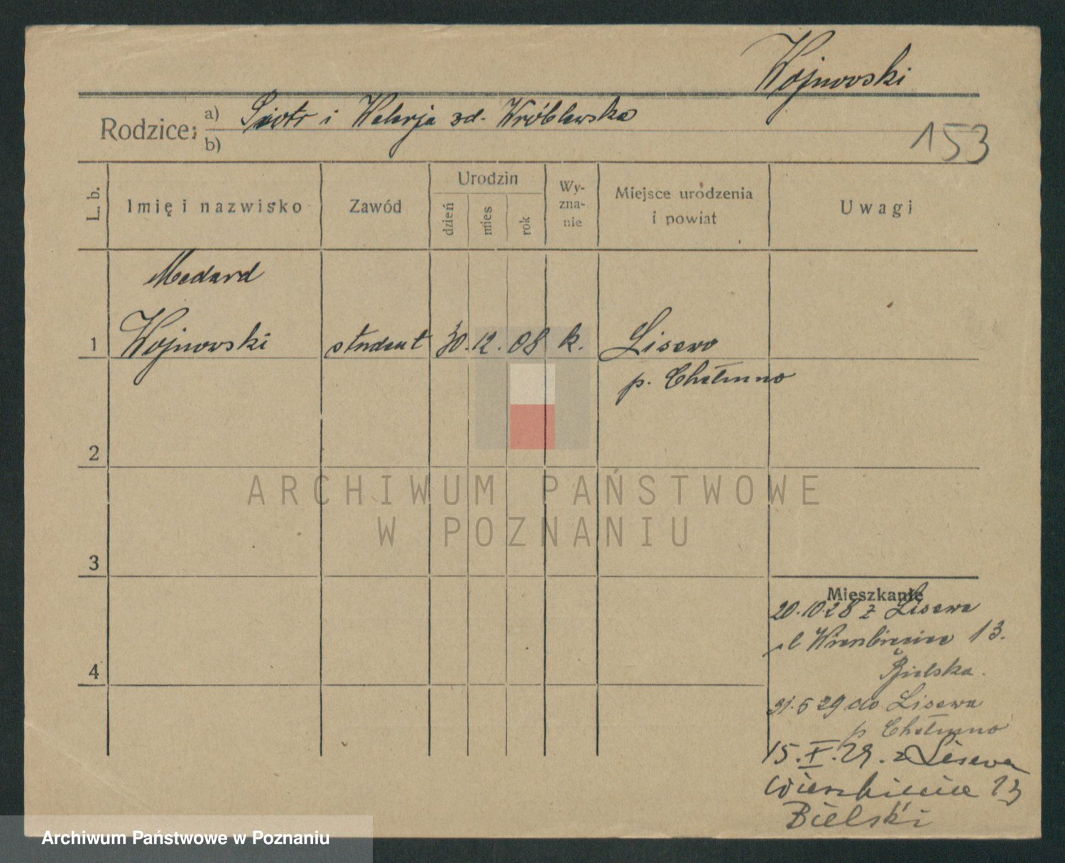 Podgląd karty osobowej dostępny jest po kliknięciu na nazwisko lub ikonkę karty. Można dokonywać powiększenia (ikony na górze) lub przechodzić między kolejnymi skanami (strzałki po bokach).