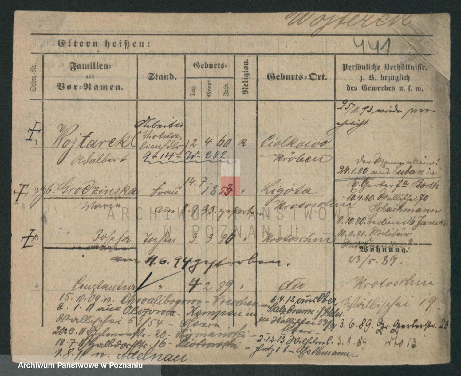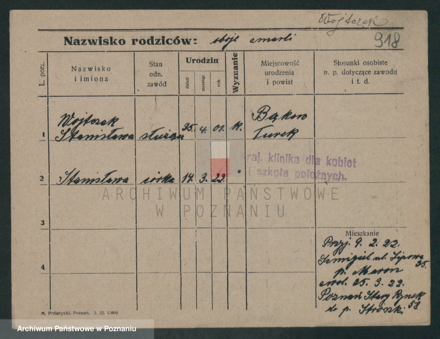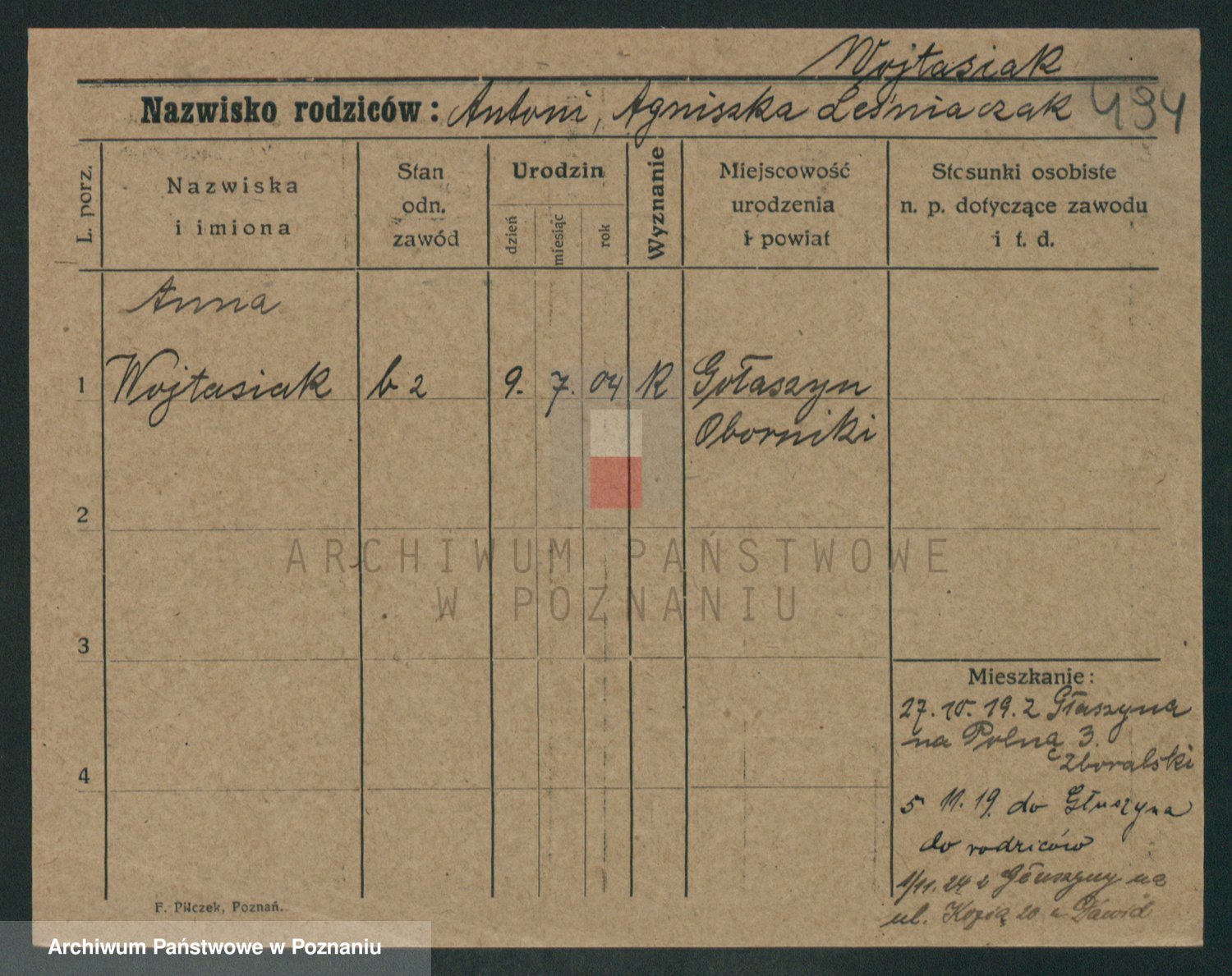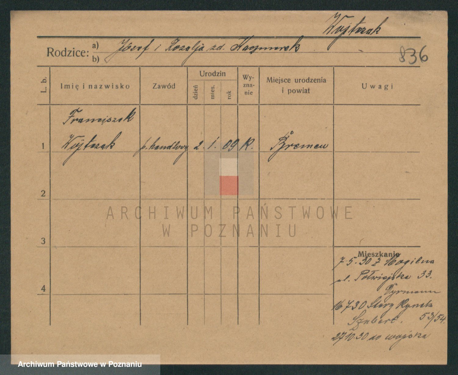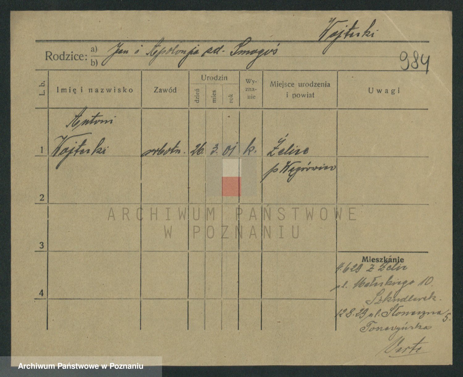 Podgląd karty osobowej dostępny jest po kliknięciu na nazwisko lub ikonkę karty. Można dokonywać powiększenia (ikony na górze) lub przechodzić między kolejnymi skanami (strzałki po bokach).
