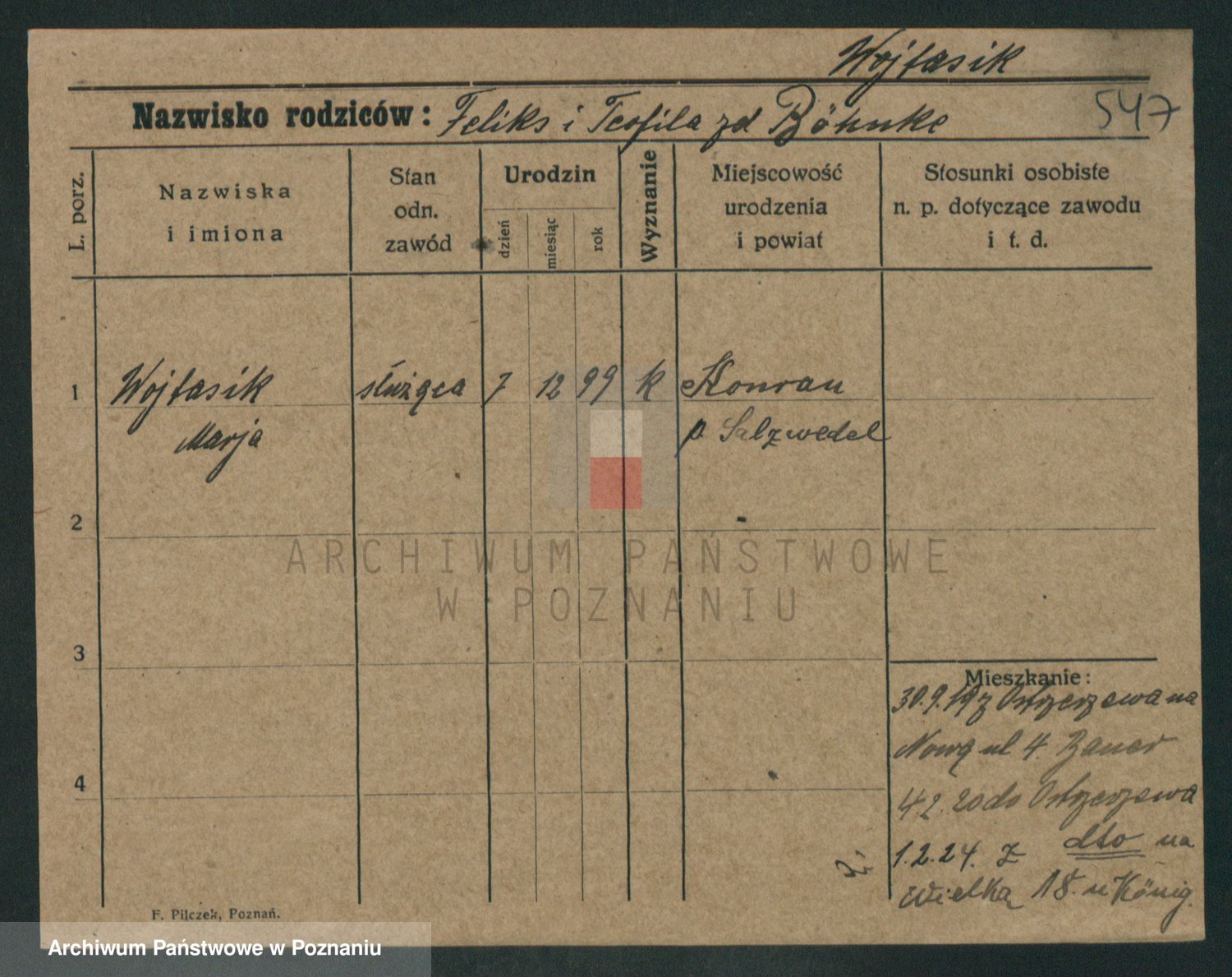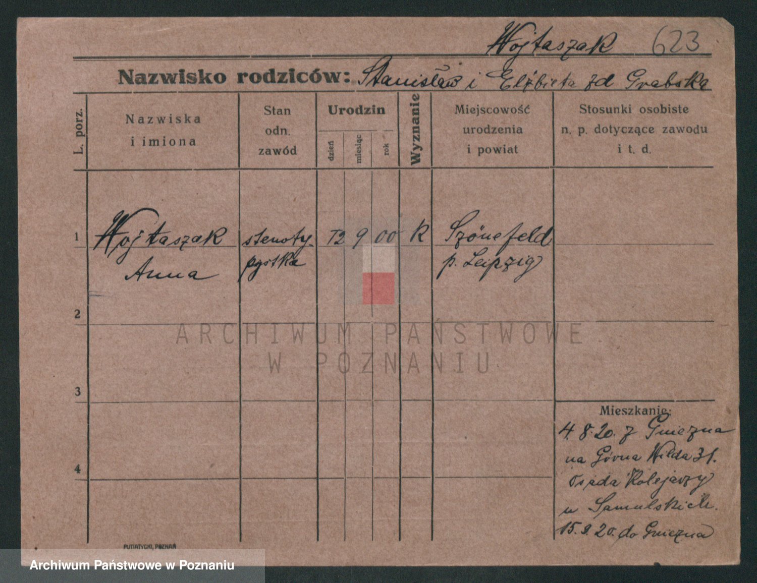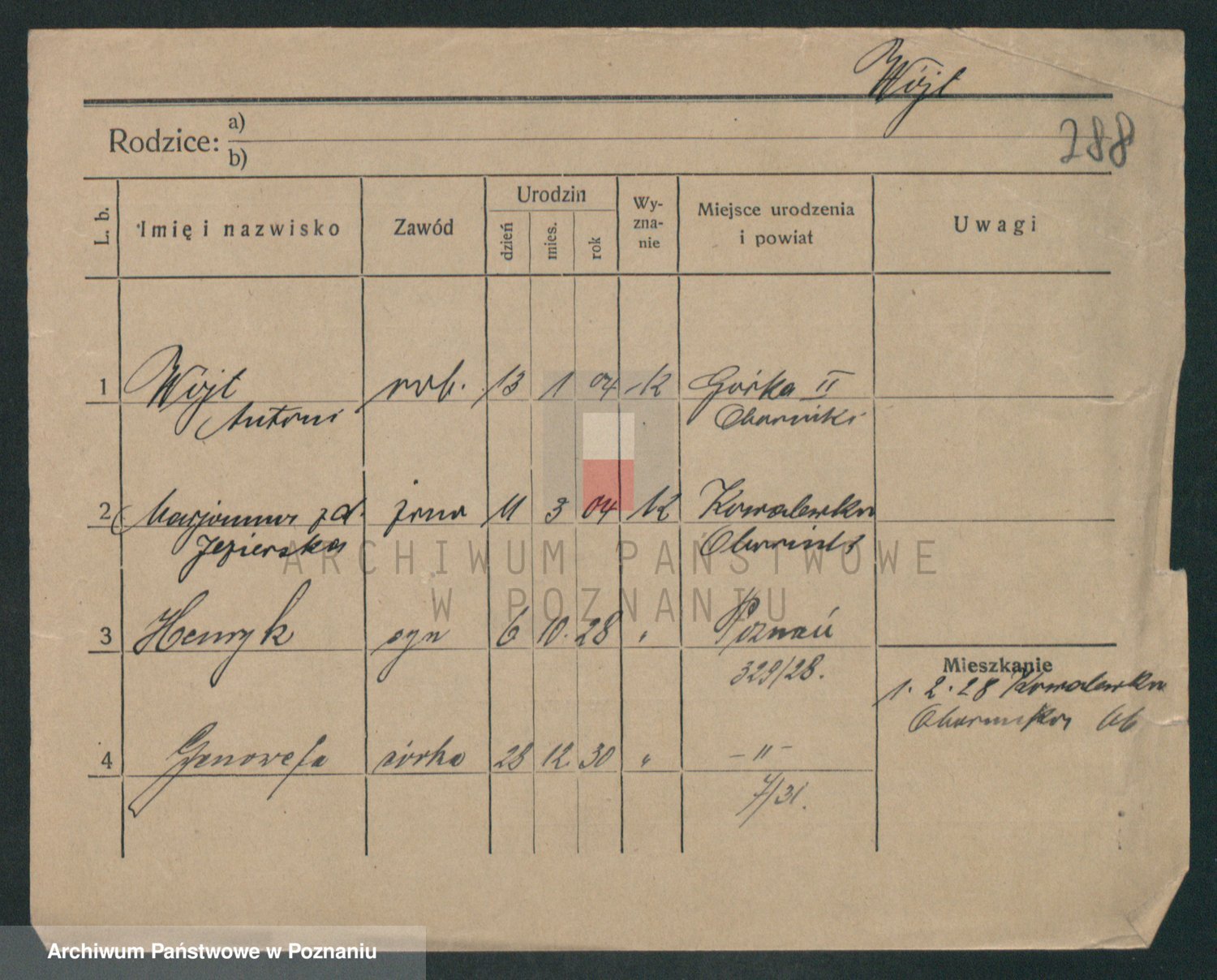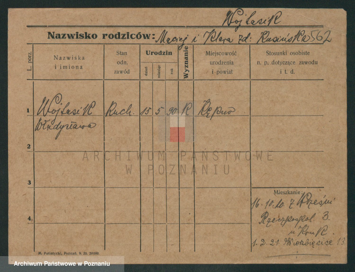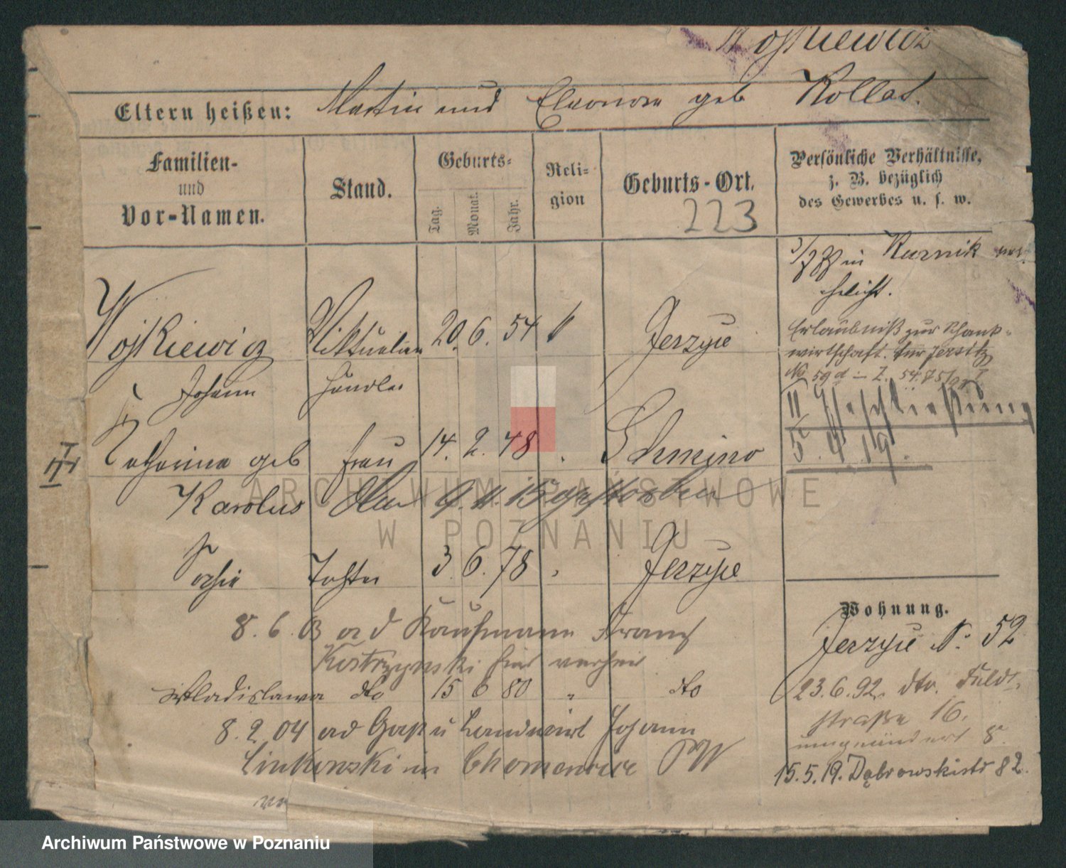 Podgląd karty osobowej dostępny jest po kliknięciu na nazwisko lub ikonkę karty. Można dokonywać powiększenia (ikony na górze) lub przechodzić między kolejnymi skanami (strzałki po bokach).