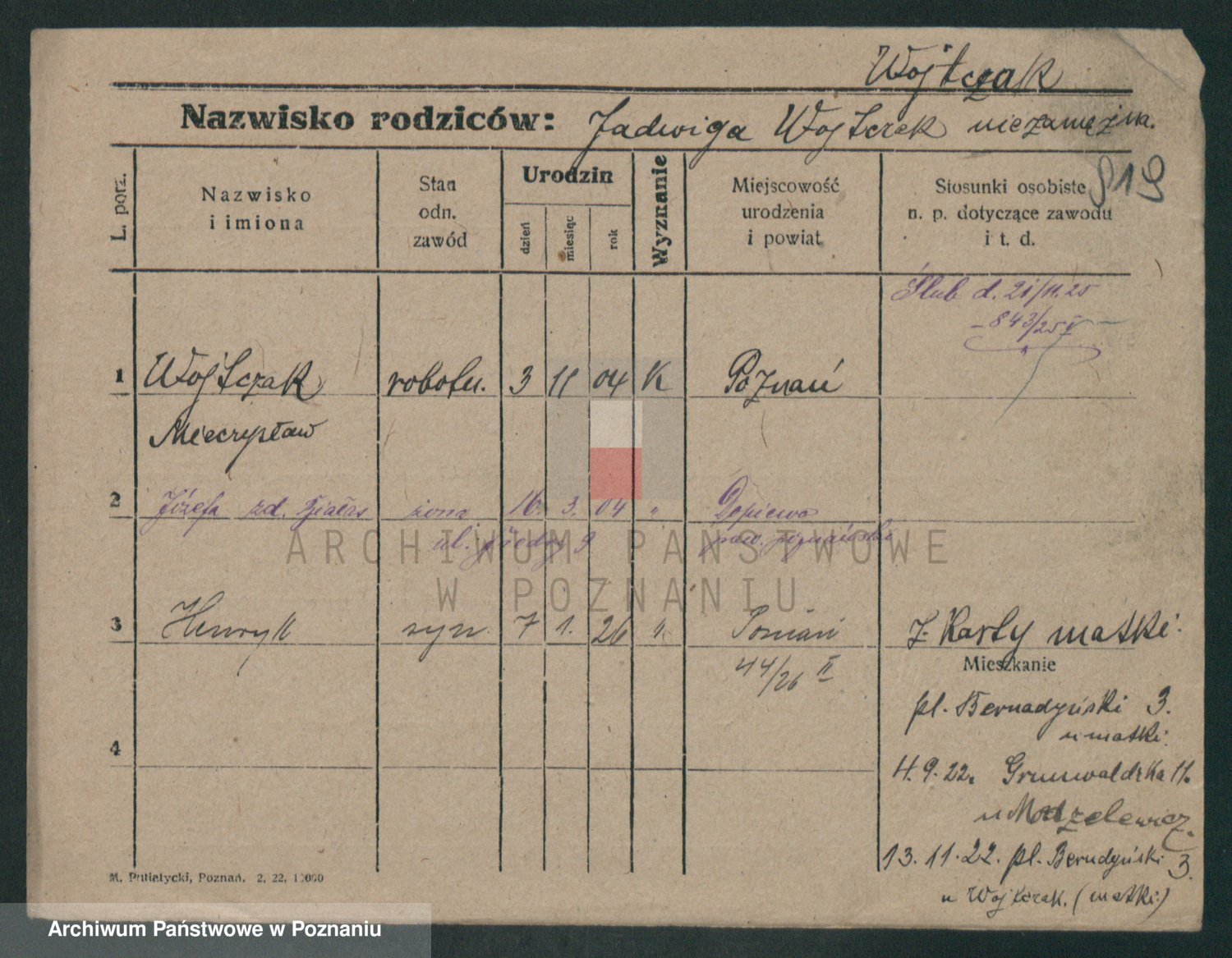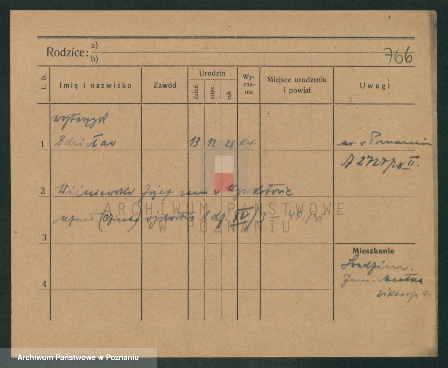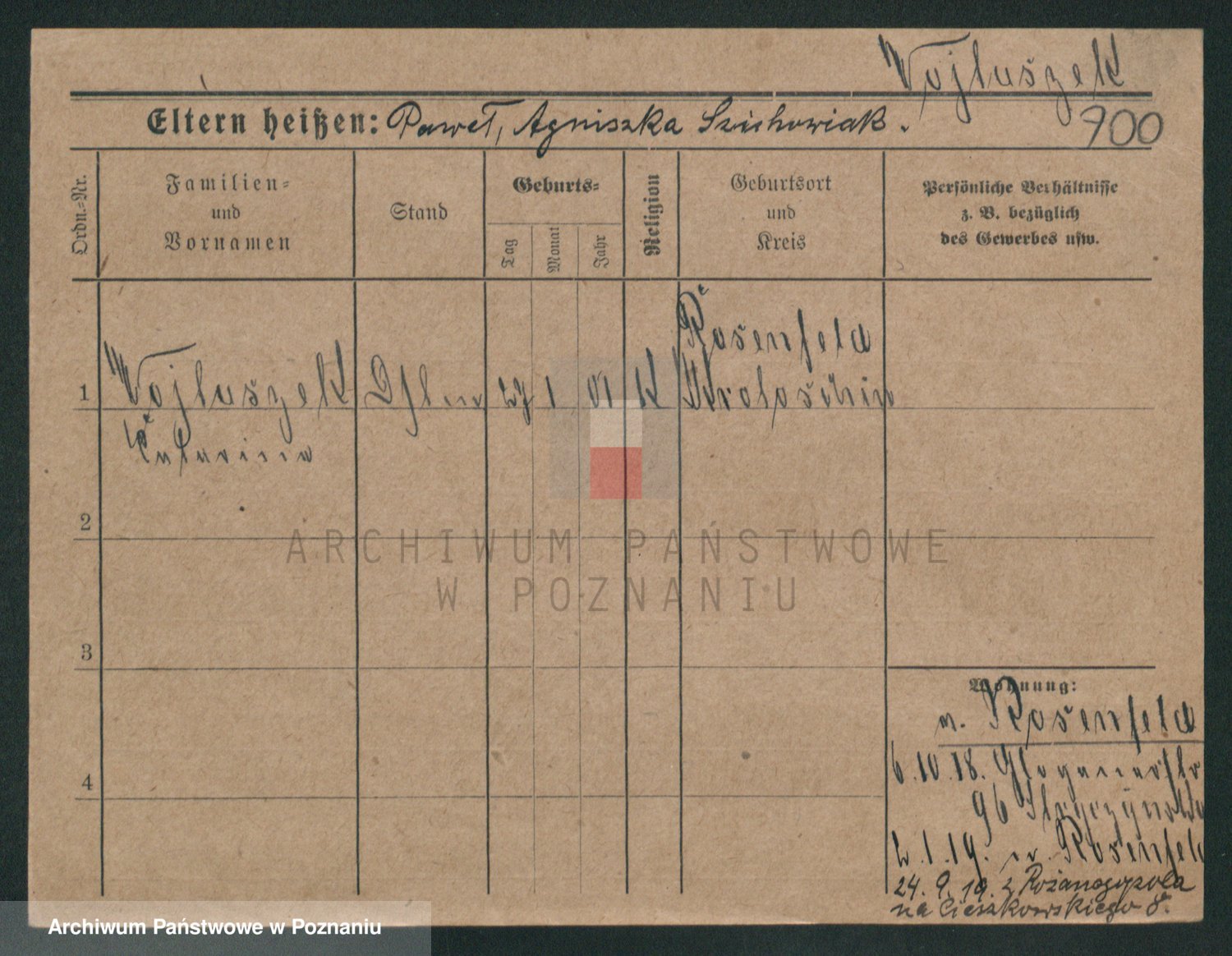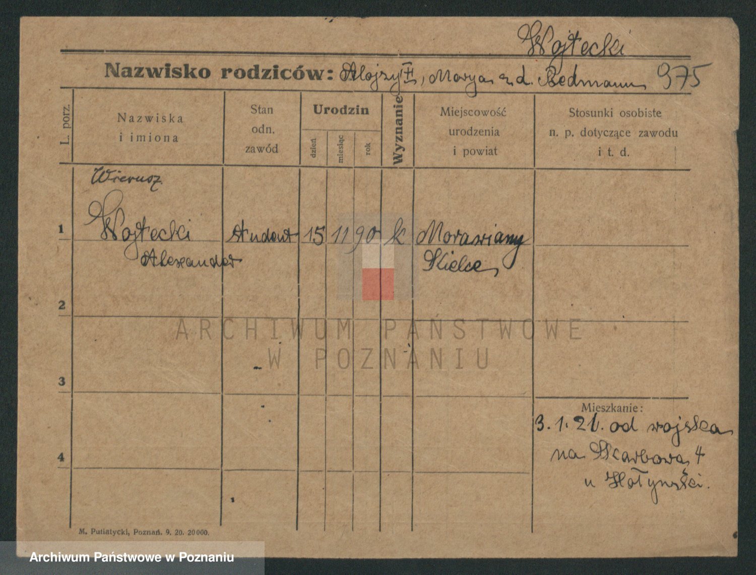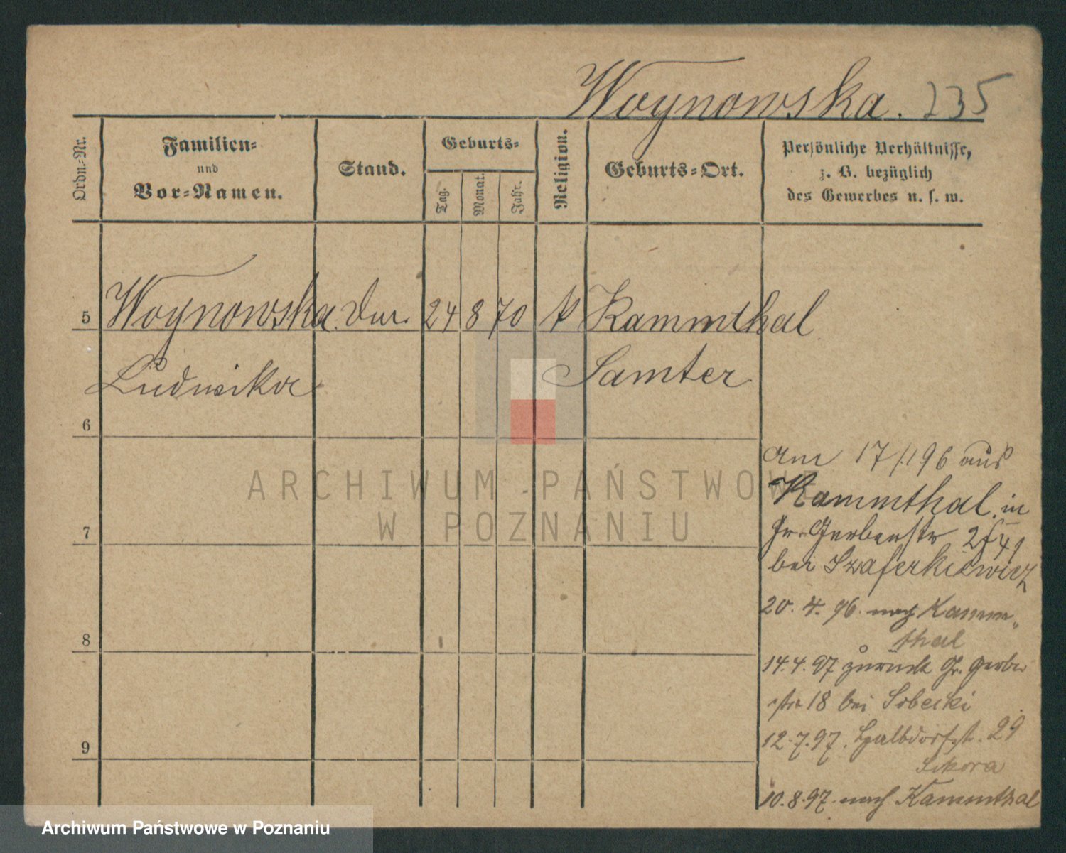Podgląd karty osobowej dostępny jest po kliknięciu na nazwisko lub ikonkę karty. Można dokonywać powiększenia (ikony na górze) lub przechodzić między kolejnymi skanami (strzałki po bokach).
