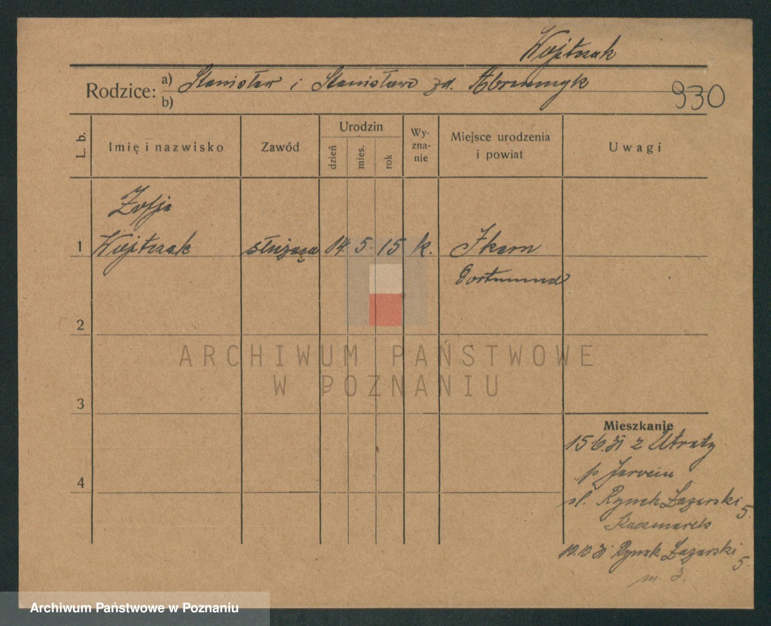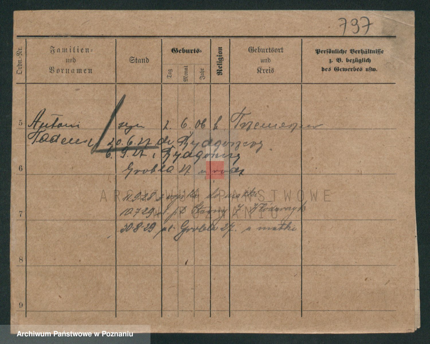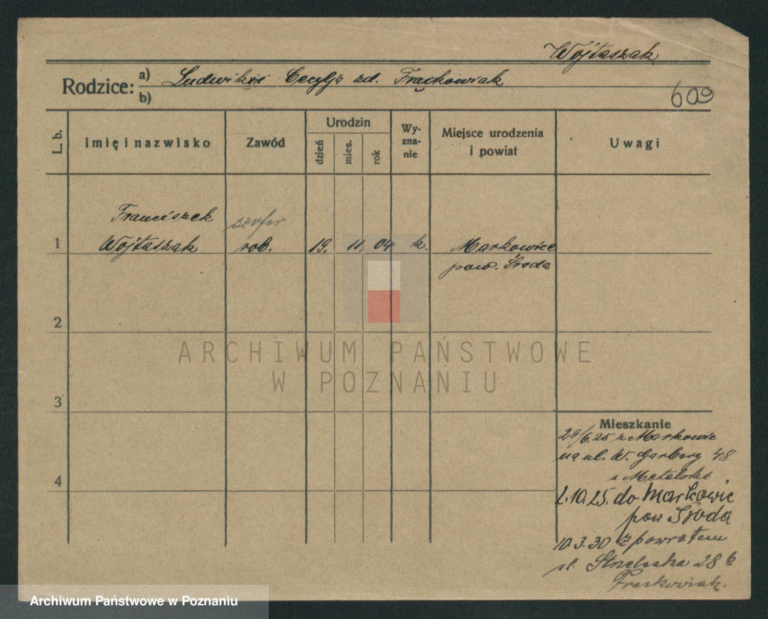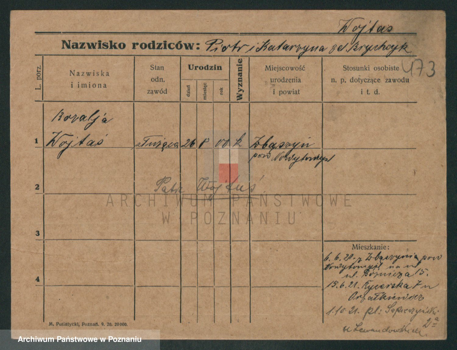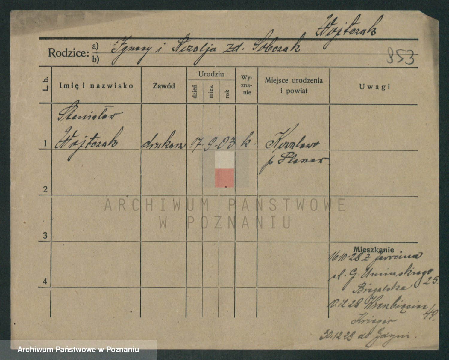 Podgląd karty osobowej dostępny jest po kliknięciu na nazwisko lub ikonkę karty. Można dokonywać powiększenia (ikony na górze) lub przechodzić między kolejnymi skanami (strzałki po bokach).