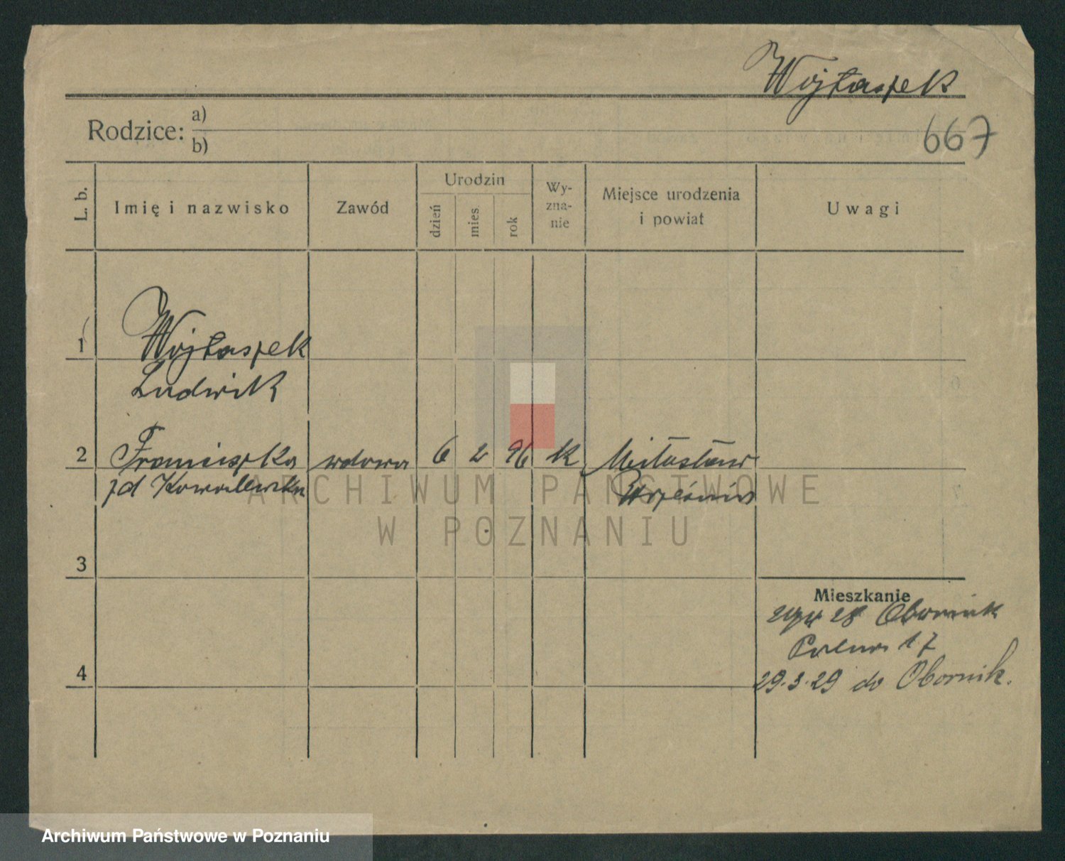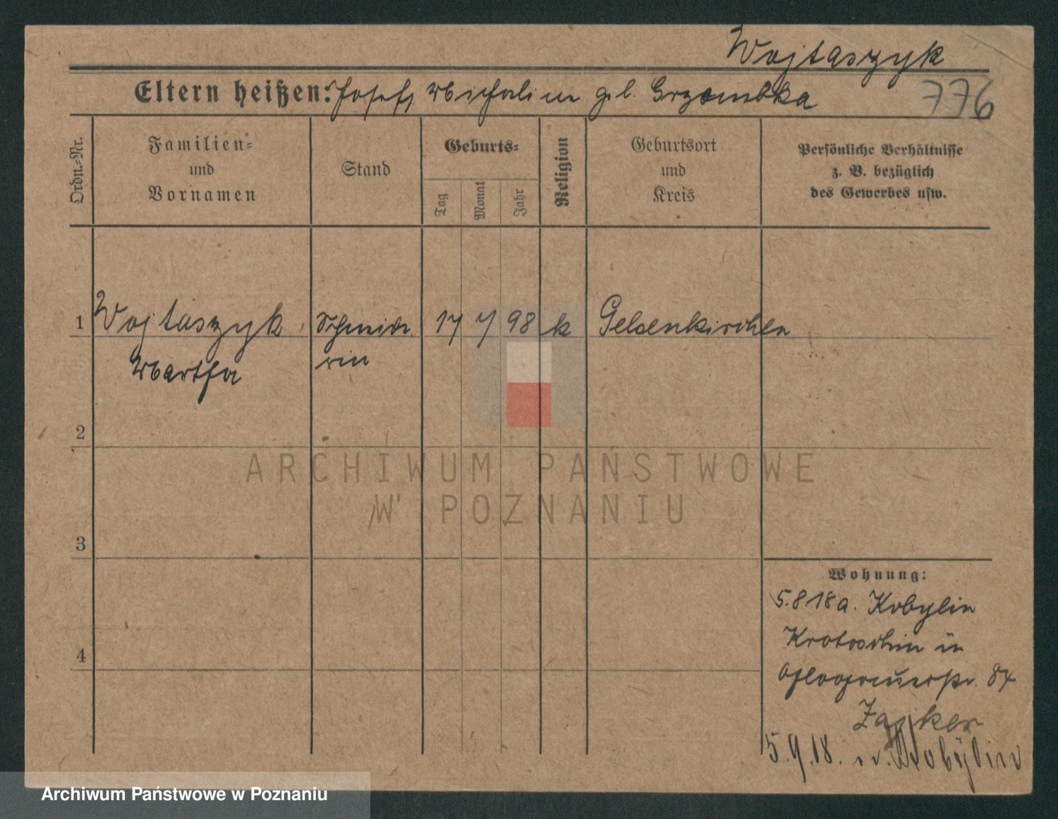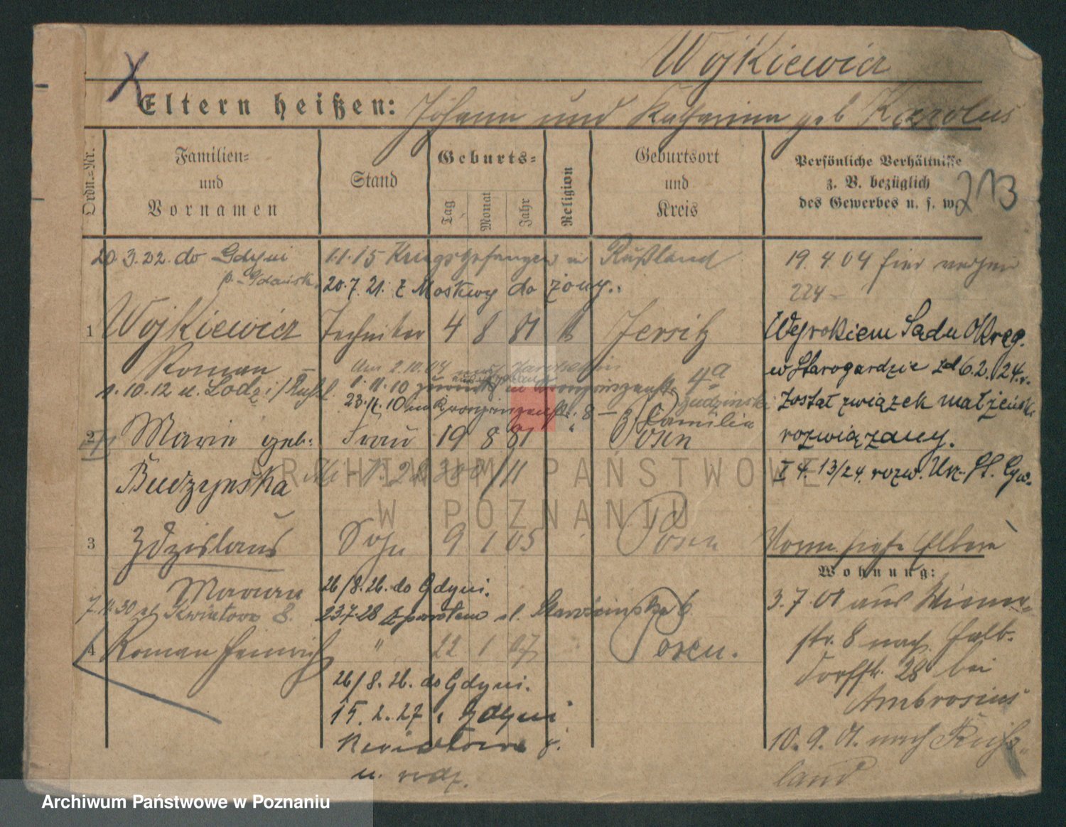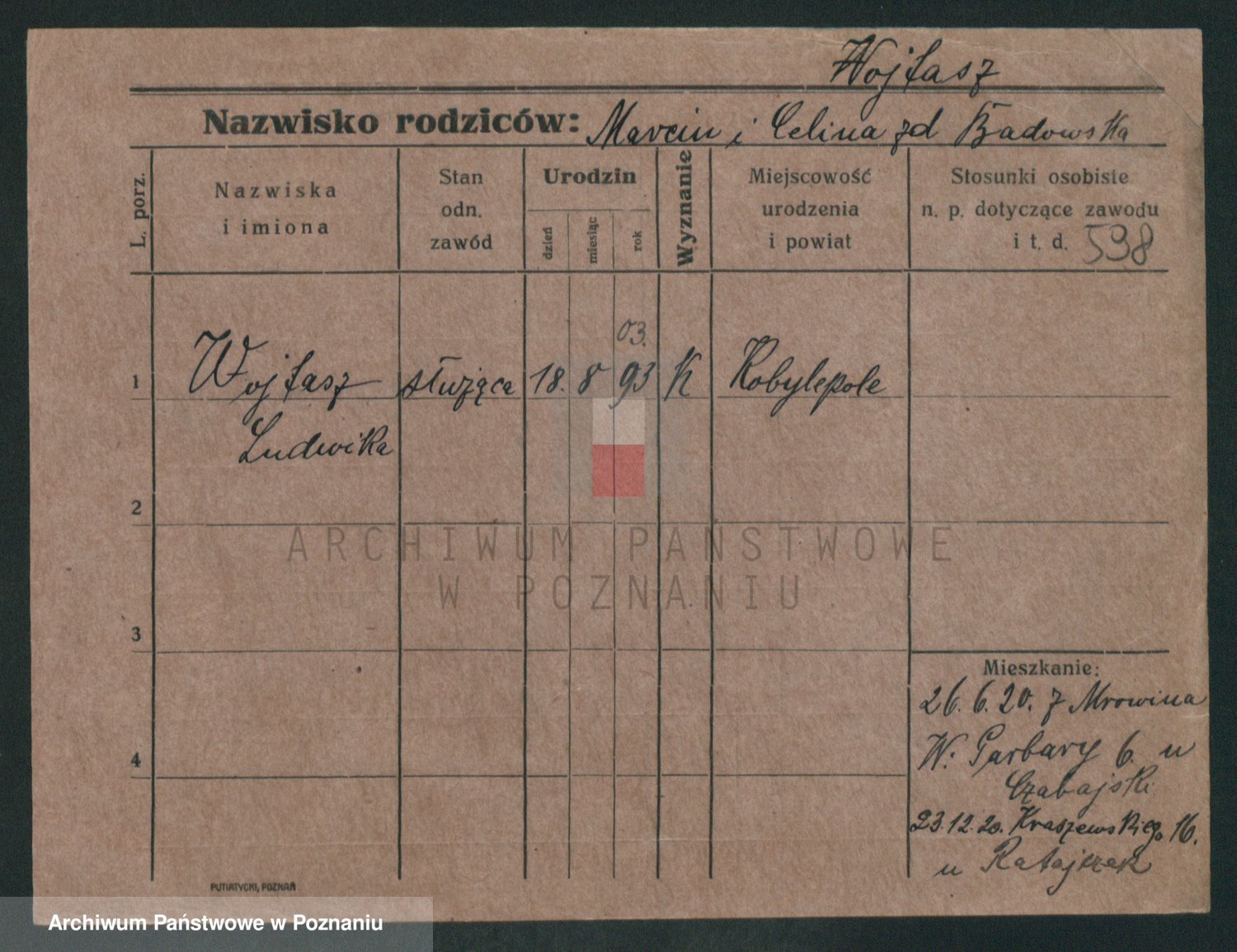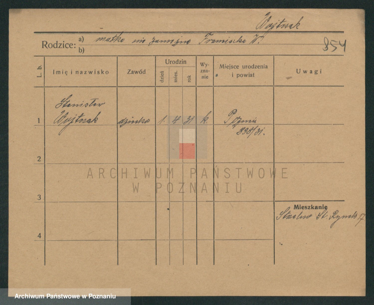 Podgląd karty osobowej dostępny jest po kliknięciu na nazwisko lub ikonkę karty. Można dokonywać powiększenia (ikony na górze) lub przechodzić między kolejnymi skanami (strzałki po bokach).