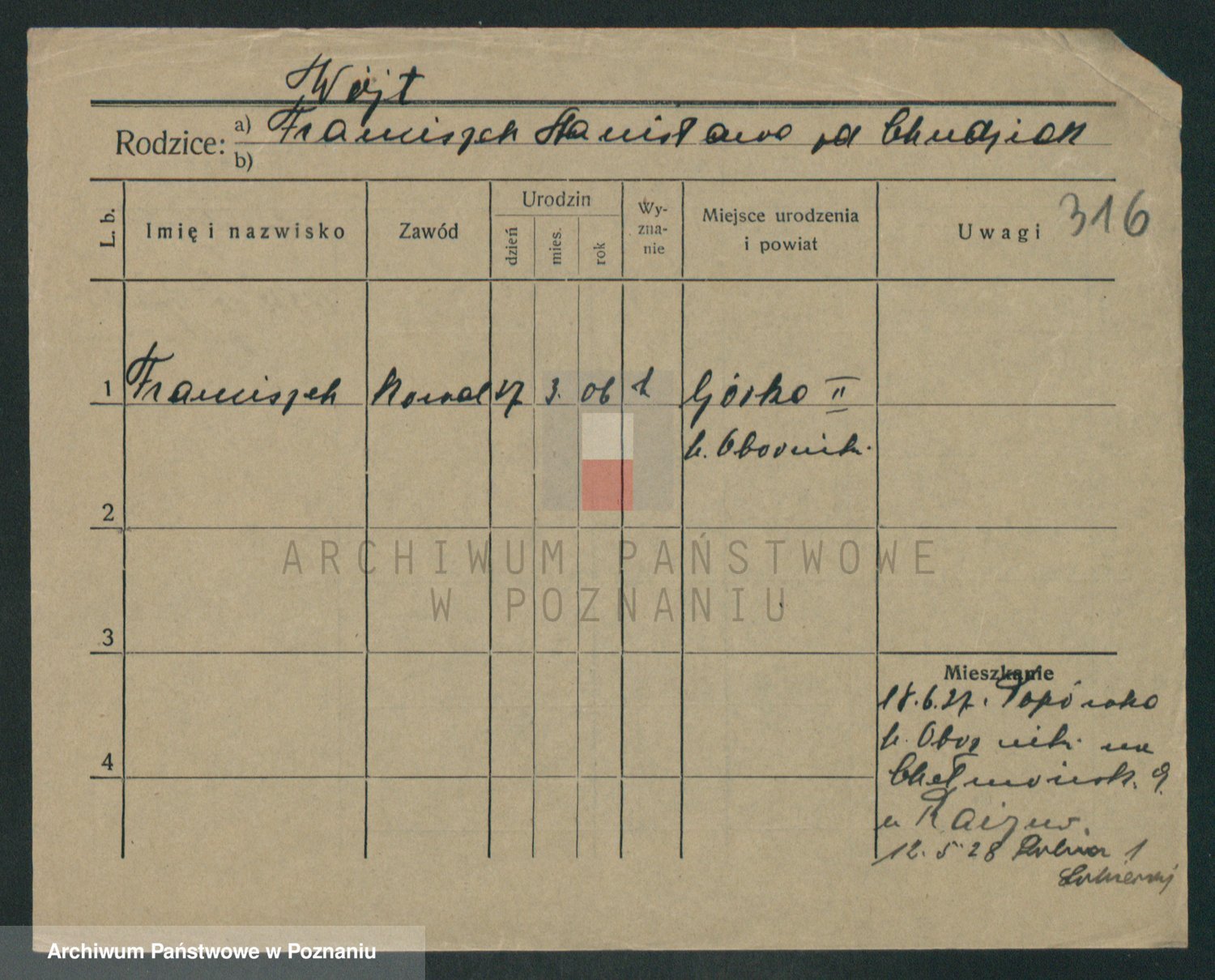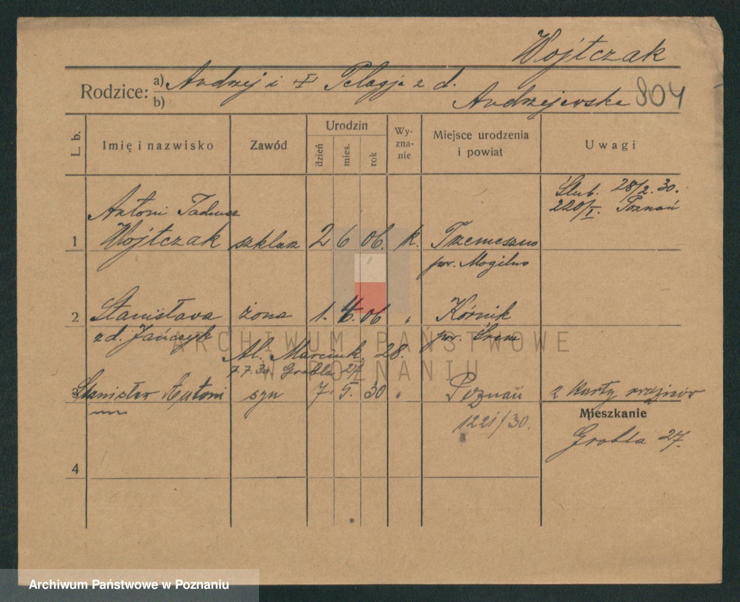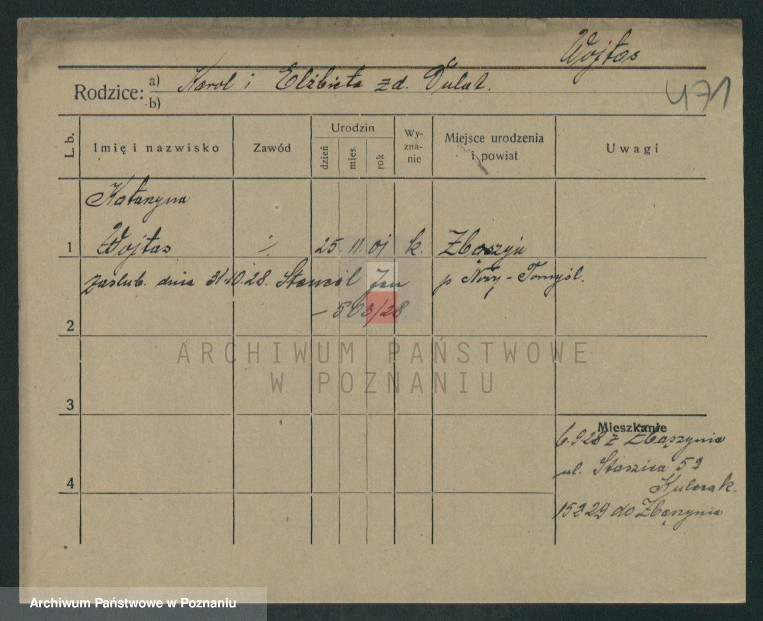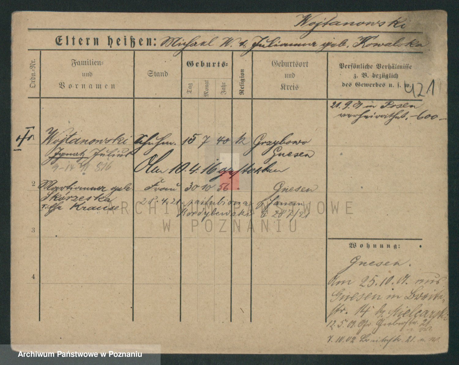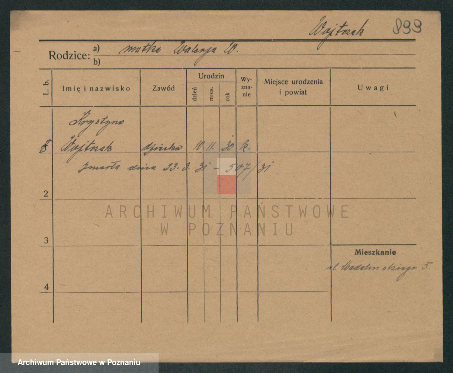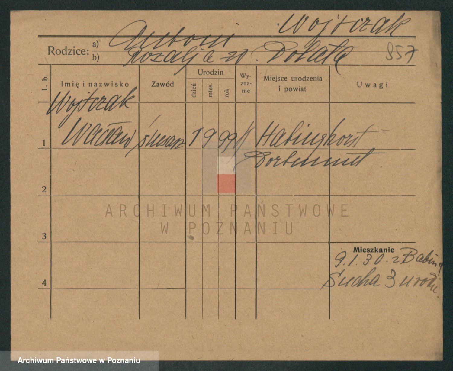 Podgląd karty osobowej dostępny jest po kliknięciu na nazwisko lub ikonkę karty. Można dokonywać powiększenia (ikony na górze) lub przechodzić między kolejnymi skanami (strzałki po bokach).