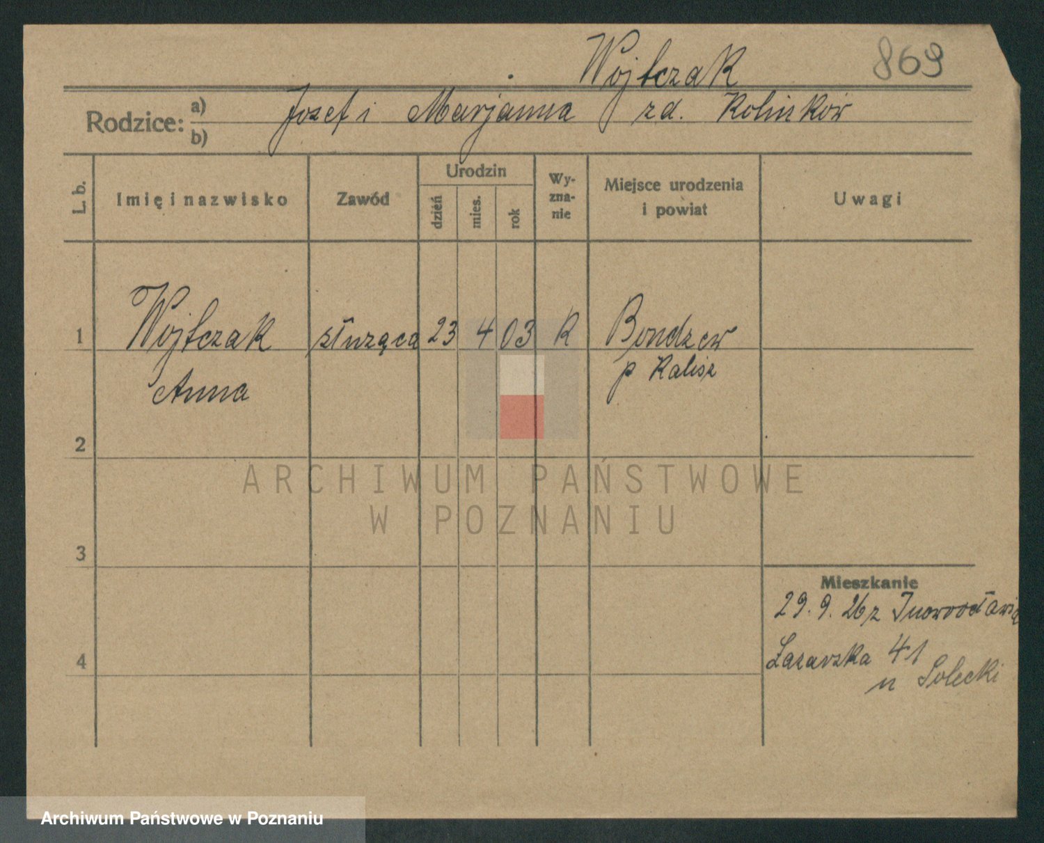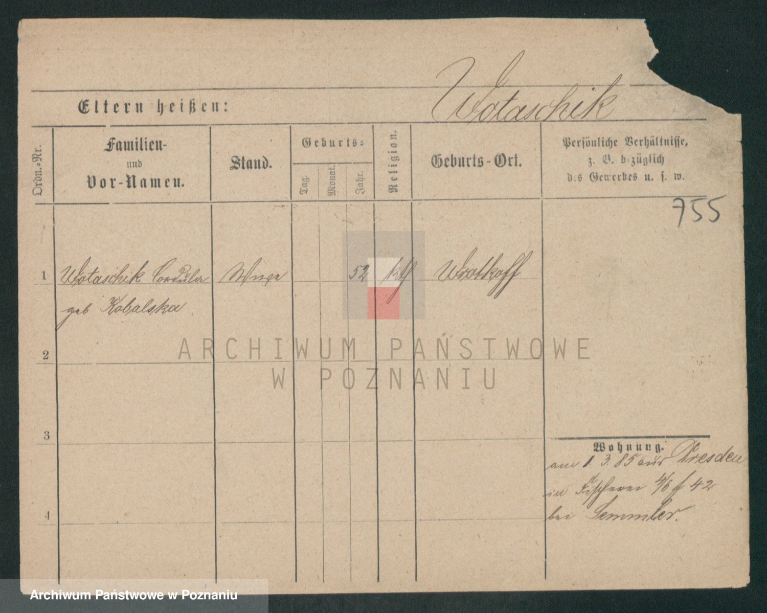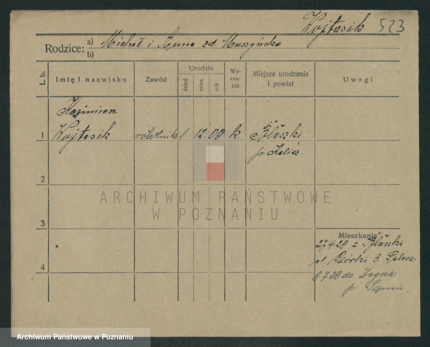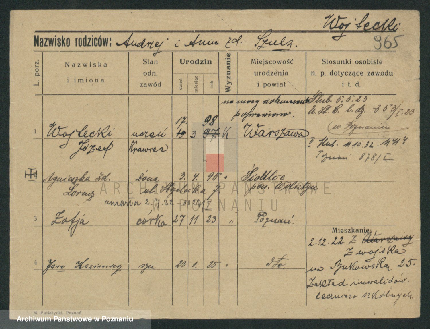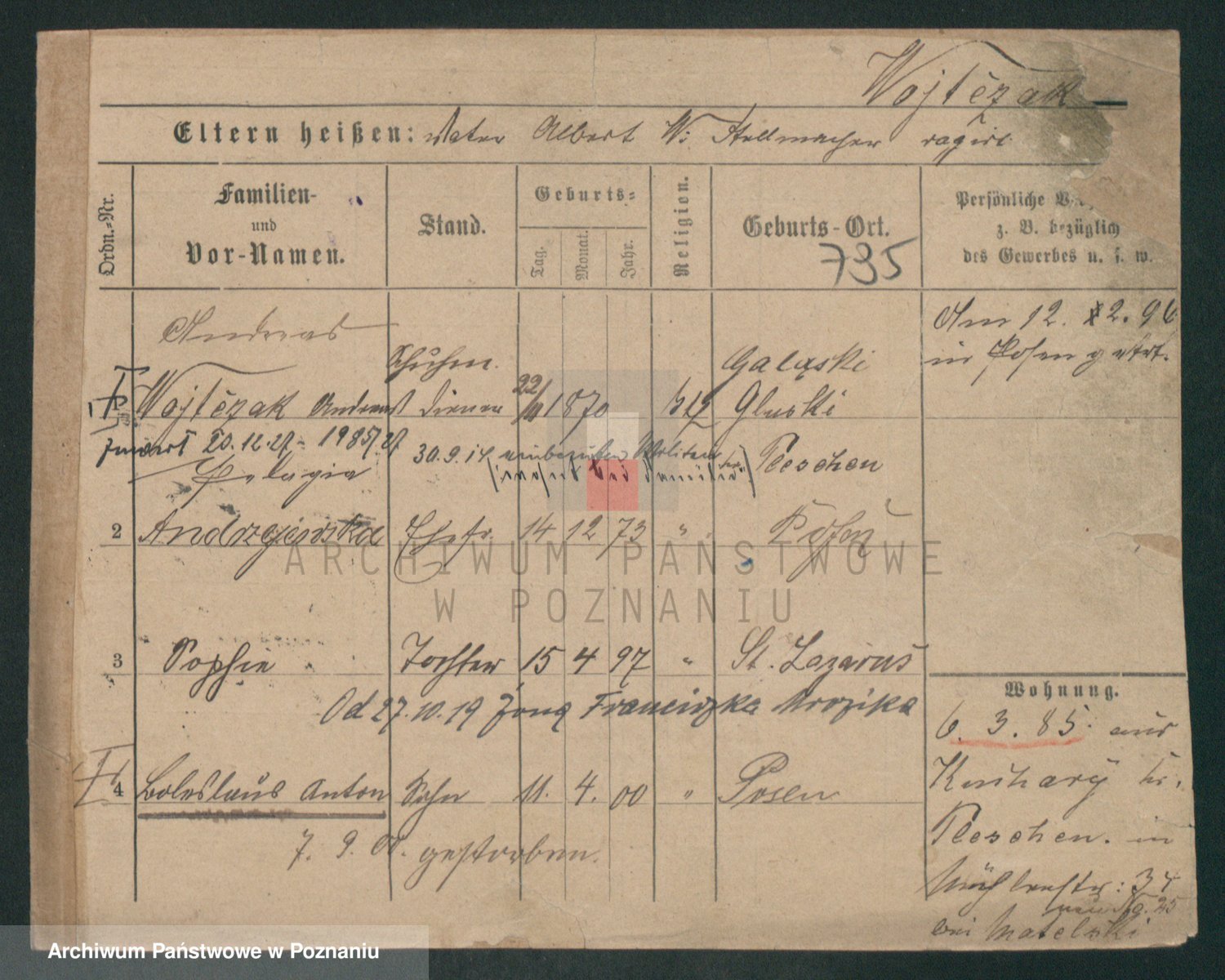 Podgląd karty osobowej dostępny jest po kliknięciu na nazwisko lub ikonkę karty. Można dokonywać powiększenia (ikony na górze) lub przechodzić między kolejnymi skanami (strzałki po bokach).