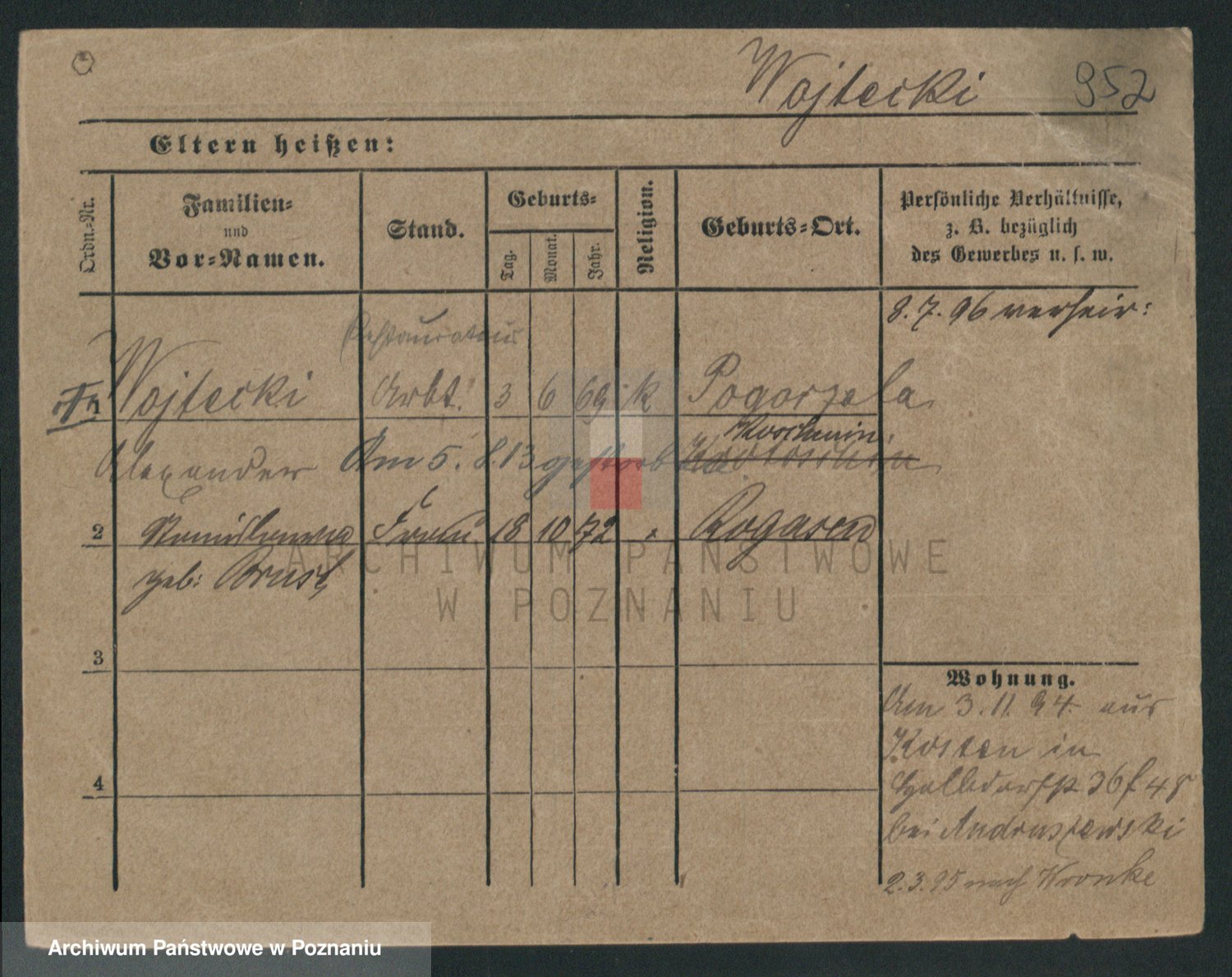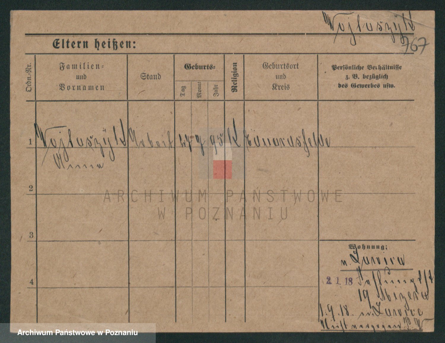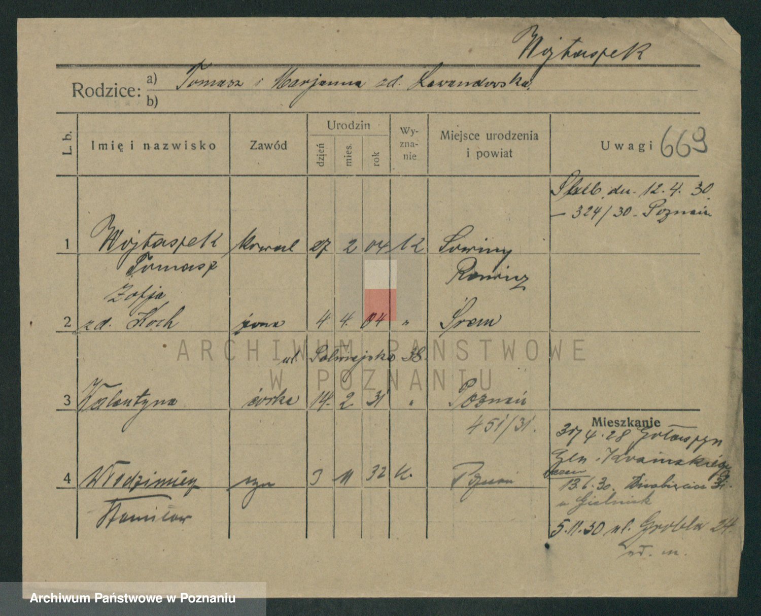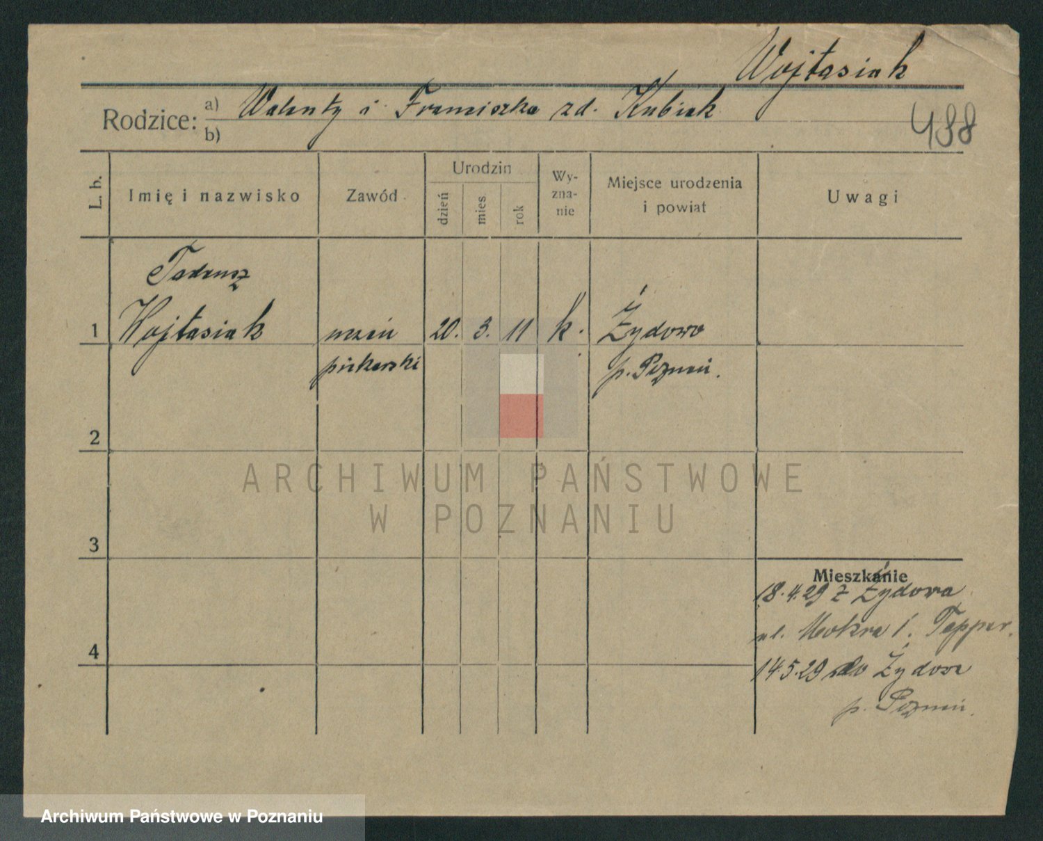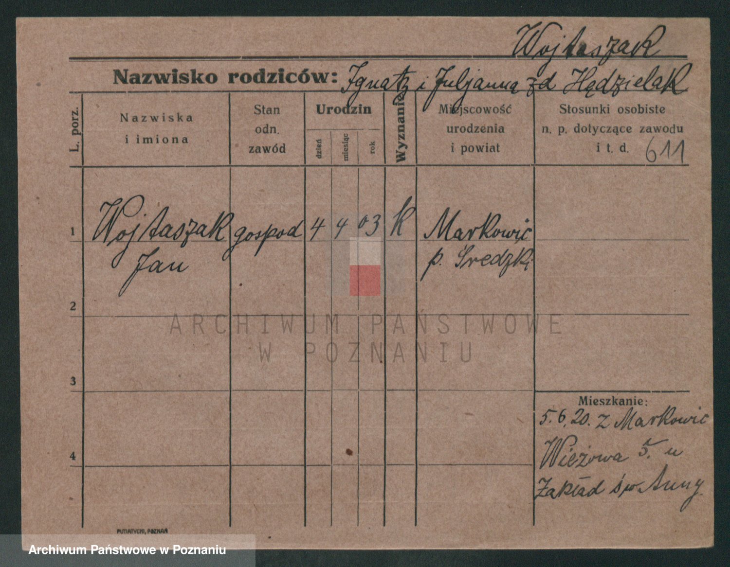 Podgląd karty osobowej dostępny jest po kliknięciu na nazwisko lub ikonkę karty. Można dokonywać powiększenia (ikony na górze) lub przechodzić między kolejnymi skanami (strzałki po bokach).