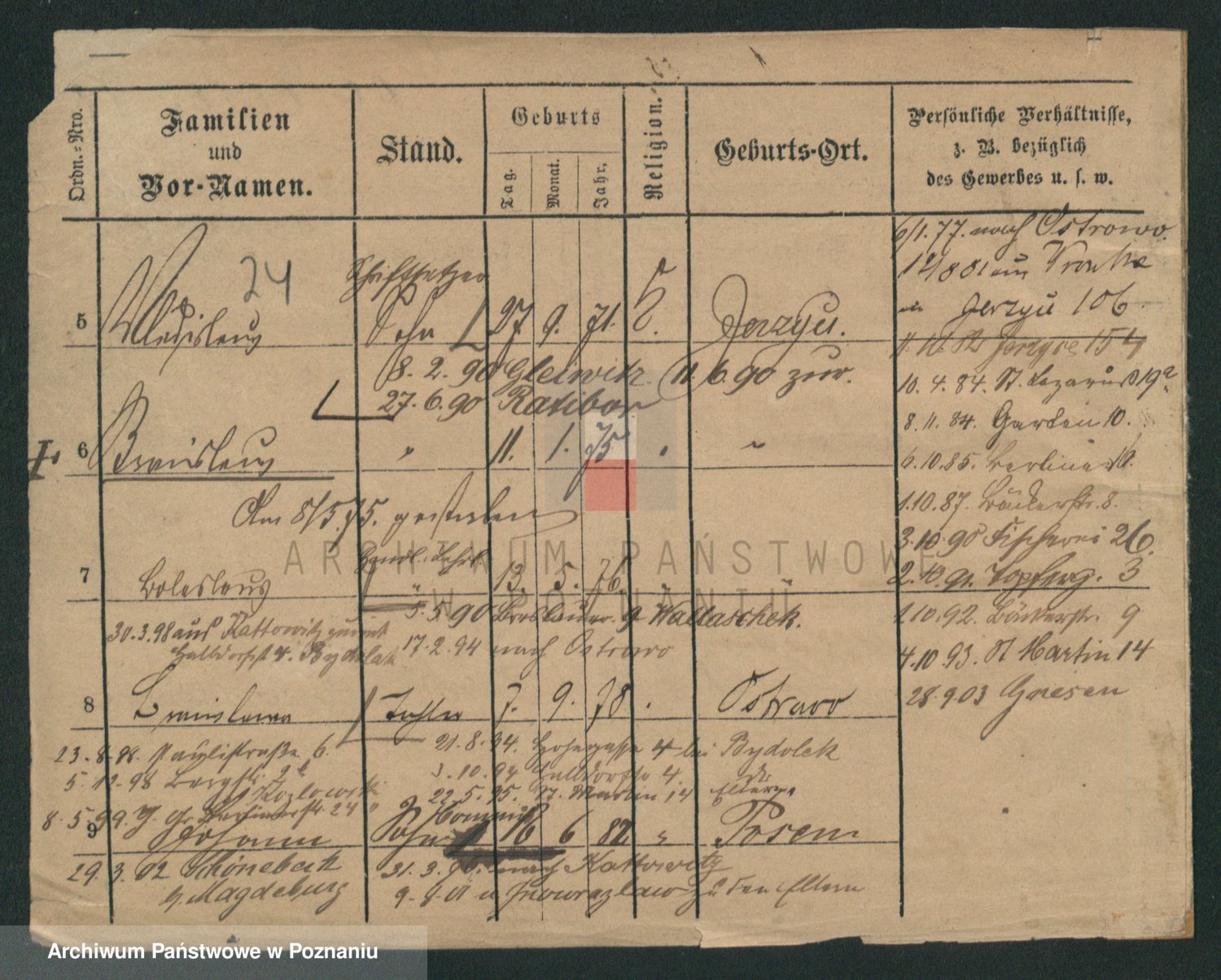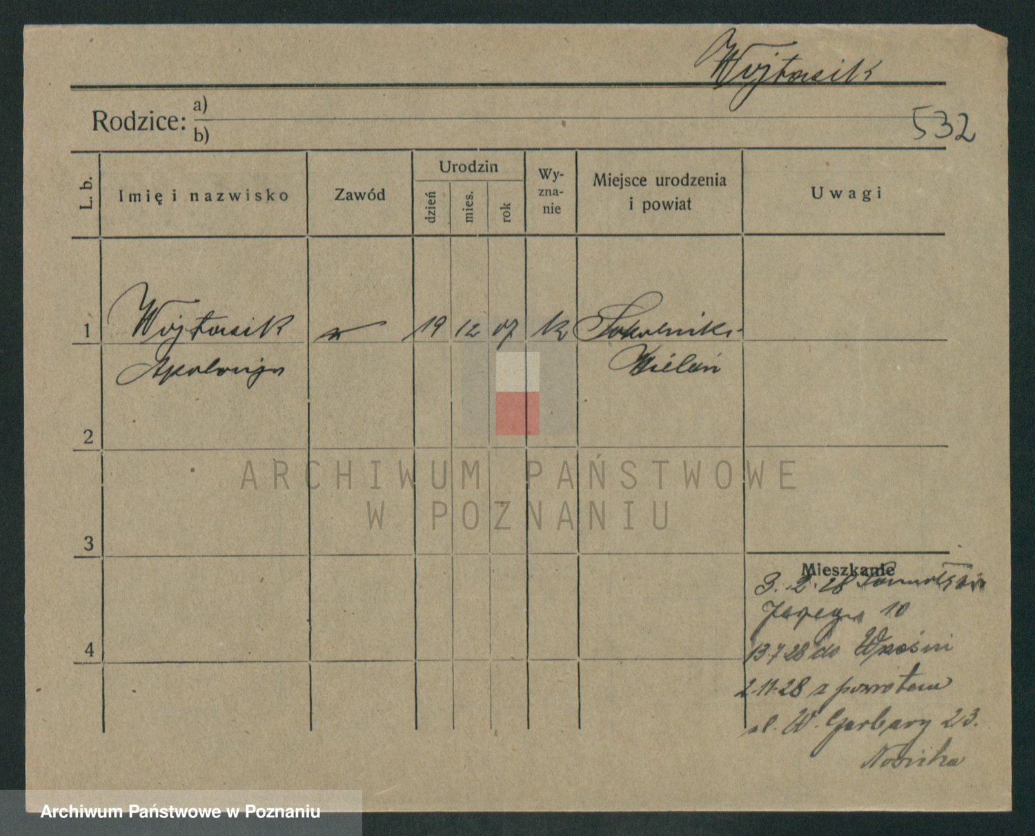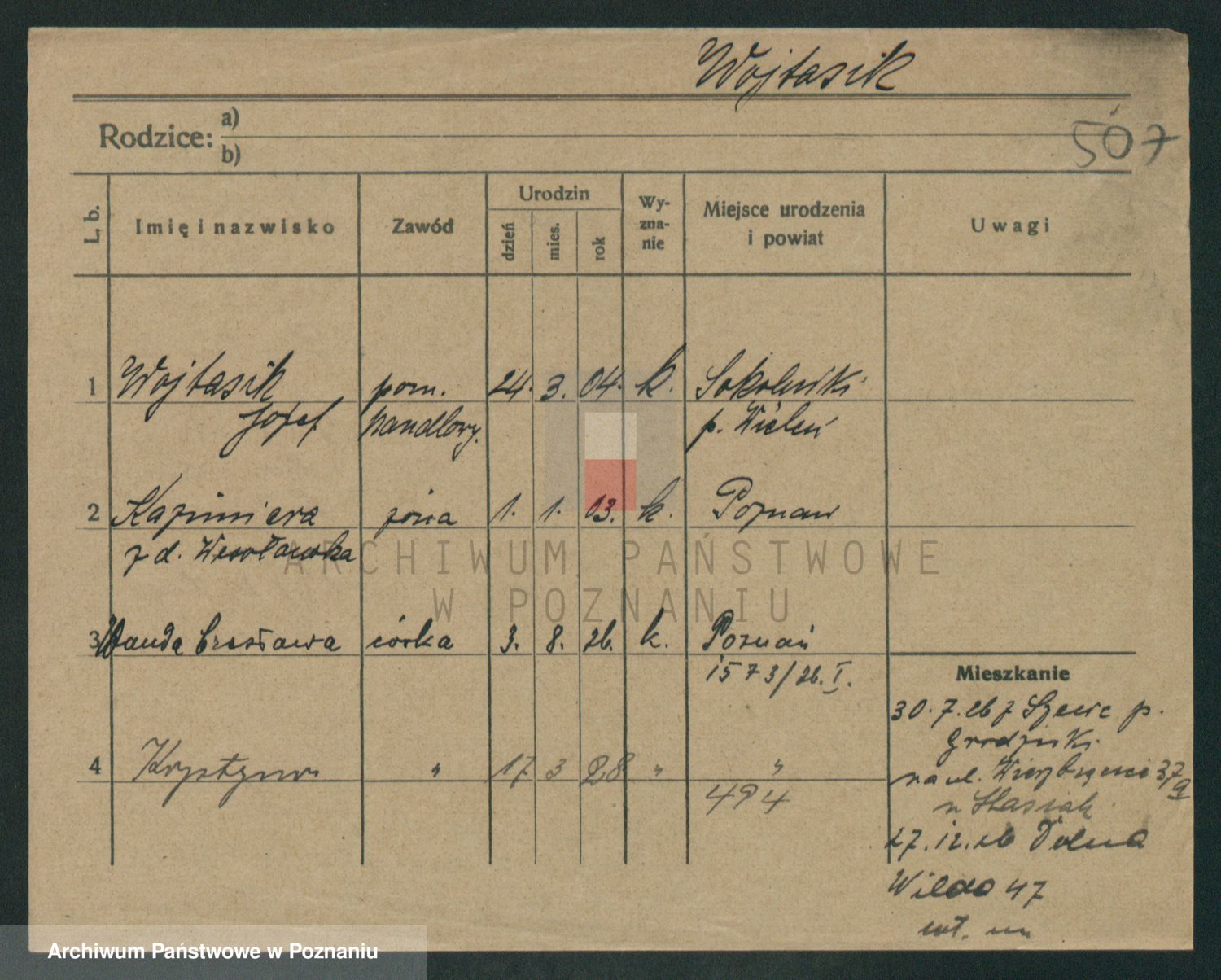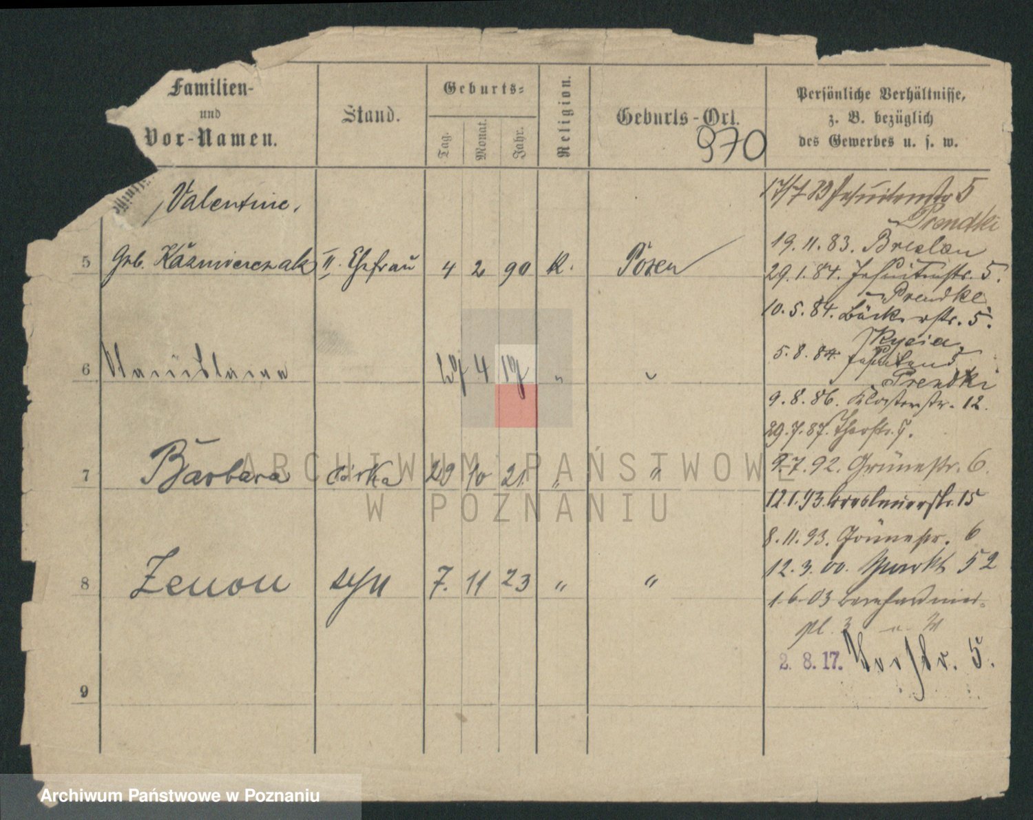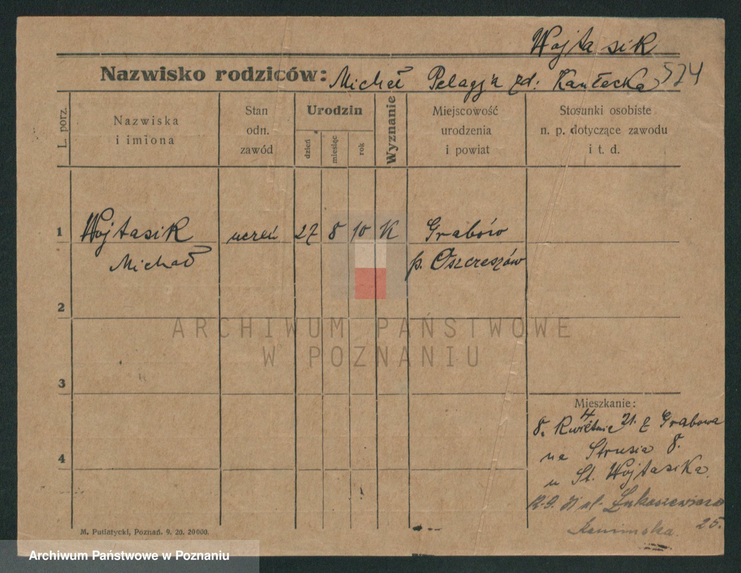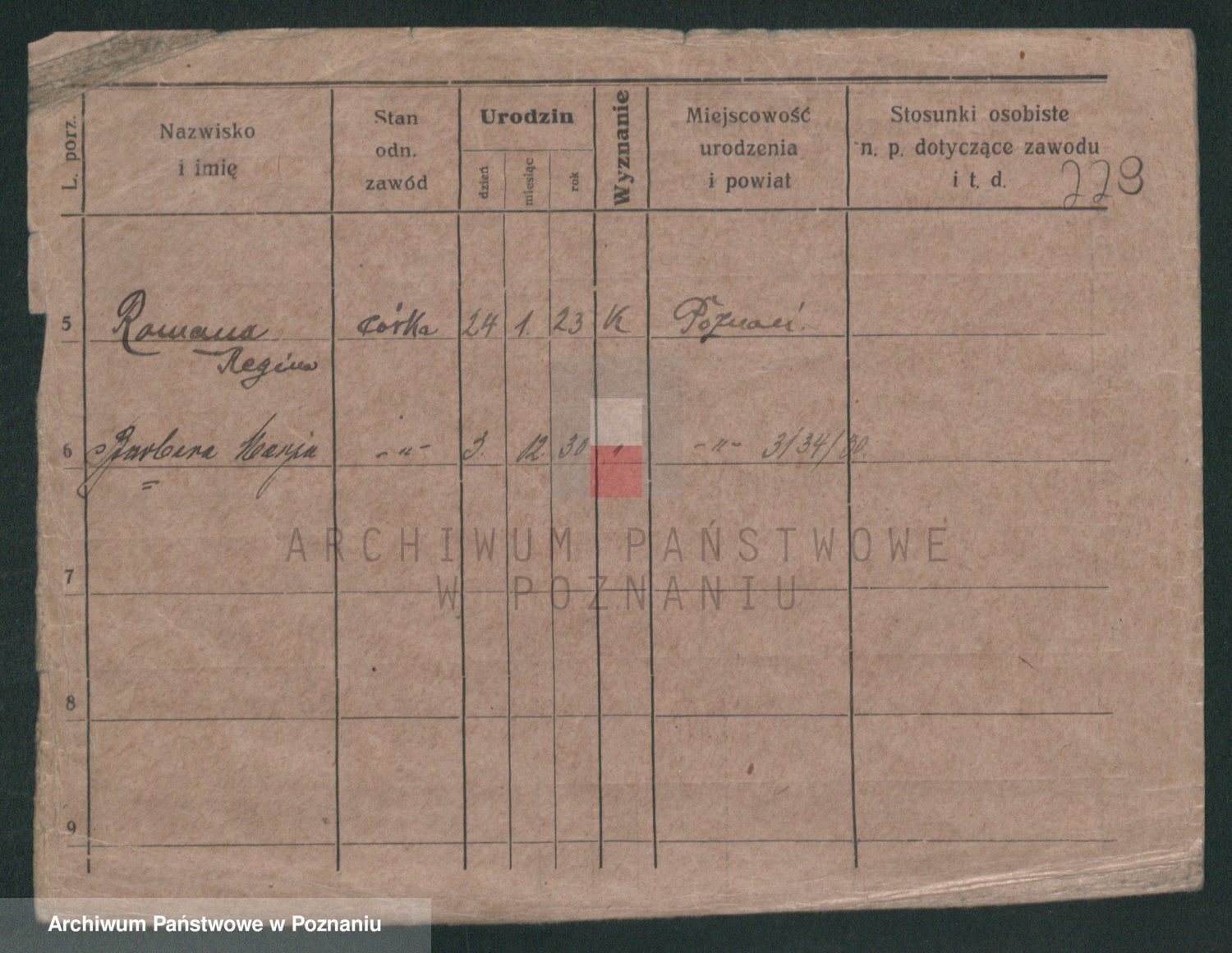 Podgląd karty osobowej dostępny jest po kliknięciu na nazwisko lub ikonkę karty. Można dokonywać powiększenia (ikony na górze) lub przechodzić między kolejnymi skanami (strzałki po bokach).