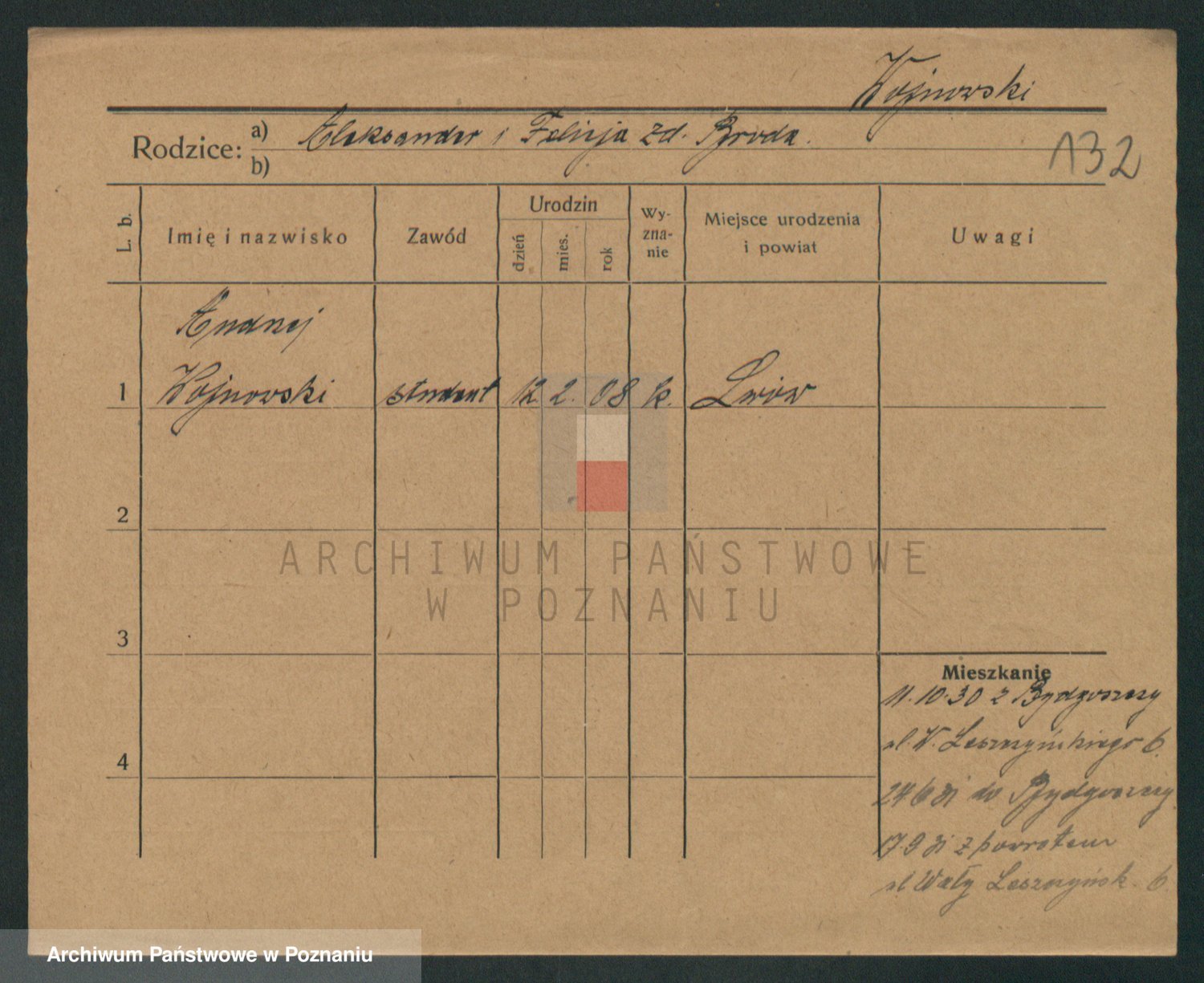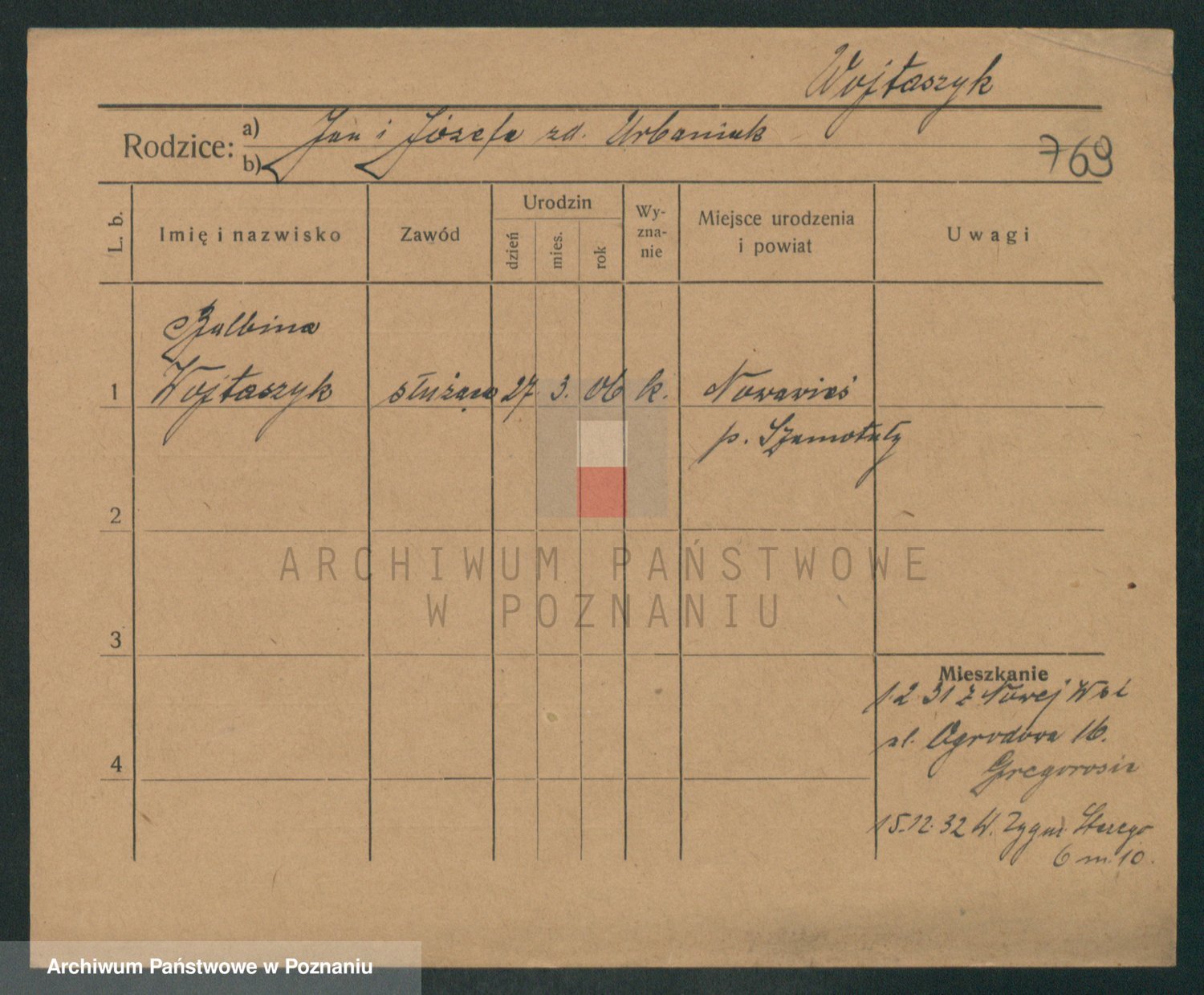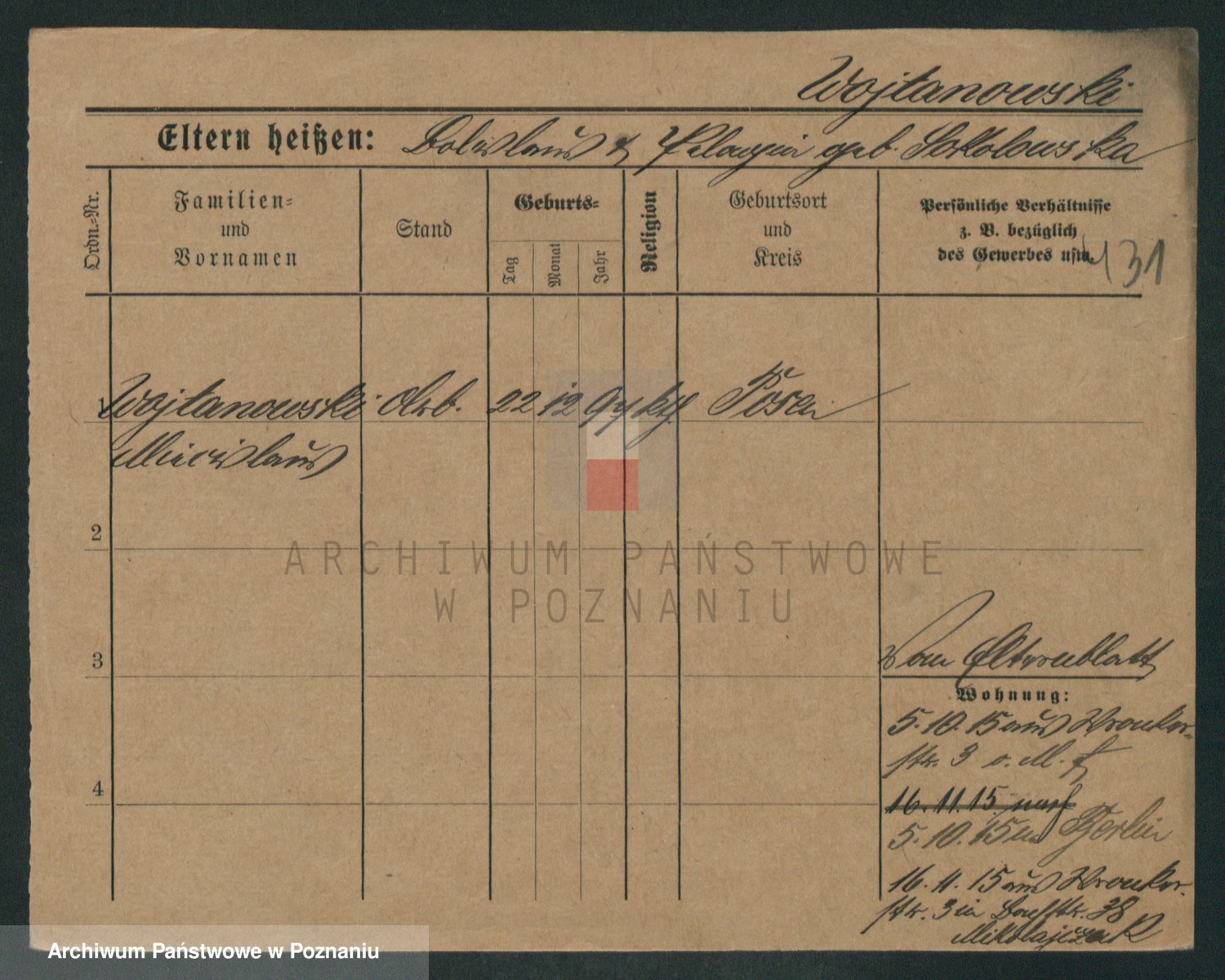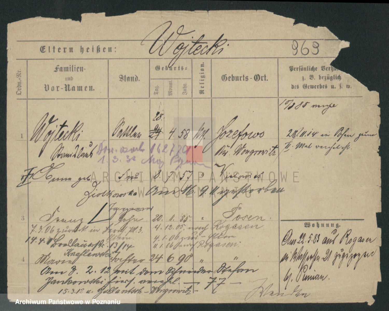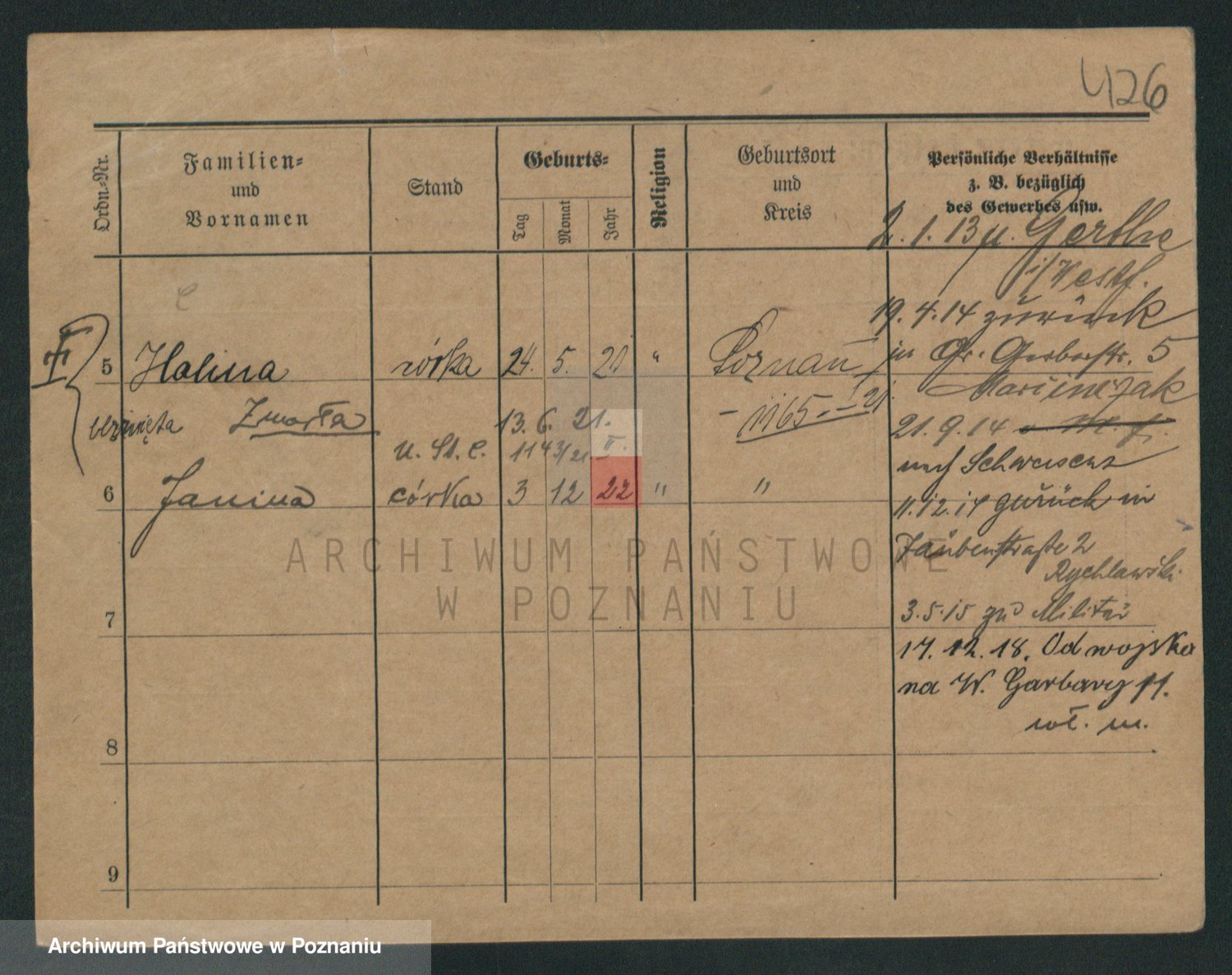 Podgląd karty osobowej dostępny jest po kliknięciu na nazwisko lub ikonkę karty. Można dokonywać powiększenia (ikony na górze) lub przechodzić między kolejnymi skanami (strzałki po bokach).