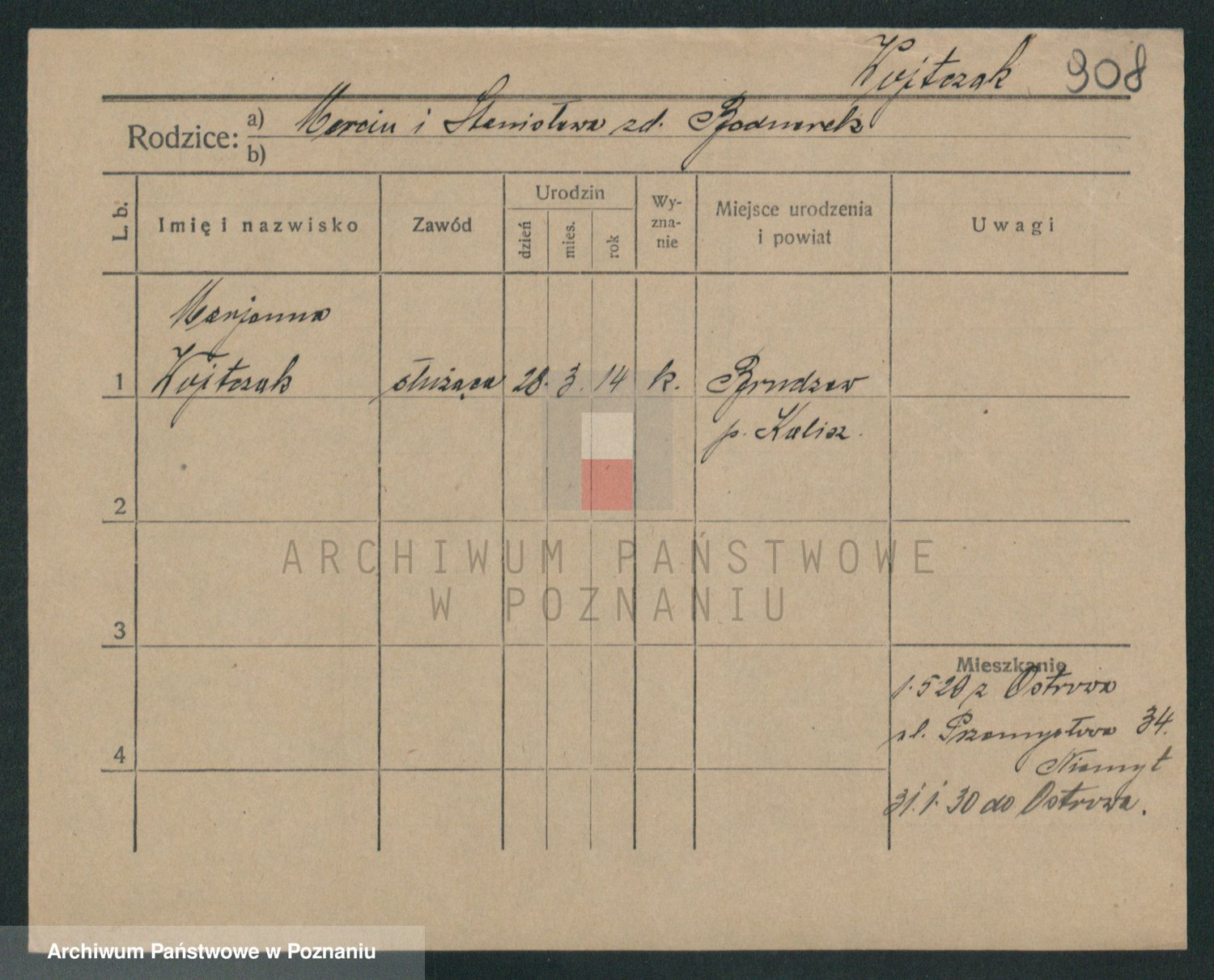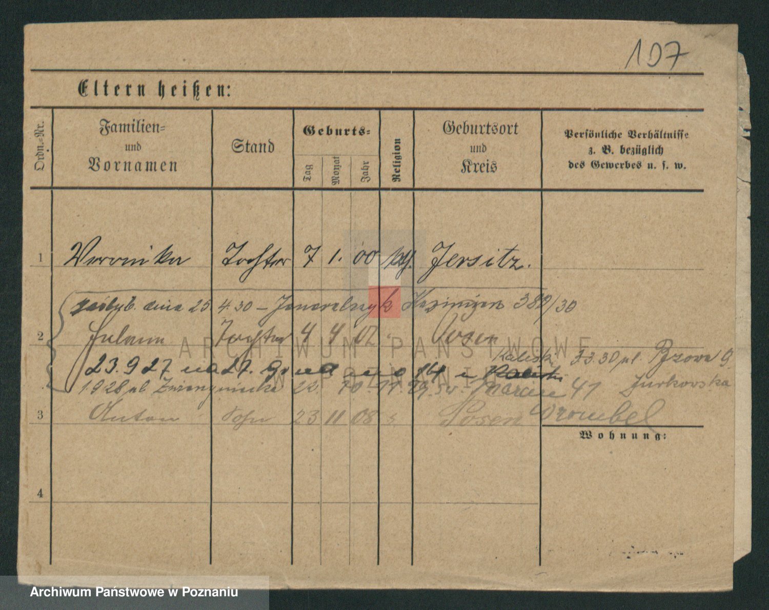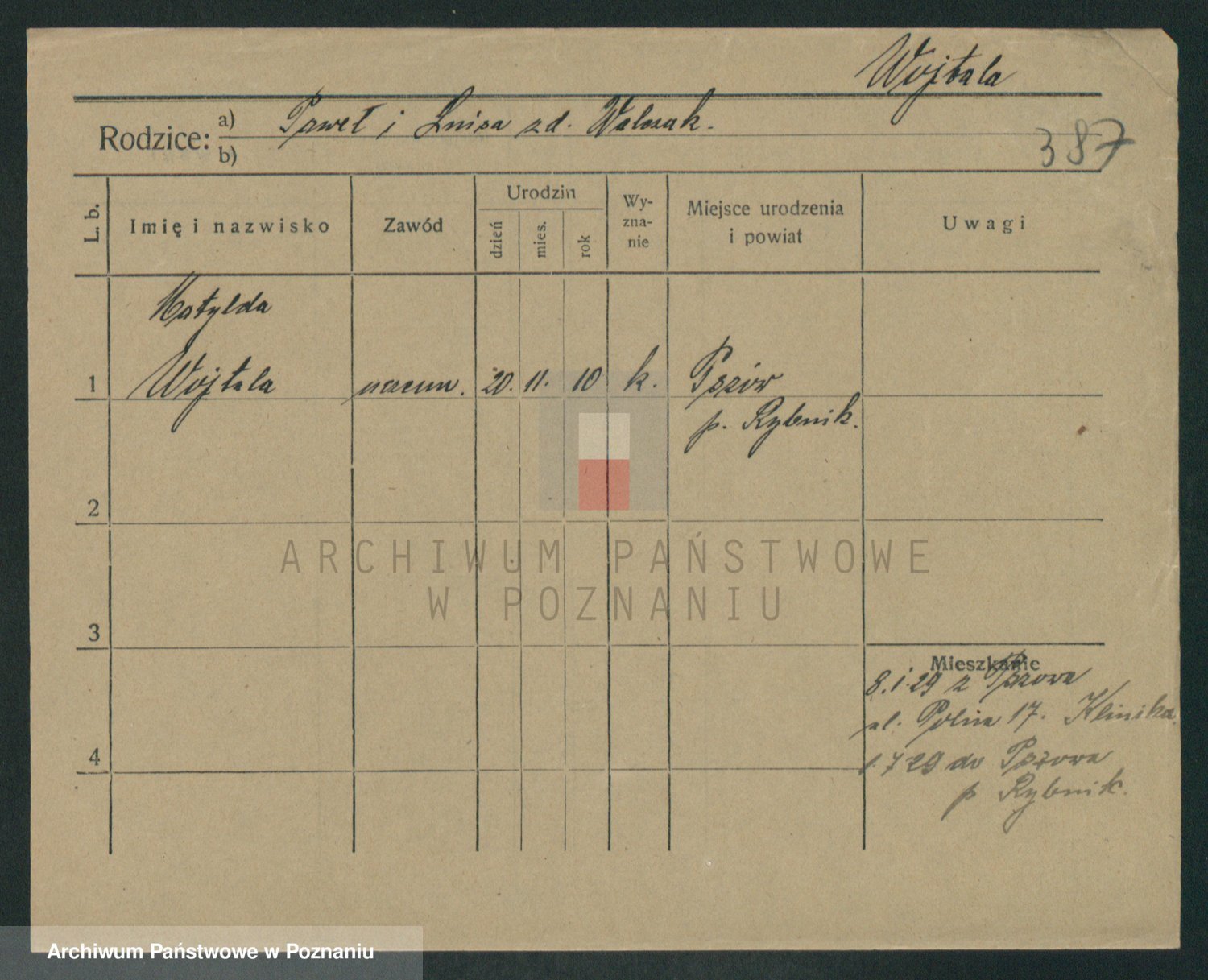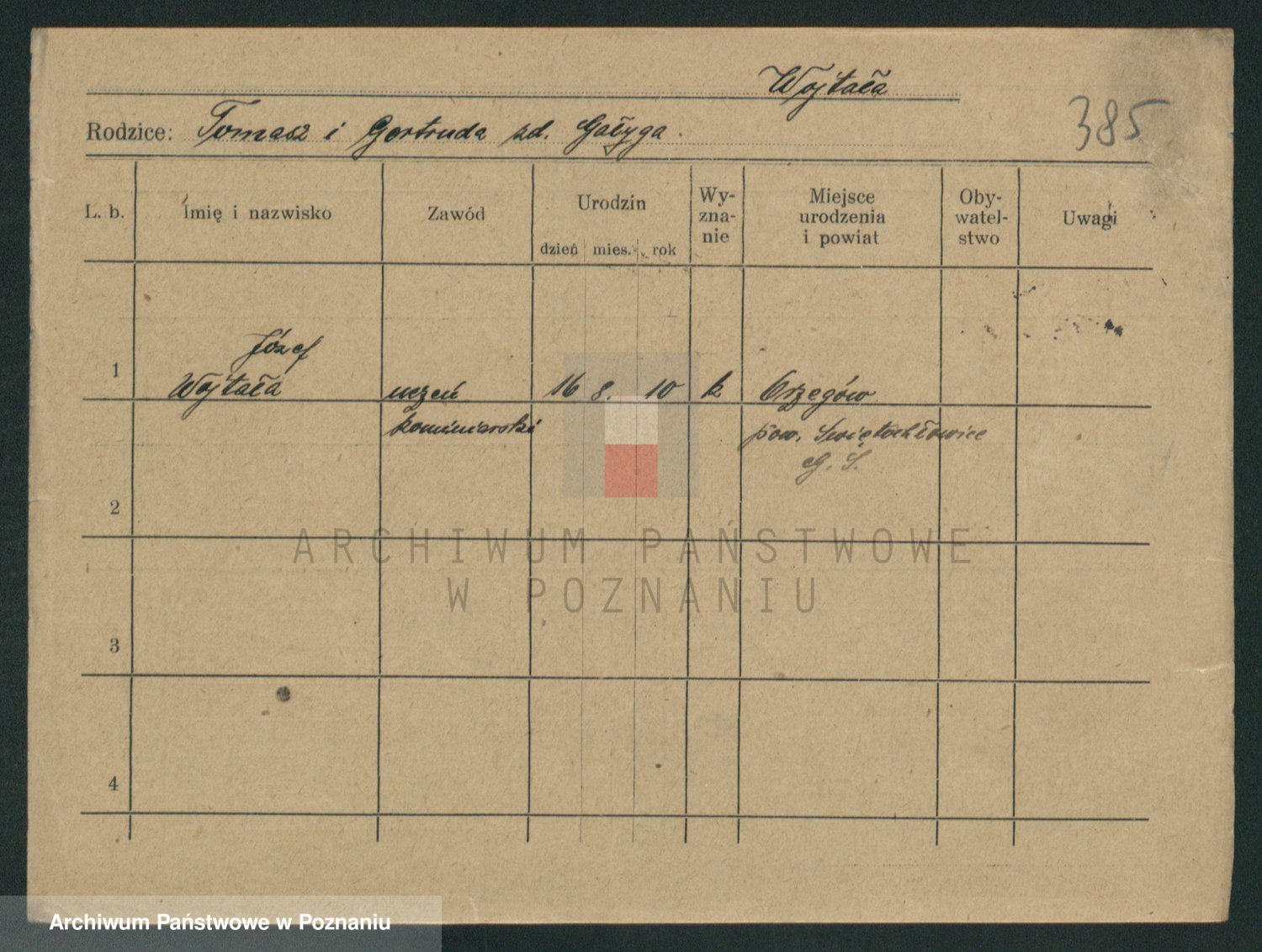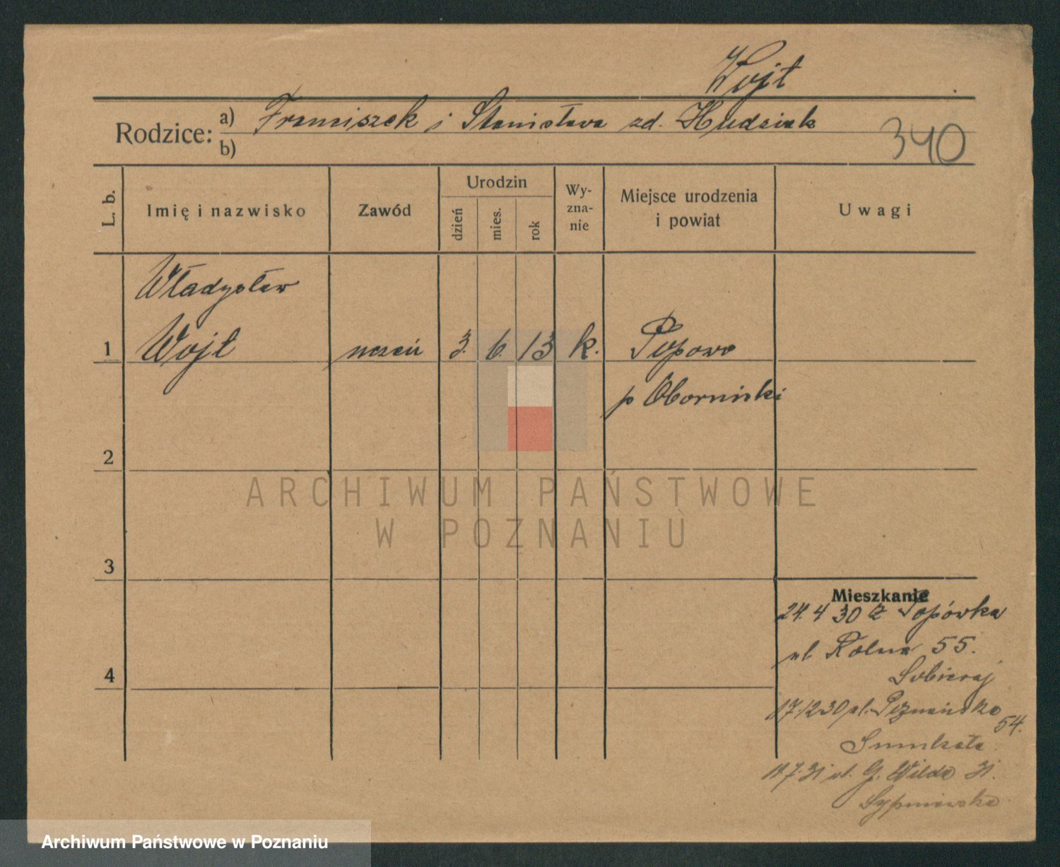 Podgląd karty osobowej dostępny jest po kliknięciu na nazwisko lub ikonkę karty. Można dokonywać powiększenia (ikony na górze) lub przechodzić między kolejnymi skanami (strzałki po bokach).
