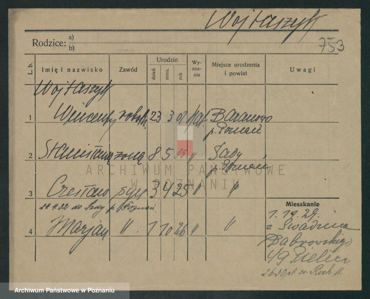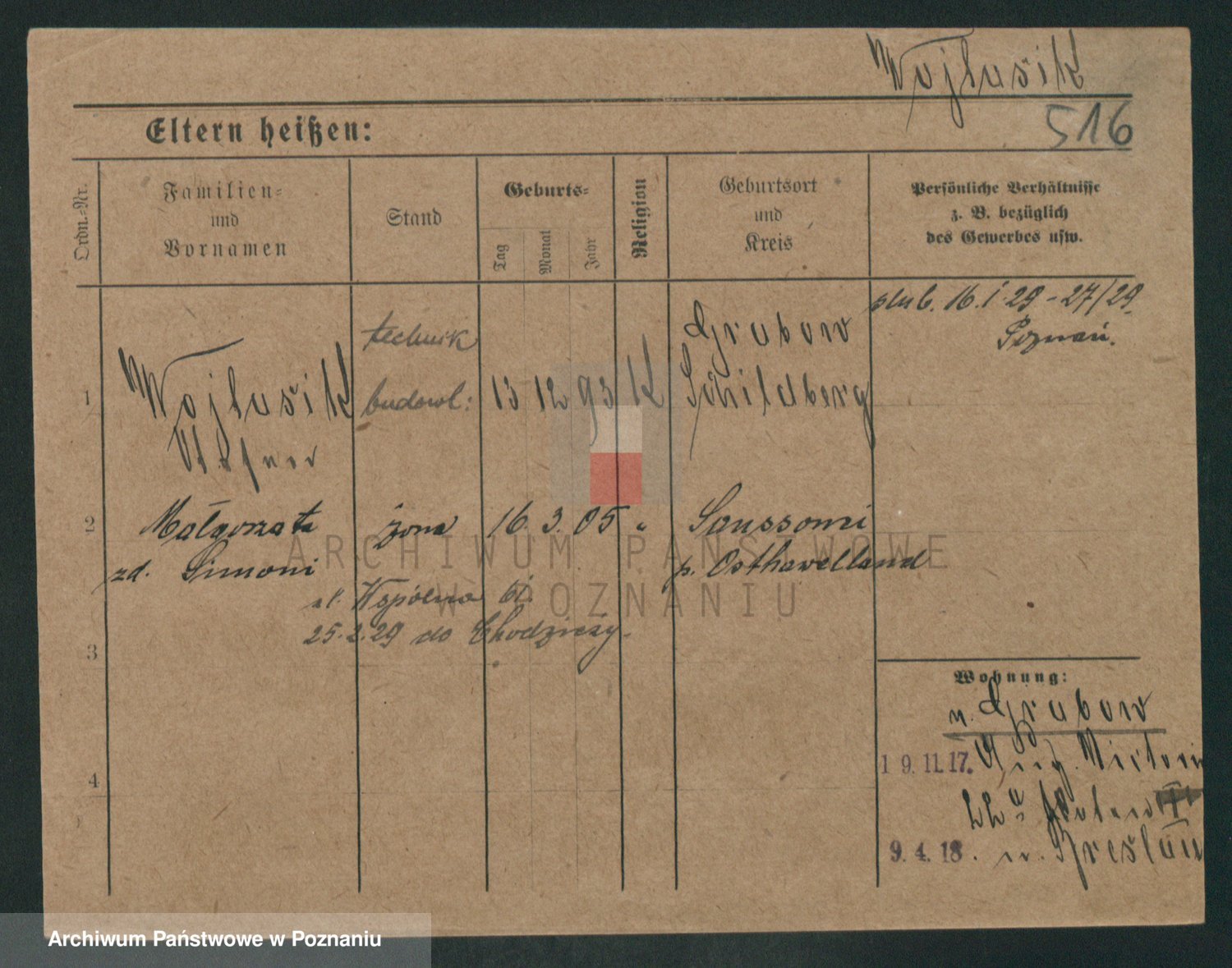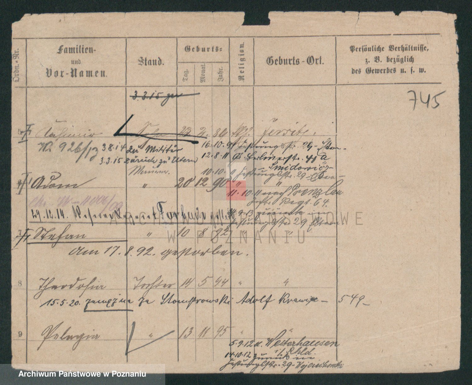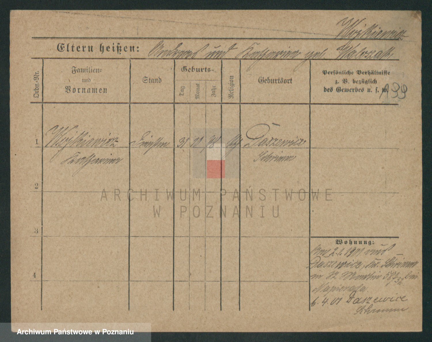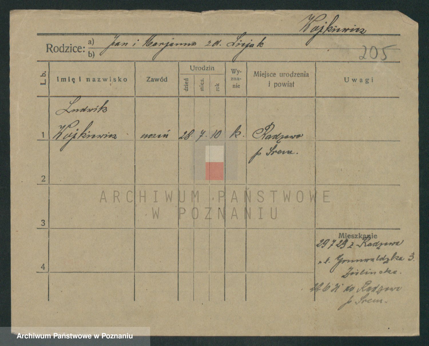 Podgląd karty osobowej dostępny jest po kliknięciu na nazwisko lub ikonkę karty. Można dokonywać powiększenia (ikony na górze) lub przechodzić między kolejnymi skanami (strzałki po bokach).