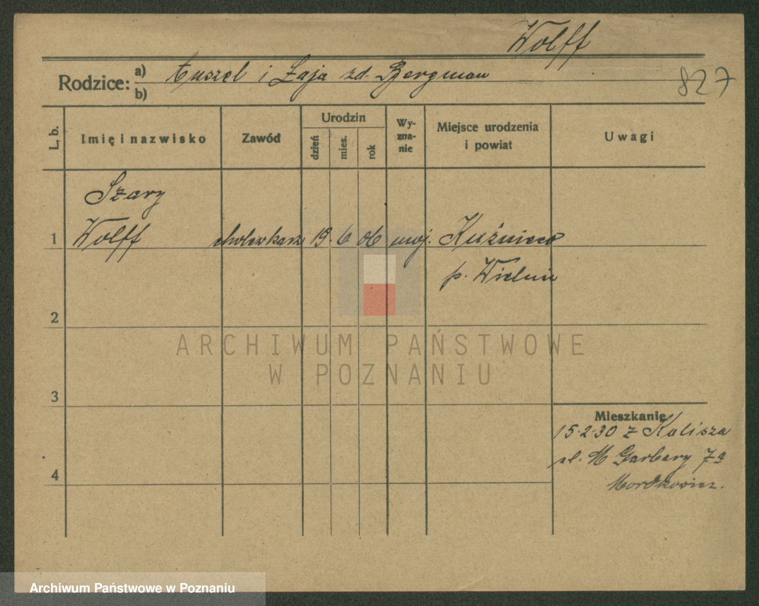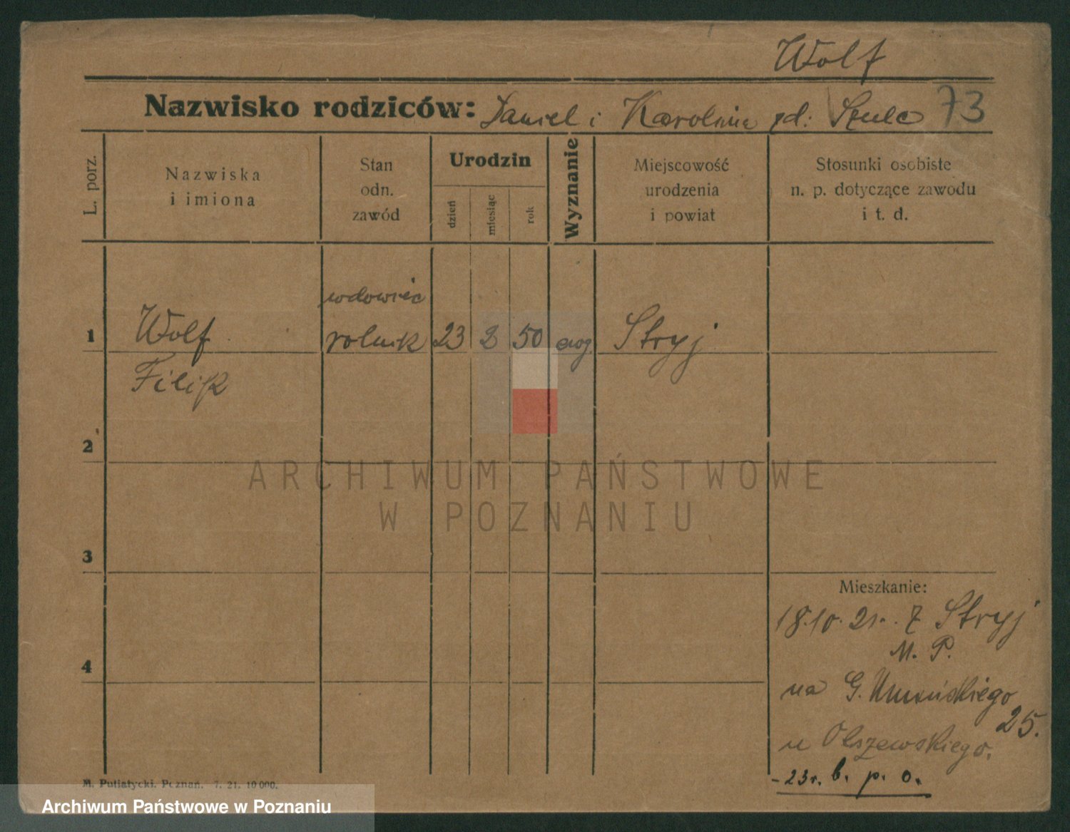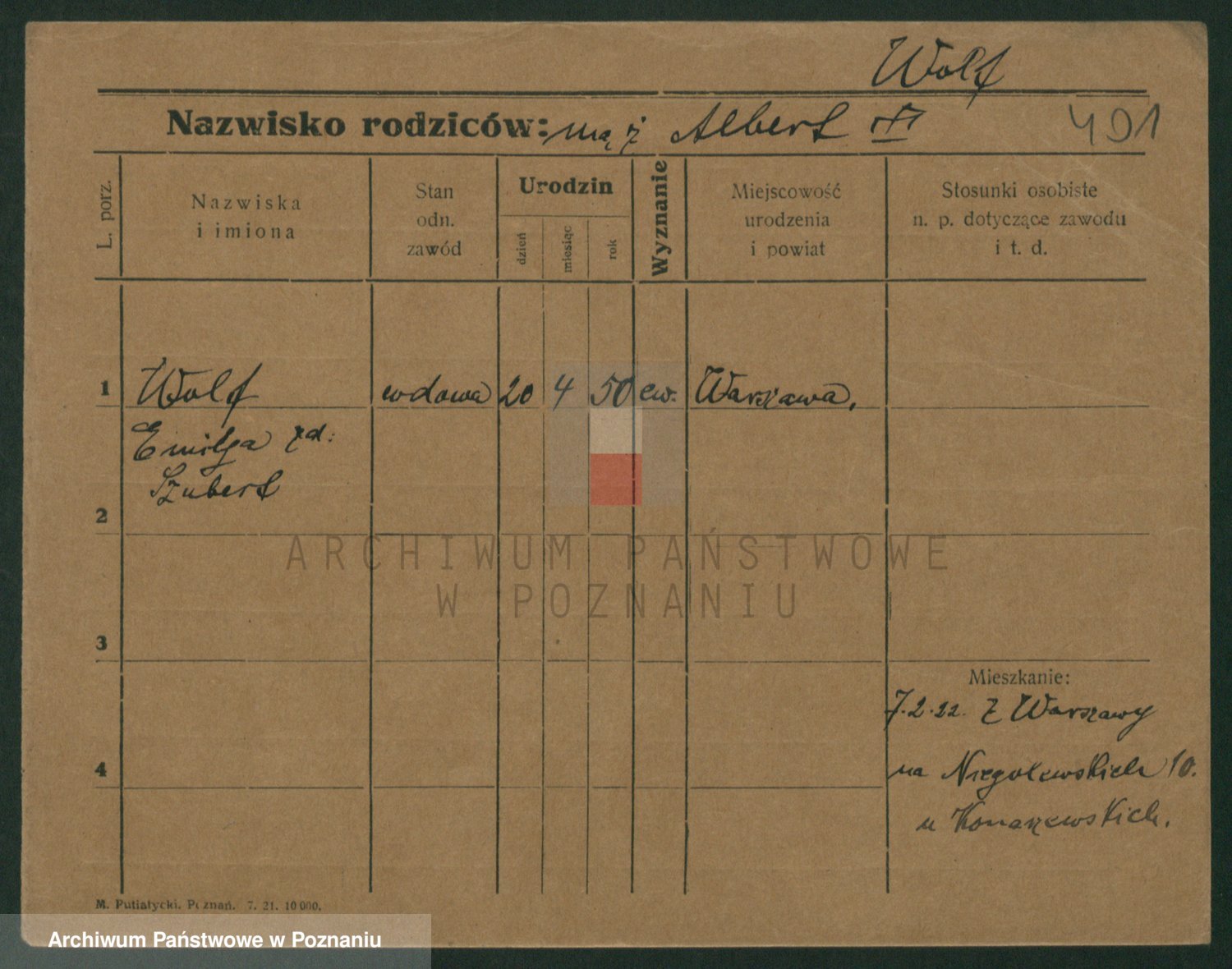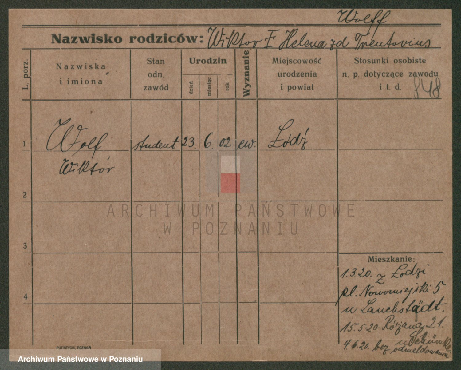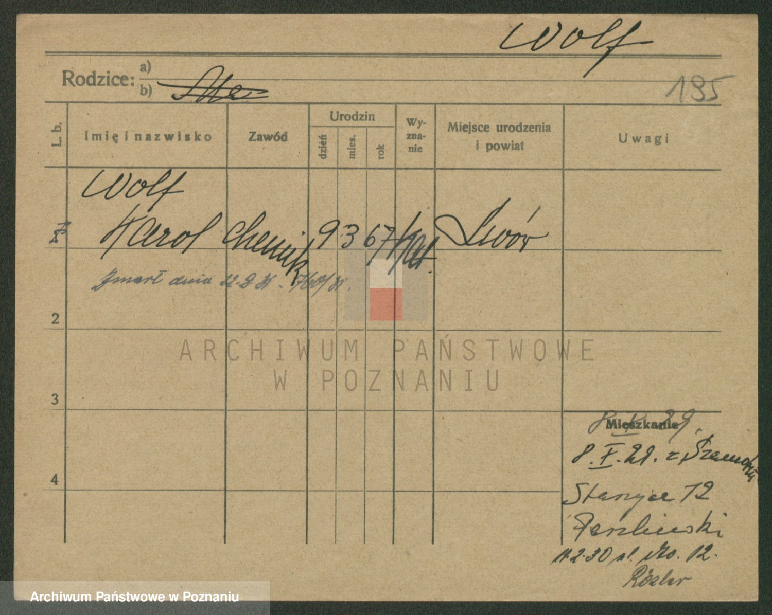 Podgląd karty osobowej dostępny jest po kliknięciu na nazwisko lub ikonkę karty. Można dokonywać powiększenia (ikony na górze) lub przechodzić między kolejnymi skanami (strzałki po bokach).