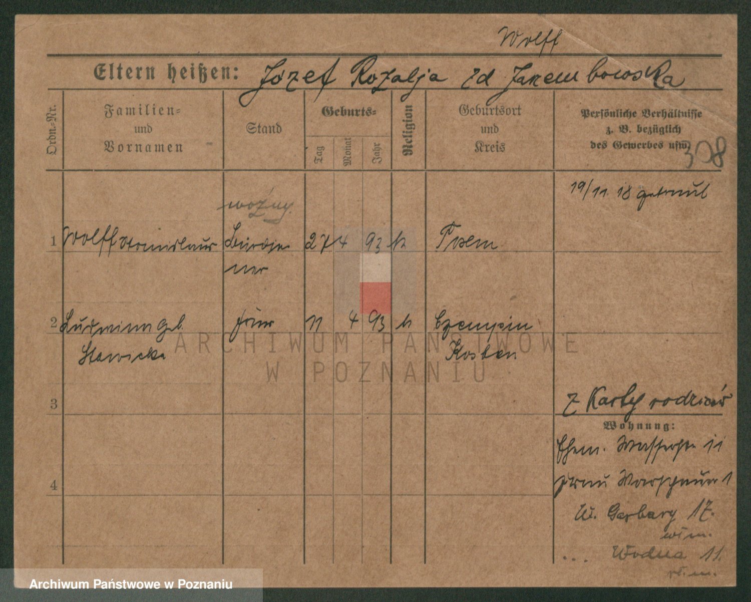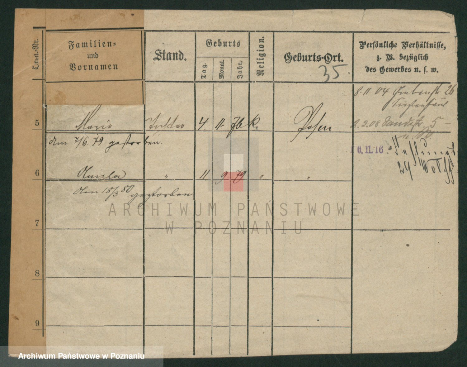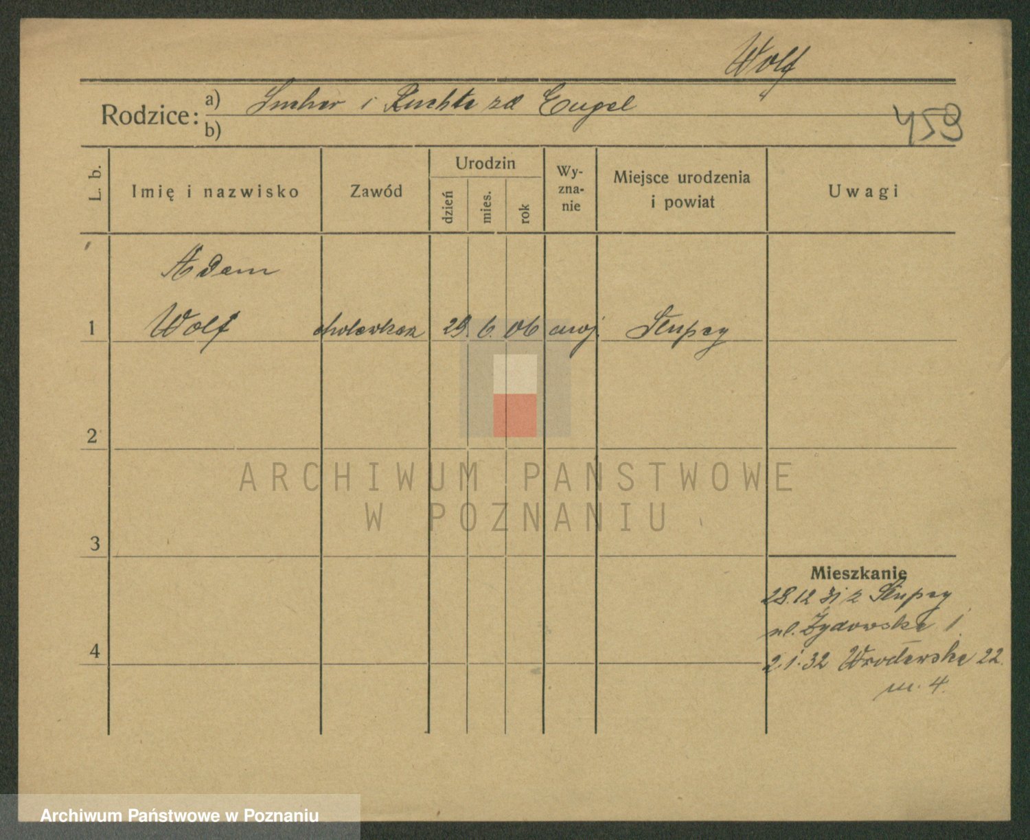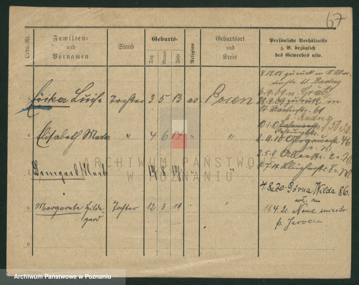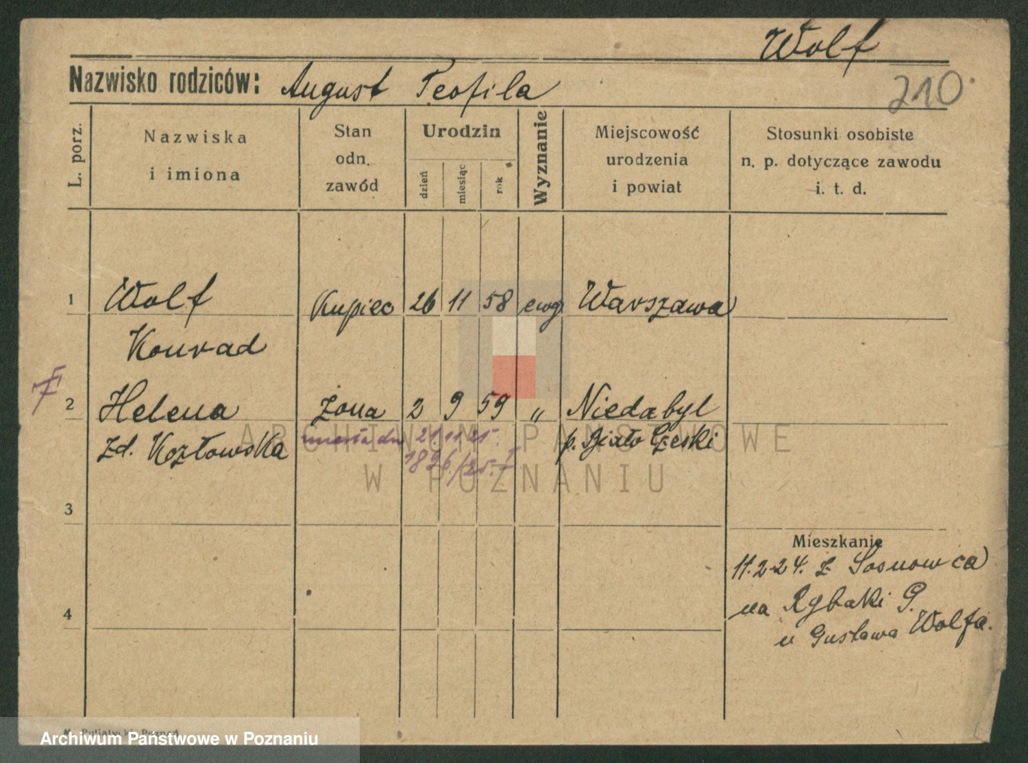 Podgląd karty osobowej dostępny jest po kliknięciu na nazwisko lub ikonkę karty. Można dokonywać powiększenia (ikony na górze) lub przechodzić między kolejnymi skanami (strzałki po bokach).