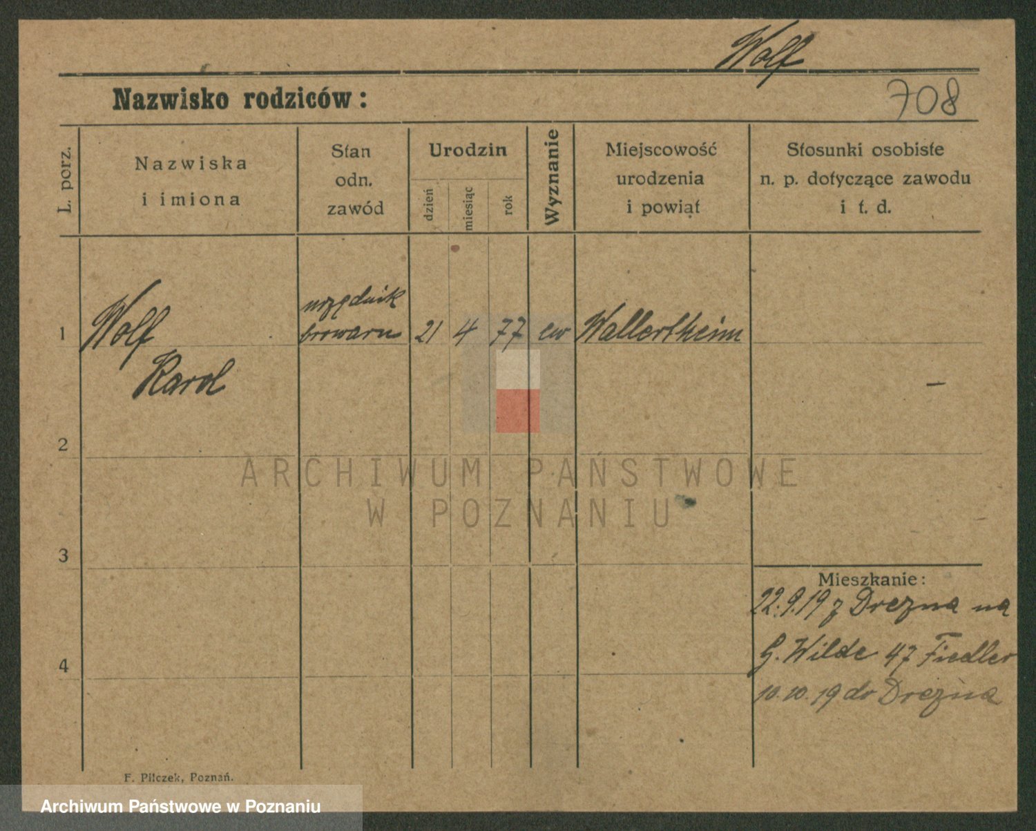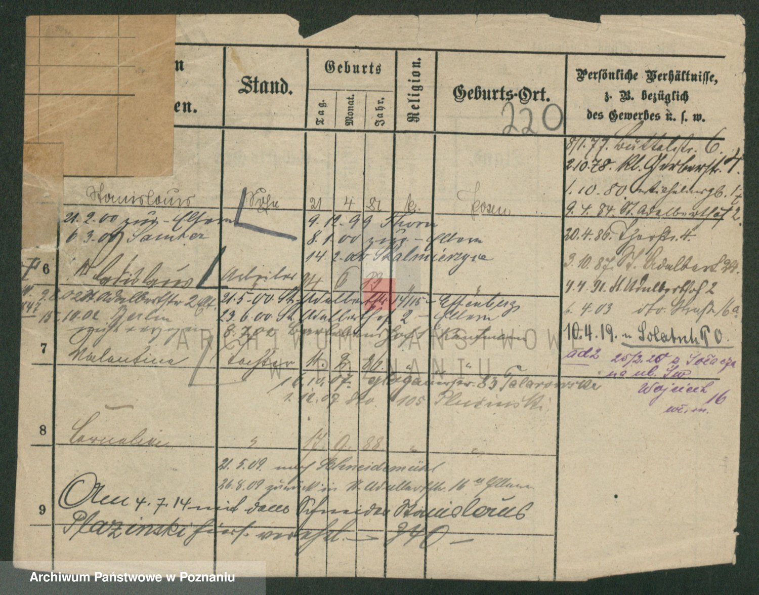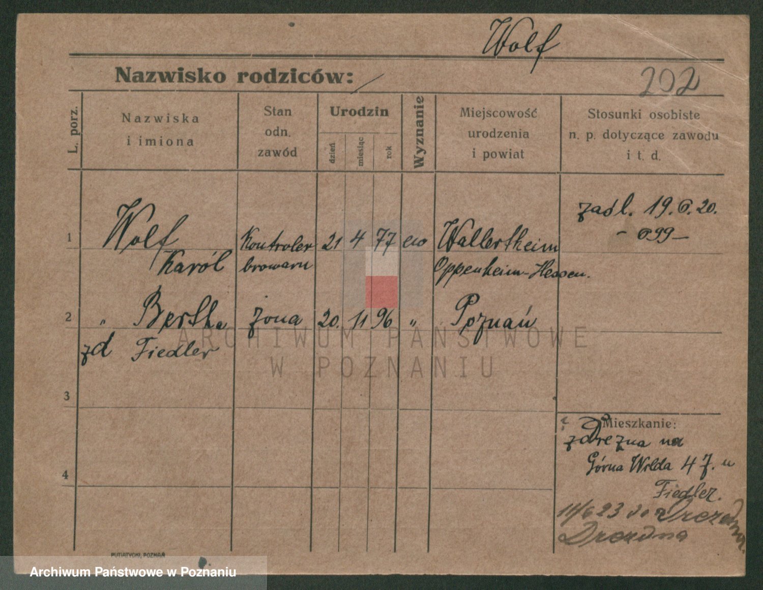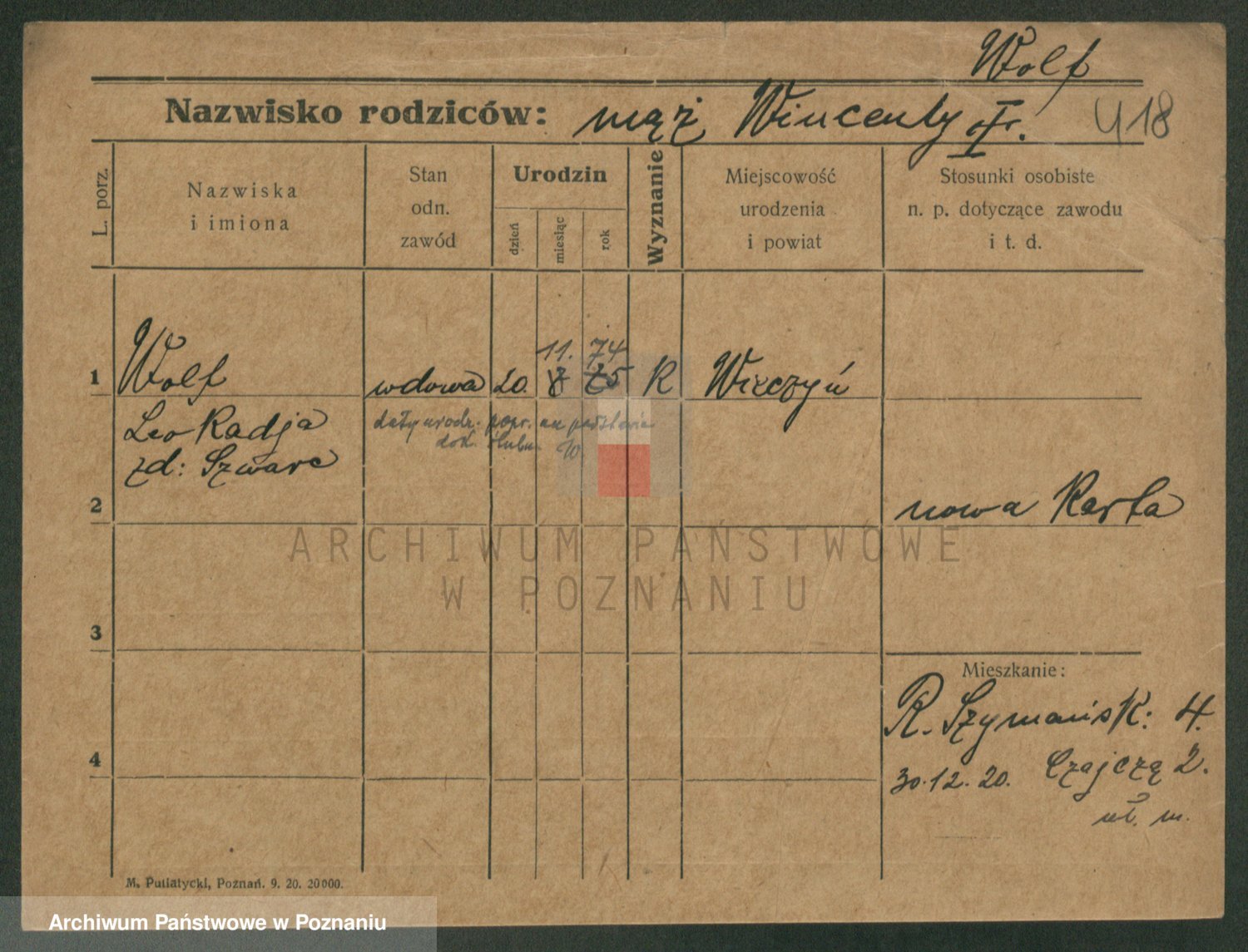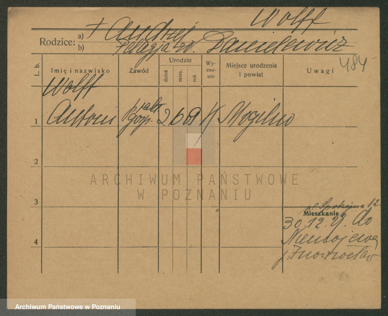 Podgląd karty osobowej dostępny jest po kliknięciu na nazwisko lub ikonkę karty. Można dokonywać powiększenia (ikony na górze) lub przechodzić między kolejnymi skanami (strzałki po bokach).