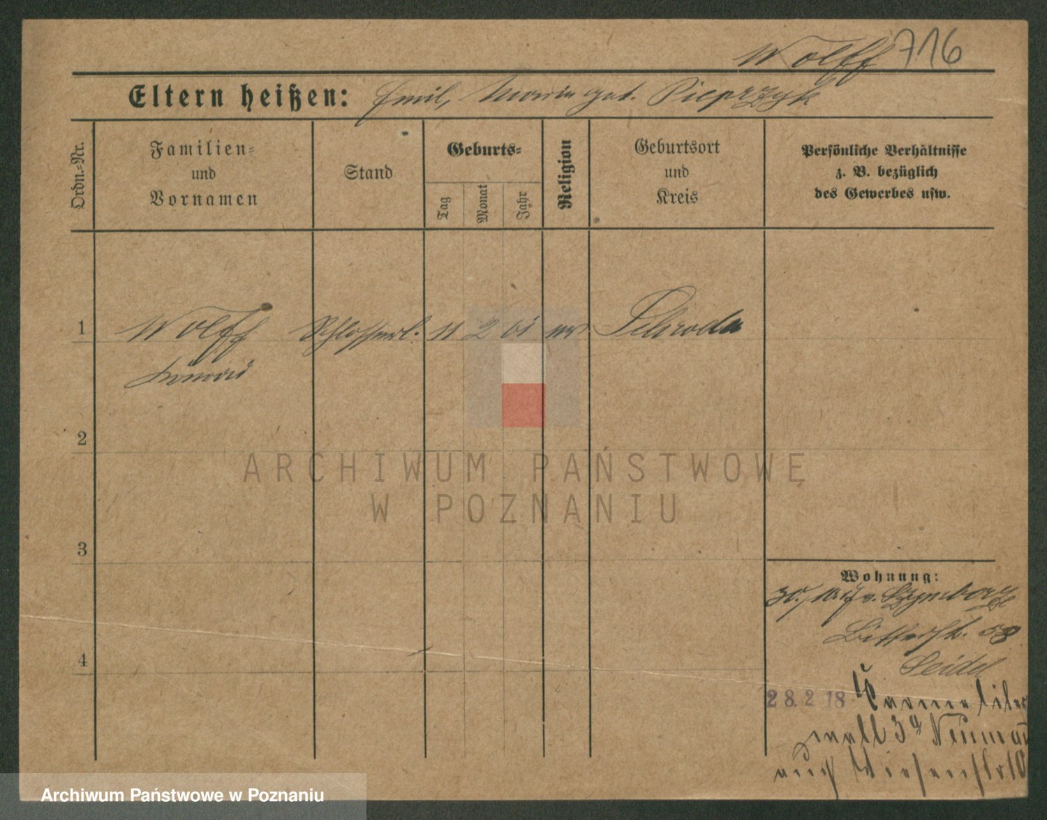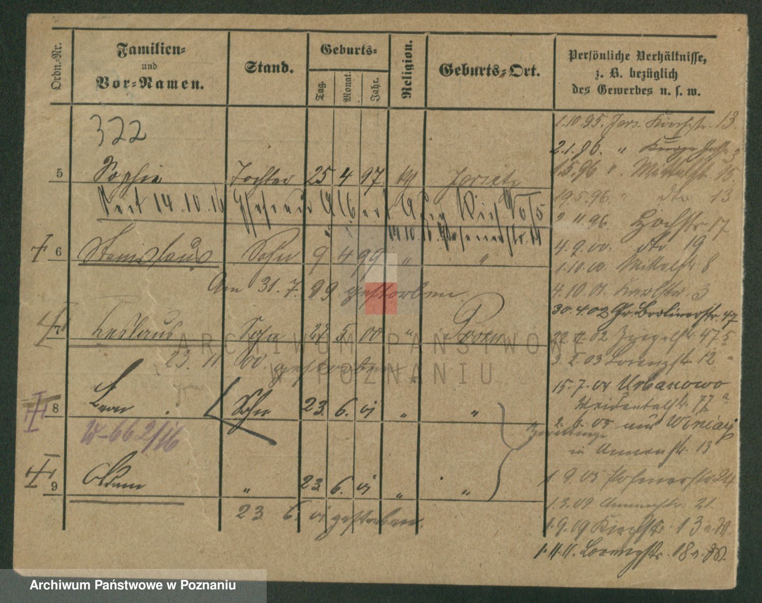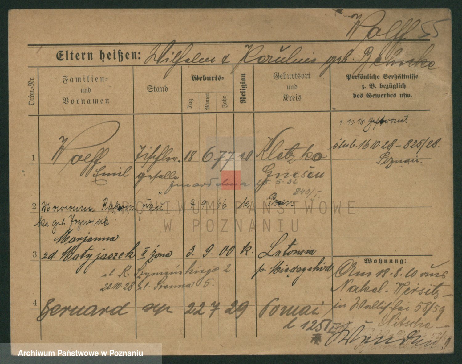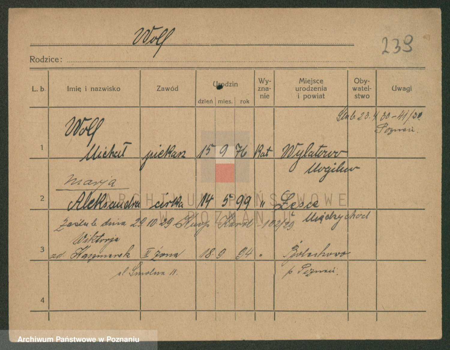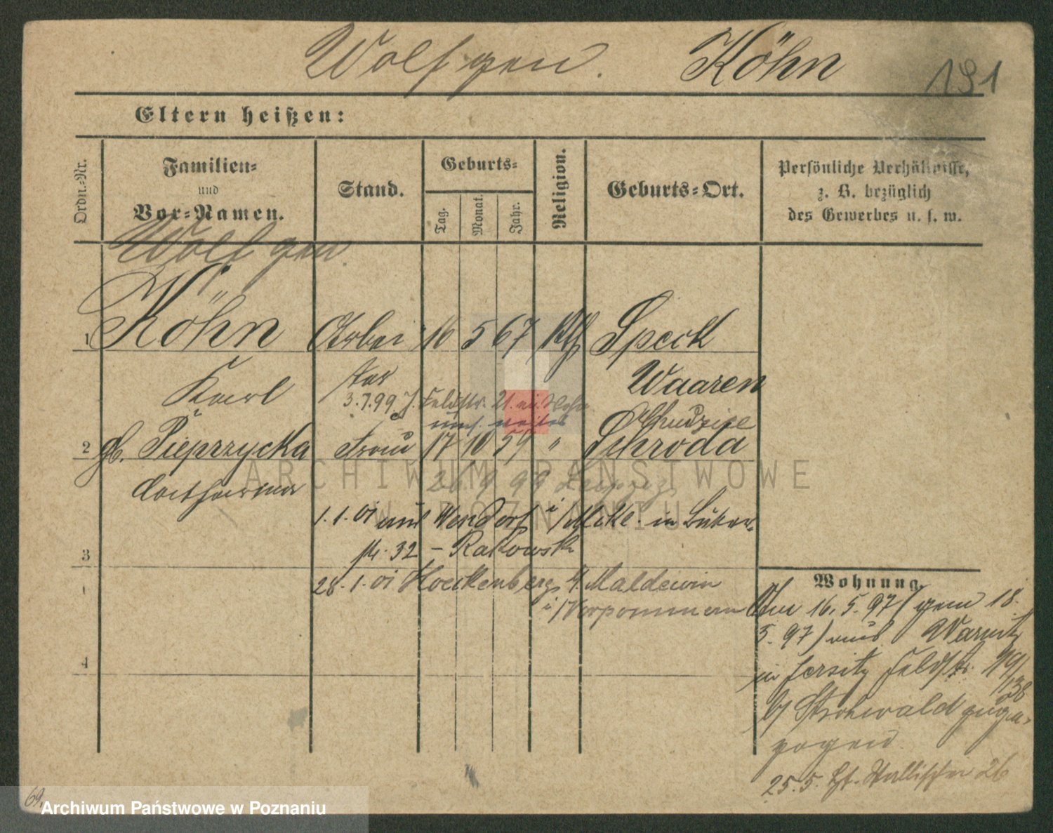 Podgląd karty osobowej dostępny jest po kliknięciu na nazwisko lub ikonkę karty. Można dokonywać powiększenia (ikony na górze) lub przechodzić między kolejnymi skanami (strzałki po bokach).