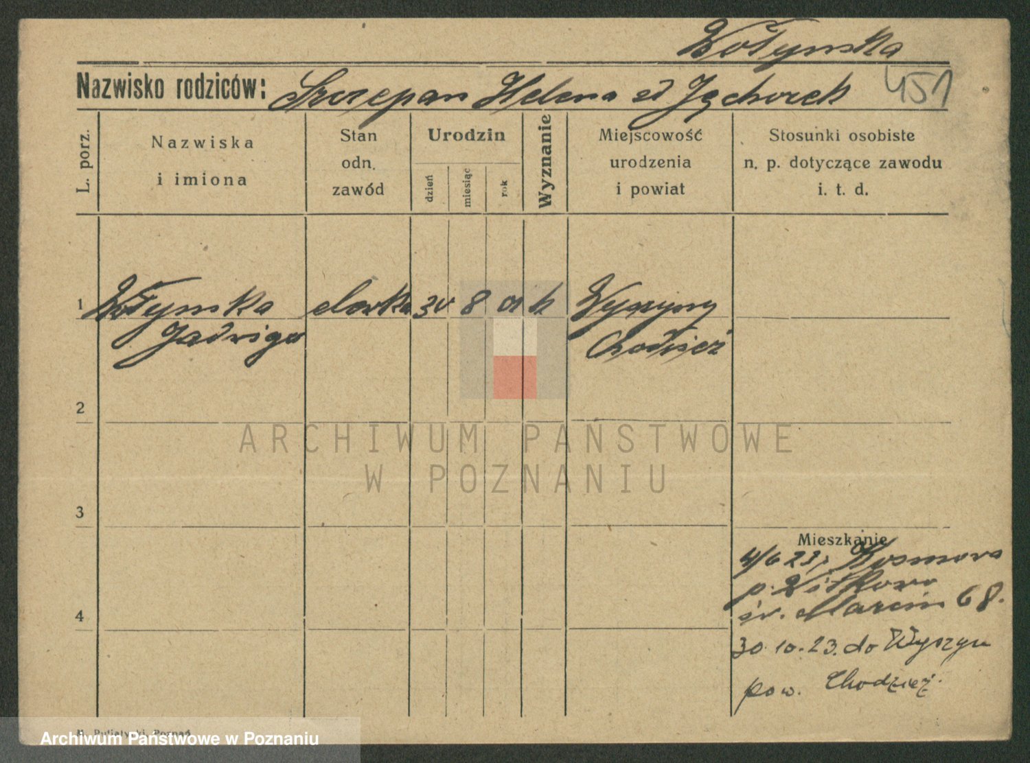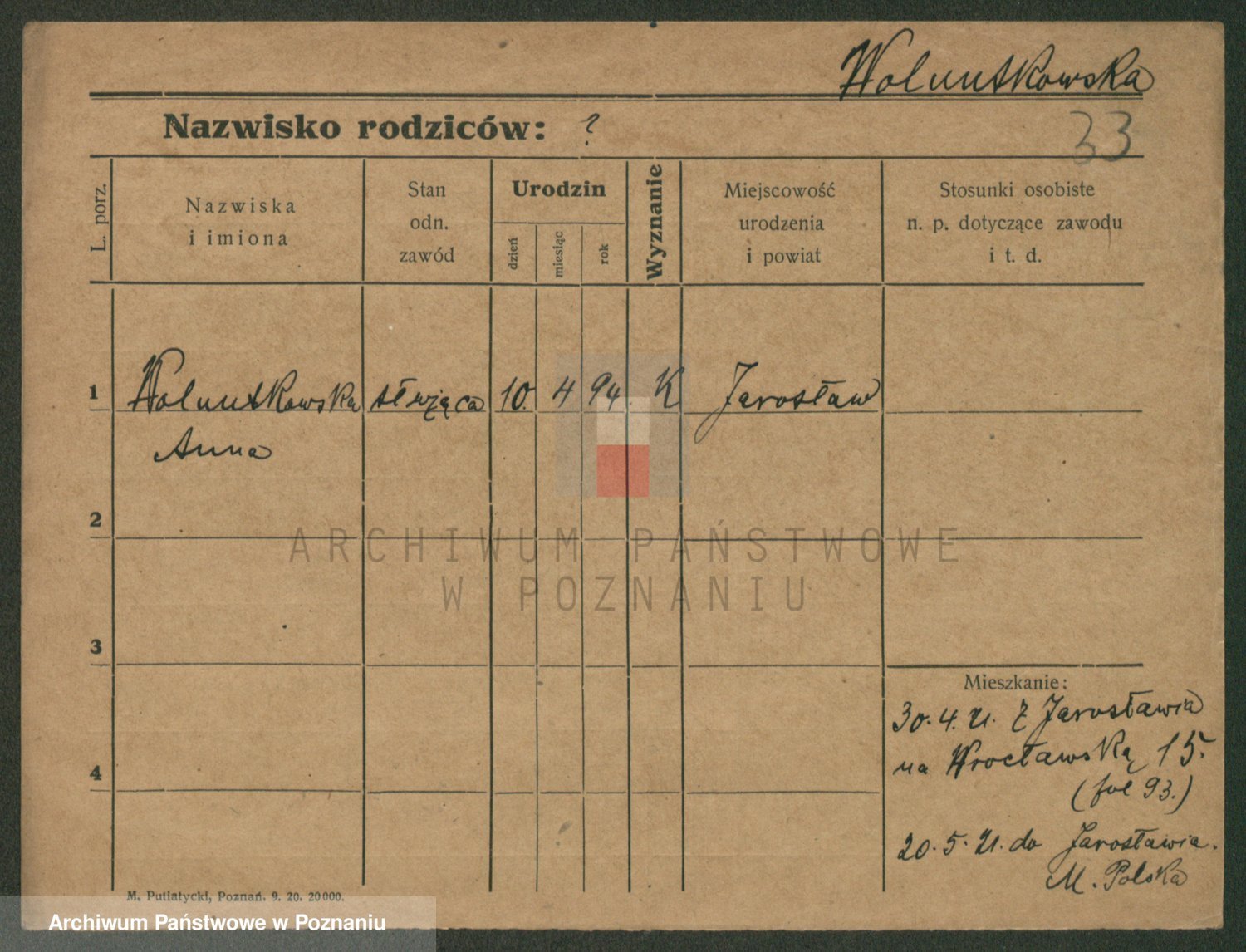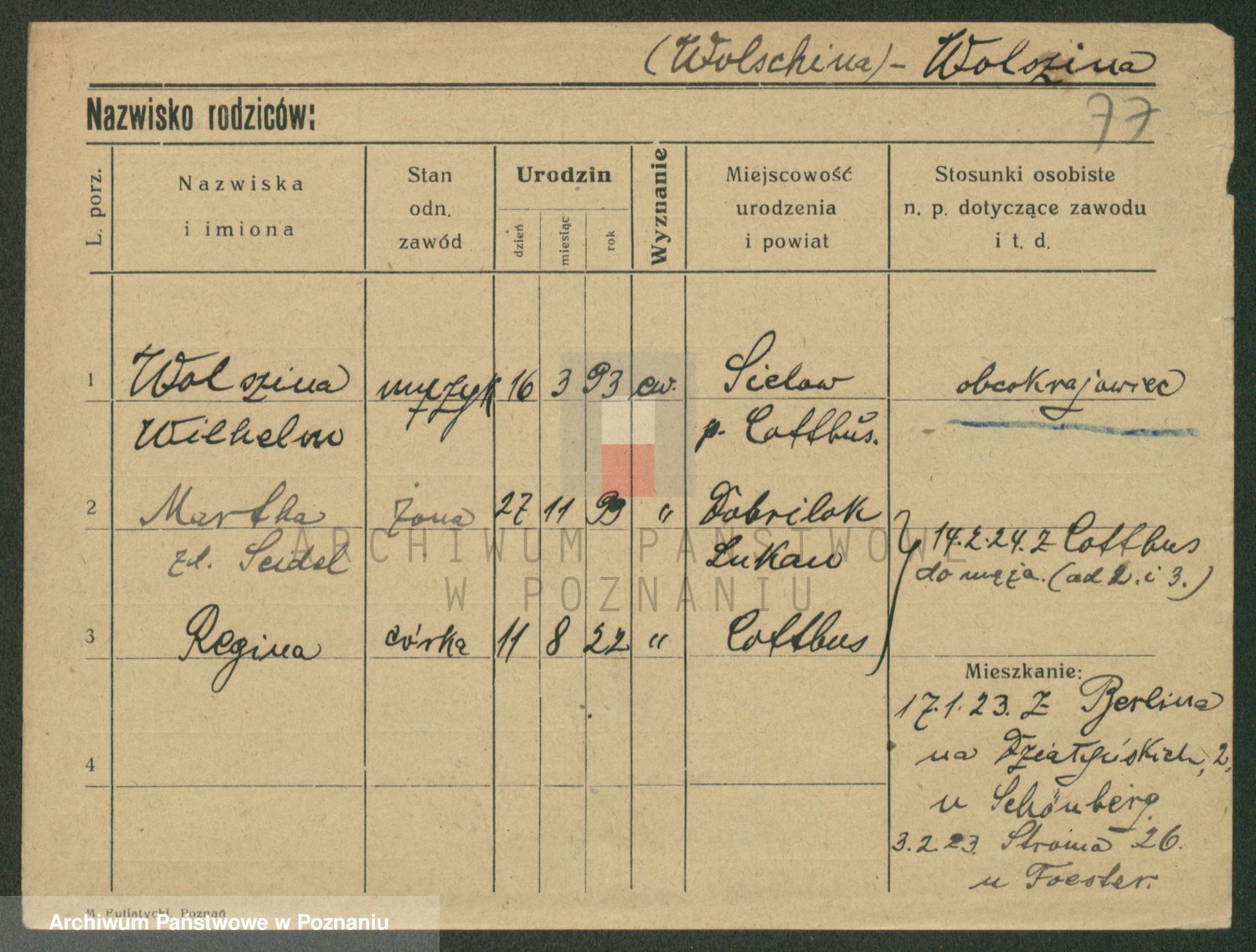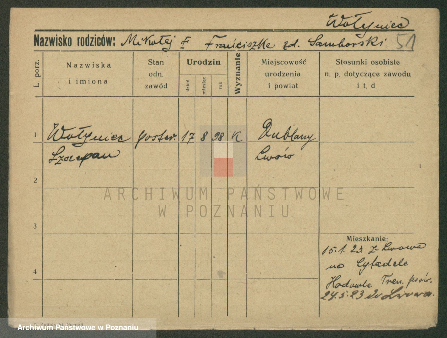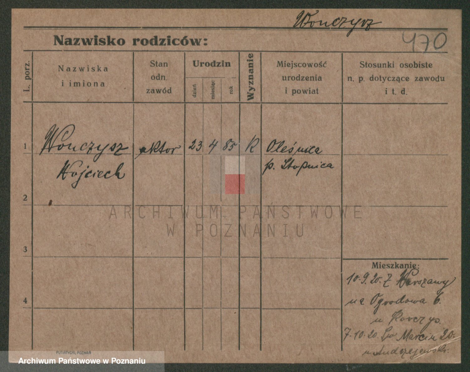 Podgląd karty osobowej dostępny jest po kliknięciu na nazwisko lub ikonkę karty. Można dokonywać powiększenia (ikony na górze) lub przechodzić między kolejnymi skanami (strzałki po bokach).