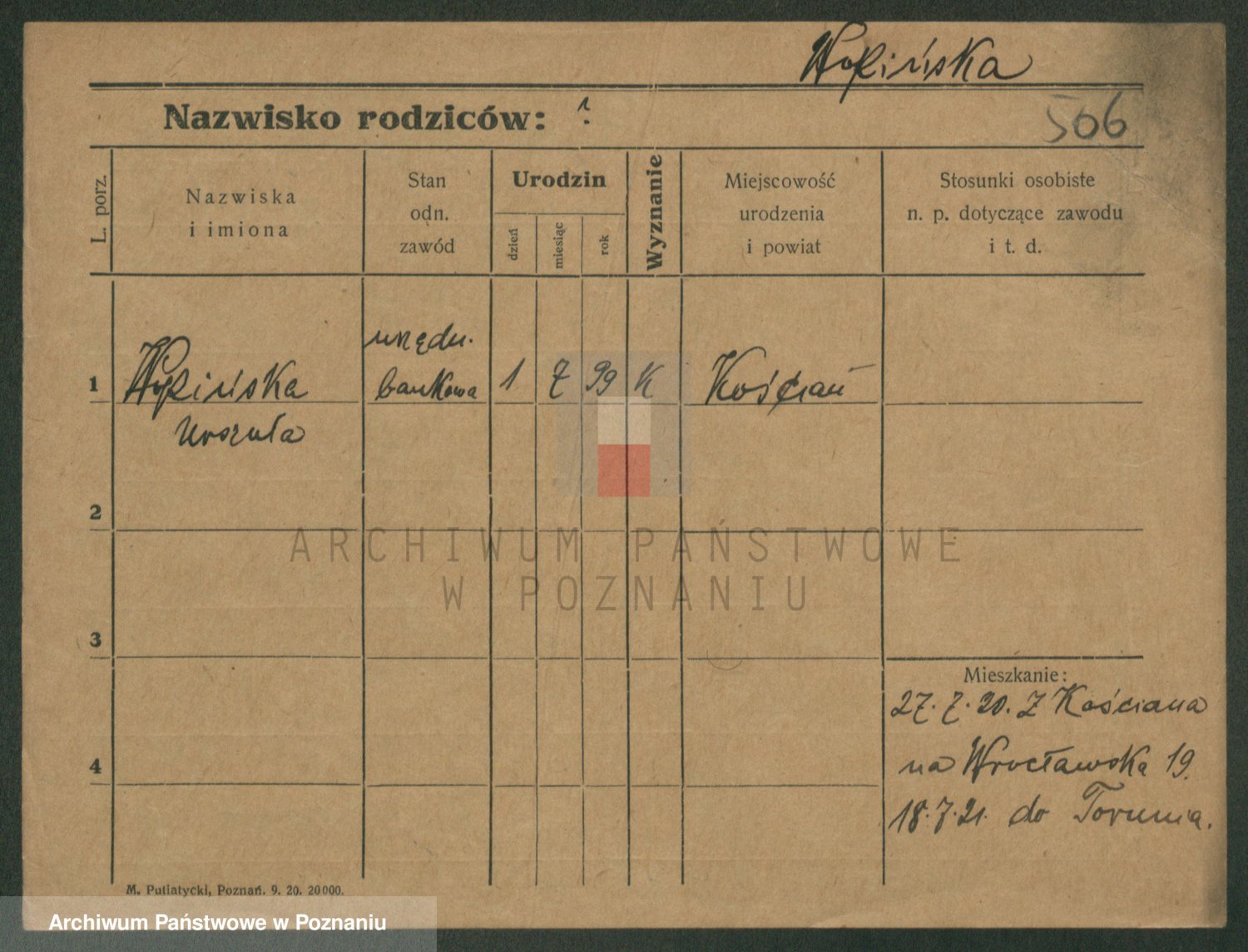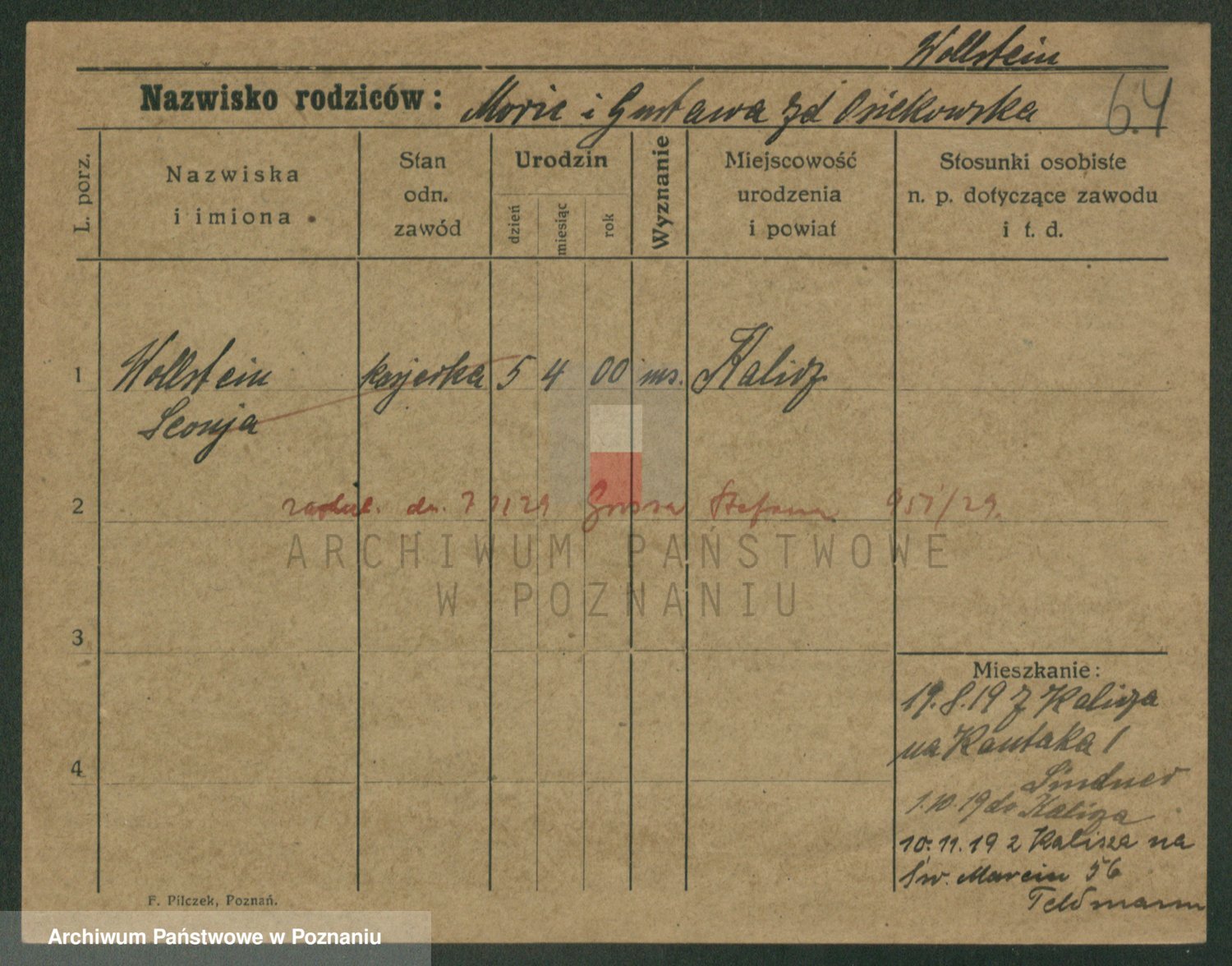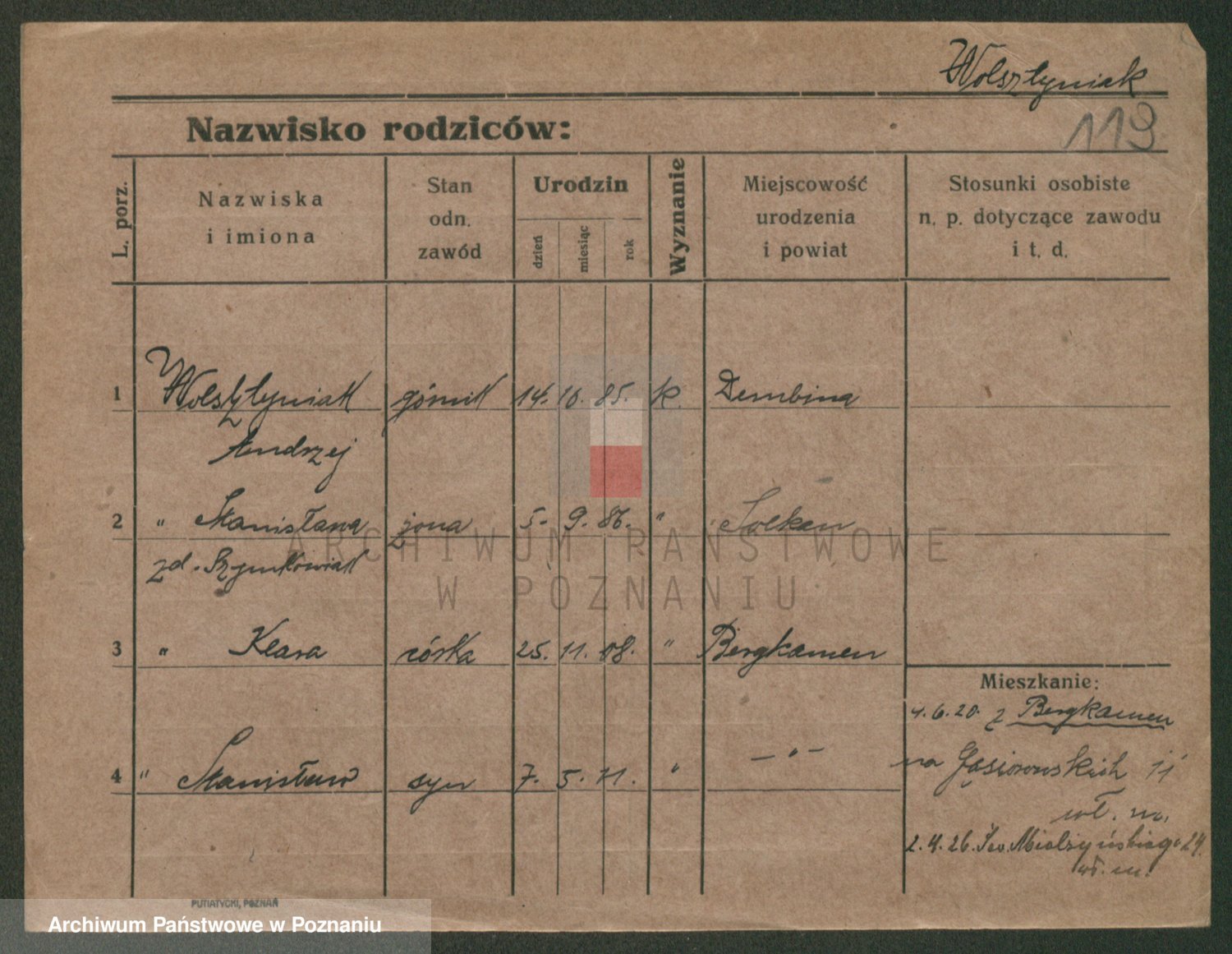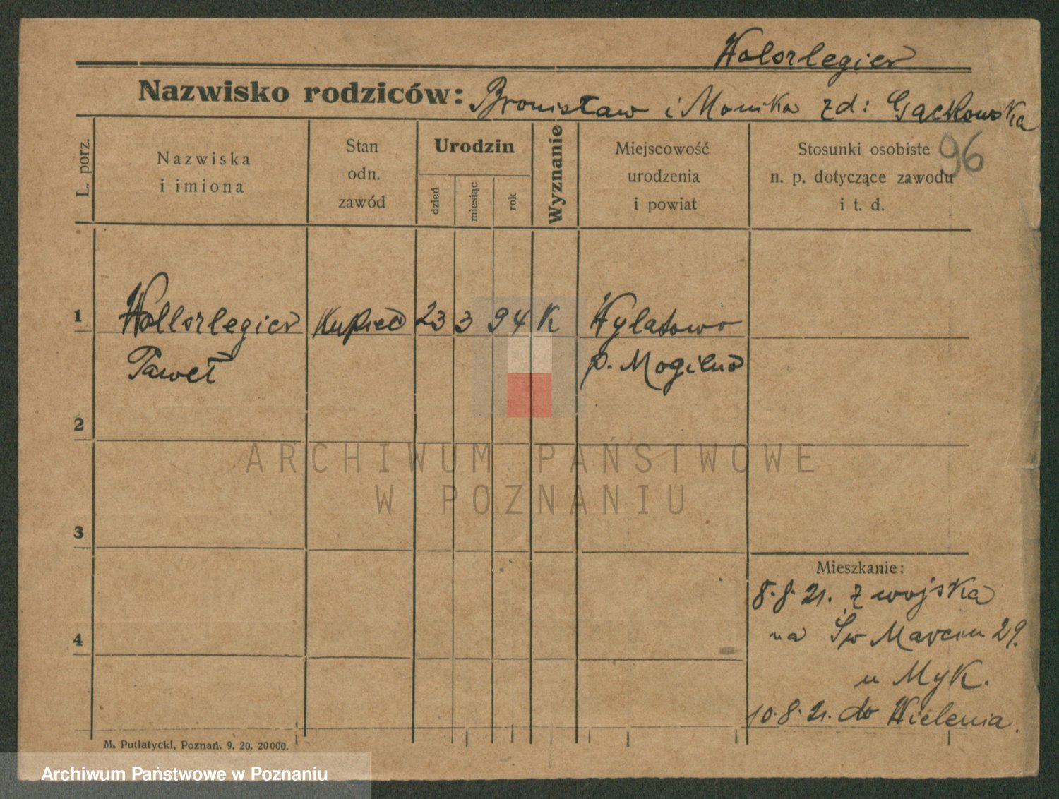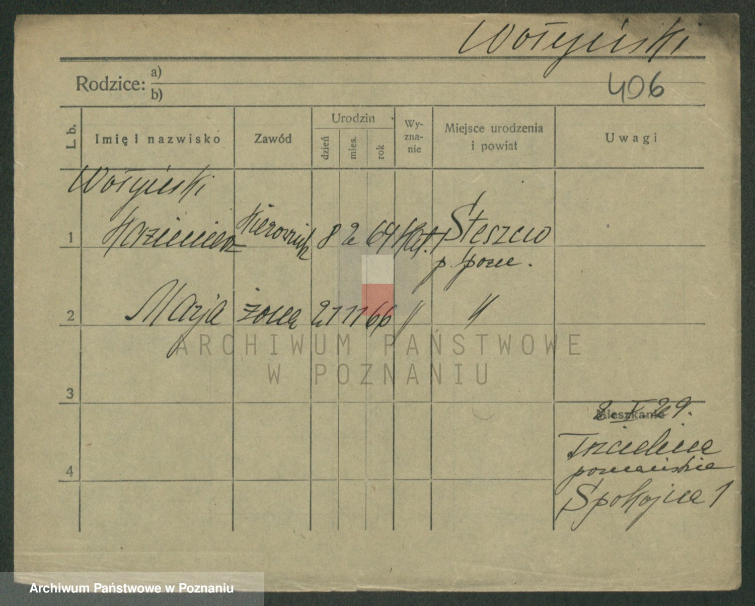 Podgląd karty osobowej dostępny jest po kliknięciu na nazwisko lub ikonkę karty. Można dokonywać powiększenia (ikony na górze) lub przechodzić między kolejnymi skanami (strzałki po bokach).