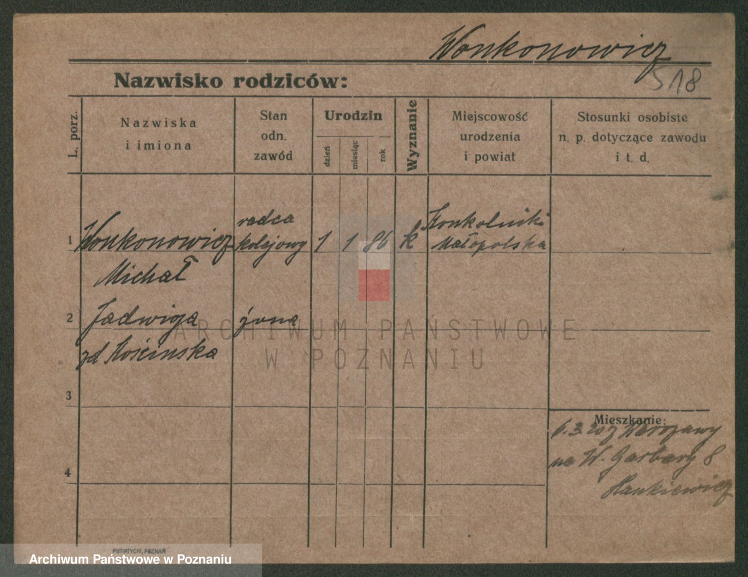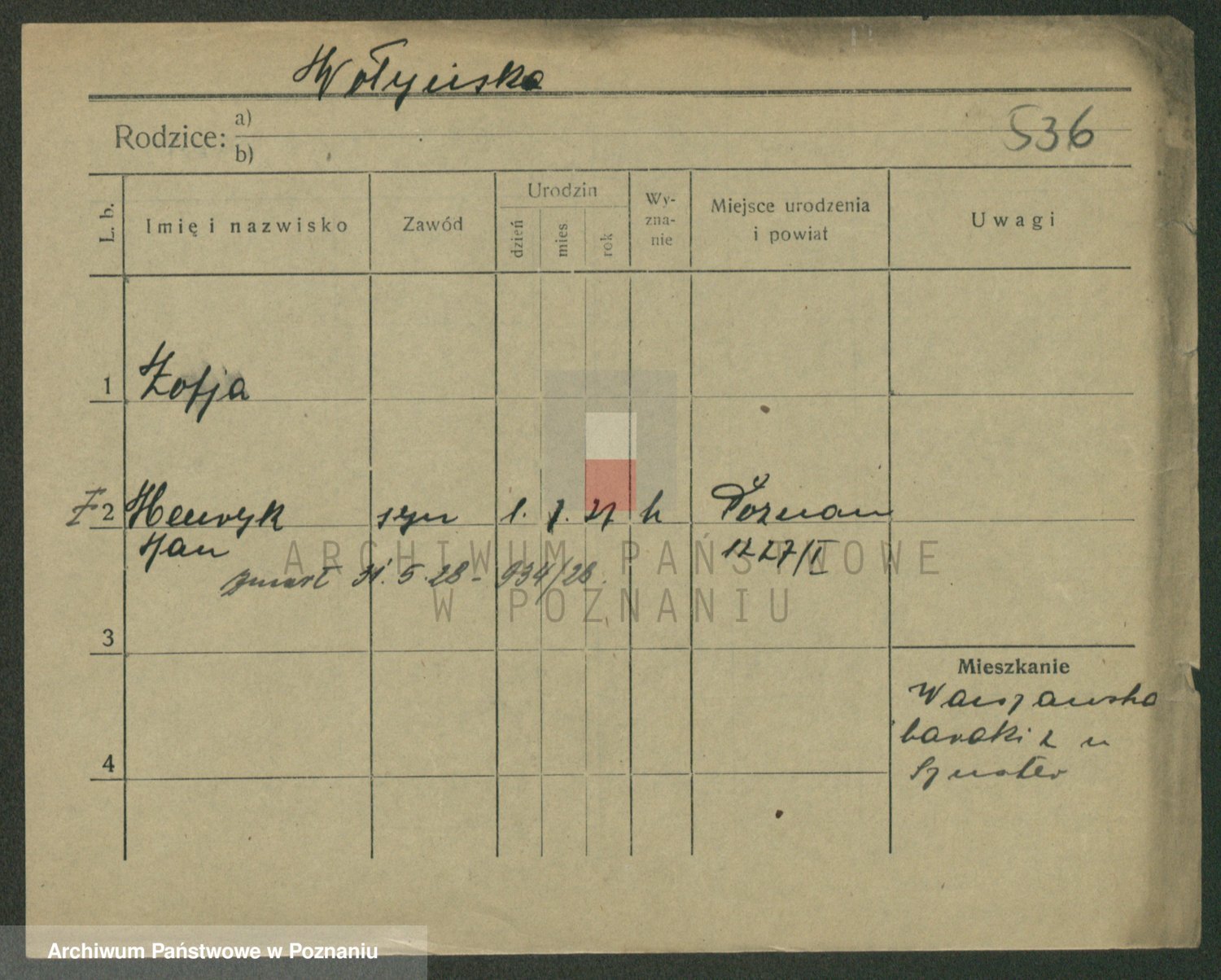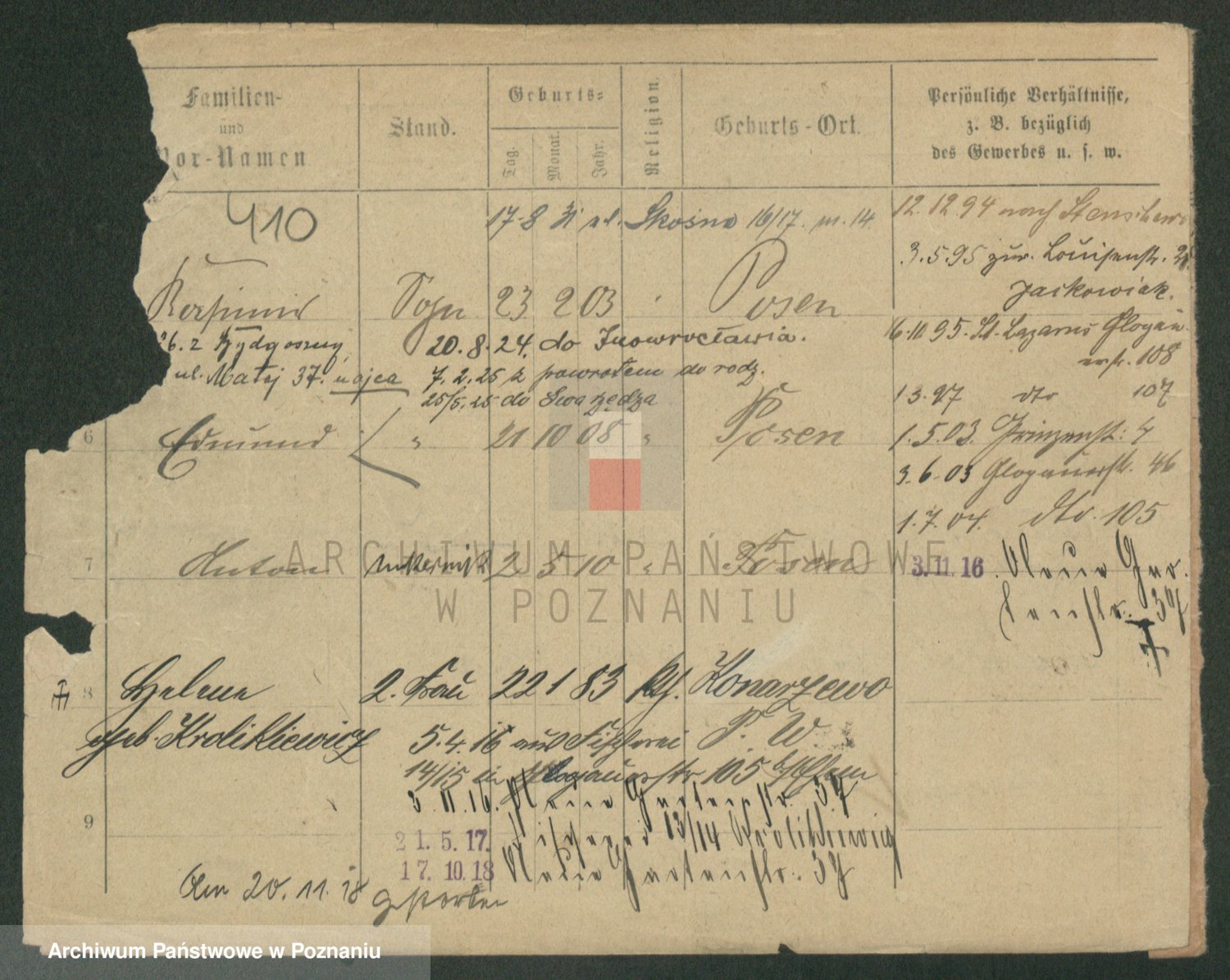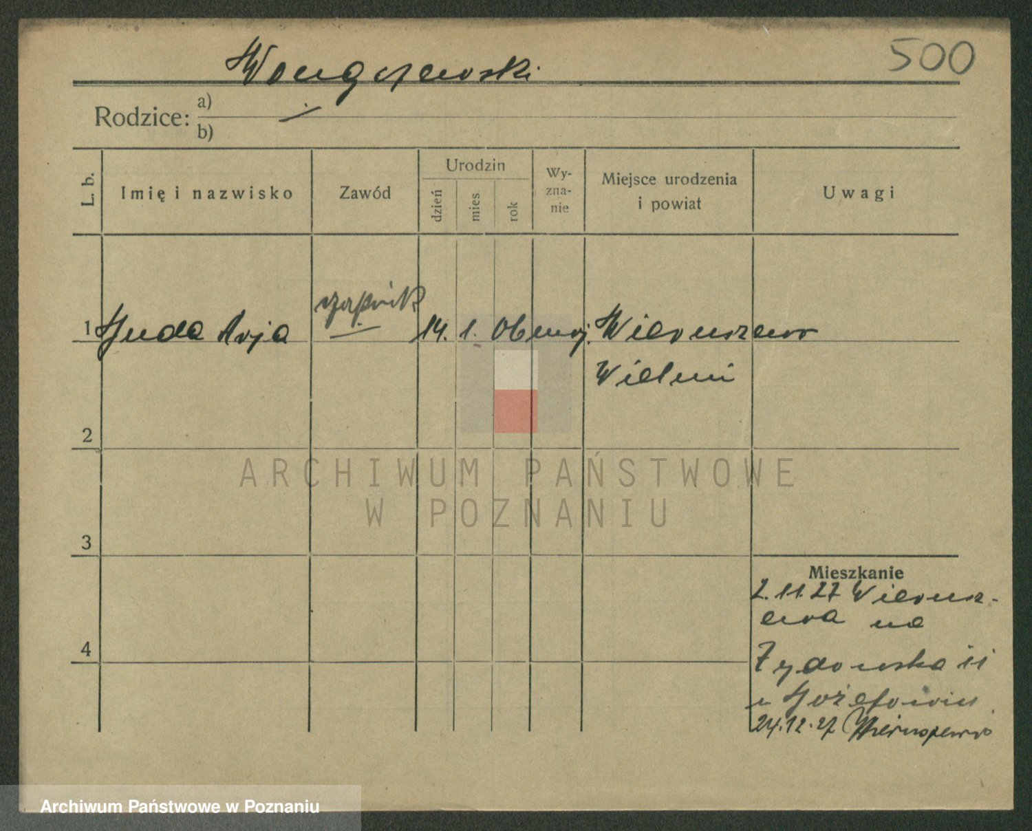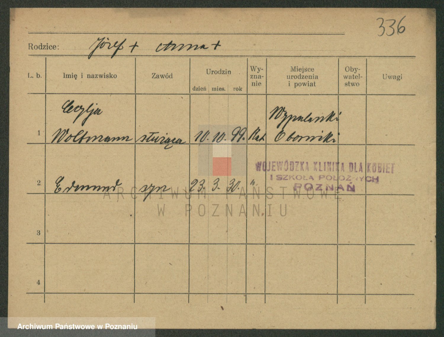 Podgląd karty osobowej dostępny jest po kliknięciu na nazwisko lub ikonkę karty. Można dokonywać powiększenia (ikony na górze) lub przechodzić między kolejnymi skanami (strzałki po bokach).
