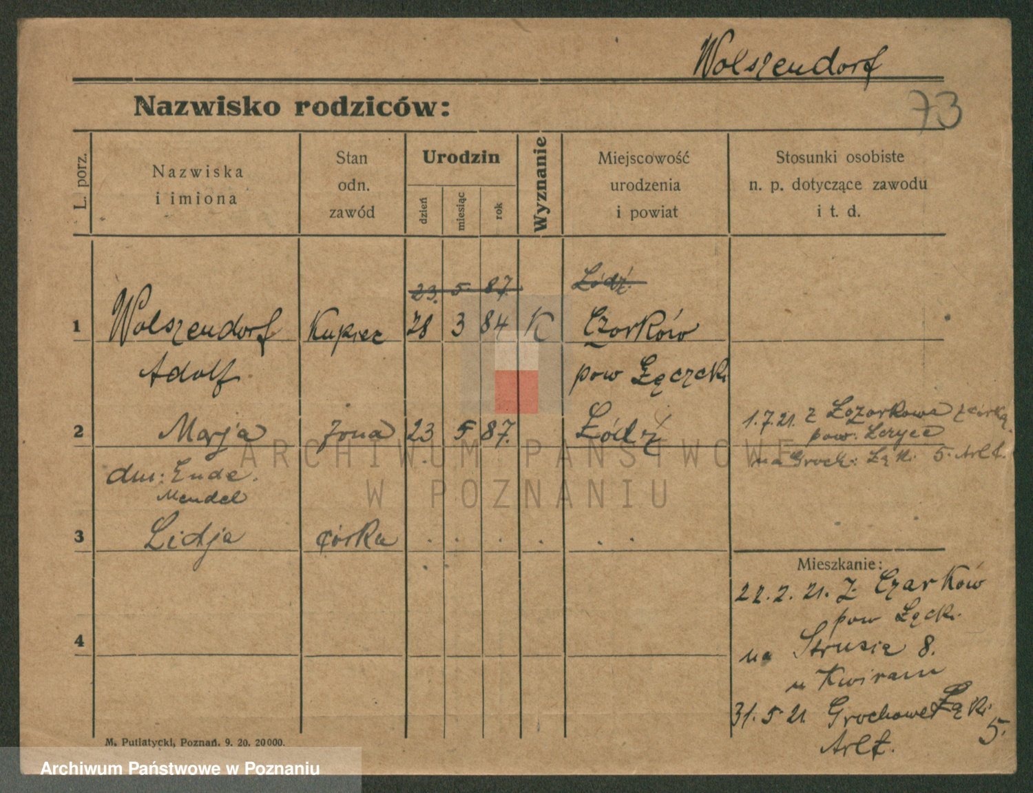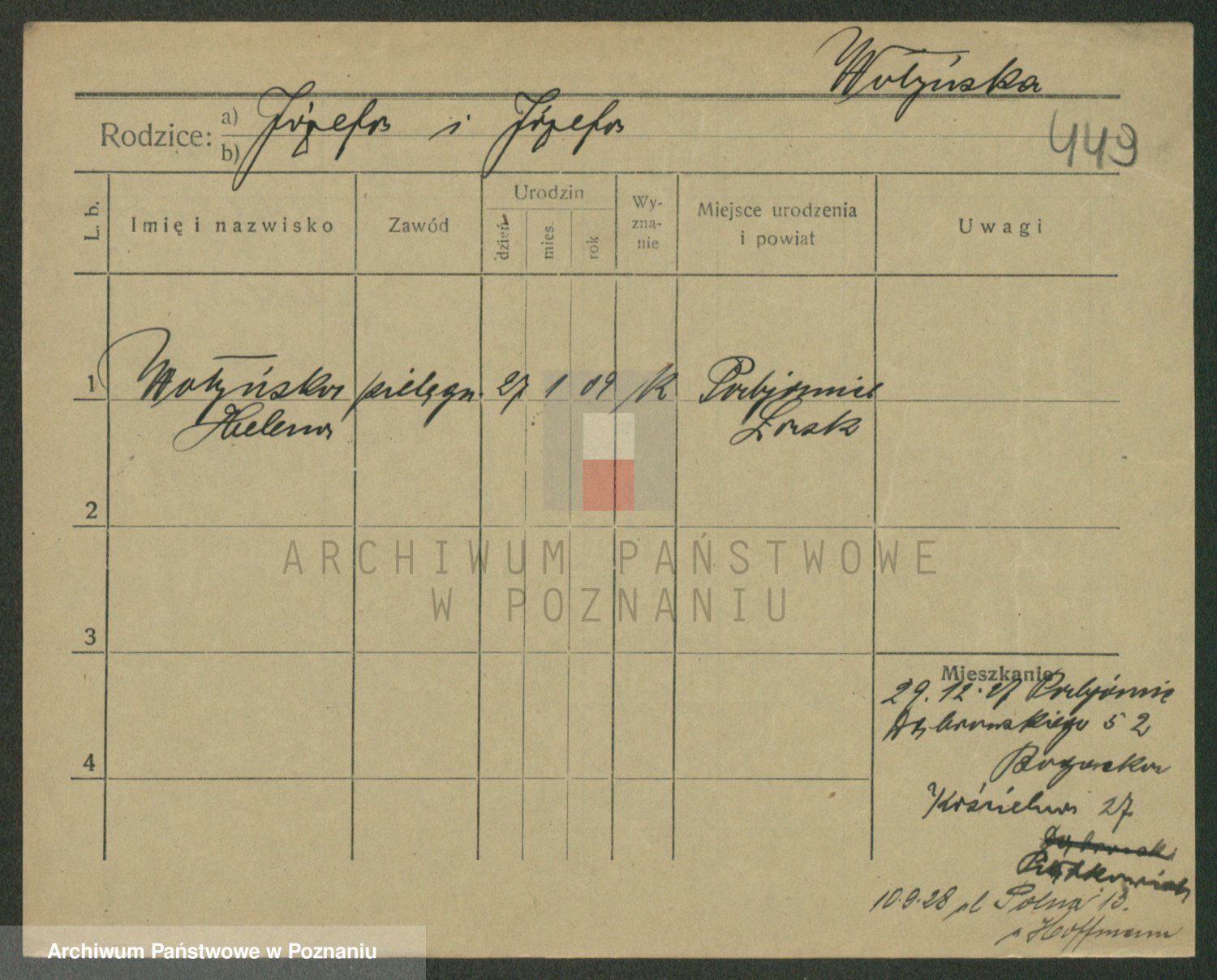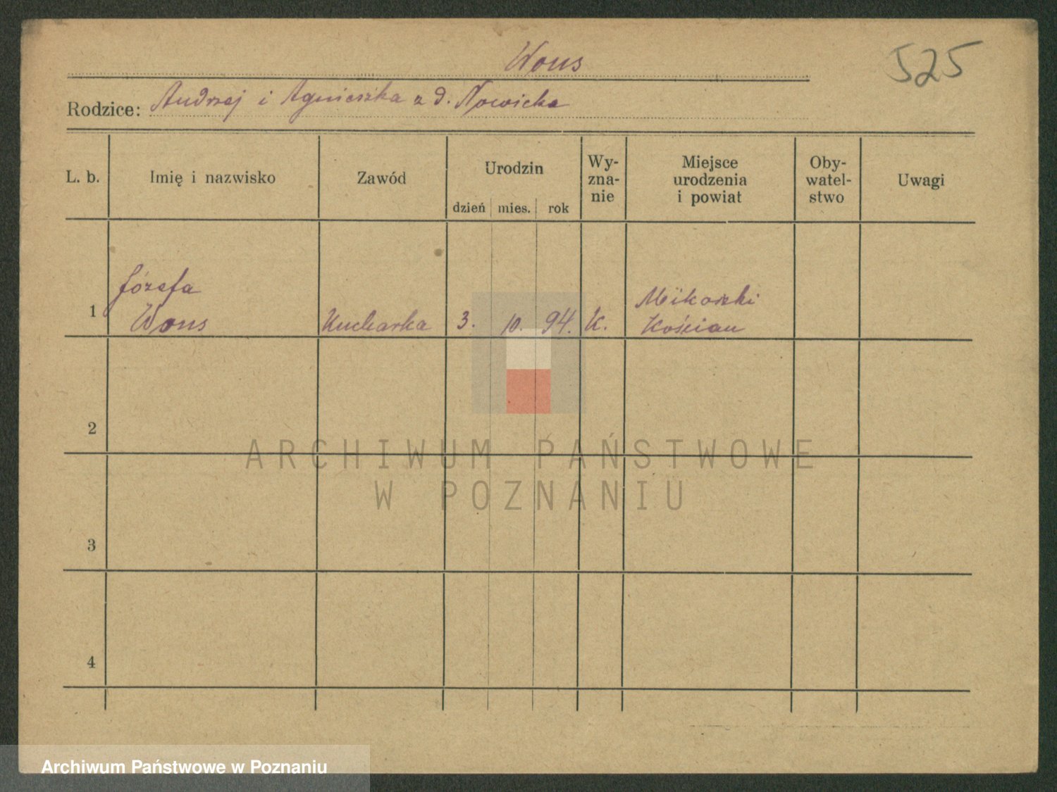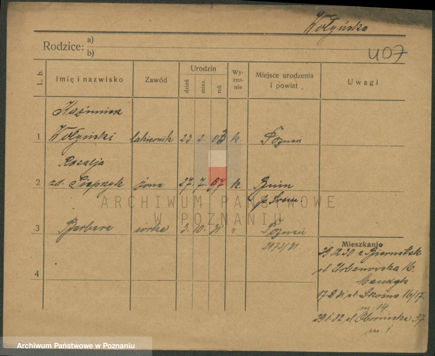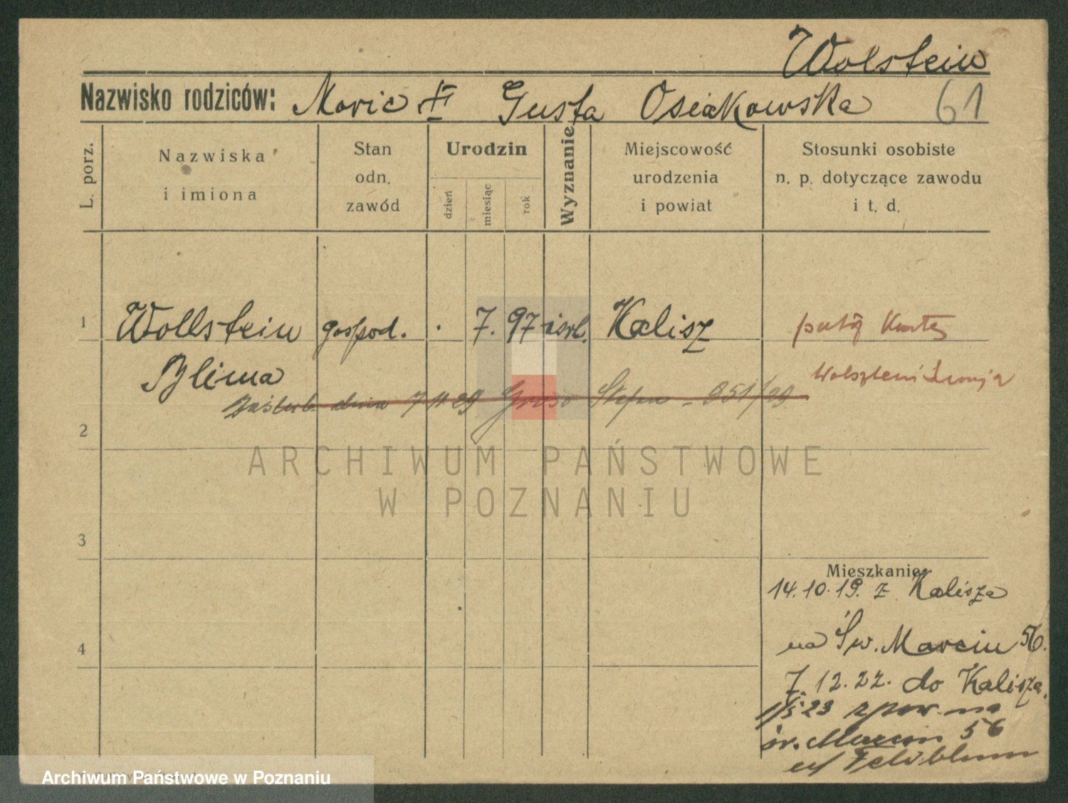 Podgląd karty osobowej dostępny jest po kliknięciu na nazwisko lub ikonkę karty. Można dokonywać powiększenia (ikony na górze) lub przechodzić między kolejnymi skanami (strzałki po bokach).