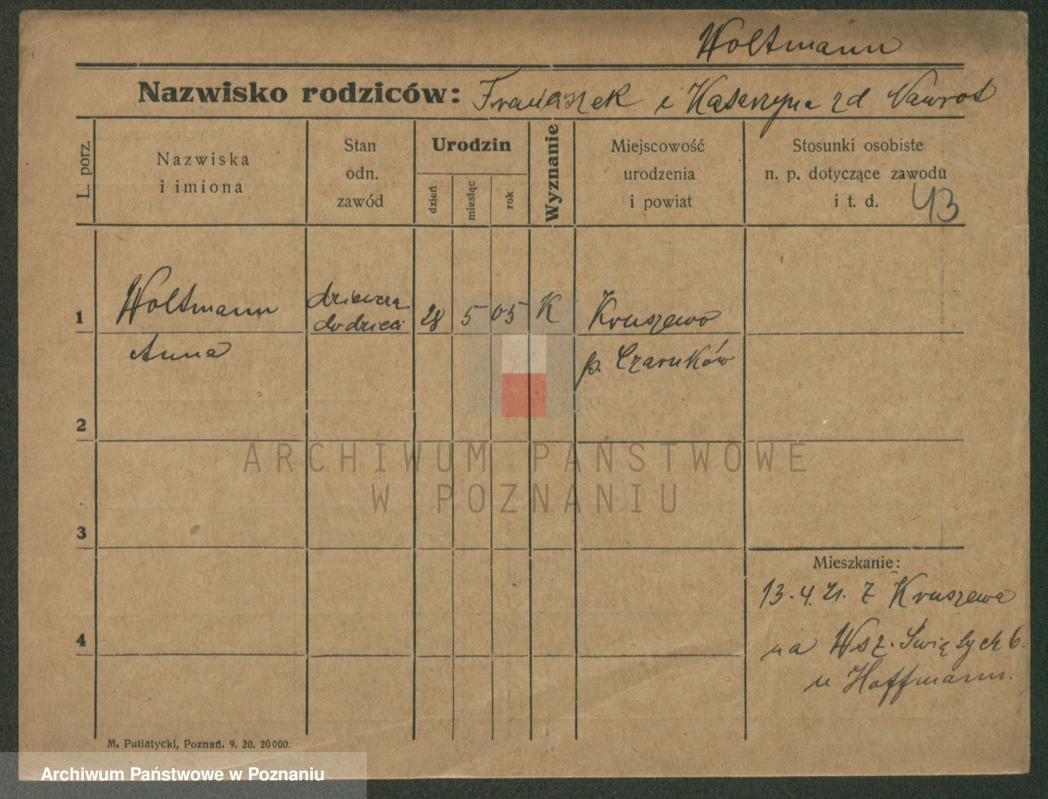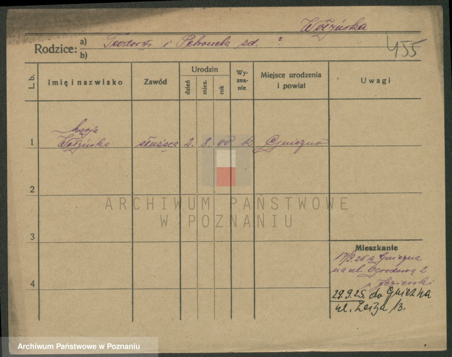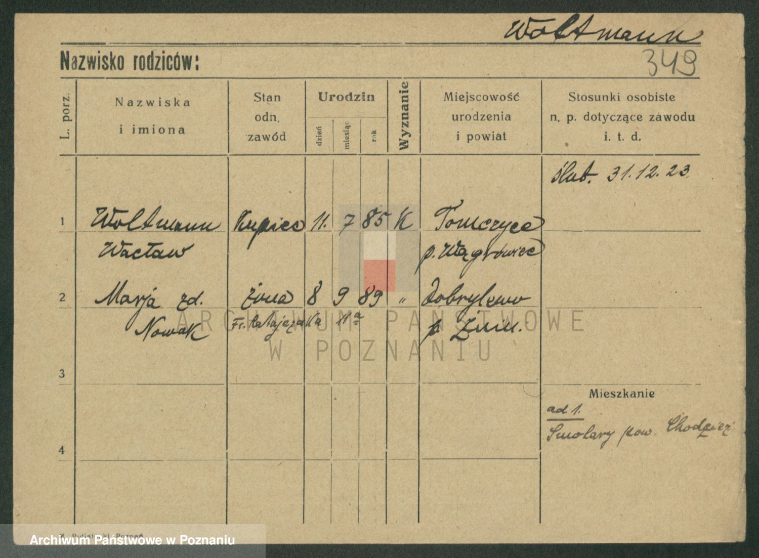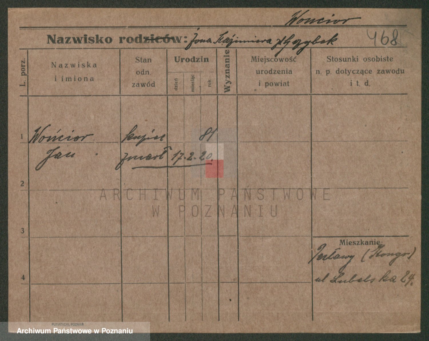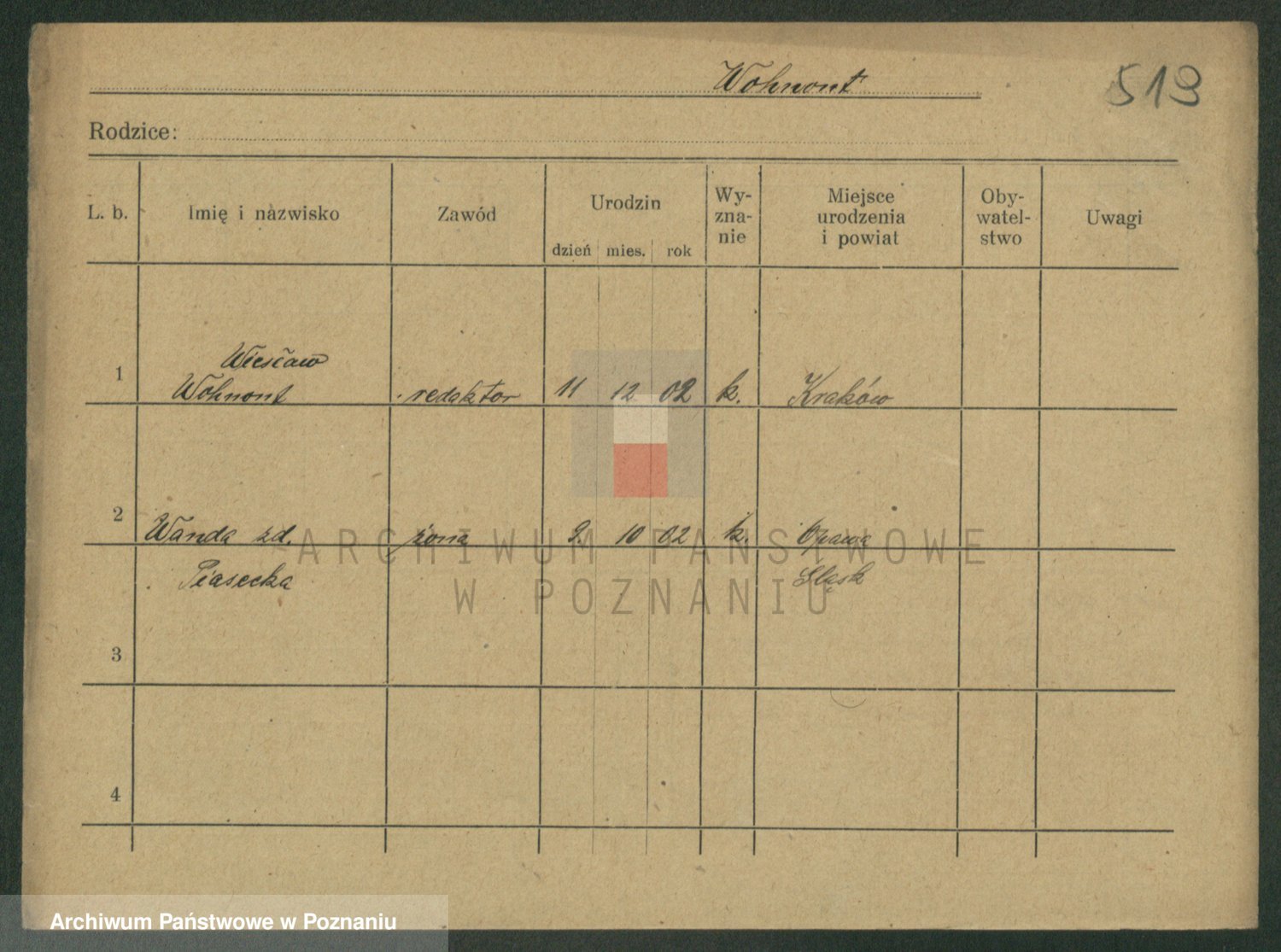 Podgląd karty osobowej dostępny jest po kliknięciu na nazwisko lub ikonkę karty. Można dokonywać powiększenia (ikony na górze) lub przechodzić między kolejnymi skanami (strzałki po bokach).