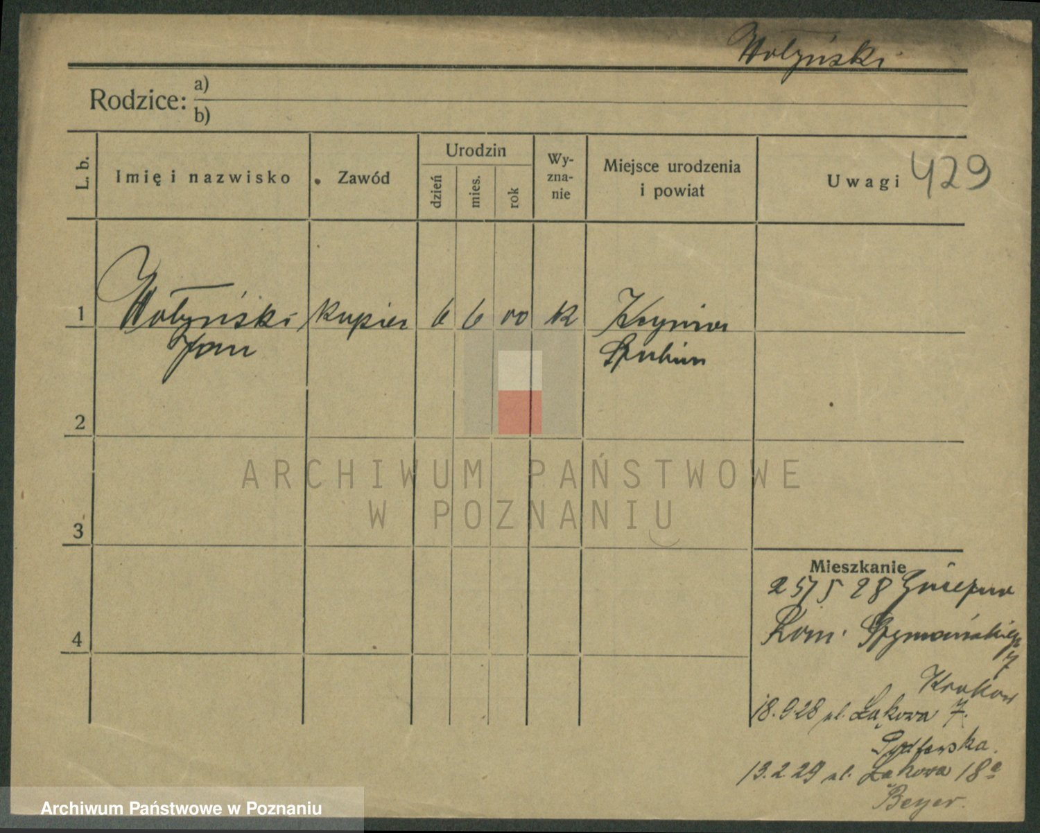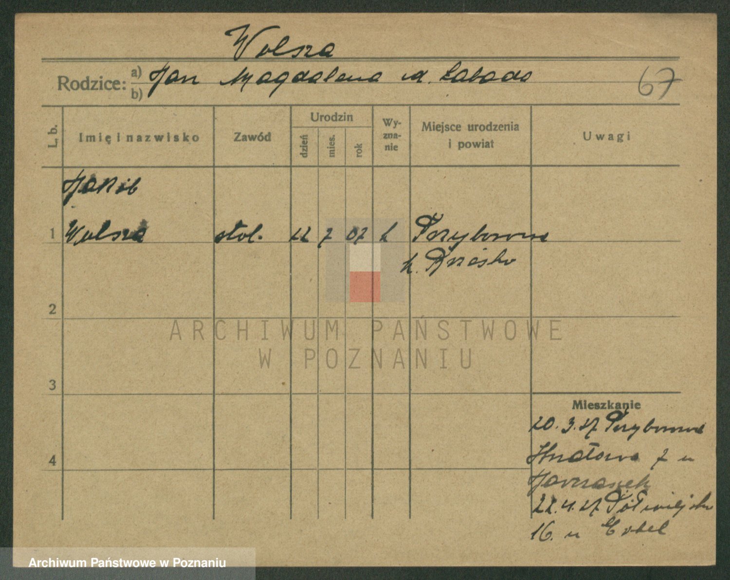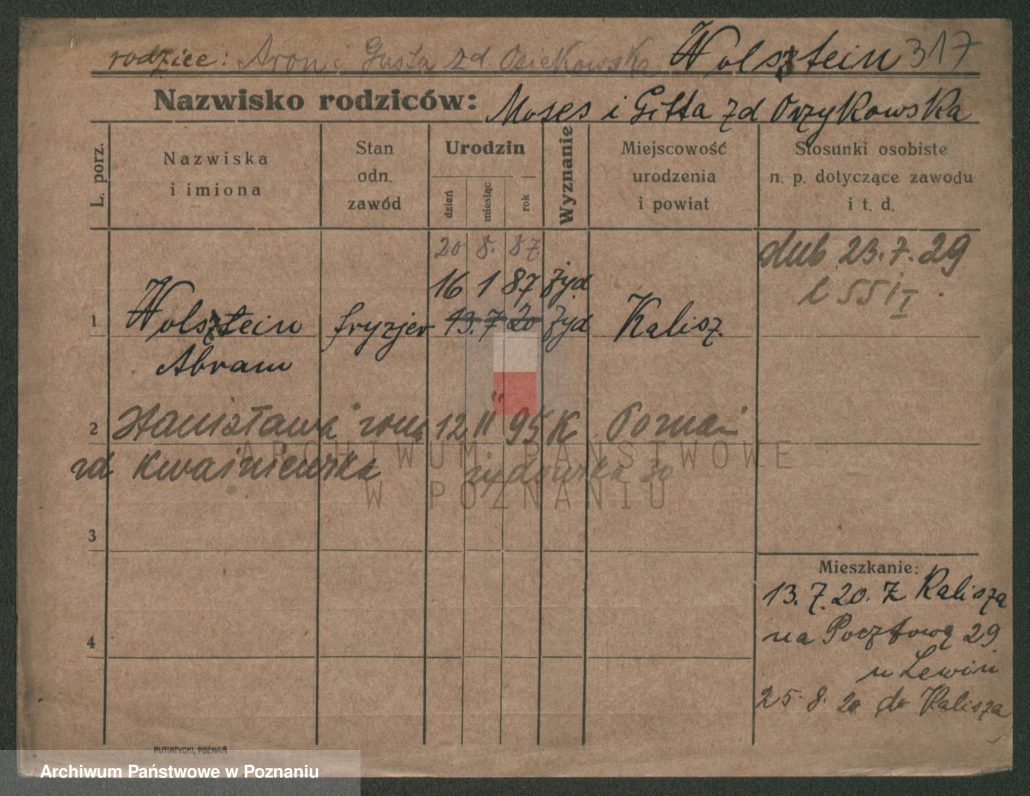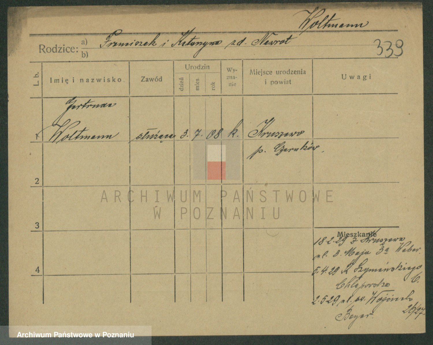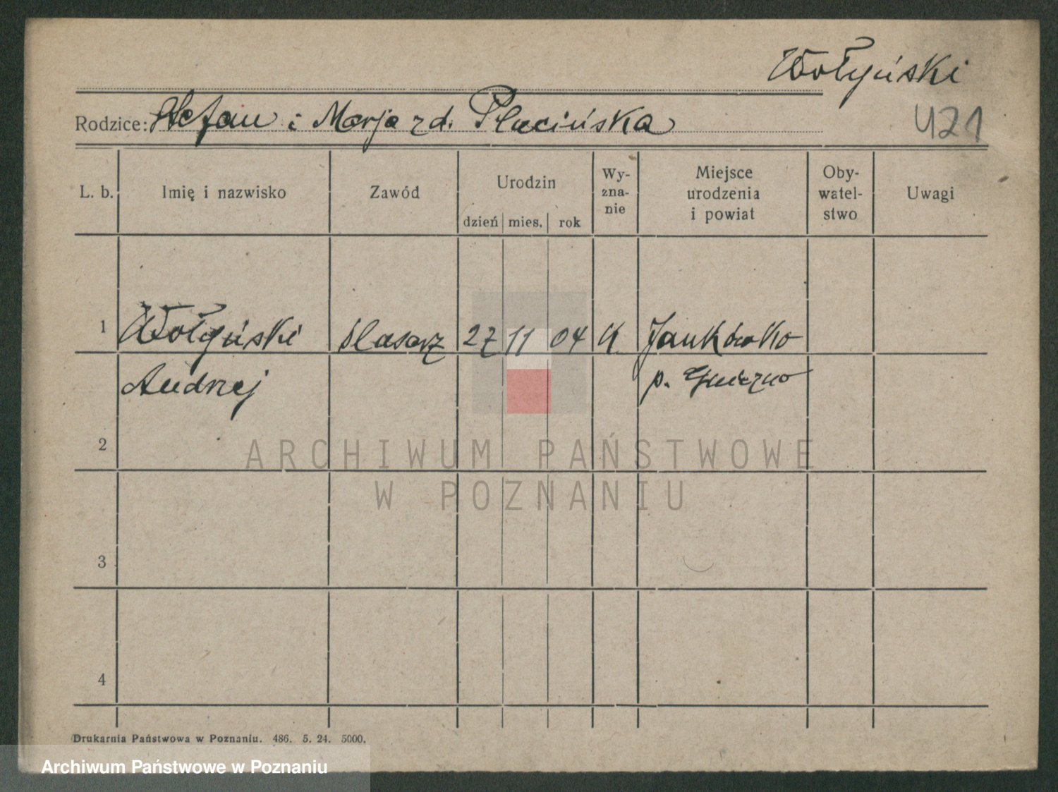Podgląd karty osobowej dostępny jest po kliknięciu na nazwisko lub ikonkę karty. Można dokonywać powiększenia (ikony na górze) lub przechodzić między kolejnymi skanami (strzałki po bokach).