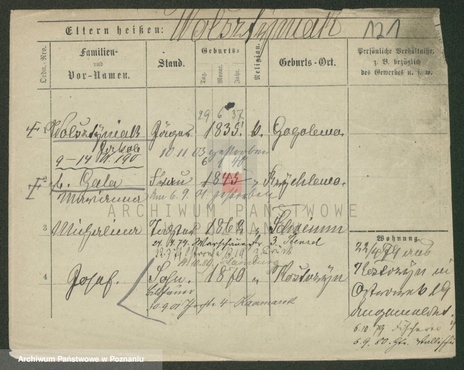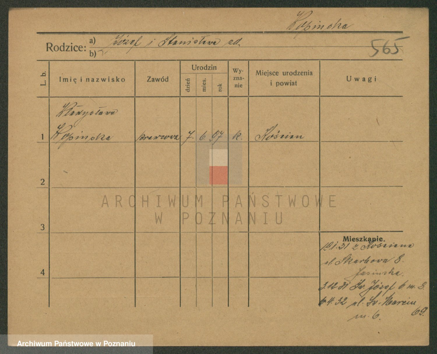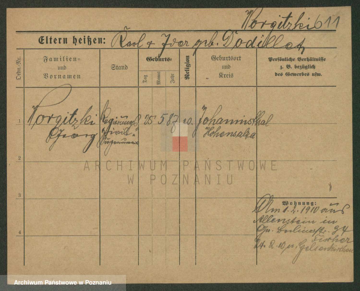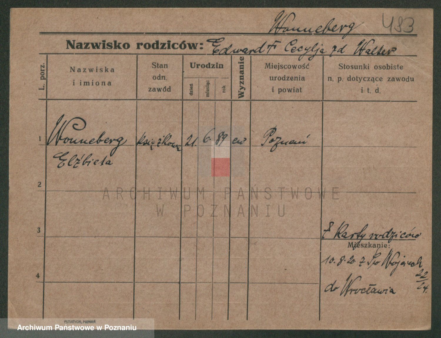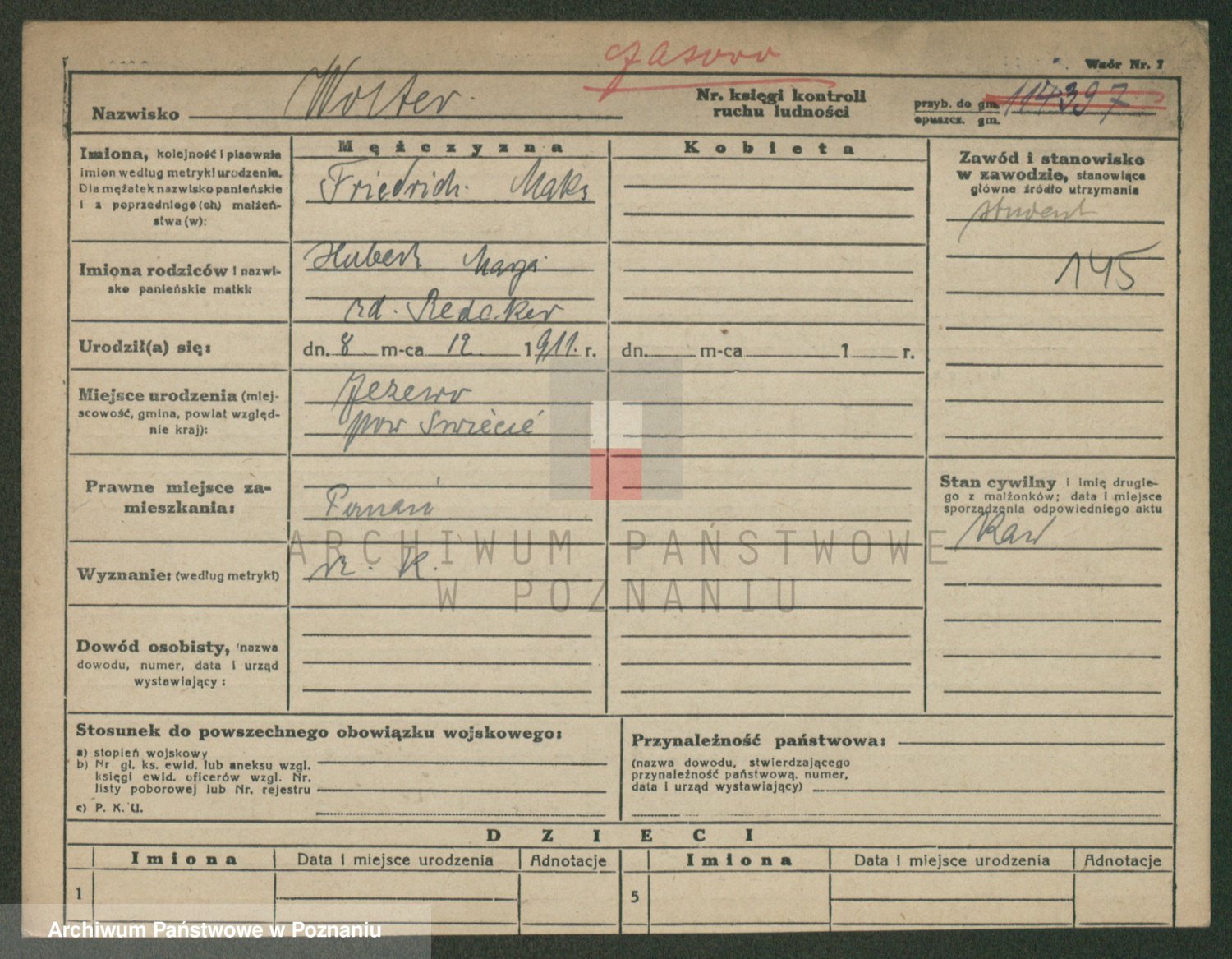 Podgląd karty osobowej dostępny jest po kliknięciu na nazwisko lub ikonkę karty. Można dokonywać powiększenia (ikony na górze) lub przechodzić między kolejnymi skanami (strzałki po bokach).