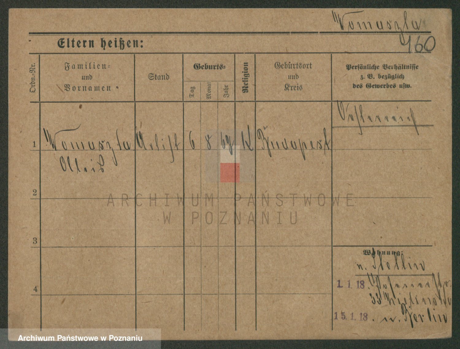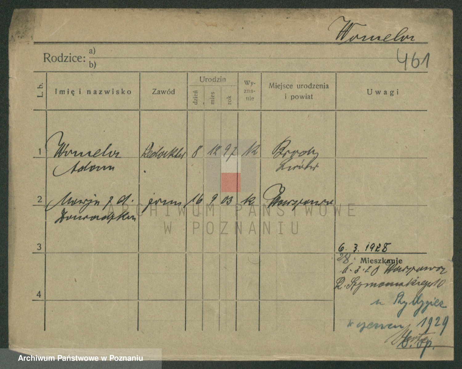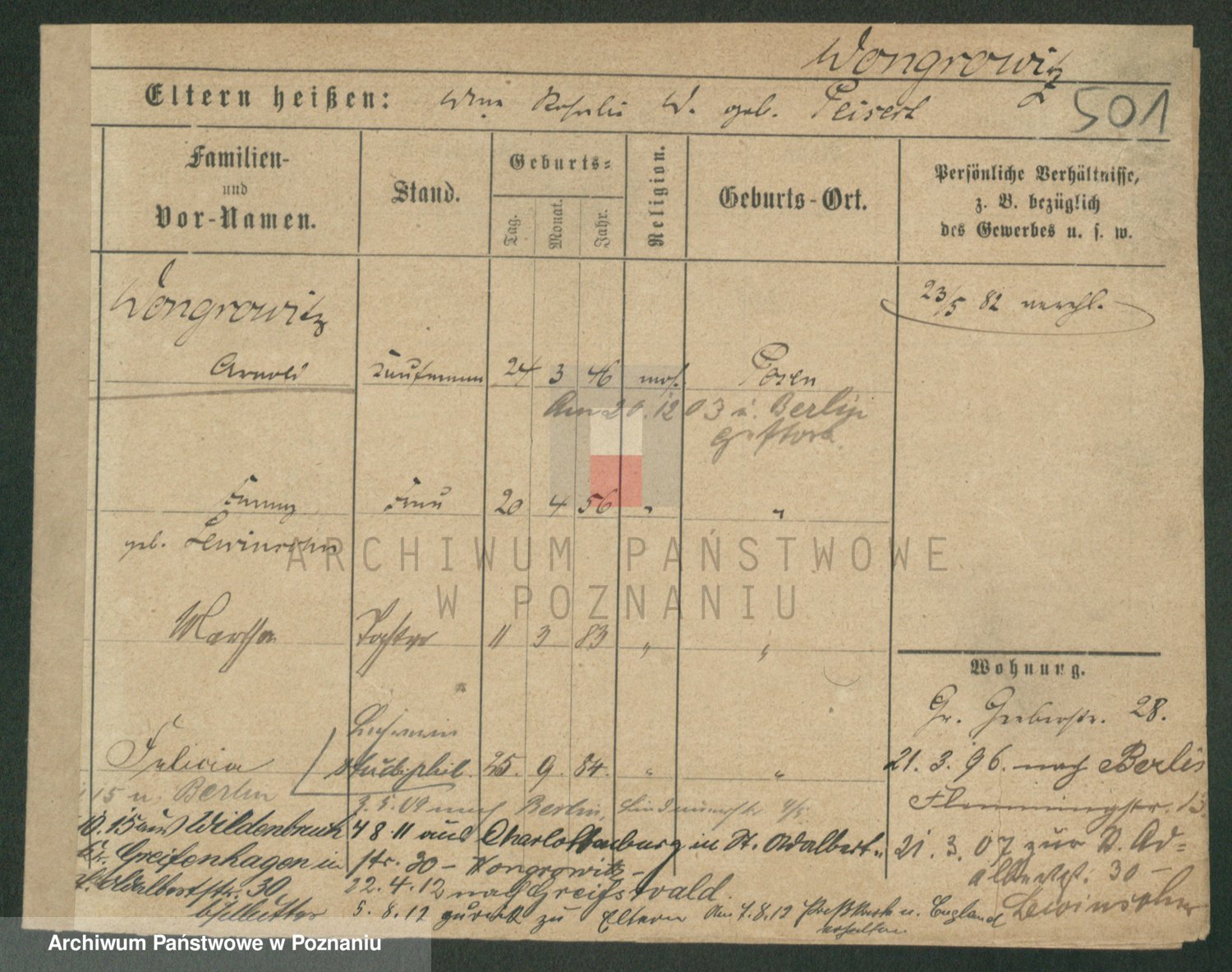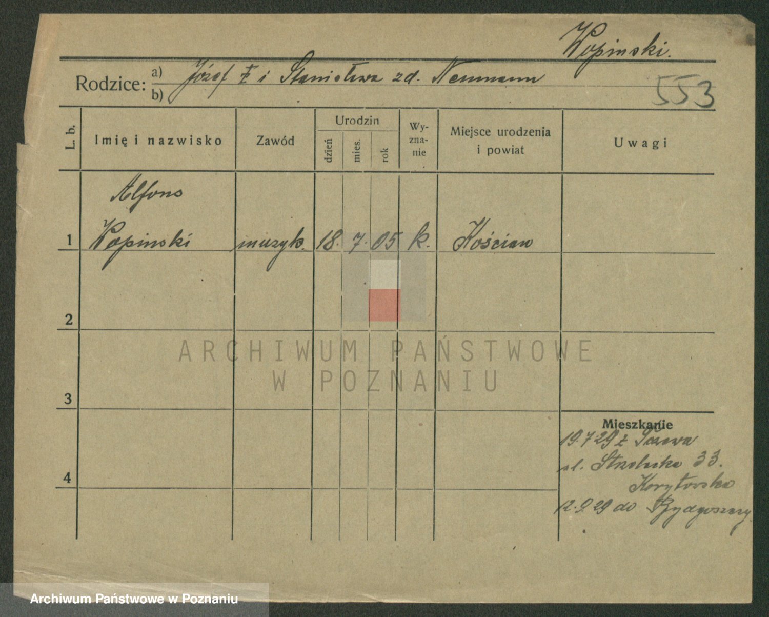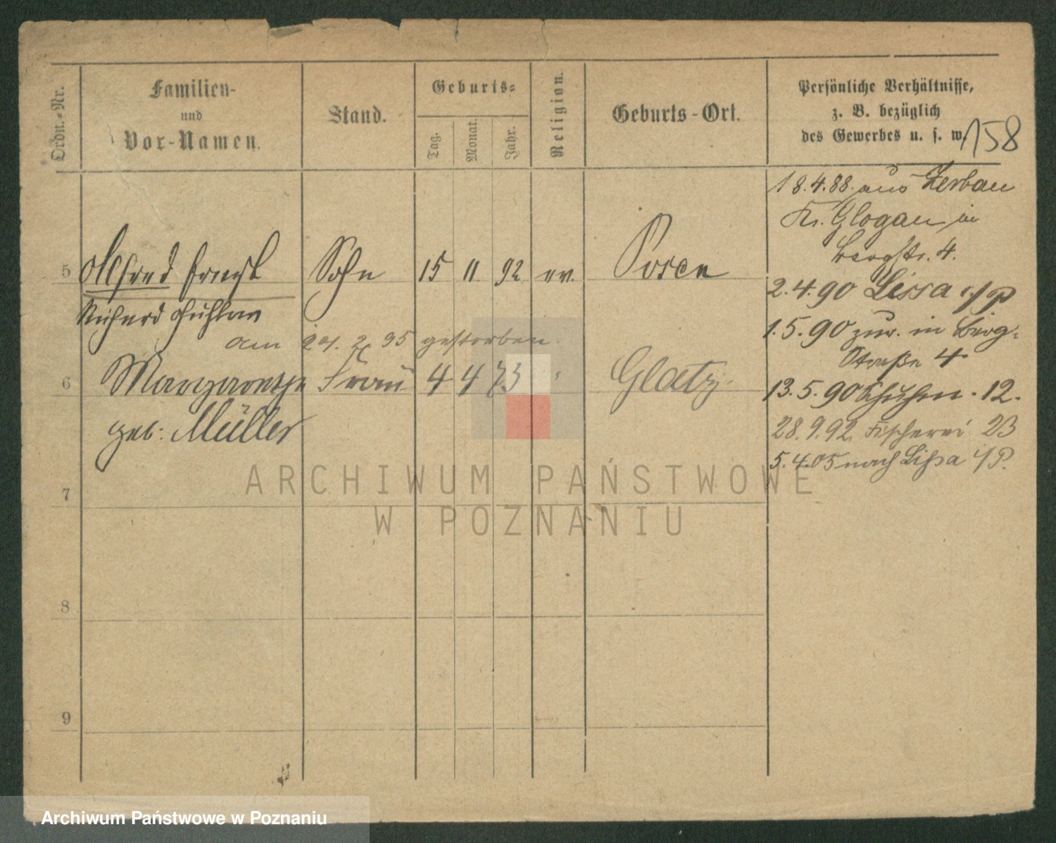 Podgląd karty osobowej dostępny jest po kliknięciu na nazwisko lub ikonkę karty. Można dokonywać powiększenia (ikony na górze) lub przechodzić między kolejnymi skanami (strzałki po bokach).