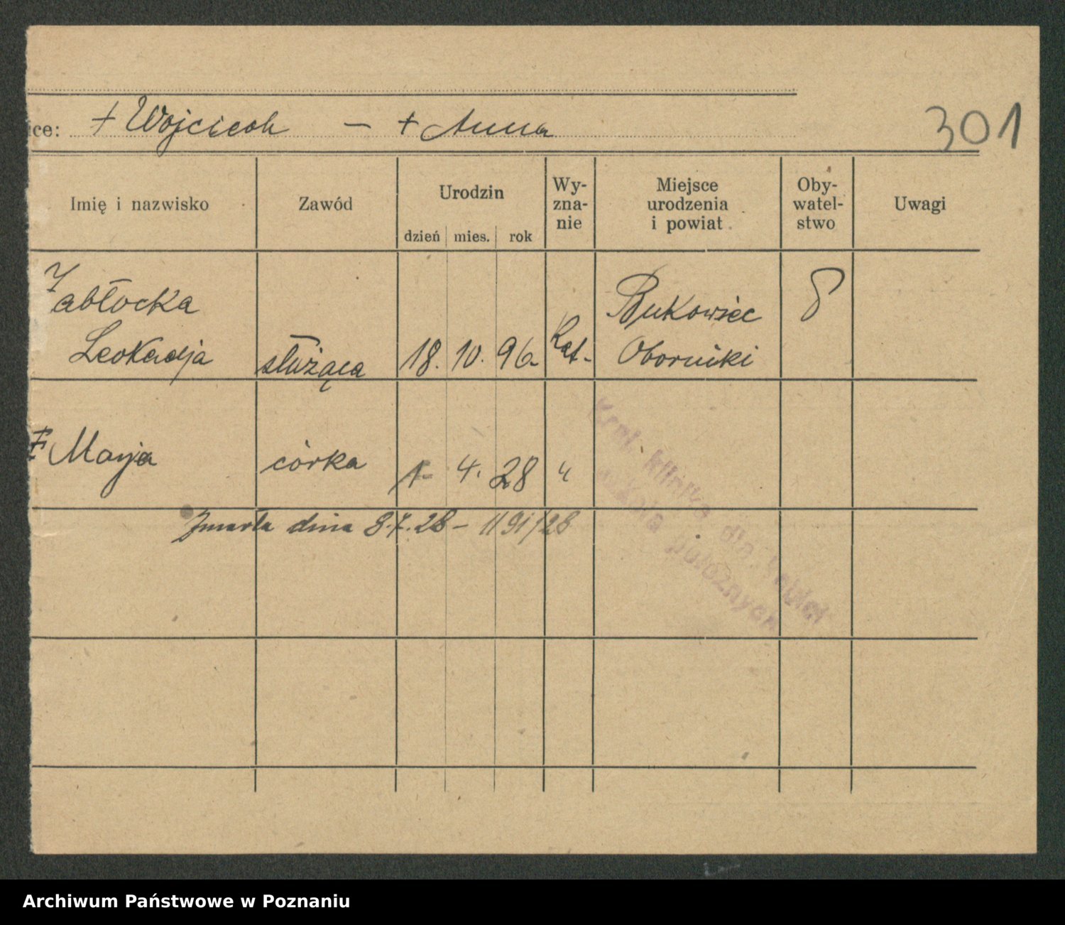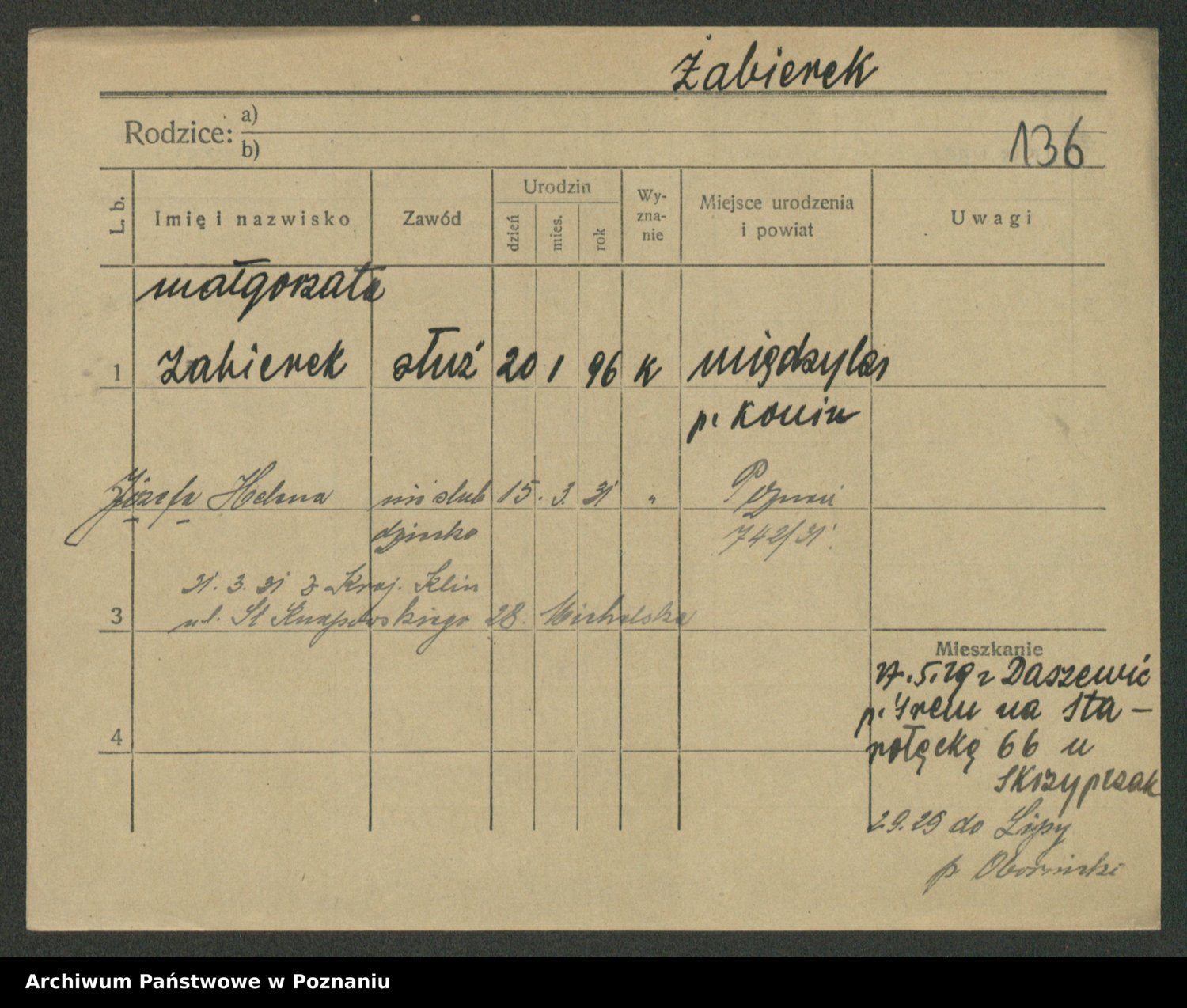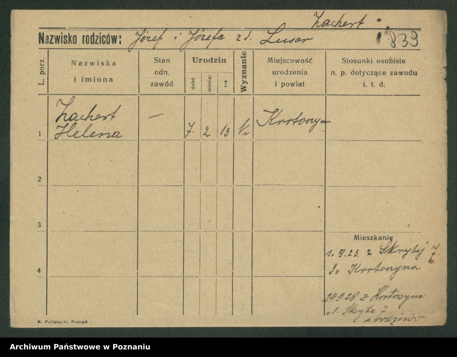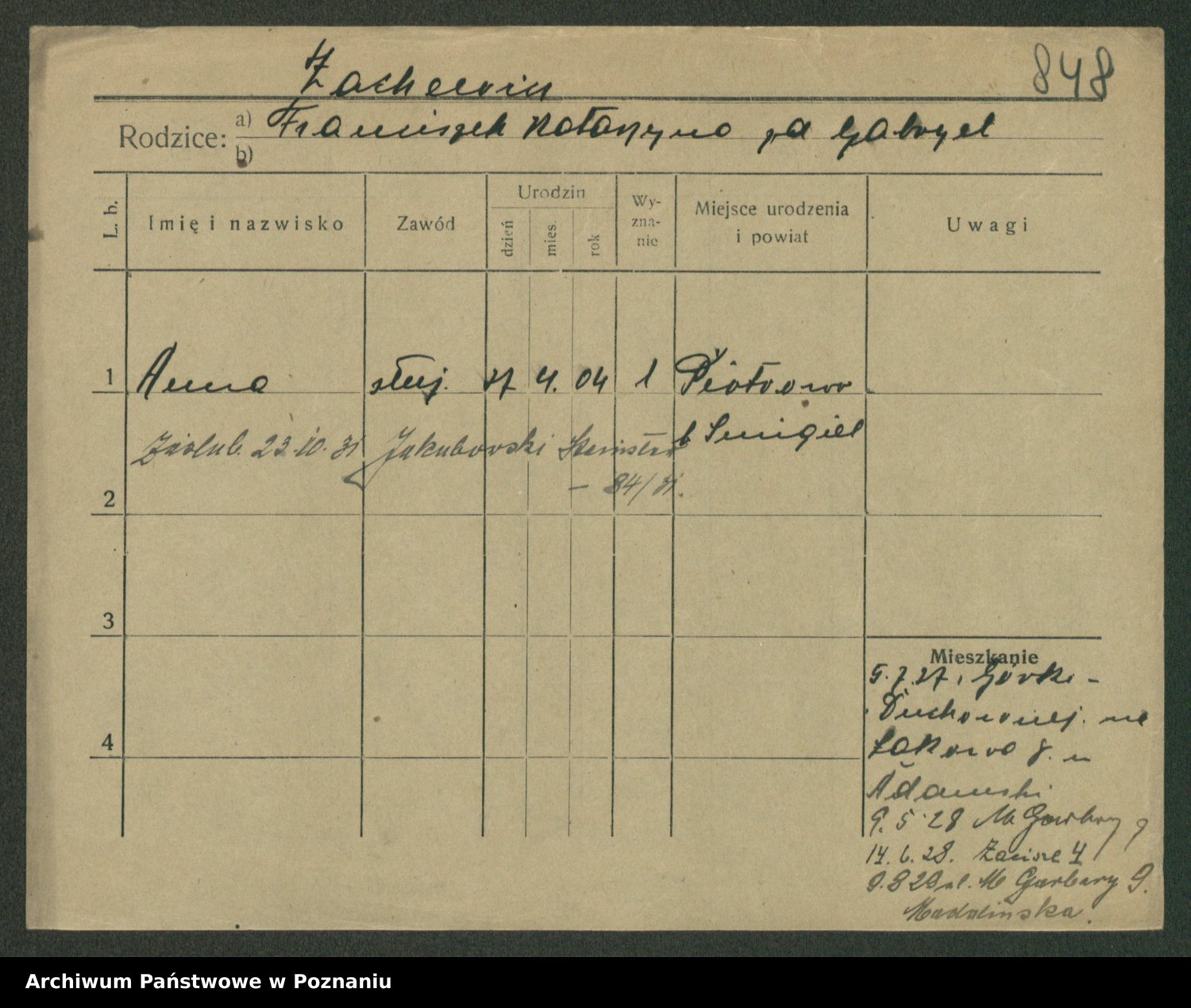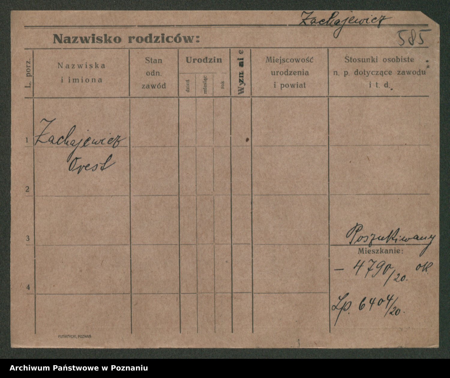 Podgląd karty osobowej dostępny jest po kliknięciu na nazwisko lub ikonkę karty. Można dokonywać powiększenia (ikony na górze) lub przechodzić między kolejnymi skanami (strzałki po bokach).